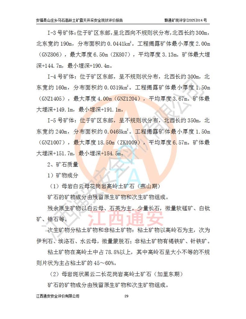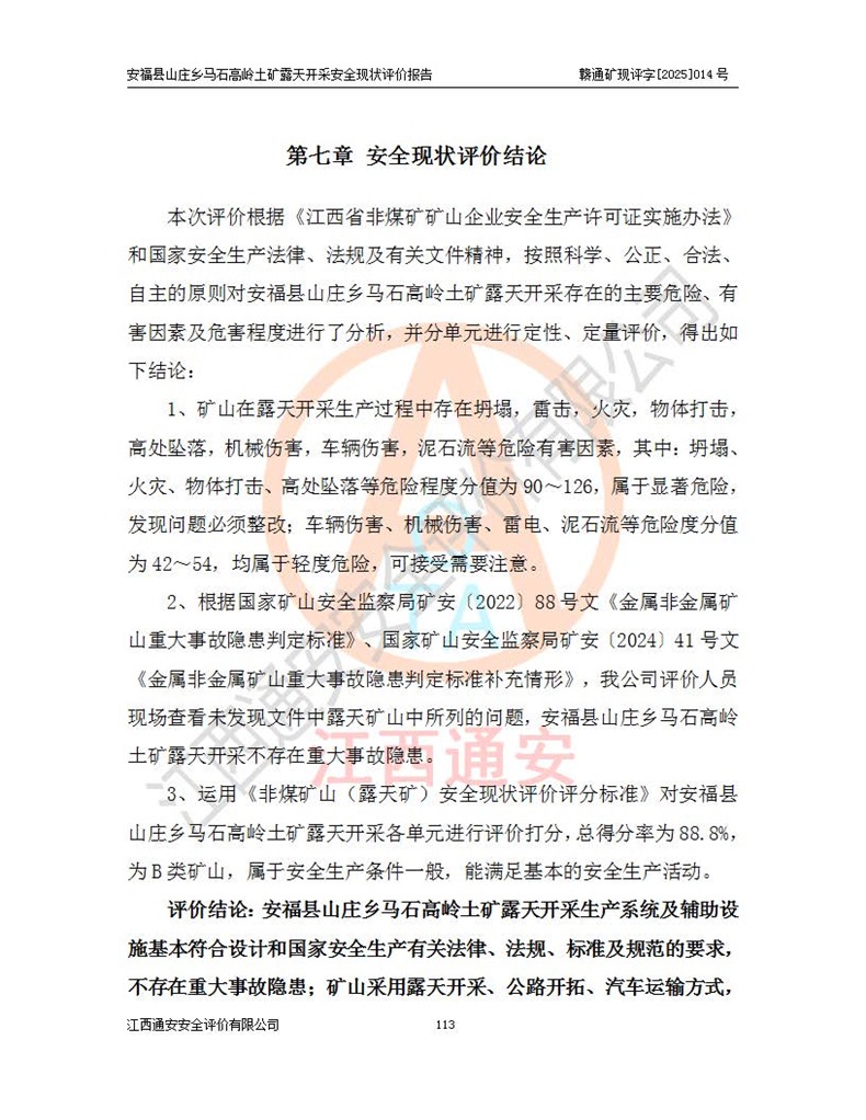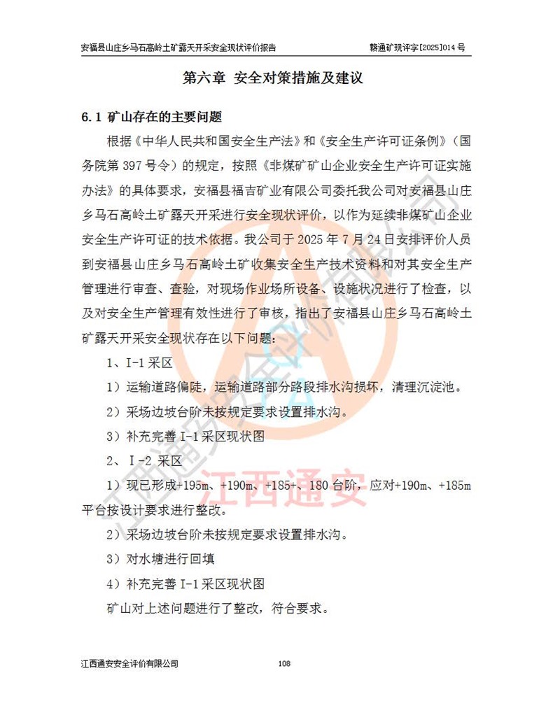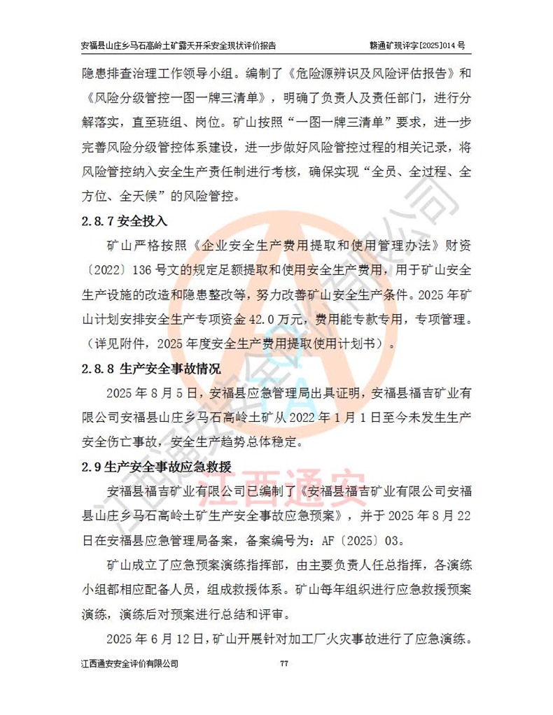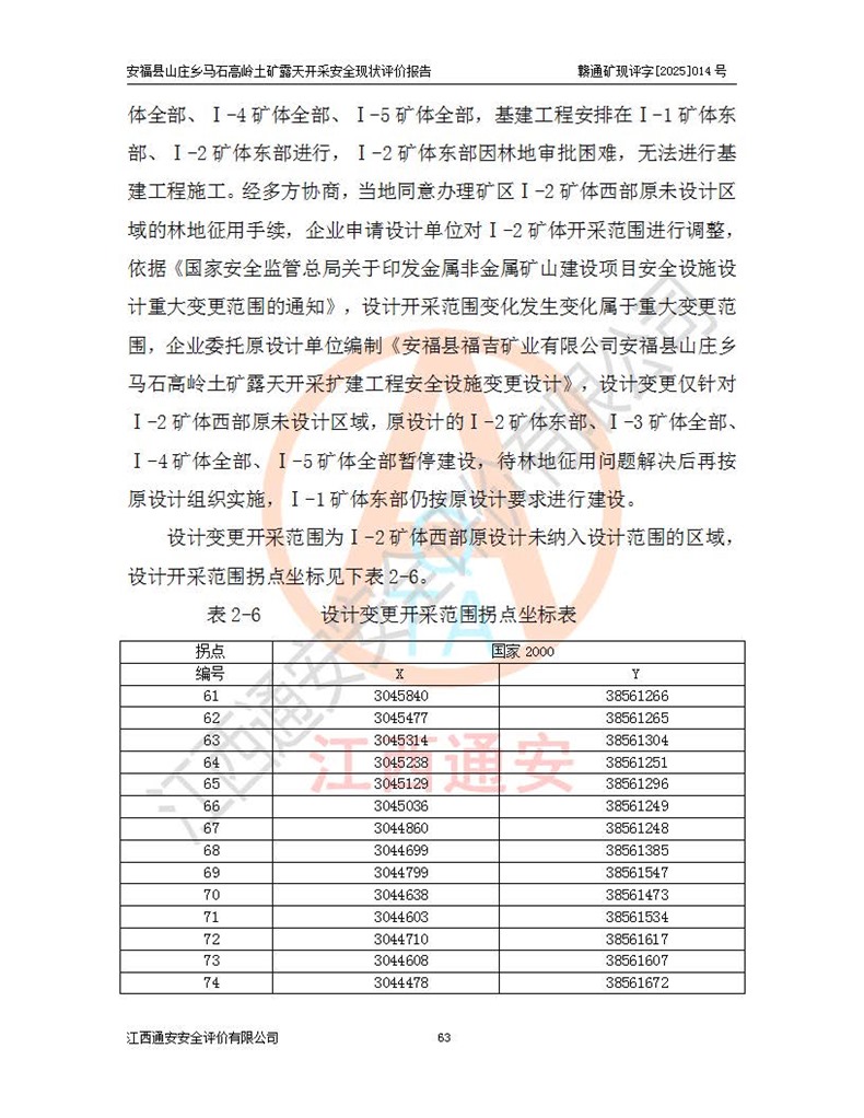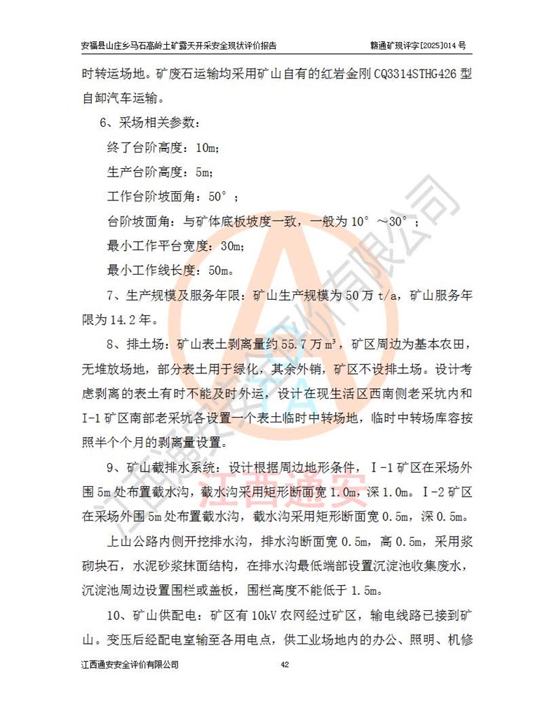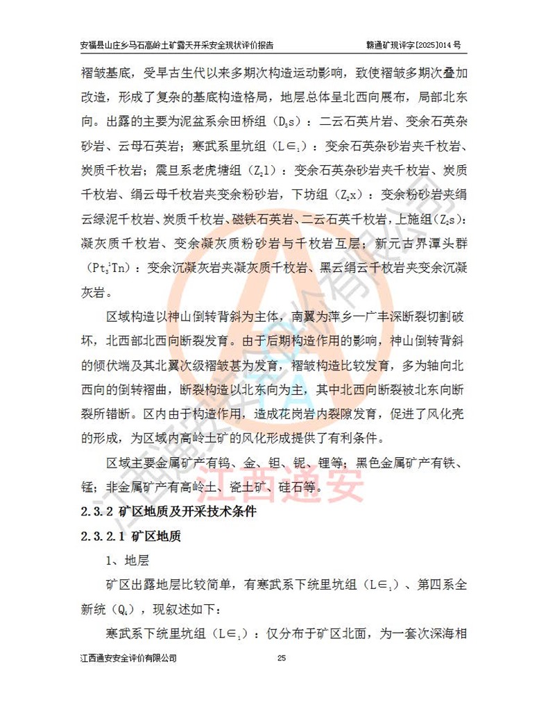 安福縣福吉礦業(yè)有限公司成立于2008年7月8日,地址位于江西省吉安市安??h山莊鄉(xiāng)東頭村五組,注冊資金:1288.66萬元,營業(yè)執(zhí)照統(tǒng)一社會(huì)信用代碼:9136082969683448X,營業(yè)期限:2008年7月8日至長期,企業(yè)類型為有限責(zé)任公司(自然人獨(dú)資),法定**人為劉國棟,經(jīng)營范圍:高嶺土開采、銷售;礦產(chǎn)品(鐵礦除外)加工、銷售。 安??h山莊鄉(xiāng)馬石高嶺土礦為安福縣福吉礦業(yè)有限公司下屬露天礦山,礦區(qū)位于安福縣城北北東,直距縣城12°方位約15km,行政區(qū)劃屬安??h山莊鄉(xiāng)管轄,礦區(qū)地理坐標(biāo)(2000坐標(biāo)系):東經(jīng)114°37′12″~114°38′32″,北緯27°30′37″~27°32′05″。礦區(qū)中心地理坐標(biāo):東經(jīng)114°37′52″,北緯 27°31′14″。礦區(qū)有3km水泥公路通往山莊鄉(xiāng),并與安福-分宜公路相連,距安福縣城18km。 馬石高嶺土礦成立于2008年,生產(chǎn)規(guī)模為2萬噸/年,礦區(qū)面積2.3642平方**,開采深度280m至155m,礦區(qū)資源于2018年重新進(jìn)行了核實(shí),2019年6月由吉安市自然資源局重新核發(fā)了采礦許可證,礦區(qū)面積由原2.3642平方**調(diào)整至1.2016平方**,開采深度由330.3m至155m,生產(chǎn)規(guī)模由2萬噸/年變更為50萬噸/年。 因礦山生產(chǎn)規(guī)模擴(kuò)大,根據(jù)《建設(shè)項(xiàng)目安全設(shè)施“三同時(shí)”監(jiān)督管理辦法》安監(jiān)總局令第36號(hào)(77號(hào)令修改)的要求,礦山應(yīng)履行安全設(shè)施擴(kuò)建“三同時(shí)”手續(xù),安??h福吉礦業(yè)有限公司分別委托內(nèi)蒙古吉安勞動(dòng)安全評(píng)價(jià)有限責(zé)任公司和山東乾舜礦冶科技股份有限公司對(duì)馬石高嶺土礦擴(kuò)建工程進(jìn)行了安全預(yù)評(píng)價(jià)及安全設(shè)施設(shè)計(jì)。 2021年10月16日安全設(shè)施設(shè)計(jì)通過了安??h應(yīng)急管理局組織的專家評(píng)審,2021年11月18日,安??h應(yīng)急管理局下發(fā)了《關(guān)于安福縣福吉礦業(yè)有限公司安??h山莊鄉(xiāng)馬石高嶺土礦露天開采擴(kuò)建工程安全設(shè)施設(shè)計(jì)審查意見》安應(yīng)急字[2021]59號(hào))。 馬石高嶺土礦于2021年12月開始了基建工程,期間因征地原因,設(shè)計(jì)開采范圍發(fā)生了變化,2022年4月,安福縣福吉礦業(yè)有限公司委托山東乾舜礦冶科技股份有限公司編制了《安??h福吉礦業(yè)有限公司安福縣山莊鄉(xiāng)馬石高嶺土礦露天開采擴(kuò)建工程變更設(shè)計(jì)》,2022年4月24日變更設(shè)計(jì)通過了安??h應(yīng)急管理局組織的專家評(píng)審,2022年5月18日,安??h應(yīng)急管理局下發(fā)了《關(guān)于安福縣福吉礦業(yè)有限公司安??h山莊鄉(xiāng)馬石高嶺土礦露天開采擴(kuò)建工程安全設(shè)施設(shè)計(jì)變更審查意見》安應(yīng)急字[2022]30號(hào))。 2022年8月,安福縣山莊鄉(xiāng)馬石高嶺土礦露天開采擴(kuò)建工程通過驗(yàn)收,2022年9月9日,礦山取得了安??h應(yīng)急管理局頒發(fā)的安全生產(chǎn)許可證,編號(hào):(贛)FM安許證字[2022]DAF02號(hào)。**期:2022年9月9日至2025年9月8日。 2024年10月25日,安福縣應(yīng)急管理局現(xiàn)場檢查時(shí),發(fā)現(xiàn)安福縣山莊鄉(xiāng)馬石高嶺土礦存在2條違法違規(guī)行為和事故隱患,并存在5條其他問題,安??h應(yīng)急管理局開具了《安全生產(chǎn)行政執(zhí)法文書現(xiàn)場處理措施決定書》(安福)應(yīng)急現(xiàn)決(2024)非煤007號(hào),《安全生產(chǎn)行政執(zhí)法文書責(zé)令限期整改指令書》(安福)應(yīng)急責(zé)改(2024)058號(hào);2024年11月15日,安??h應(yīng)急管理局開具了《安全生產(chǎn)行政執(zhí)法文書行政處罰決定書》(安福)應(yīng)急罰(2024)非煤-4號(hào);并處人民幣貳萬伍仟元罰款的行政處罰。 隨著正常的生產(chǎn),礦山企業(yè)發(fā)現(xiàn)礦區(qū)Ⅰ-2礦體西部及Ⅰ-2礦體東部的礦體難以達(dá)到工業(yè)品味的需求,經(jīng)礦山企業(yè)商討后決定:放棄對(duì)Ⅰ-2礦體西部及Ⅰ-2礦體東部的開采,僅開采Ⅰ-2礦體南部,并于2025年3月委托山東乾舜礦冶科技股份有限公司編制了《安??h福吉礦業(yè)有限公司安??h山莊鄉(xiāng)馬石高嶺土礦露天開采Ⅰ-2礦體開采設(shè)計(jì)》。 依照《非煤礦礦山企業(yè)安全生產(chǎn)許可證延期換證工作》的通知,根據(jù)***《安全生產(chǎn)許可證條例》、《江西省安全生產(chǎn)條例》、《非煤礦山安全生產(chǎn)許可證實(shí)施辦法》、《江西省非煤礦礦山企業(yè)安全生產(chǎn)許可證辦法》規(guī)定及非煤礦山安全評(píng)價(jià)導(dǎo)則的要求,受安??h福吉礦業(yè)有限公司的委托,我公司承擔(dān)安福縣山莊鄉(xiāng)馬石高嶺土礦露天開采延期換證的安全現(xiàn)狀評(píng)價(jià)工作。 |