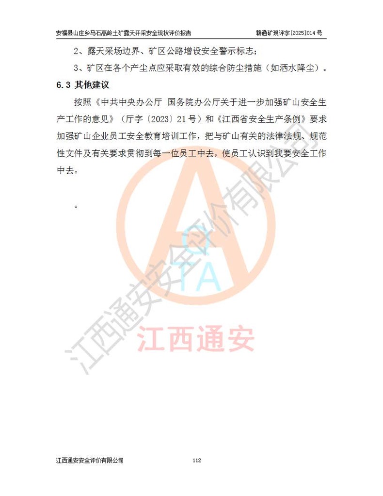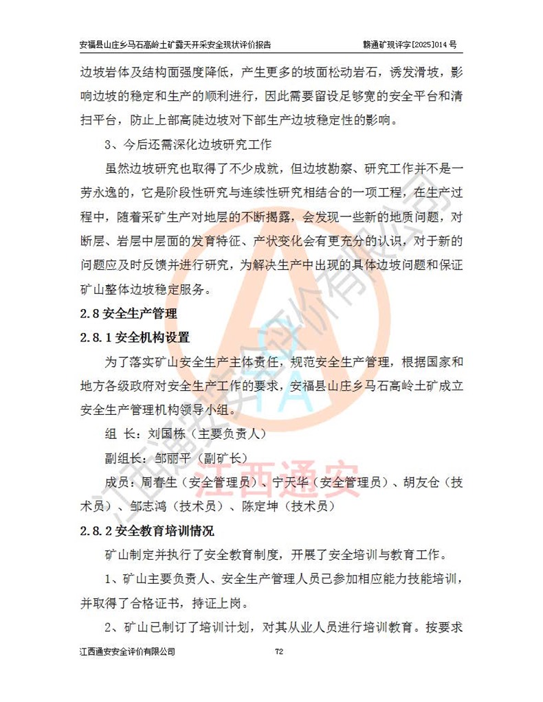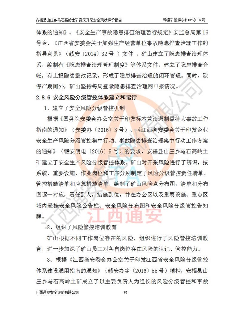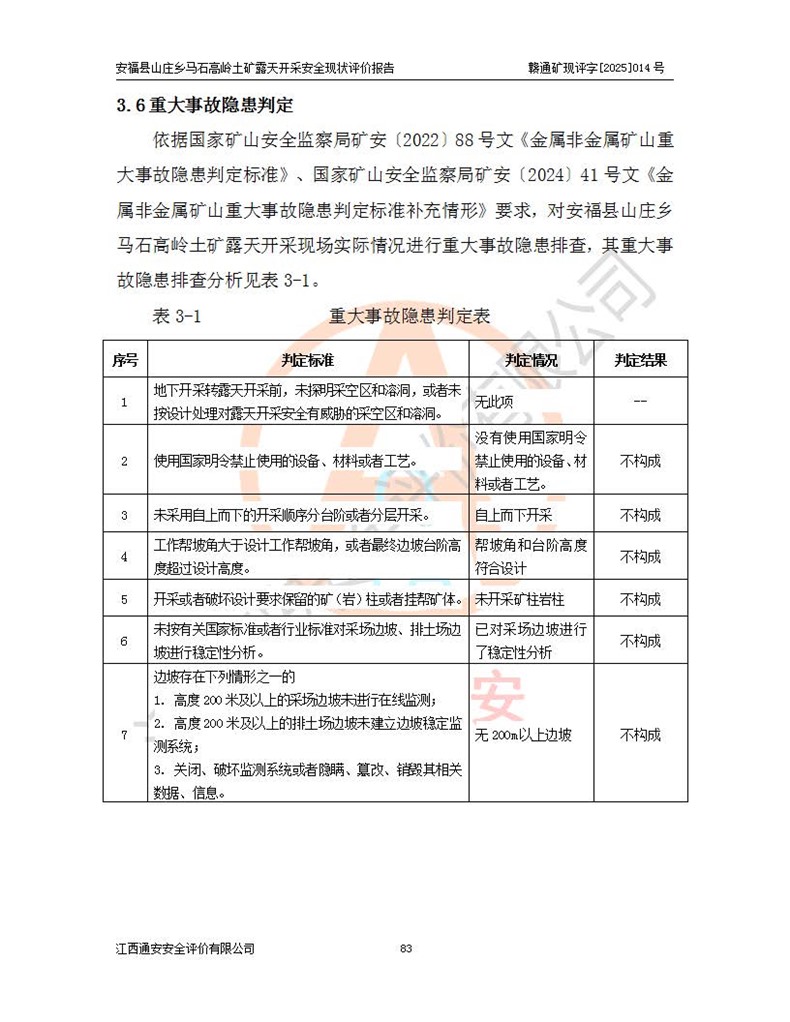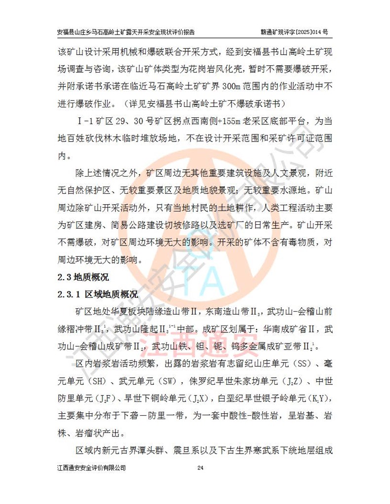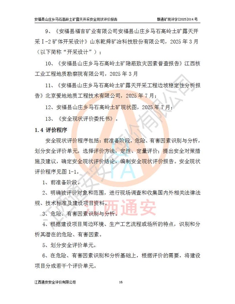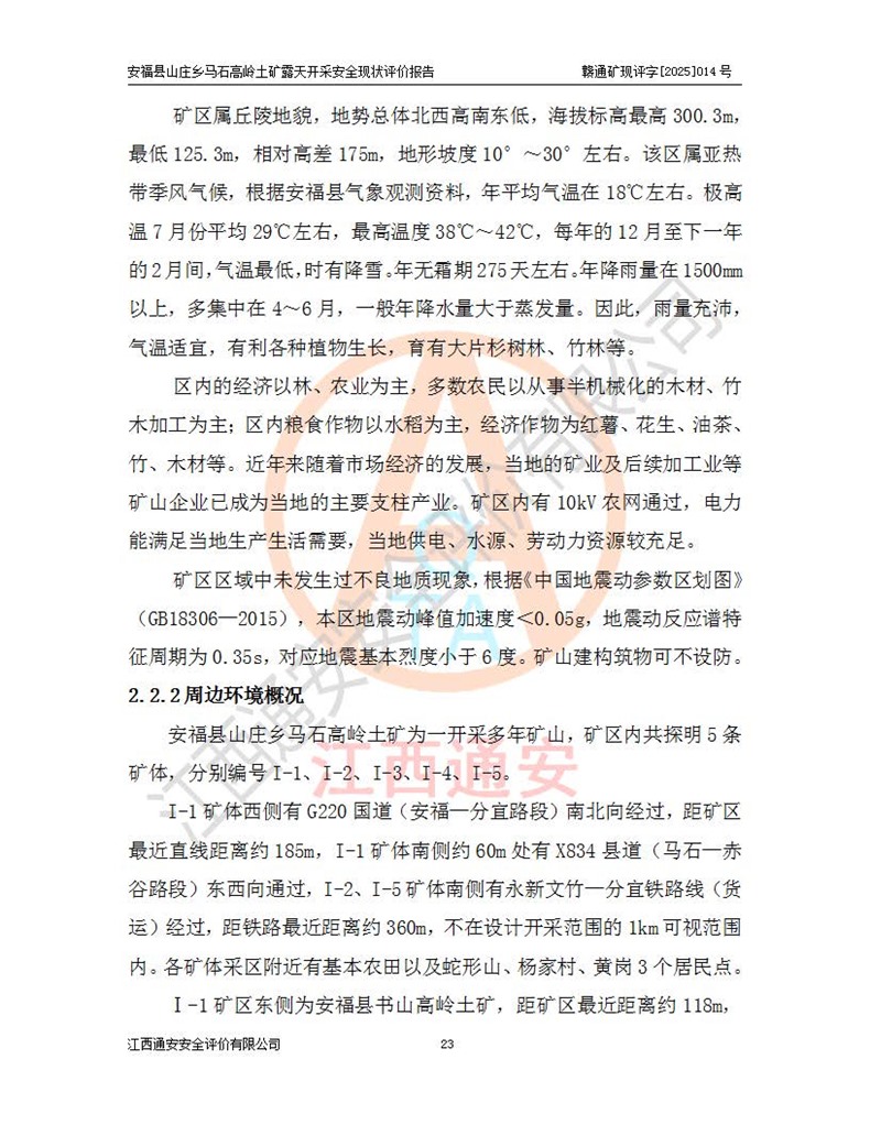 安福縣福吉礦業(yè)有限公司成立于2008年7月8日,地址位于江西省吉安市安??h山莊鄉(xiāng)東頭村五組,注冊資金:1288.66萬元,營業(yè)執(zhí)照統(tǒng)一社會(huì)信用代碼:9136082969683448X,營業(yè)期限:2008年7月8日至長期,企業(yè)類型為有限責(zé)任公司(自然人獨(dú)資),法定**人為劉國棟,經(jīng)營范圍:高嶺土開采、銷售;礦產(chǎn)品(鐵礦除外)加工、銷售。 安??h山莊鄉(xiāng)馬石高嶺土礦為安福縣福吉礦業(yè)有限公司下屬露天礦山,礦區(qū)位于安福縣城北北東,直距縣城12°方位約15km,行政區(qū)劃屬安??h山莊鄉(xiāng)管轄,礦區(qū)地理坐標(biāo)(2000坐標(biāo)系):東經(jīng)114°37′12″~114°38′32″,北緯27°30′37″~27°32′05″。礦區(qū)中心地理坐標(biāo):東經(jīng)114°37′52″,北緯 27°31′14″。礦區(qū)有3km水泥公路通往山莊鄉(xiāng),并與安福-分宜公路相連,距安福縣城18km。 馬石高嶺土礦成立于2008年,生產(chǎn)規(guī)模為2萬噸/年,礦區(qū)面積2.3642平方**,開采深度280m至155m,礦區(qū)資源于2018年重新進(jìn)行了核實(shí),2019年6月由吉安市自然資源局重新核發(fā)了采礦許可證,礦區(qū)面積由原2.3642平方**調(diào)整至1.2016平方**,開采深度由330.3m至155m,生產(chǎn)規(guī)模由2萬噸/年變更為50萬噸/年。 因礦山生產(chǎn)規(guī)模擴(kuò)大,根據(jù)《建設(shè)項(xiàng)目安全設(shè)施“三同時(shí)”監(jiān)督管理辦法》安監(jiān)總局令第36號(hào)(77號(hào)令修改)的要求,礦山應(yīng)履行安全設(shè)施擴(kuò)建“三同時(shí)”手續(xù),安??h福吉礦業(yè)有限公司分別委托內(nèi)蒙古吉安勞動(dòng)安全評(píng)價(jià)有限責(zé)任公司和山東乾舜礦冶科技股份有限公司對(duì)馬石高嶺土礦擴(kuò)建工程進(jìn)行了安全預(yù)評(píng)價(jià)及安全設(shè)施設(shè)計(jì)。 2021年10月16日安全設(shè)施設(shè)計(jì)通過了安??h應(yīng)急管理局組織的專家評(píng)審,2021年11月18日,安??h應(yīng)急管理局下發(fā)了《關(guān)于安福縣福吉礦業(yè)有限公司安??h山莊鄉(xiāng)馬石高嶺土礦露天開采擴(kuò)建工程安全設(shè)施設(shè)計(jì)審查意見》安應(yīng)急字[2021]59號(hào))。 馬石高嶺土礦于2021年12月開始了基建工程,期間因征地原因,設(shè)計(jì)開采范圍發(fā)生了變化,2022年4月,安福縣福吉礦業(yè)有限公司委托山東乾舜礦冶科技股份有限公司編制了《安??h福吉礦業(yè)有限公司安福縣山莊鄉(xiāng)馬石高嶺土礦露天開采擴(kuò)建工程變更設(shè)計(jì)》,2022年4月24日變更設(shè)計(jì)通過了安??h應(yīng)急管理局組織的專家評(píng)審,2022年5月18日,安??h應(yīng)急管理局下發(fā)了《關(guān)于安福縣福吉礦業(yè)有限公司安??h山莊鄉(xiāng)馬石高嶺土礦露天開采擴(kuò)建工程安全設(shè)施設(shè)計(jì)變更審查意見》安應(yīng)急字[2022]30號(hào))。 2022年8月,安福縣山莊鄉(xiāng)馬石高嶺土礦露天開采擴(kuò)建工程通過驗(yàn)收,2022年9月9日,礦山取得了安??h應(yīng)急管理局頒發(fā)的安全生產(chǎn)許可證,編號(hào):(贛)FM安許證字[2022]DAF02號(hào)。**期:2022年9月9日至2025年9月8日。 2024年10月25日,安福縣應(yīng)急管理局現(xiàn)場檢查時(shí),發(fā)現(xiàn)安福縣山莊鄉(xiāng)馬石高嶺土礦存在2條違法違規(guī)行為和事故隱患,并存在5條其他問題,安??h應(yīng)急管理局開具了《安全生產(chǎn)行政執(zhí)法文書現(xiàn)場處理措施決定書》(安福)應(yīng)急現(xiàn)決(2024)非煤007號(hào),《安全生產(chǎn)行政執(zhí)法文書責(zé)令限期整改指令書》(安福)應(yīng)急責(zé)改(2024)058號(hào);2024年11月15日,安??h應(yīng)急管理局開具了《安全生產(chǎn)行政執(zhí)法文書行政處罰決定書》(安福)應(yīng)急罰(2024)非煤-4號(hào);并處人民幣貳萬伍仟元罰款的行政處罰。 隨著正常的生產(chǎn),礦山企業(yè)發(fā)現(xiàn)礦區(qū)Ⅰ-2礦體西部及Ⅰ-2礦體東部的礦體難以達(dá)到工業(yè)品味的需求,經(jīng)礦山企業(yè)商討后決定:放棄對(duì)Ⅰ-2礦體西部及Ⅰ-2礦體東部的開采,僅開采Ⅰ-2礦體南部,并于2025年3月委托山東乾舜礦冶科技股份有限公司編制了《安??h福吉礦業(yè)有限公司安??h山莊鄉(xiāng)馬石高嶺土礦露天開采Ⅰ-2礦體開采設(shè)計(jì)》。 依照《非煤礦礦山企業(yè)安全生產(chǎn)許可證延期換證工作》的通知,根據(jù)***《安全生產(chǎn)許可證條例》、《江西省安全生產(chǎn)條例》、《非煤礦山安全生產(chǎn)許可證實(shí)施辦法》、《江西省非煤礦礦山企業(yè)安全生產(chǎn)許可證辦法》規(guī)定及非煤礦山安全評(píng)價(jià)導(dǎo)則的要求,受安??h福吉礦業(yè)有限公司的委托,我公司承擔(dān)安福縣山莊鄉(xiāng)馬石高嶺土礦露天開采延期換證的安全現(xiàn)狀評(píng)價(jià)工作。 |