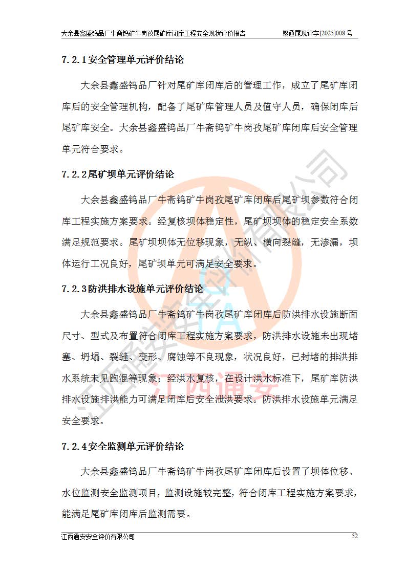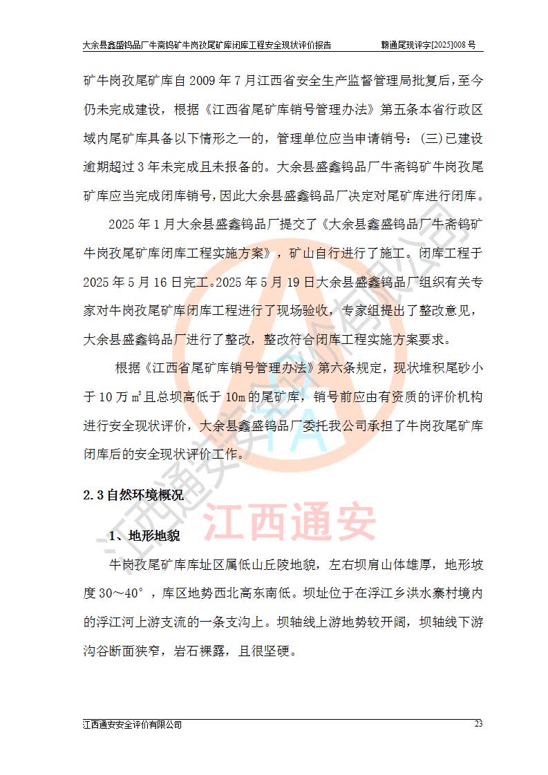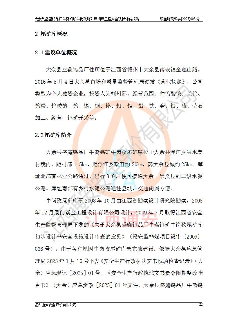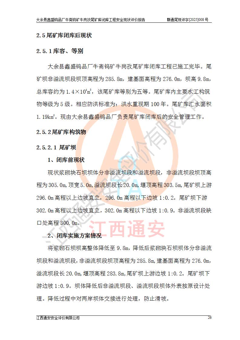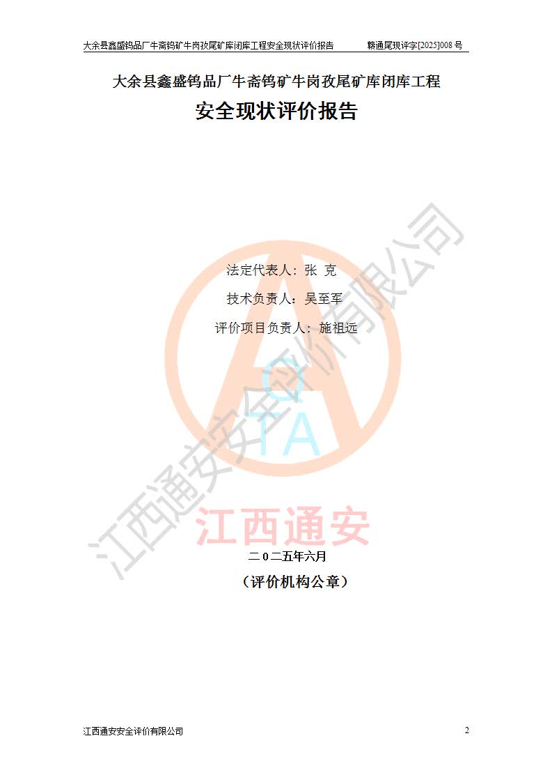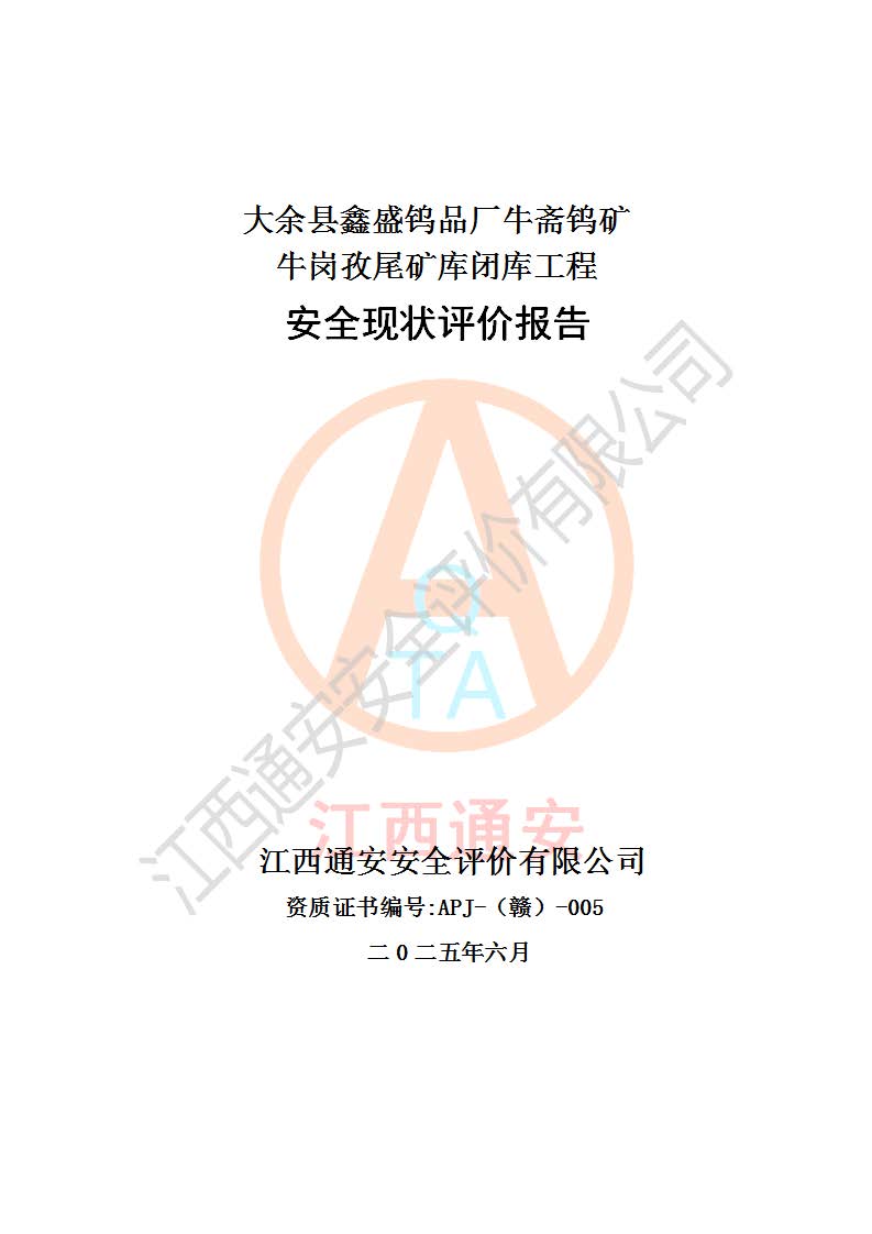 評(píng)價(jià)報(bào)告名稱 | 大余縣鑫盛鎢品廠牛齋鎢礦牛崗孜尾礦庫(kù)閉庫(kù)工程安全現(xiàn)狀評(píng)價(jià)報(bào)告 | |||