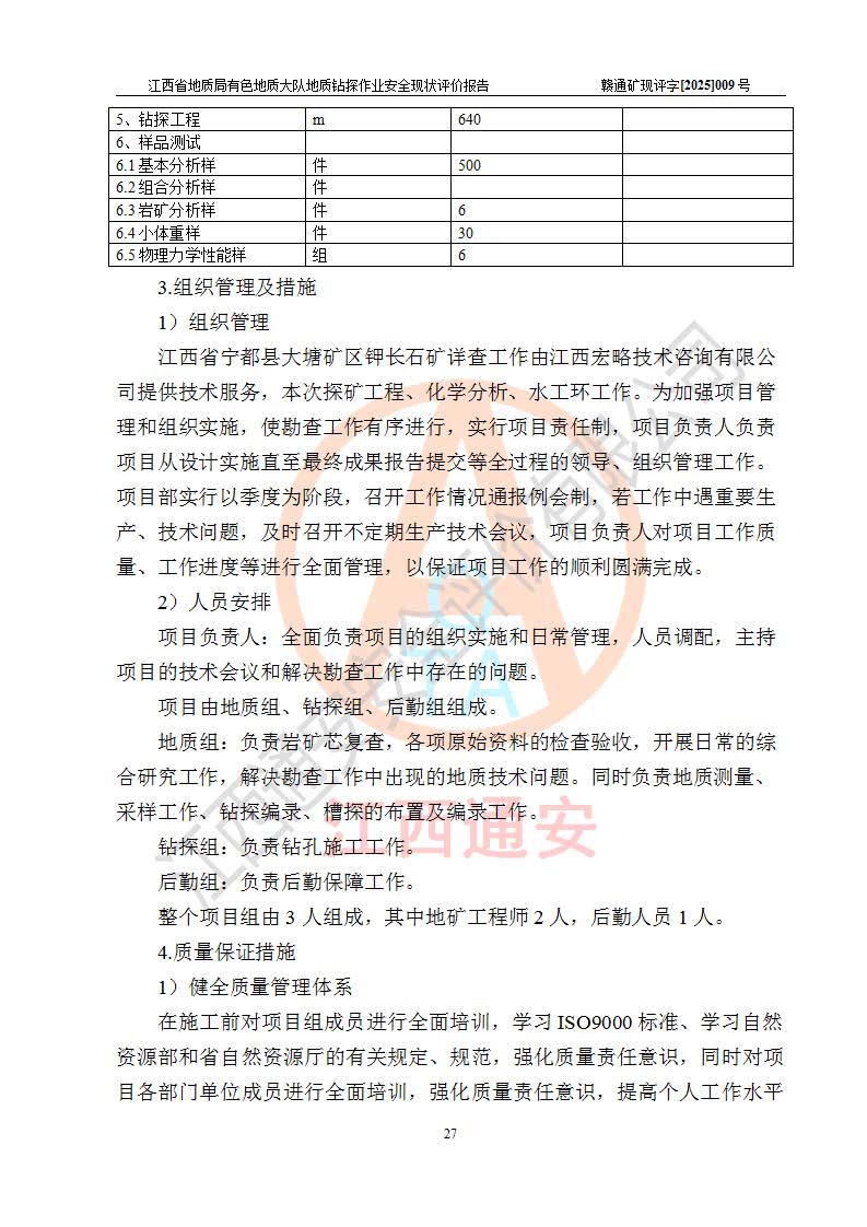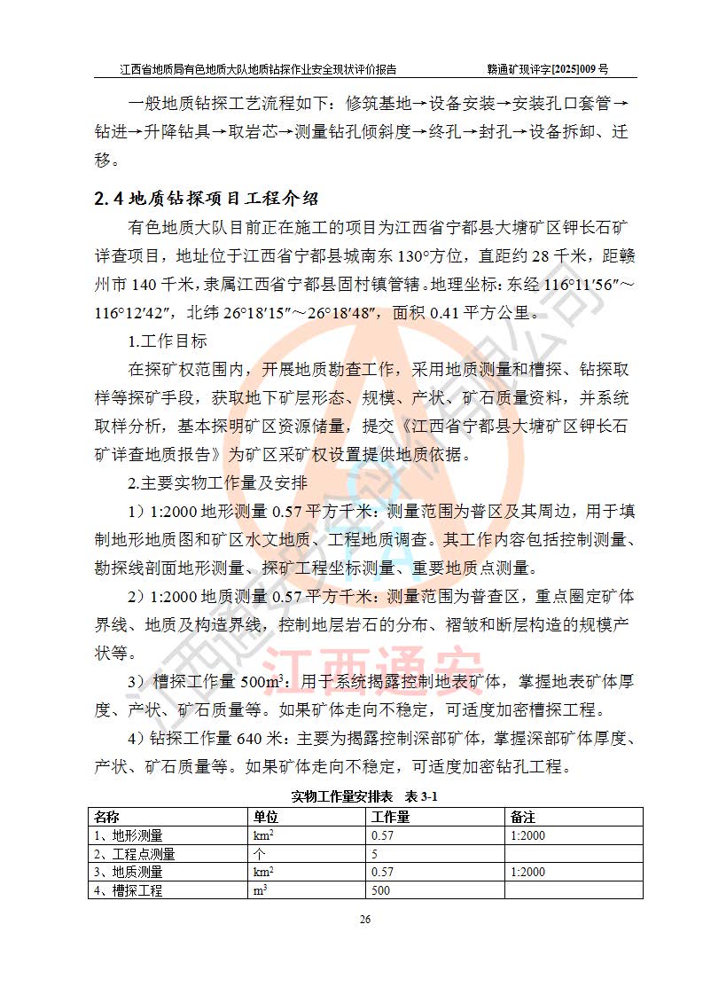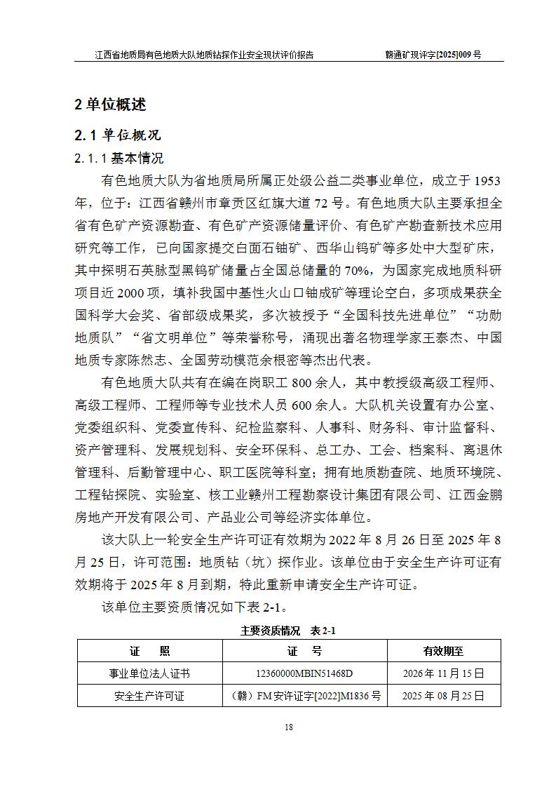 項目簡介 | 江西省地質(zhì)局有色地質(zhì)大隊(以下簡稱“有色地質(zhì)大隊”)為省地質(zhì)局所屬正處級公益二類事業(yè)單位,成立于1953年,位于:江西省贛州市章貢區(qū)紅旗大道72號。有色地質(zhì)大隊主要承擔(dān)**有色礦產(chǎn)資源勘查、有色礦產(chǎn)資源儲量評價、有色礦產(chǎn)勘查新技術(shù)應(yīng)用研究等工作,已向**提交白面石鈾礦、西華山鎢礦等多處中大型礦床,其中探明石英脈型黑鎢礦儲量占**總儲量的70%,為**完成地質(zhì)科研項目近2000項,填補我國中基性火山口鈾成礦等理論空白,多項成果獲**科學(xué)大會獎、省部級成果獎,多次被授予“**科技**單位”“功勛地質(zhì)隊”“省文明單位”等**稱號,涌現(xiàn)出**物理學(xué)家王泰杰、中國地質(zhì)專家陳然志、**勞動模范余根密等****。 有色地質(zhì)大隊共有在編在崗職工800余人,其中**級高級工程師、高級工程師、工程師等專業(yè)技術(shù)人員600余人。大隊機(jī)關(guān)設(shè)置有辦公室、黨委組織科、黨委宣傳科、紀(jì)檢監(jiān)察科、人事科、財務(wù)科、審計監(jiān)督科、資產(chǎn)管理科、發(fā)展規(guī)劃科、安全**科、總工辦、工會、檔案科、離退休管理科、后勤管理中心、職工醫(yī)院等科室;擁有地質(zhì)勘查院、地質(zhì)環(huán)境院、工程鉆探院、實驗室、核工業(yè)贛州工程勘察設(shè)計集團(tuán)有限公司、江西金鵬房地產(chǎn)開發(fā)有限公司、產(chǎn)品業(yè)公司等經(jīng)濟(jì)實體單位。 該大隊上一輪安全生產(chǎn)許可證**期為2022年8月26日至2025年8月25日,許可范圍:地質(zhì)鉆(坑)探作業(yè)。該單位由于安全生產(chǎn)許可證**期將于2025年8月到期,特此重新申請安全生產(chǎn)許可證。按照《安全生產(chǎn)法》、《礦山安全法》和《關(guān)于做好非煤礦山企業(yè)安全生產(chǎn)許可證延期換證工作的通知》等有關(guān)規(guī)定,該單位在申請安全生產(chǎn)許可證前應(yīng)進(jìn)行安全現(xiàn)狀評價。 | |||||