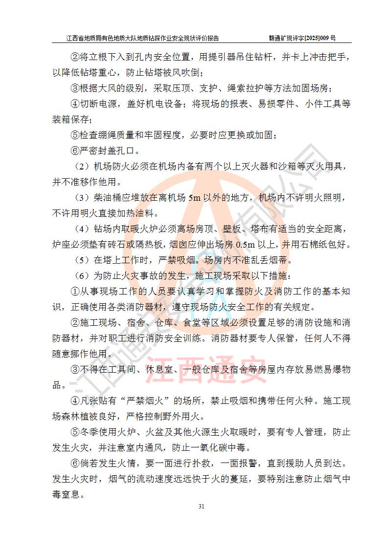 勘察現(xiàn)場發(fā)現(xiàn)的問題及安全對策措施 | 1、問題:機(jī)場地板有缺口。 措施:已按規(guī)定要求將機(jī)場地板缺口修補完畢。 2、雷雨季節(jié)和落雷區(qū)鉆塔未安裝避雷針或采取防雷措施。 措施:已按規(guī)定要求在鉆塔頂端安裝避雷針。 3、問題:廢煙未向場房外排放。 措施:已按規(guī)定要求將廢煙排放至場房外。 4、問題:機(jī)場未配備滅火器或備有沙箱、水桶等滅火器材。 措施:已按規(guī)定要求在機(jī)場配備滅火器及沙箱、水桶等滅火器材。 | |||||