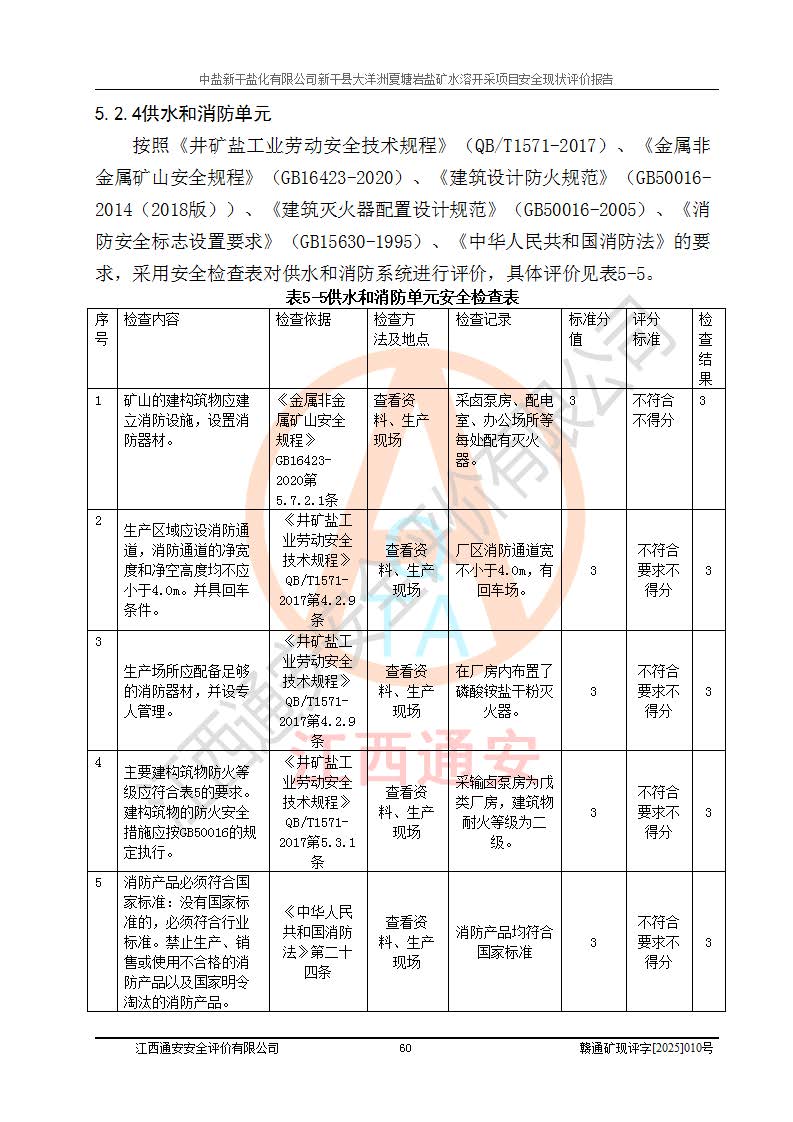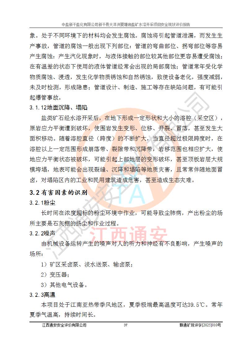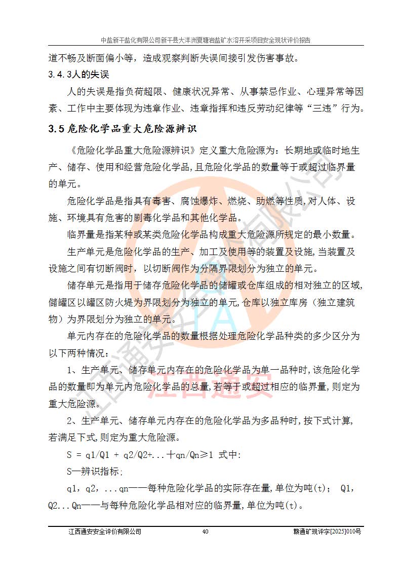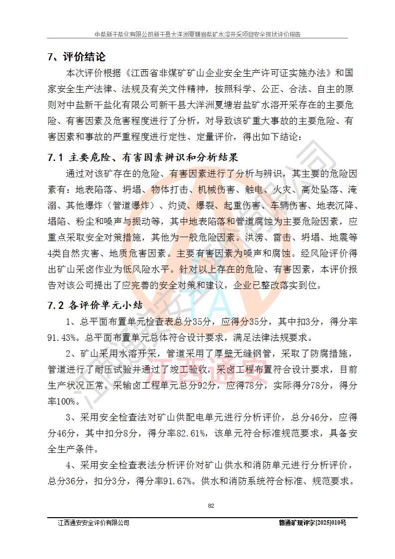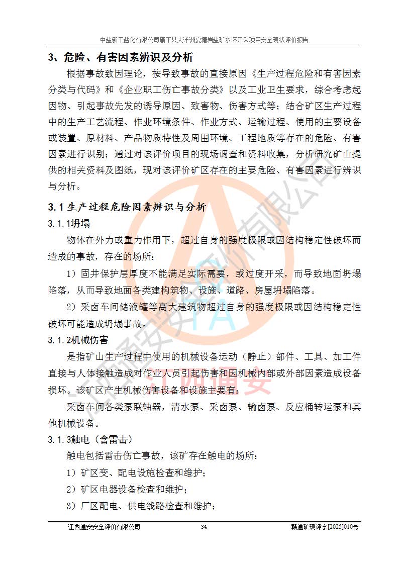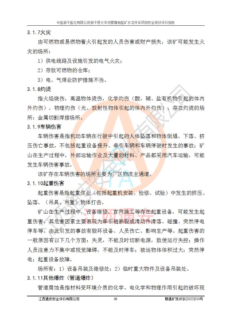 其它 | 通過對該礦存在的危險、有害因素進行了分析與辨識,其主要的危險因素有:地表陷落、坍塌、物體打擊、機械傷害、觸電、火災(zāi)、高處墜落、淹溺、其他爆炸(管道爆炸)、灼燙、爆裂、起重傷害、**傷害、地表沉降、塌陷、粉塵和噪聲與振動等,其中地表陷落和管道腐蝕為主要危險因素,應(yīng)重點采取安全對策措施,其他為一般危險因素。洪澇、雷擊、坍塌、地震等4類自然災(zāi)害、地質(zhì)危害因素。主要有害因素為噪聲和腐蝕。經(jīng)風(fēng)險評價得出礦山采鹵作業(yè)為低風(fēng)險水平。針對以上存在的危險、有害因素,本評價報告對該公司提出了應(yīng)完善的安全對策和建議,企業(yè)已整改落實到位。 評價結(jié)論: 中鹽新干鹽化有限公司新干縣大洋洲夏塘巖鹽礦能滿足基本安全生產(chǎn)活動,風(fēng)險在可接受范圍內(nèi),具備安全生產(chǎn)條件。 | ||||