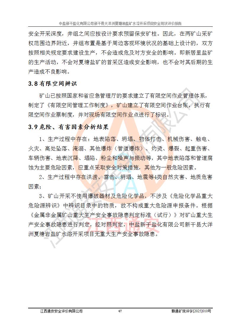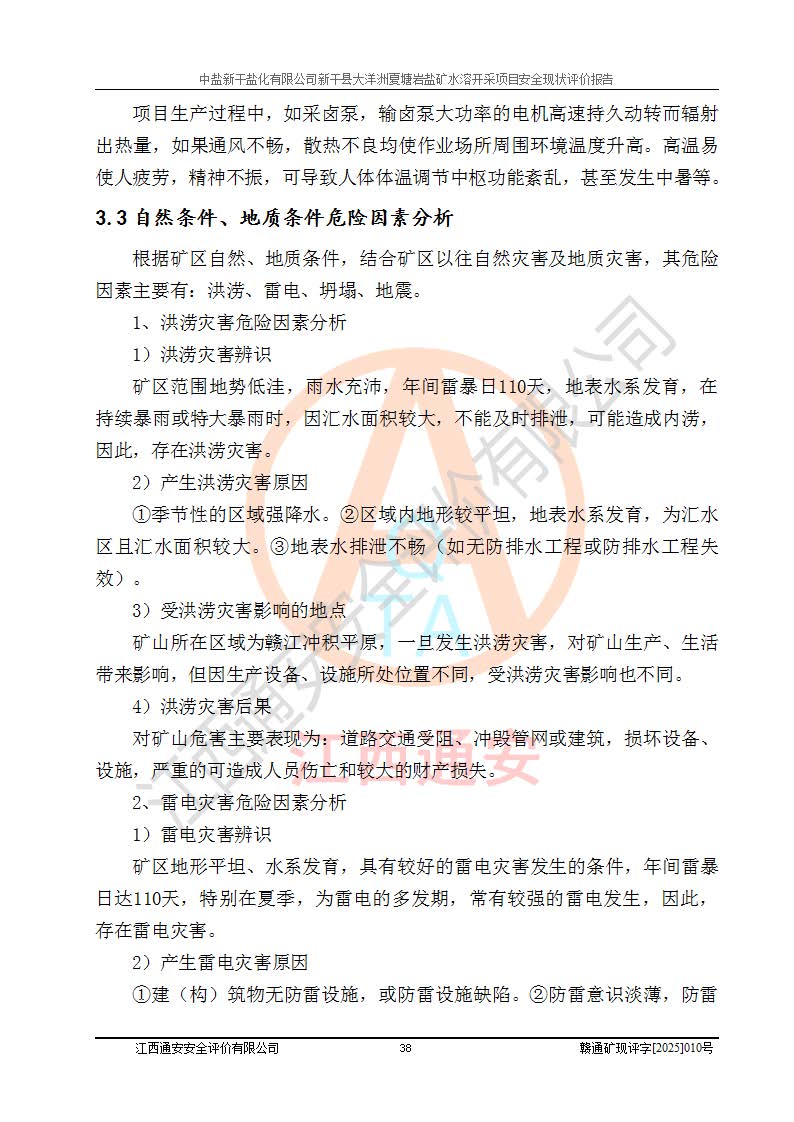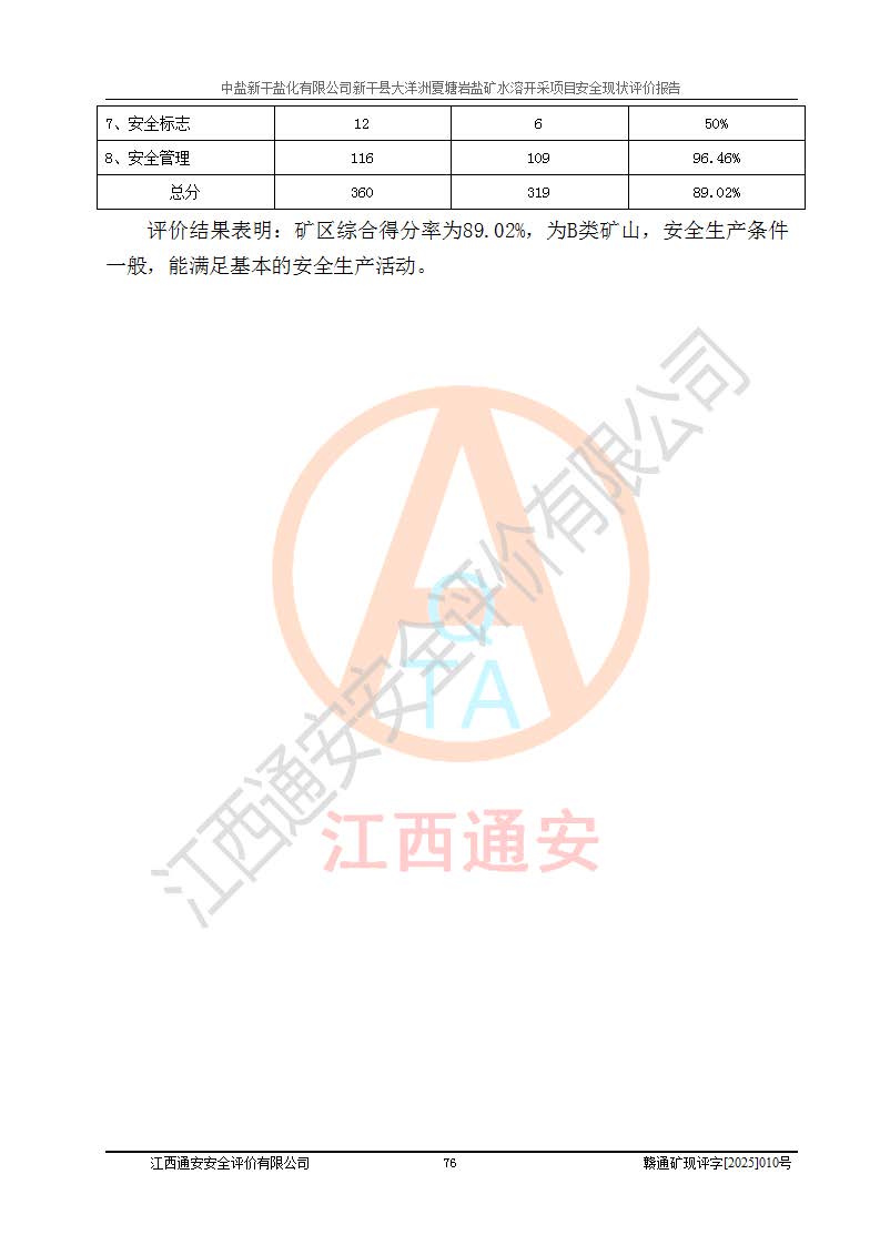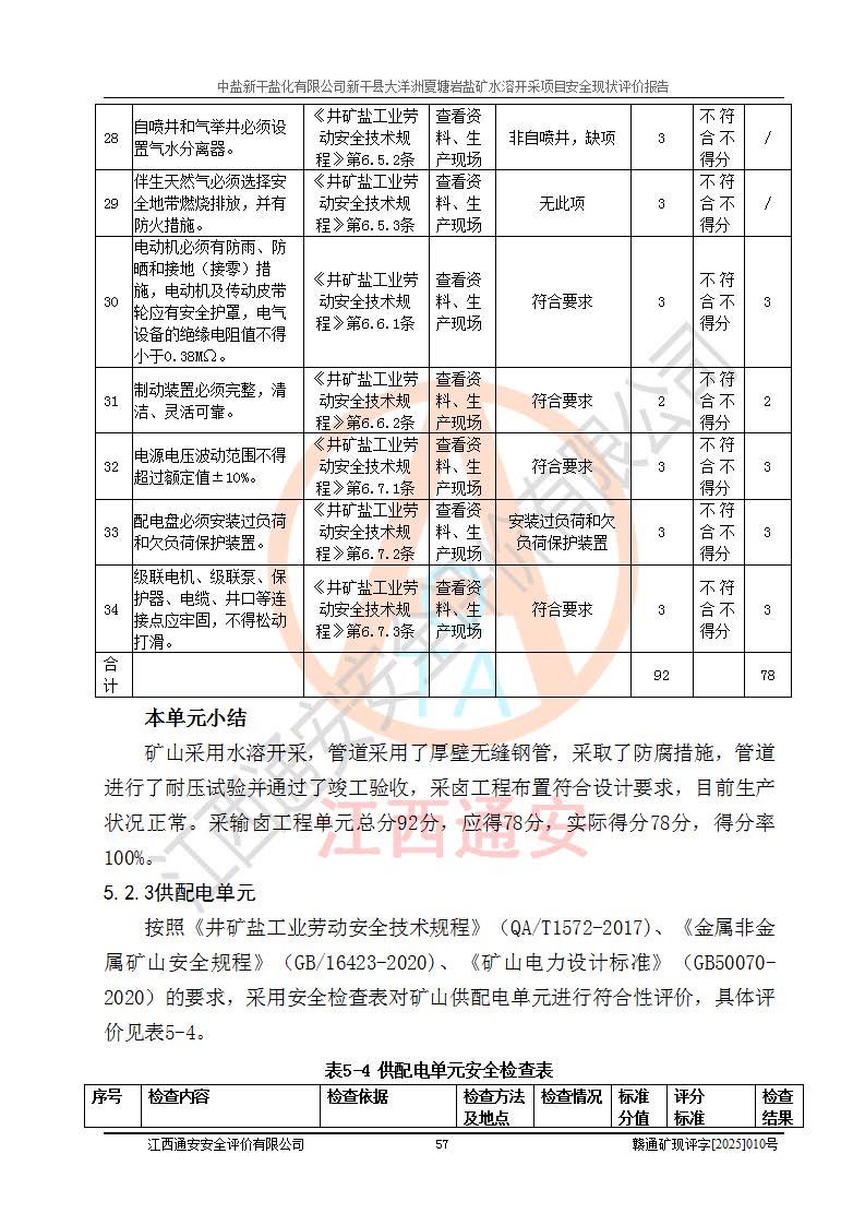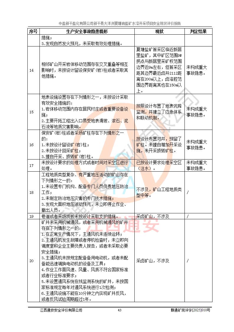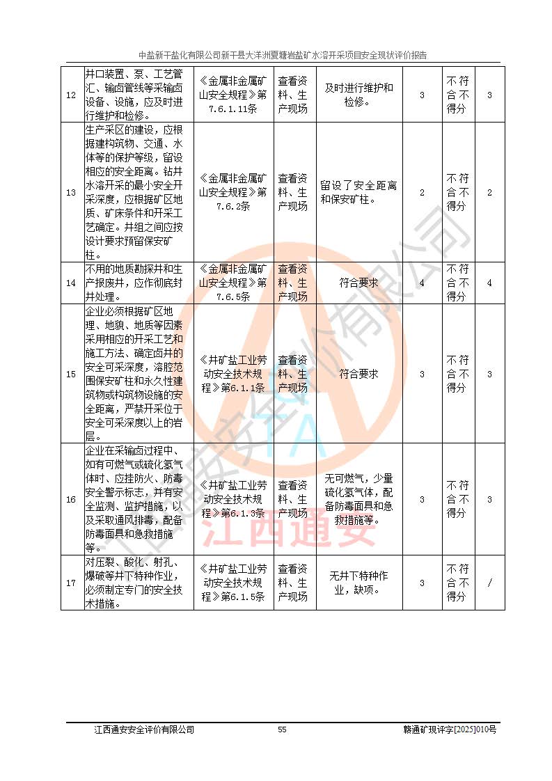 其它 | 通過對該礦存在的危險、有害因素進行了分析與辨識,其主要的危險因素有:地表陷落、坍塌、物體打擊、機械傷害、觸電、火災(zāi)、高處墜落、淹溺、其他爆炸(管道爆炸)、灼燙、爆裂、起重傷害、**傷害、地表沉降、塌陷、粉塵和噪聲與振動等,其中地表陷落和管道腐蝕為主要危險因素,應(yīng)重點采取安全對策措施,其他為一般危險因素。洪澇、雷擊、坍塌、地震等4類自然災(zāi)害、地質(zhì)危害因素。主要有害因素為噪聲和腐蝕。經(jīng)風(fēng)險評價得出礦山采鹵作業(yè)為低風(fēng)險水平。針對以上存在的危險、有害因素,本評價報告對該公司提出了應(yīng)完善的安全對策和建議,企業(yè)已整改落實到位。 評價結(jié)論: 中鹽新干鹽化有限公司新干縣大洋洲夏塘巖鹽礦能滿足基本安全生產(chǎn)活動,風(fēng)險在可接受范圍內(nèi),具備安全生產(chǎn)條件。 | ||||