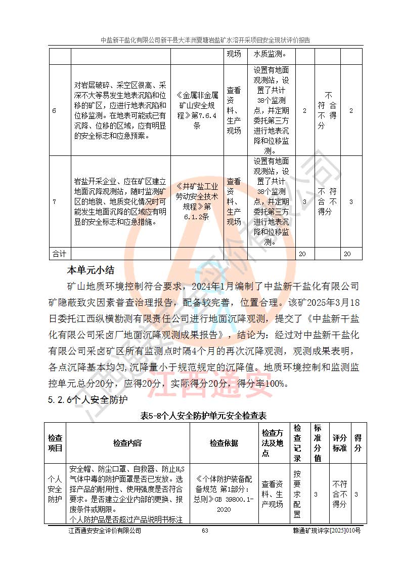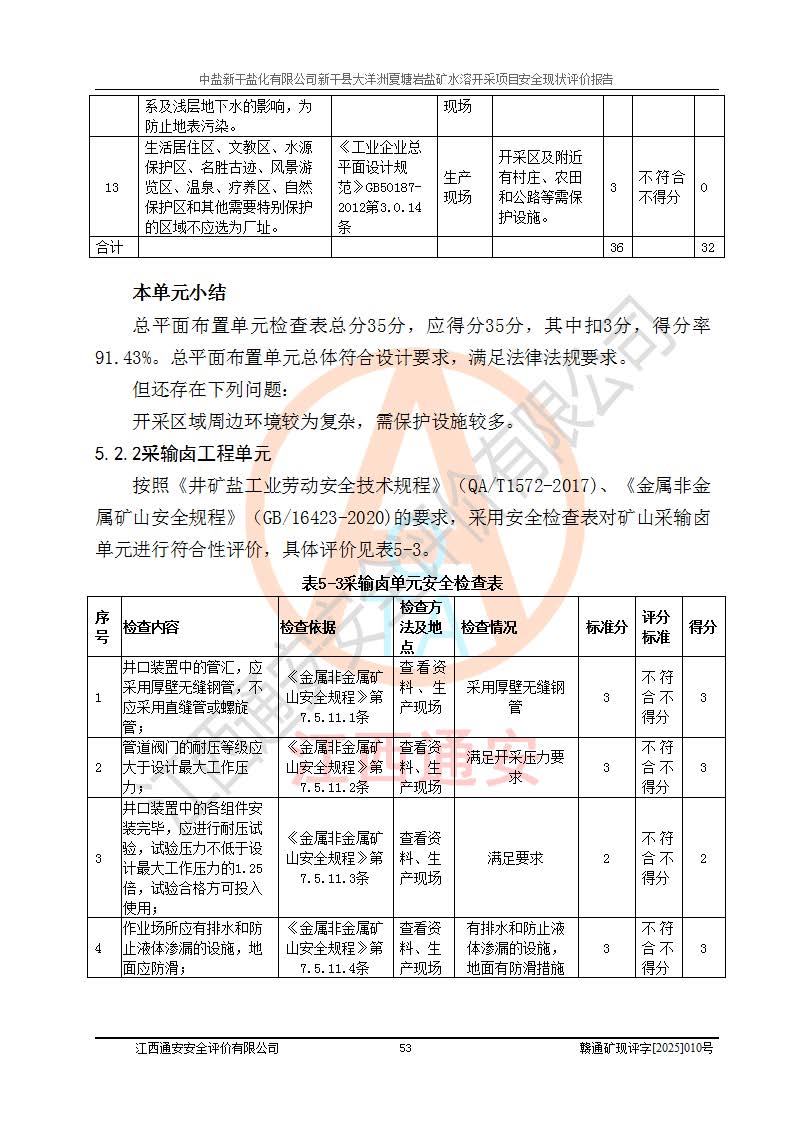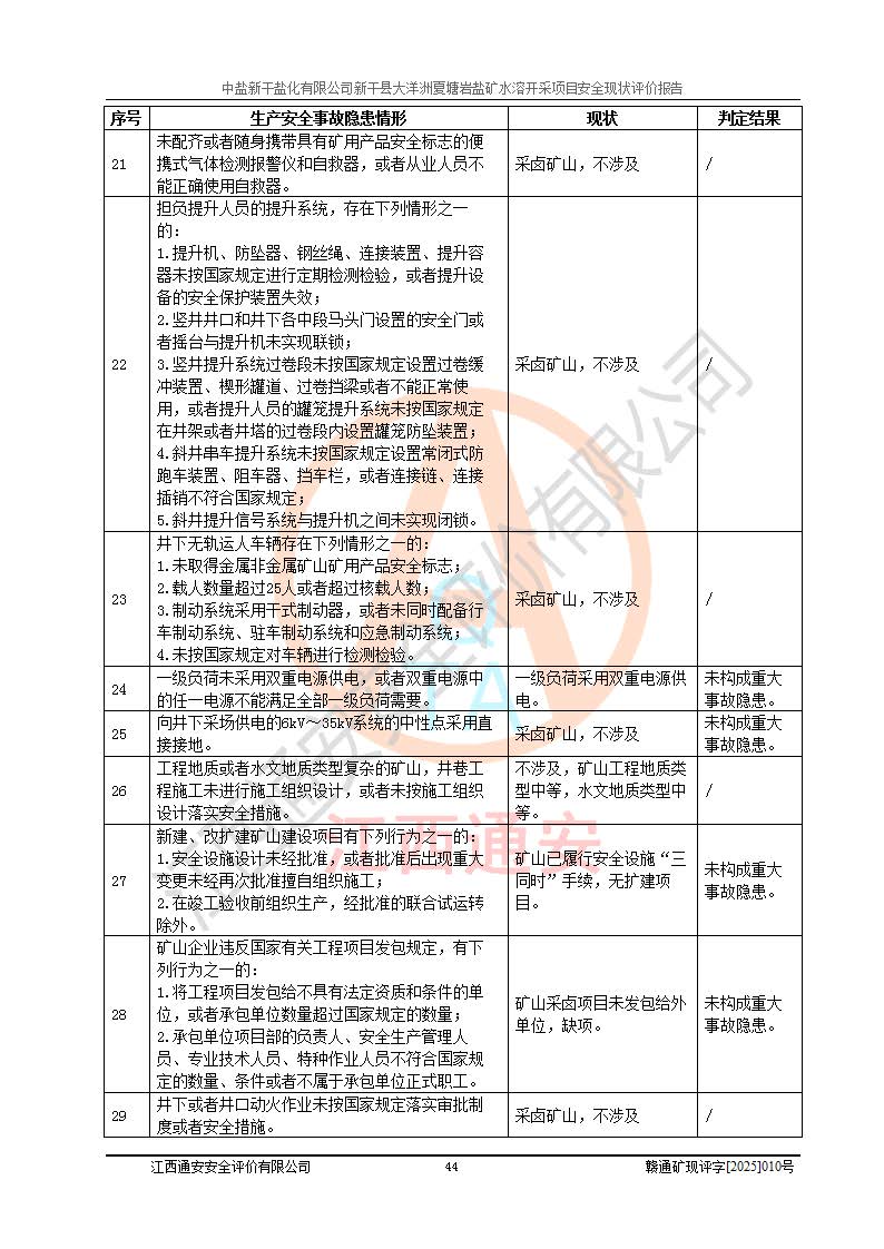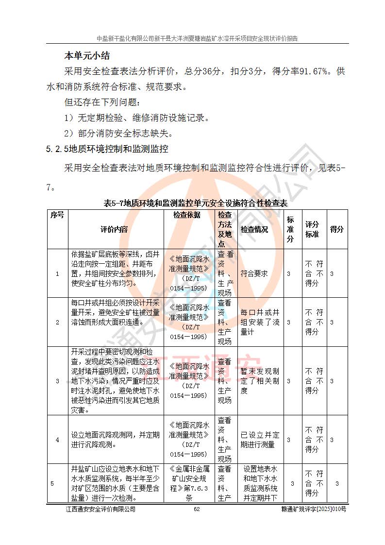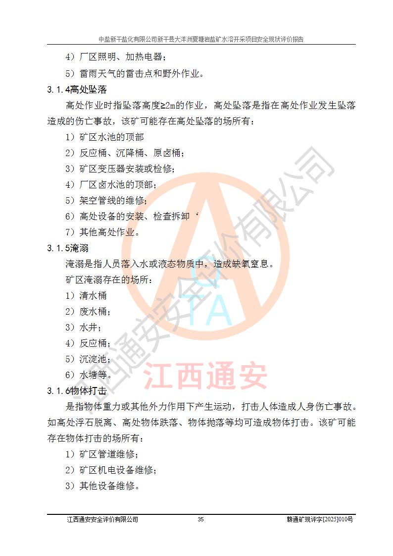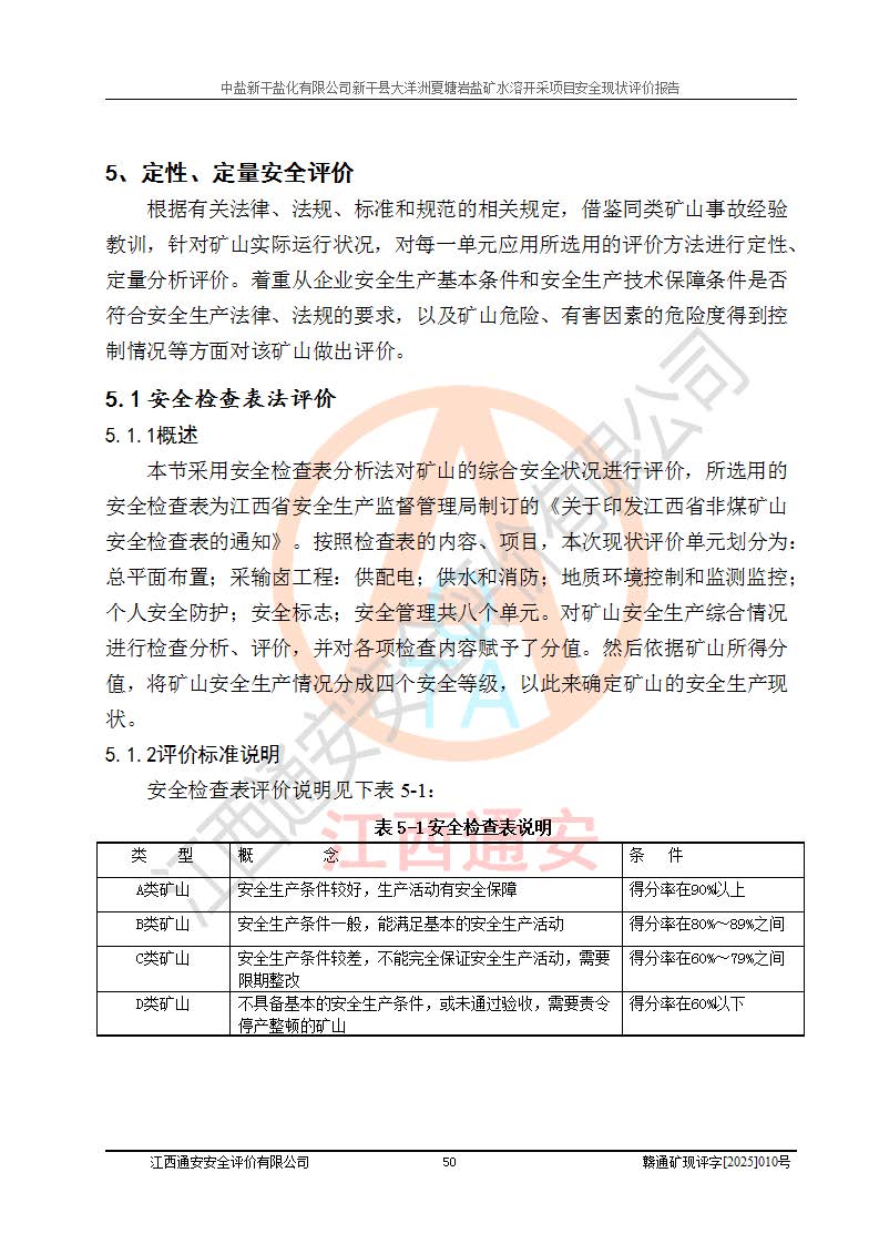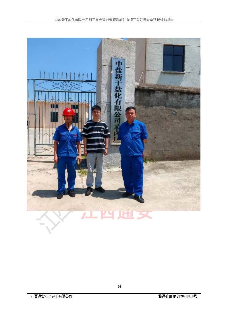 其它 | 通過對該礦存在的危險、有害因素進行了分析與辨識,其主要的危險因素有:地表陷落、坍塌、物體打擊、機械傷害、觸電、火災(zāi)、高處墜落、淹溺、其他爆炸(管道爆炸)、灼燙、爆裂、起重傷害、**傷害、地表沉降、塌陷、粉塵和噪聲與振動等,其中地表陷落和管道腐蝕為主要危險因素,應(yīng)重點采取安全對策措施,其他為一般危險因素。洪澇、雷擊、坍塌、地震等4類自然災(zāi)害、地質(zhì)危害因素。主要有害因素為噪聲和腐蝕。經(jīng)風(fēng)險評價得出礦山采鹵作業(yè)為低風(fēng)險水平。針對以上存在的危險、有害因素,本評價報告對該公司提出了應(yīng)完善的安全對策和建議,企業(yè)已整改落實到位。 評價結(jié)論: 中鹽新干鹽化有限公司新干縣大洋洲夏塘巖鹽礦能滿足基本安全生產(chǎn)活動,風(fēng)險在可接受范圍內(nèi),具備安全生產(chǎn)條件。 | ||||