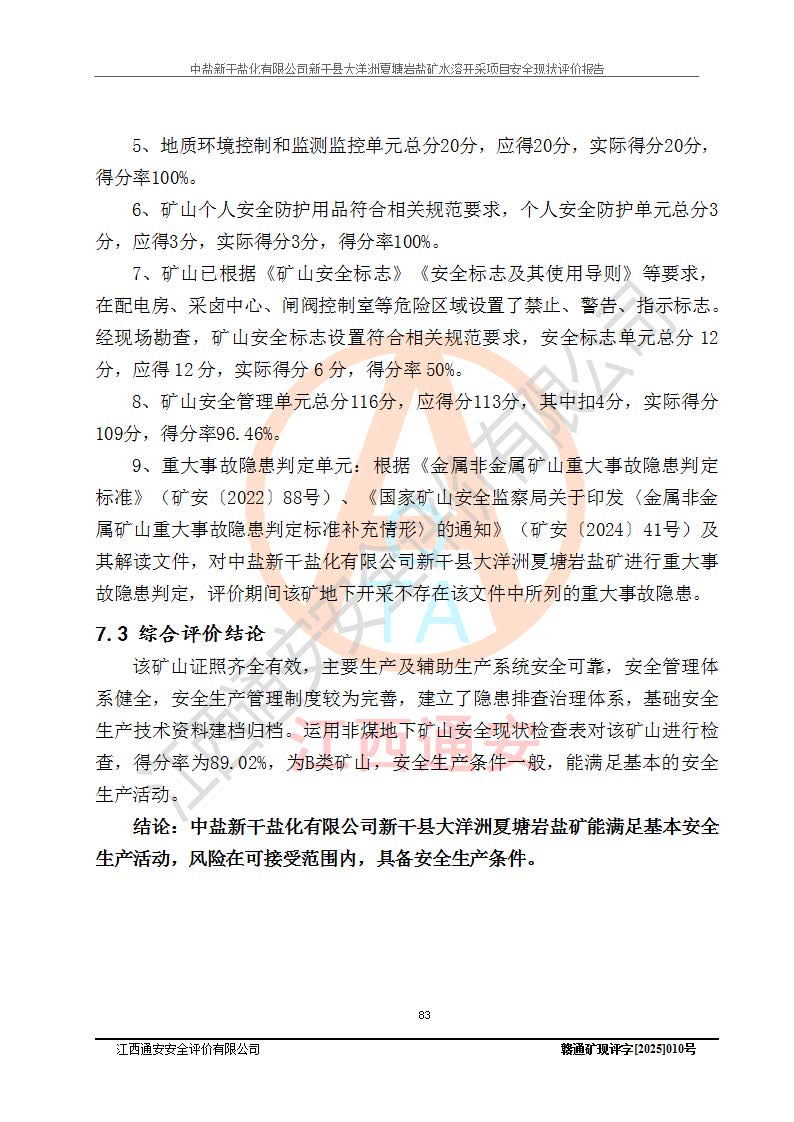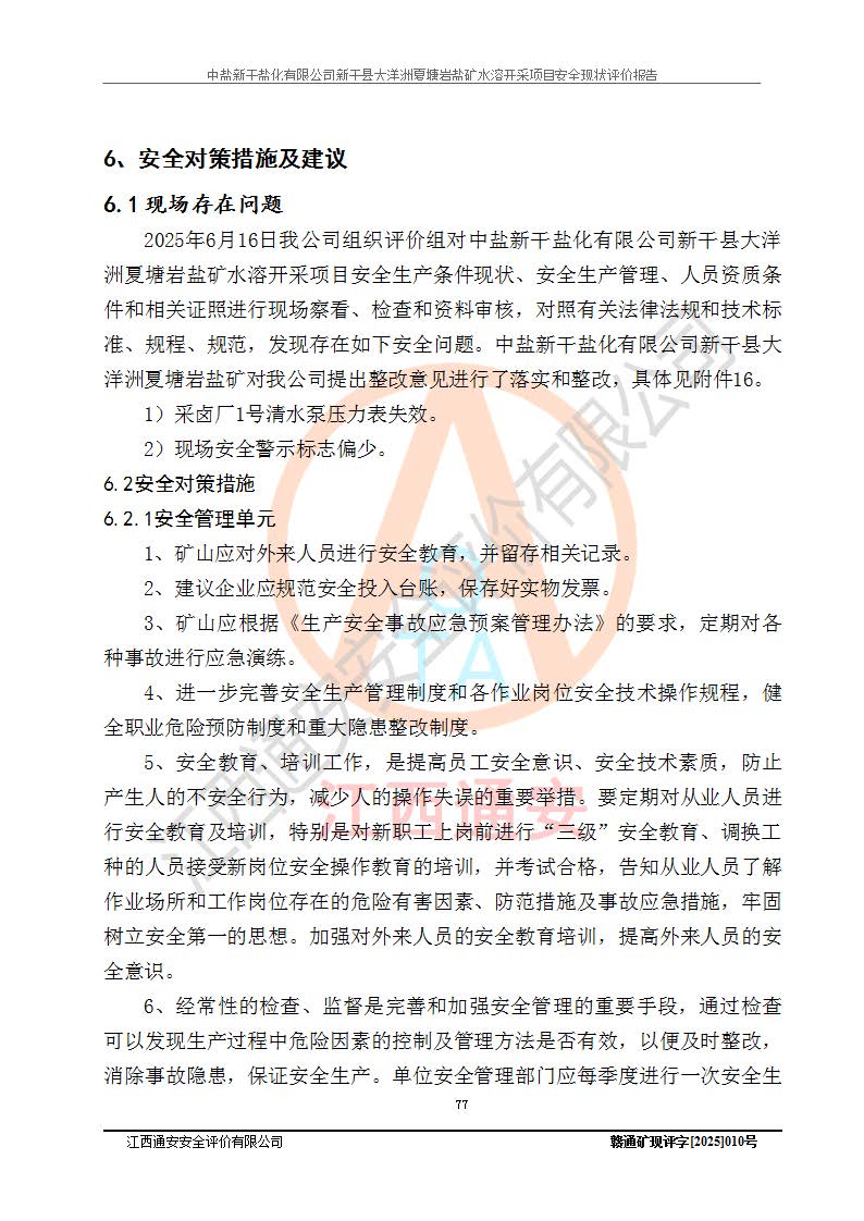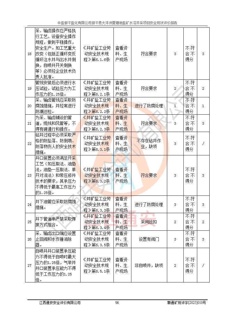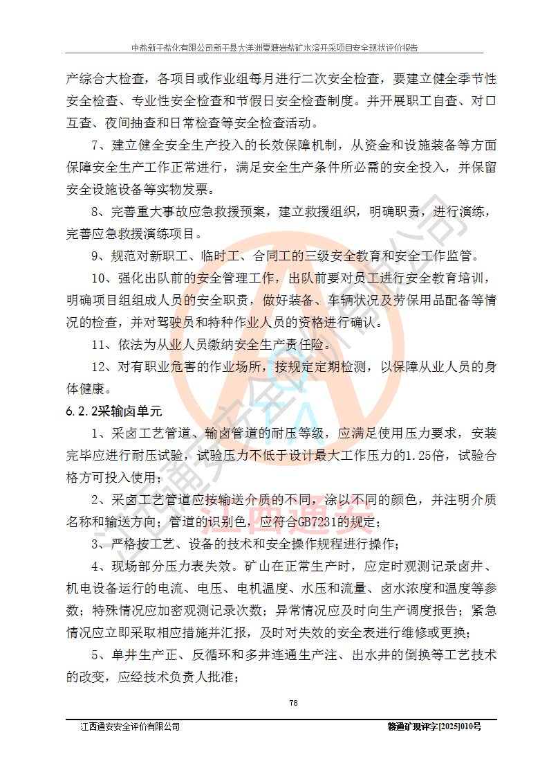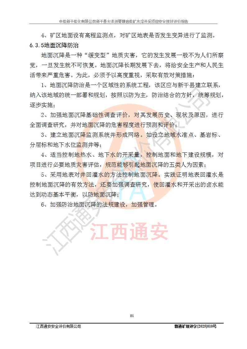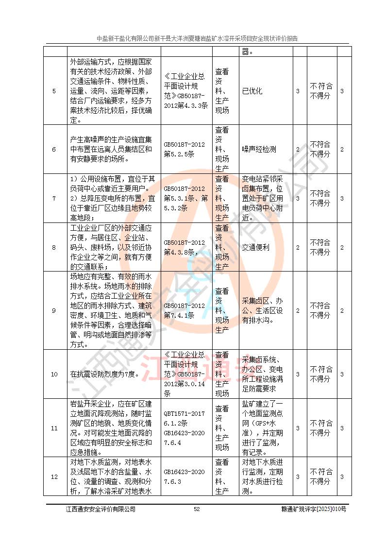 其它 | 通過對該礦存在的危險、有害因素進行了分析與辨識,其主要的危險因素有:地表陷落、坍塌、物體打擊、機械傷害、觸電、火災(zāi)、高處墜落、淹溺、其他爆炸(管道爆炸)、灼燙、爆裂、起重傷害、**傷害、地表沉降、塌陷、粉塵和噪聲與振動等,其中地表陷落和管道腐蝕為主要危險因素,應(yīng)重點采取安全對策措施,其他為一般危險因素。洪澇、雷擊、坍塌、地震等4類自然災(zāi)害、地質(zhì)危害因素。主要有害因素為噪聲和腐蝕。經(jīng)風(fēng)險評價得出礦山采鹵作業(yè)為低風(fēng)險水平。針對以上存在的危險、有害因素,本評價報告對該公司提出了應(yīng)完善的安全對策和建議,企業(yè)已整改落實到位。 評價結(jié)論: 中鹽新干鹽化有限公司新干縣大洋洲夏塘巖鹽礦能滿足基本安全生產(chǎn)活動,風(fēng)險在可接受范圍內(nèi),具備安全生產(chǎn)條件。 | ||||