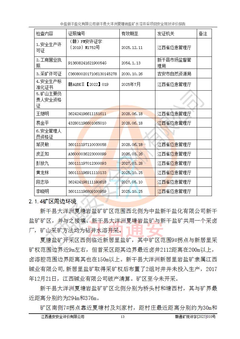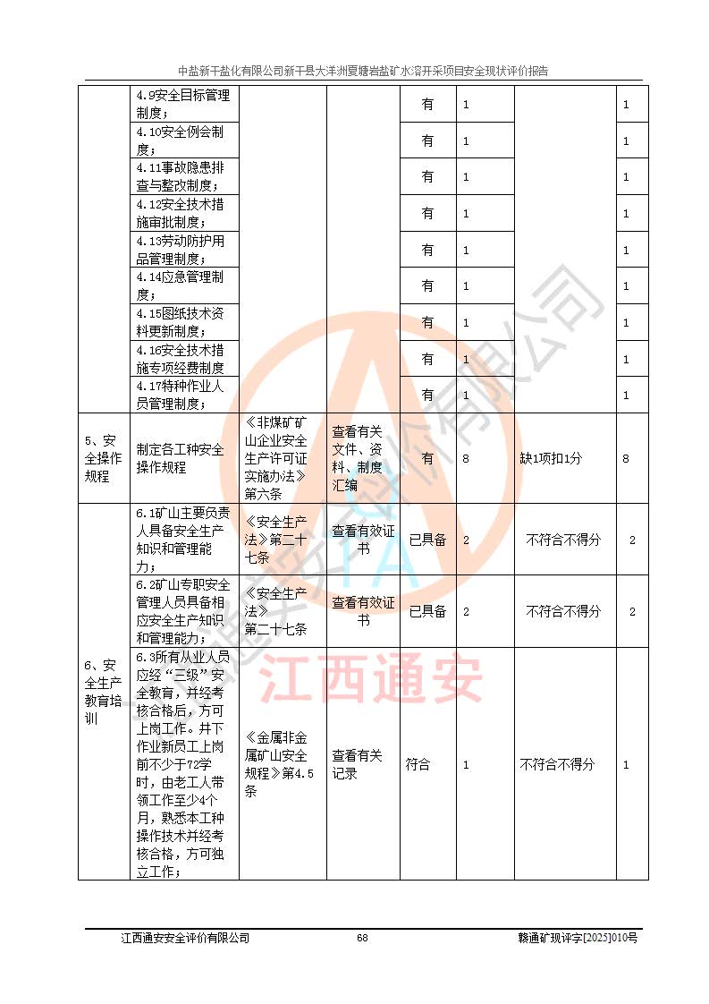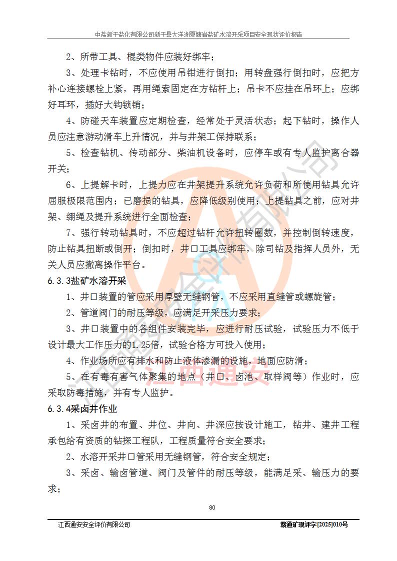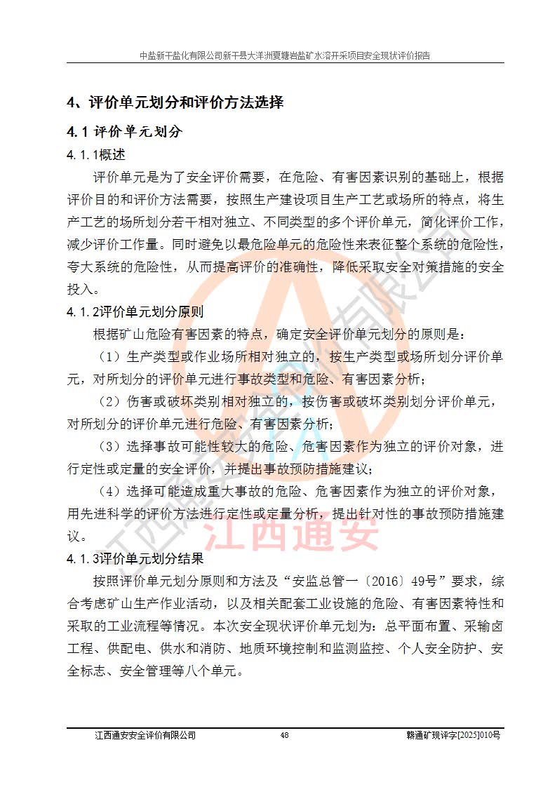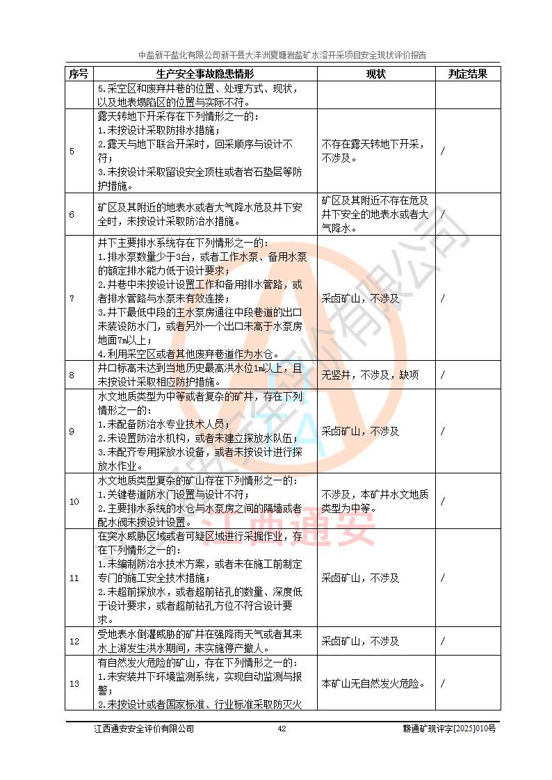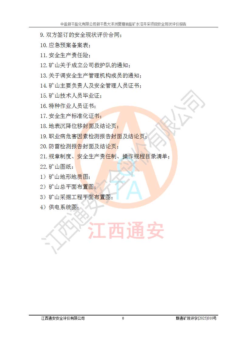 其它 | 通過對該礦存在的危險、有害因素進行了分析與辨識,其主要的危險因素有:地表陷落、坍塌、物體打擊、機械傷害、觸電、火災(zāi)、高處墜落、淹溺、其他爆炸(管道爆炸)、灼燙、爆裂、起重傷害、**傷害、地表沉降、塌陷、粉塵和噪聲與振動等,其中地表陷落和管道腐蝕為主要危險因素,應(yīng)重點采取安全對策措施,其他為一般危險因素。洪澇、雷擊、坍塌、地震等4類自然災(zāi)害、地質(zhì)危害因素。主要有害因素為噪聲和腐蝕。經(jīng)風(fēng)險評價得出礦山采鹵作業(yè)為低風(fēng)險水平。針對以上存在的危險、有害因素,本評價報告對該公司提出了應(yīng)完善的安全對策和建議,企業(yè)已整改落實到位。 評價結(jié)論: 中鹽新干鹽化有限公司新干縣大洋洲夏塘巖鹽礦能滿足基本安全生產(chǎn)活動,風(fēng)險在可接受范圍內(nèi),具備安全生產(chǎn)條件。 | ||||