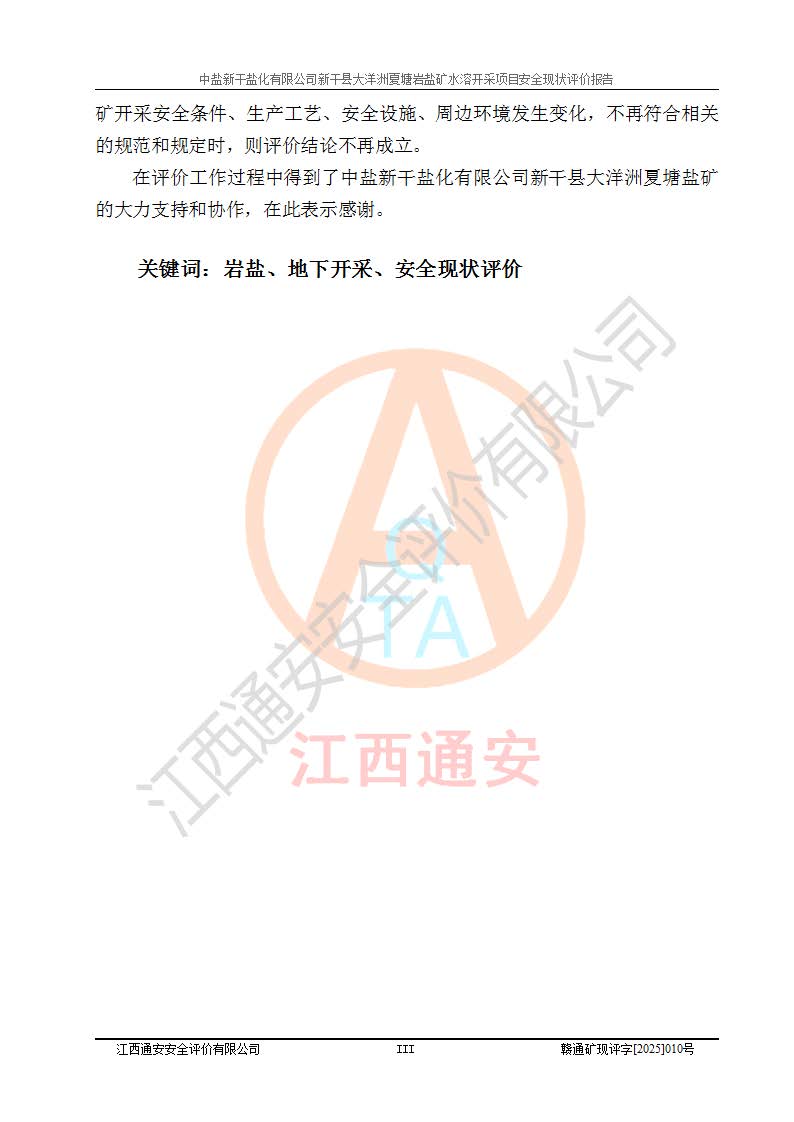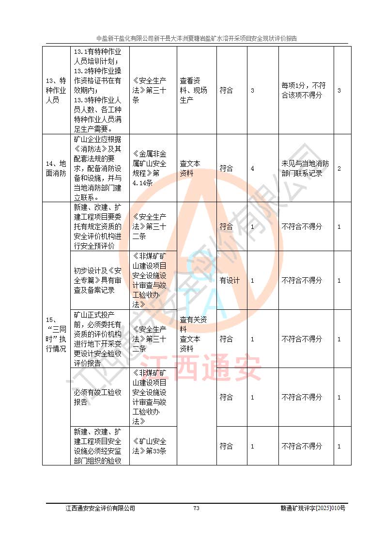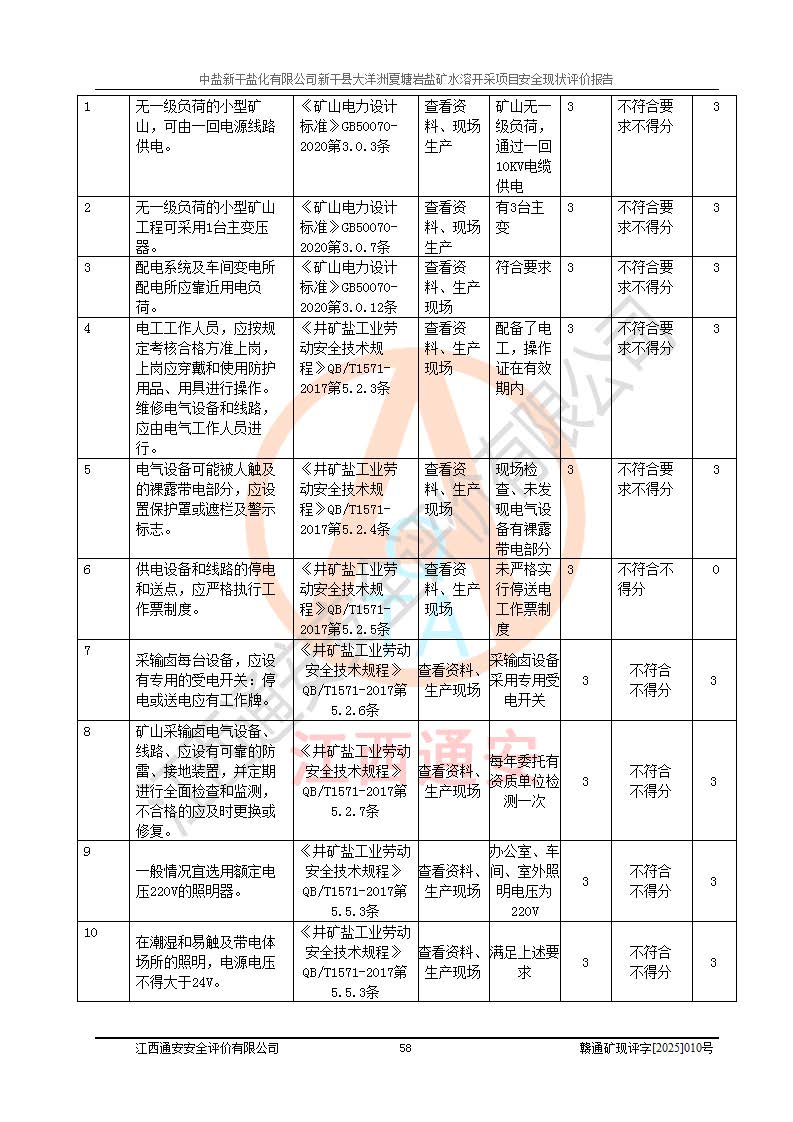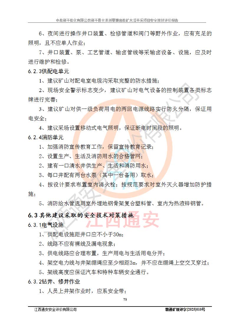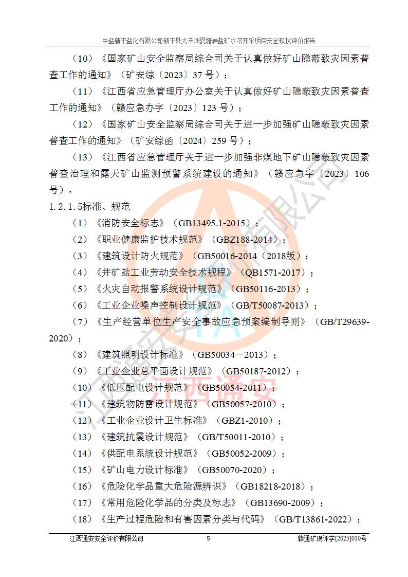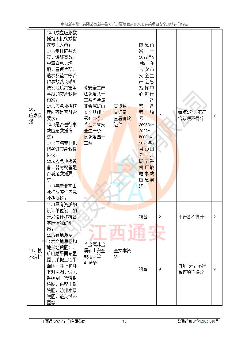 其它 | 通過對該礦存在的危險、有害因素進行了分析與辨識,其主要的危險因素有:地表陷落、坍塌、物體打擊、機械傷害、觸電、火災(zāi)、高處墜落、淹溺、其他爆炸(管道爆炸)、灼燙、爆裂、起重傷害、**傷害、地表沉降、塌陷、粉塵和噪聲與振動等,其中地表陷落和管道腐蝕為主要危險因素,應(yīng)重點采取安全對策措施,其他為一般危險因素。洪澇、雷擊、坍塌、地震等4類自然災(zāi)害、地質(zhì)危害因素。主要有害因素為噪聲和腐蝕。經(jīng)風(fēng)險評價得出礦山采鹵作業(yè)為低風(fēng)險水平。針對以上存在的危險、有害因素,本評價報告對該公司提出了應(yīng)完善的安全對策和建議,企業(yè)已整改落實到位。 評價結(jié)論: 中鹽新干鹽化有限公司新干縣大洋洲夏塘巖鹽礦能滿足基本安全生產(chǎn)活動,風(fēng)險在可接受范圍內(nèi),具備安全生產(chǎn)條件。 | ||||