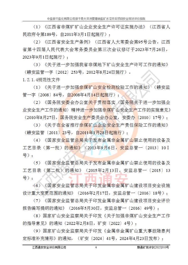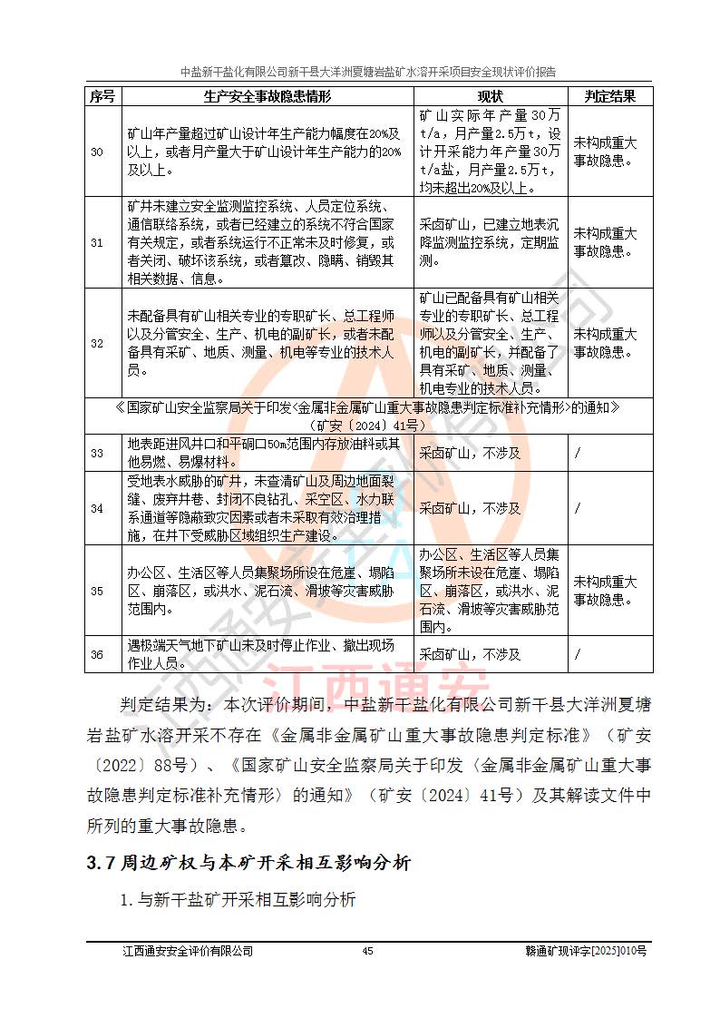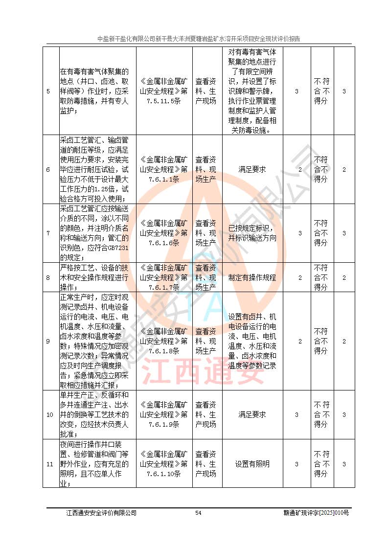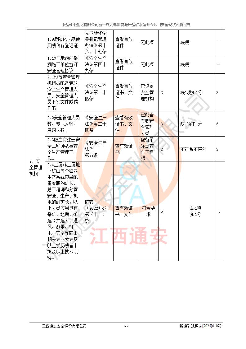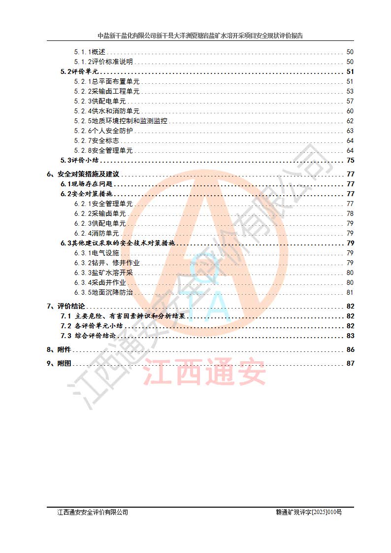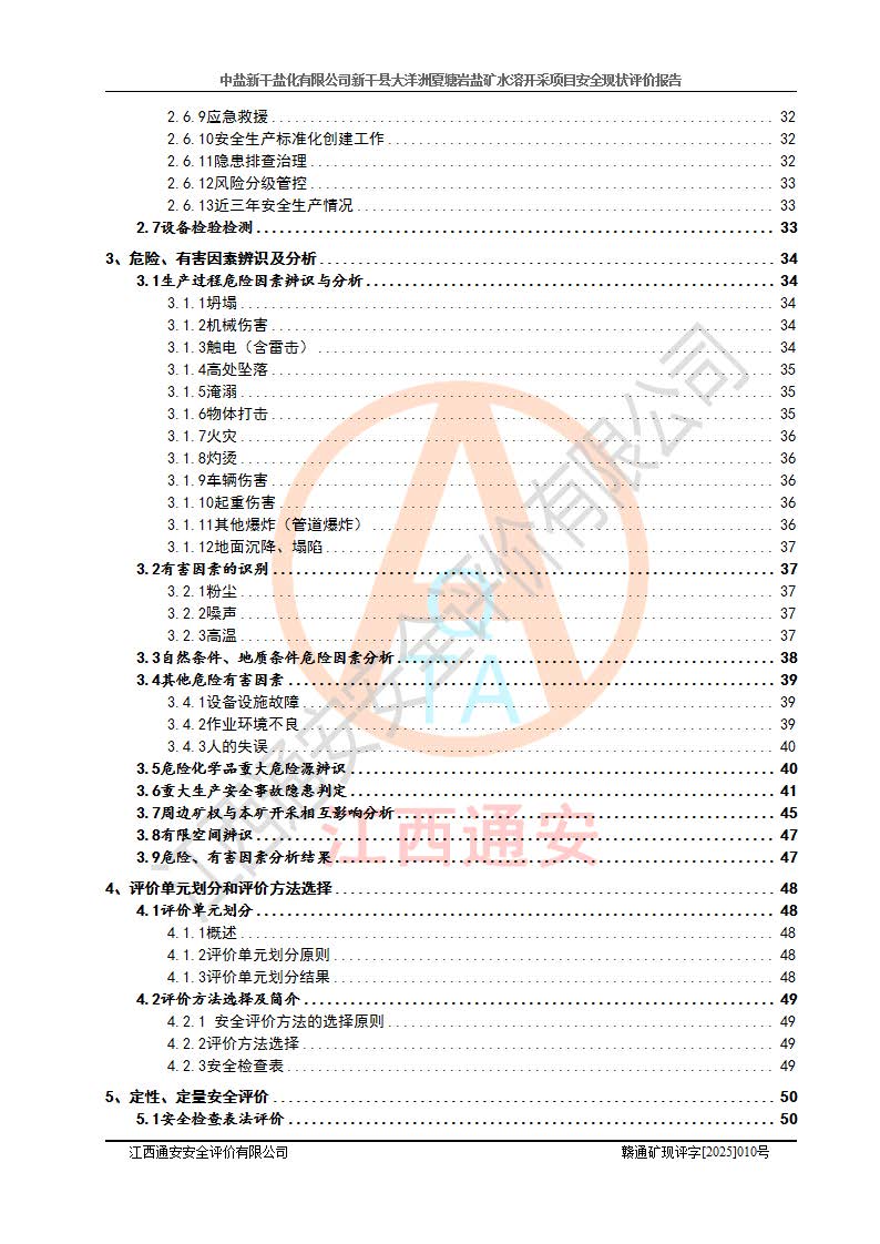 其它 | 通過對該礦存在的危險、有害因素進行了分析與辨識,其主要的危險因素有:地表陷落、坍塌、物體打擊、機械傷害、觸電、火災(zāi)、高處墜落、淹溺、其他爆炸(管道爆炸)、灼燙、爆裂、起重傷害、**傷害、地表沉降、塌陷、粉塵和噪聲與振動等,其中地表陷落和管道腐蝕為主要危險因素,應(yīng)重點采取安全對策措施,其他為一般危險因素。洪澇、雷擊、坍塌、地震等4類自然災(zāi)害、地質(zhì)危害因素。主要有害因素為噪聲和腐蝕。經(jīng)風(fēng)險評價得出礦山采鹵作業(yè)為低風(fēng)險水平。針對以上存在的危險、有害因素,本評價報告對該公司提出了應(yīng)完善的安全對策和建議,企業(yè)已整改落實到位。 評價結(jié)論: 中鹽新干鹽化有限公司新干縣大洋洲夏塘巖鹽礦能滿足基本安全生產(chǎn)活動,風(fēng)險在可接受范圍內(nèi),具備安全生產(chǎn)條件。 | ||||