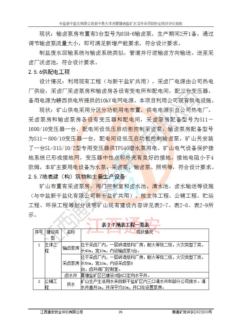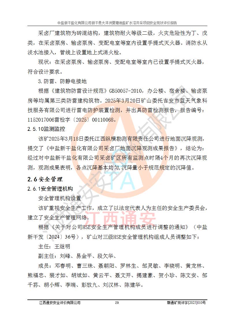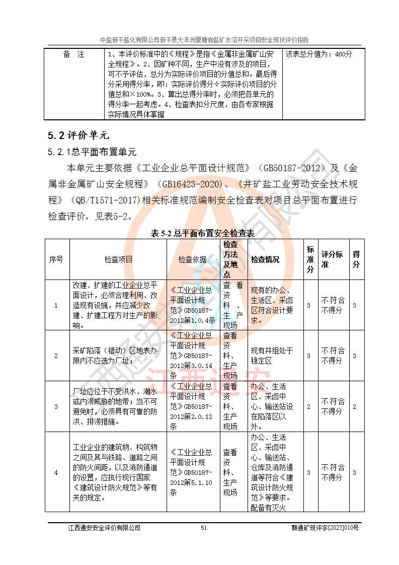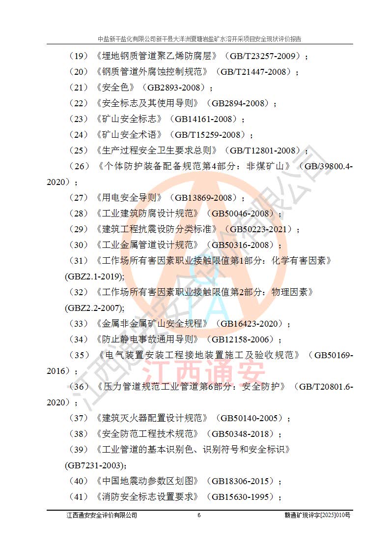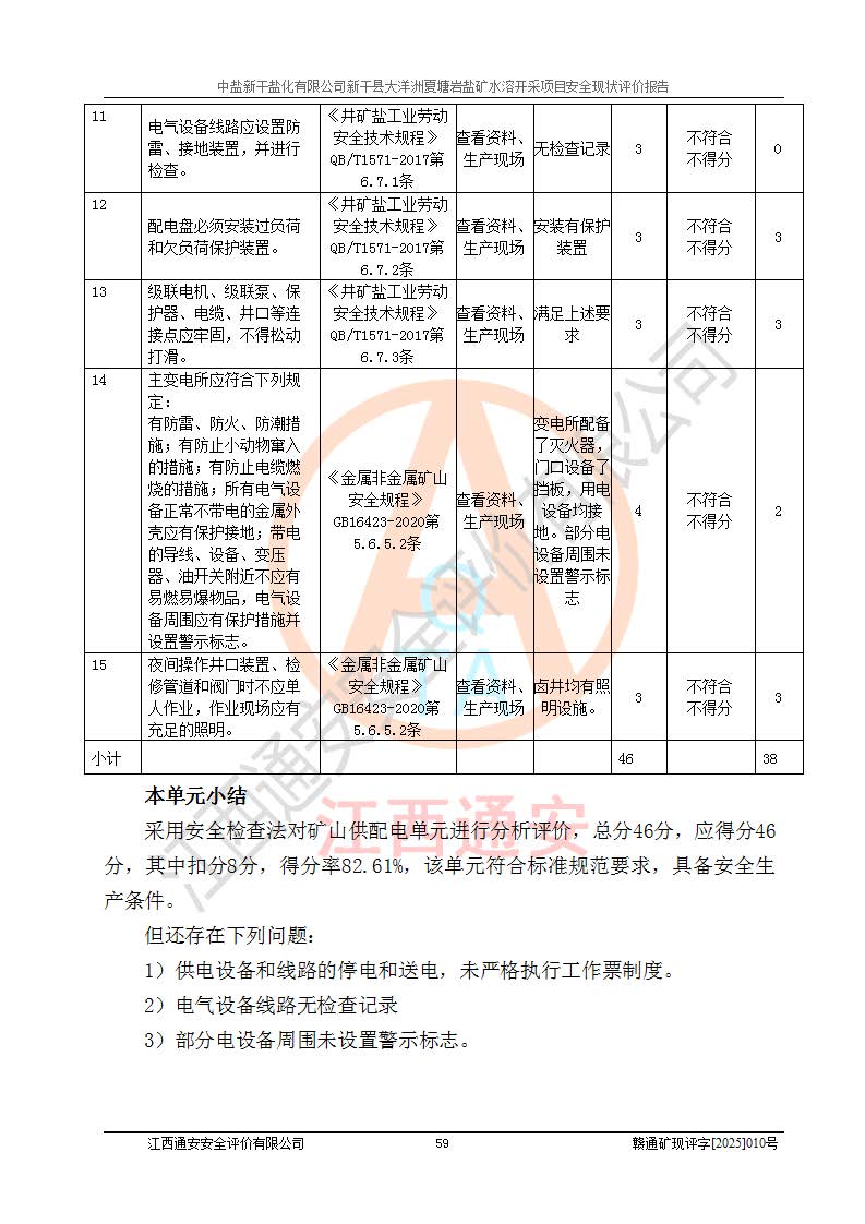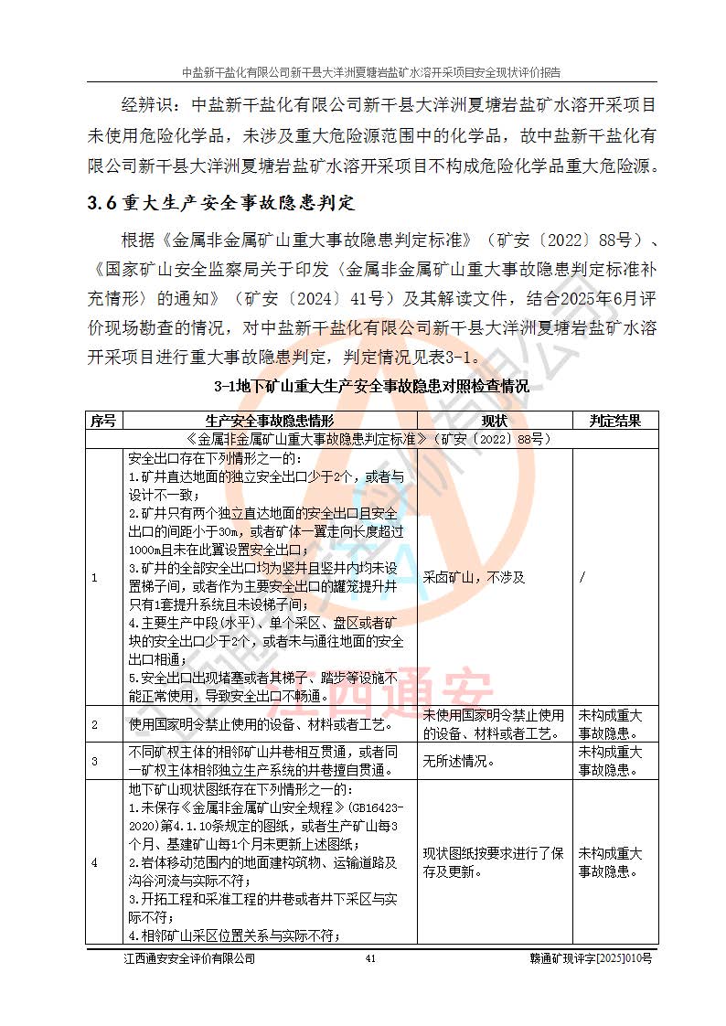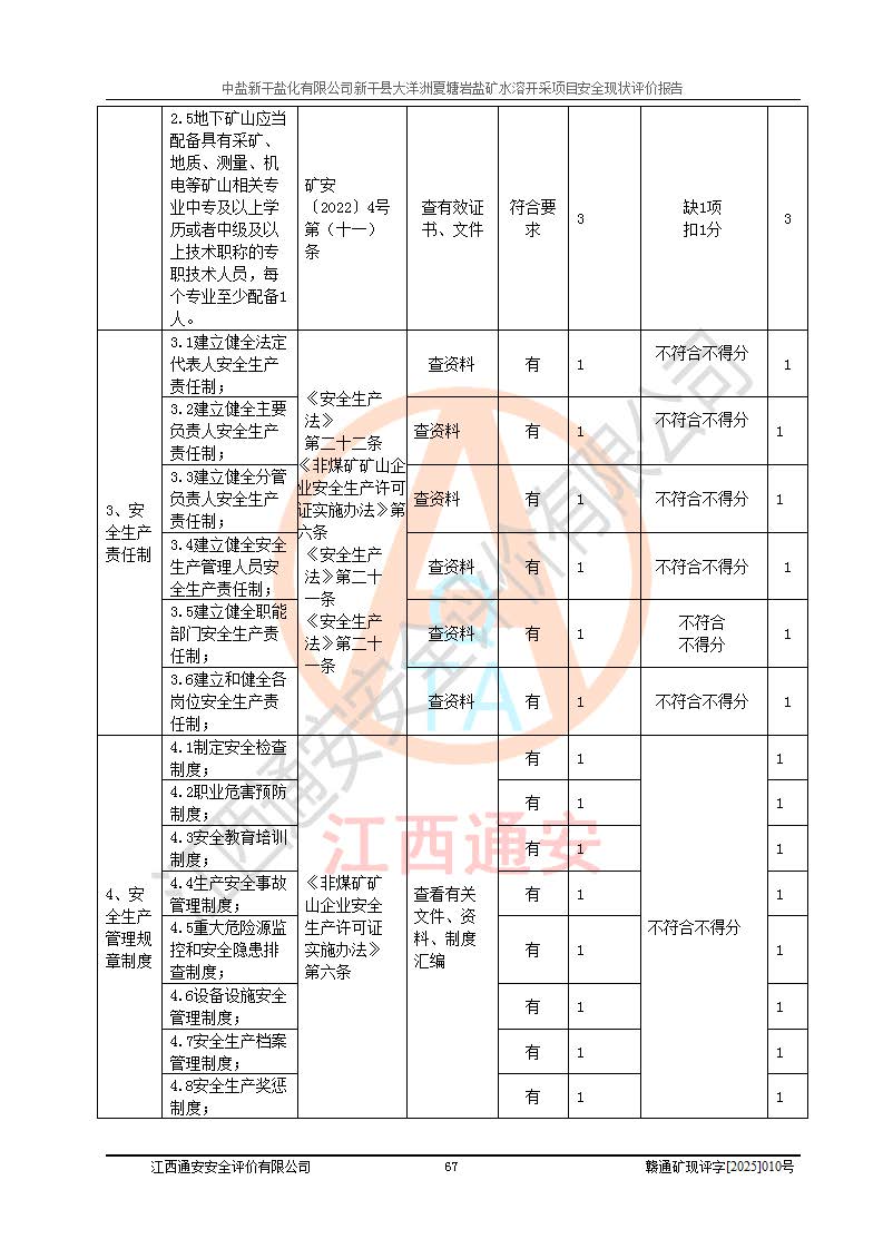 其它 | 通過對該礦存在的危險、有害因素進行了分析與辨識,其主要的危險因素有:地表陷落、坍塌、物體打擊、機械傷害、觸電、火災(zāi)、高處墜落、淹溺、其他爆炸(管道爆炸)、灼燙、爆裂、起重傷害、**傷害、地表沉降、塌陷、粉塵和噪聲與振動等,其中地表陷落和管道腐蝕為主要危險因素,應(yīng)重點采取安全對策措施,其他為一般危險因素。洪澇、雷擊、坍塌、地震等4類自然災(zāi)害、地質(zhì)危害因素。主要有害因素為噪聲和腐蝕。經(jīng)風(fēng)險評價得出礦山采鹵作業(yè)為低風(fēng)險水平。針對以上存在的危險、有害因素,本評價報告對該公司提出了應(yīng)完善的安全對策和建議,企業(yè)已整改落實到位。 評價結(jié)論: 中鹽新干鹽化有限公司新干縣大洋洲夏塘巖鹽礦能滿足基本安全生產(chǎn)活動,風(fēng)險在可接受范圍內(nèi),具備安全生產(chǎn)條件。 | ||||