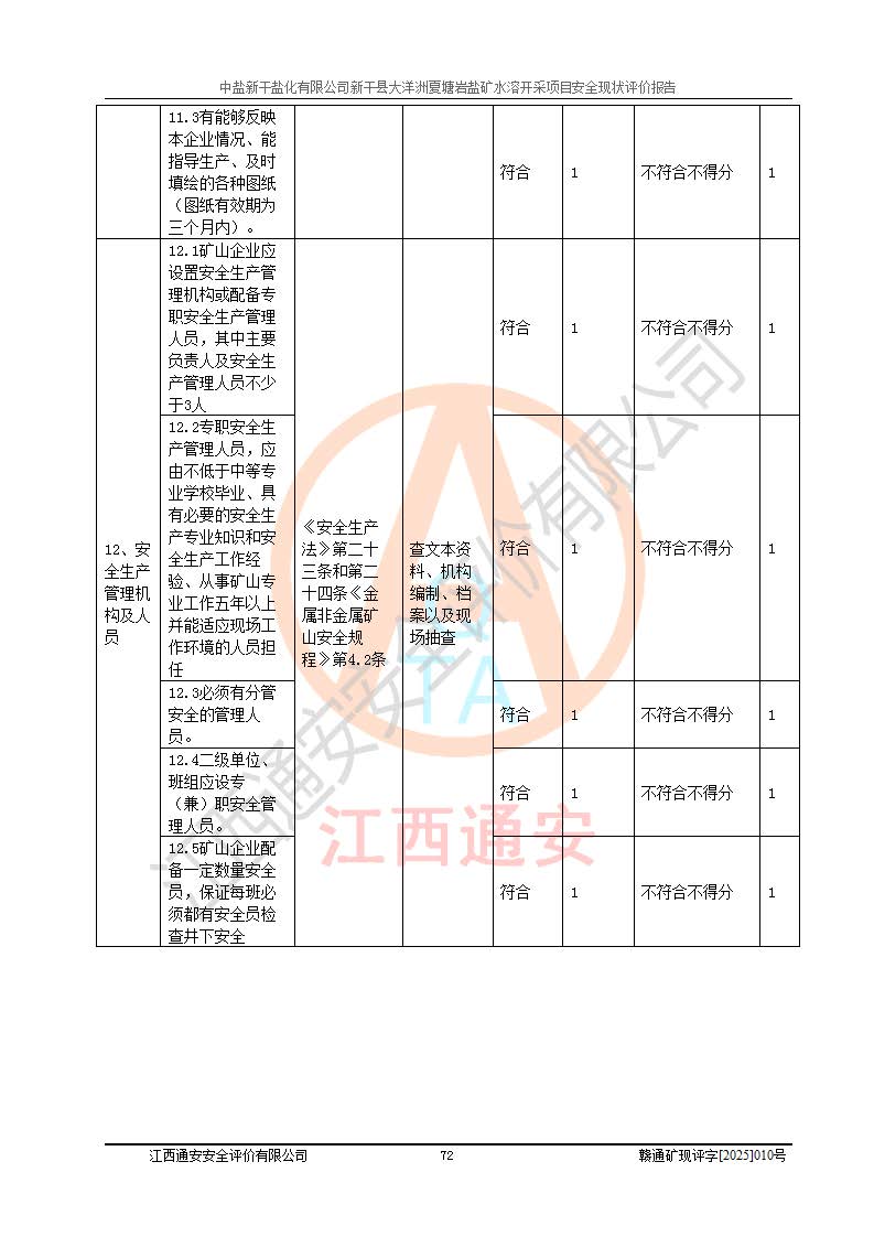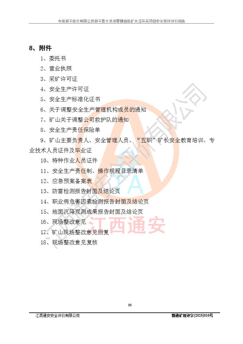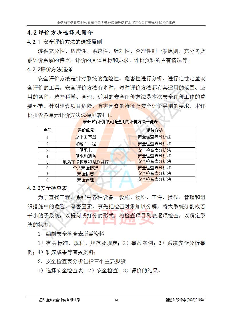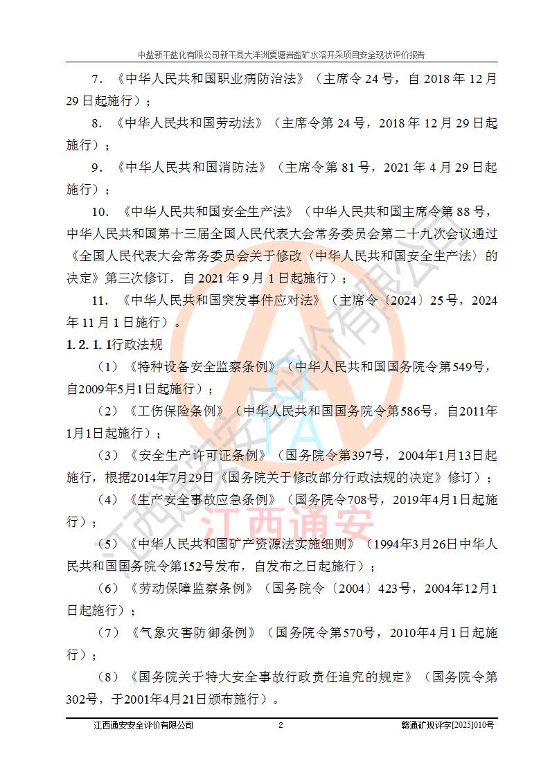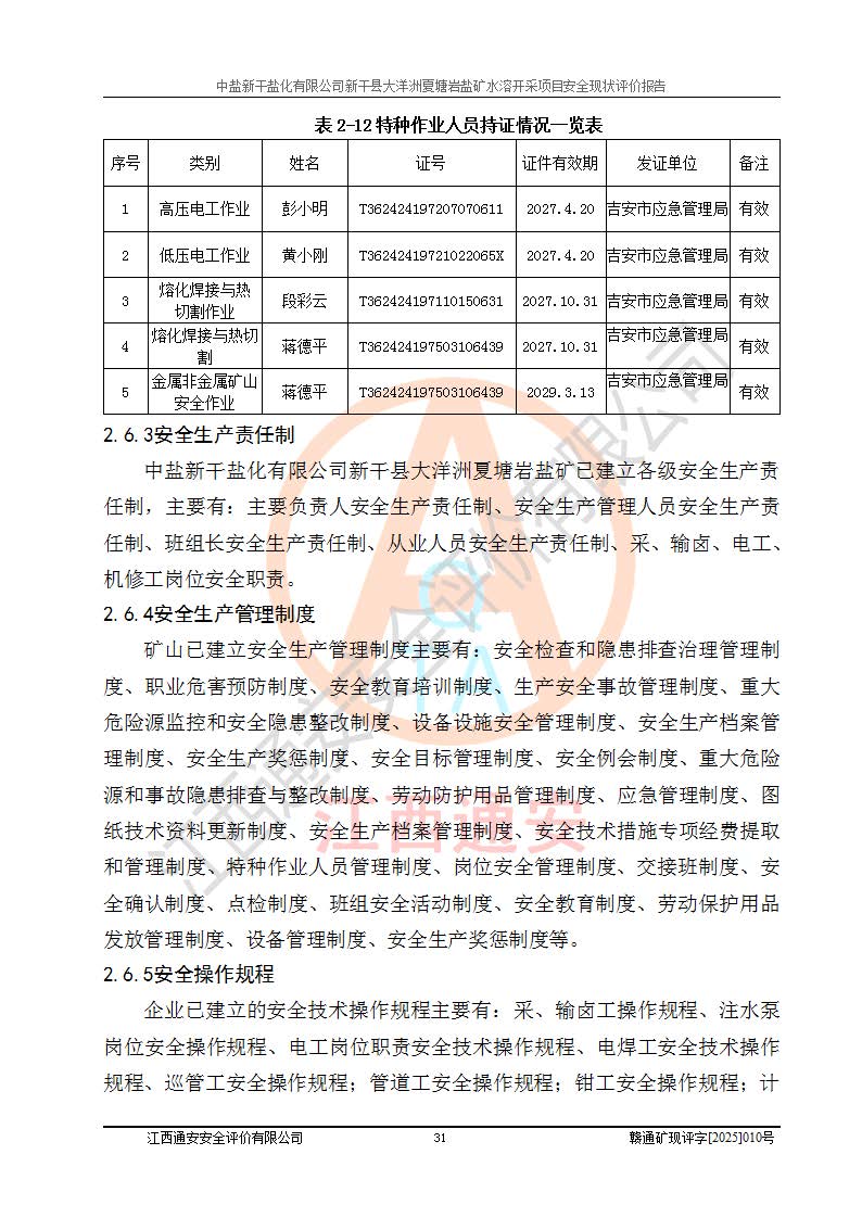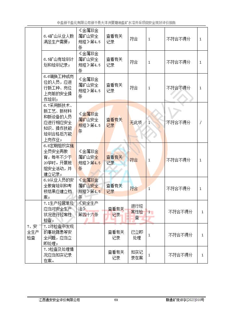其它 | 通過對該礦存在的危險、有害因素進行了分析與辨識,其主要的危險因素有:地表陷落、坍塌、物體打擊、機械傷害、觸電、火災(zāi)、高處墜落、淹溺、其他爆炸(管道爆炸)、灼燙、爆裂、起重傷害、**傷害、地表沉降、塌陷、粉塵和噪聲與振動等,其中地表陷落和管道腐蝕為主要危險因素,應(yīng)重點采取安全對策措施,其他為一般危險因素。洪澇、雷擊、坍塌、地震等4類自然災(zāi)害、地質(zhì)危害因素。主要有害因素為噪聲和腐蝕。經(jīng)風(fēng)險評價得出礦山采鹵作業(yè)為低風(fēng)險水平。針對以上存在的危險、有害因素,本評價報告對該公司提出了應(yīng)完善的安全對策和建議,企業(yè)已整改落實到位。 評價結(jié)論: 中鹽新干鹽化有限公司新干縣大洋洲夏塘巖鹽礦能滿足基本安全生產(chǎn)活動,風(fēng)險在可接受范圍內(nèi),具備安全生產(chǎn)條件。 | ||||