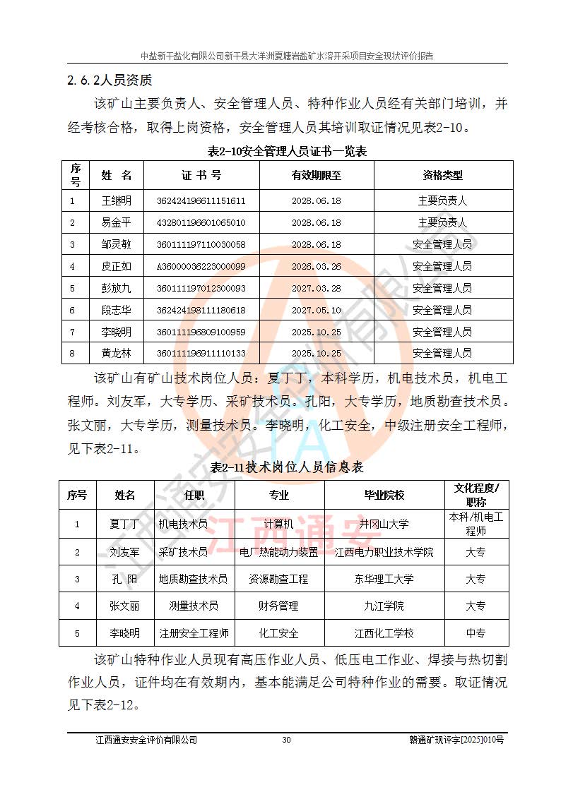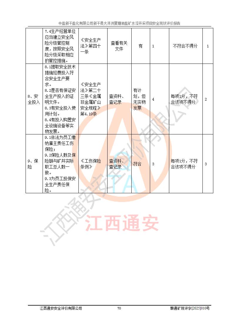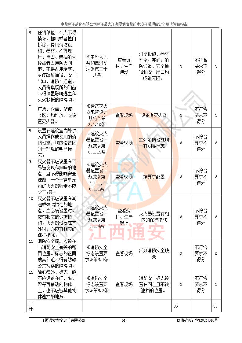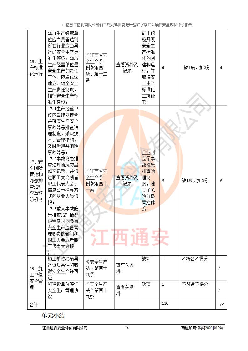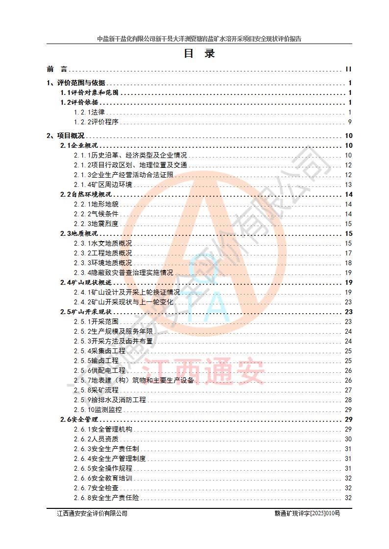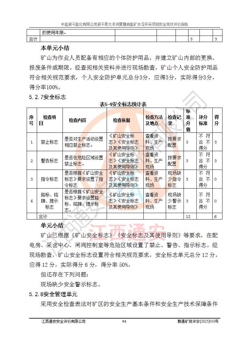 其它 | 通過對該礦存在的危險、有害因素進行了分析與辨識,其主要的危險因素有:地表陷落、坍塌、物體打擊、機械傷害、觸電、火災(zāi)、高處墜落、淹溺、其他爆炸(管道爆炸)、灼燙、爆裂、起重傷害、**傷害、地表沉降、塌陷、粉塵和噪聲與振動等,其中地表陷落和管道腐蝕為主要危險因素,應(yīng)重點采取安全對策措施,其他為一般危險因素。洪澇、雷擊、坍塌、地震等4類自然災(zāi)害、地質(zhì)危害因素。主要有害因素為噪聲和腐蝕。經(jīng)風(fēng)險評價得出礦山采鹵作業(yè)為低風(fēng)險水平。針對以上存在的危險、有害因素,本評價報告對該公司提出了應(yīng)完善的安全對策和建議,企業(yè)已整改落實到位。 評價結(jié)論: 中鹽新干鹽化有限公司新干縣大洋洲夏塘巖鹽礦能滿足基本安全生產(chǎn)活動,風(fēng)險在可接受范圍內(nèi),具備安全生產(chǎn)條件。 | ||||
