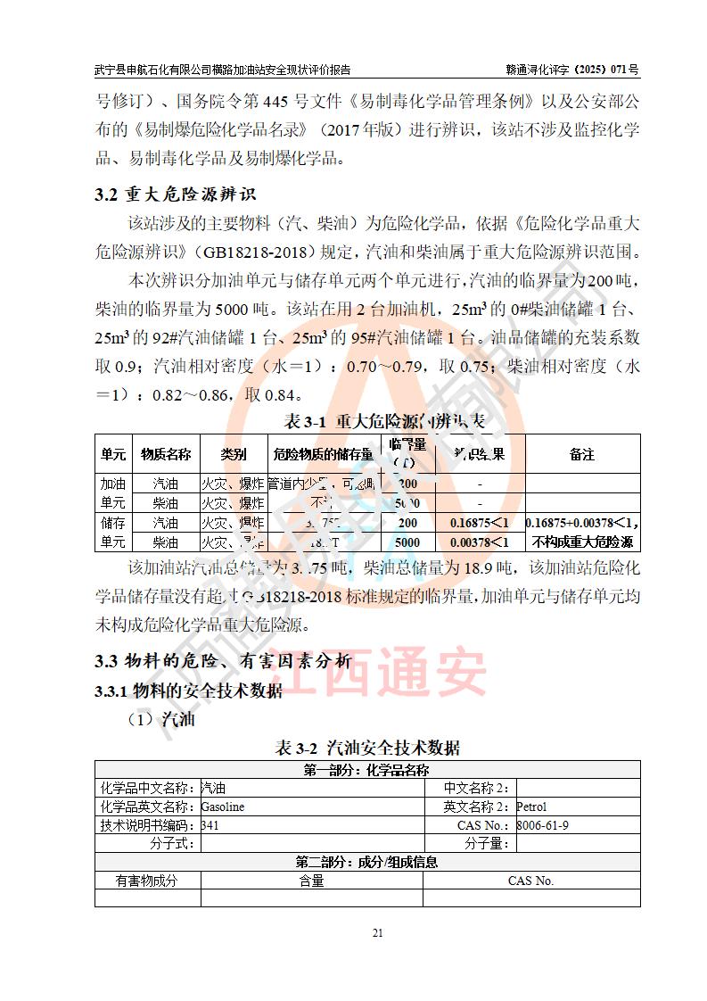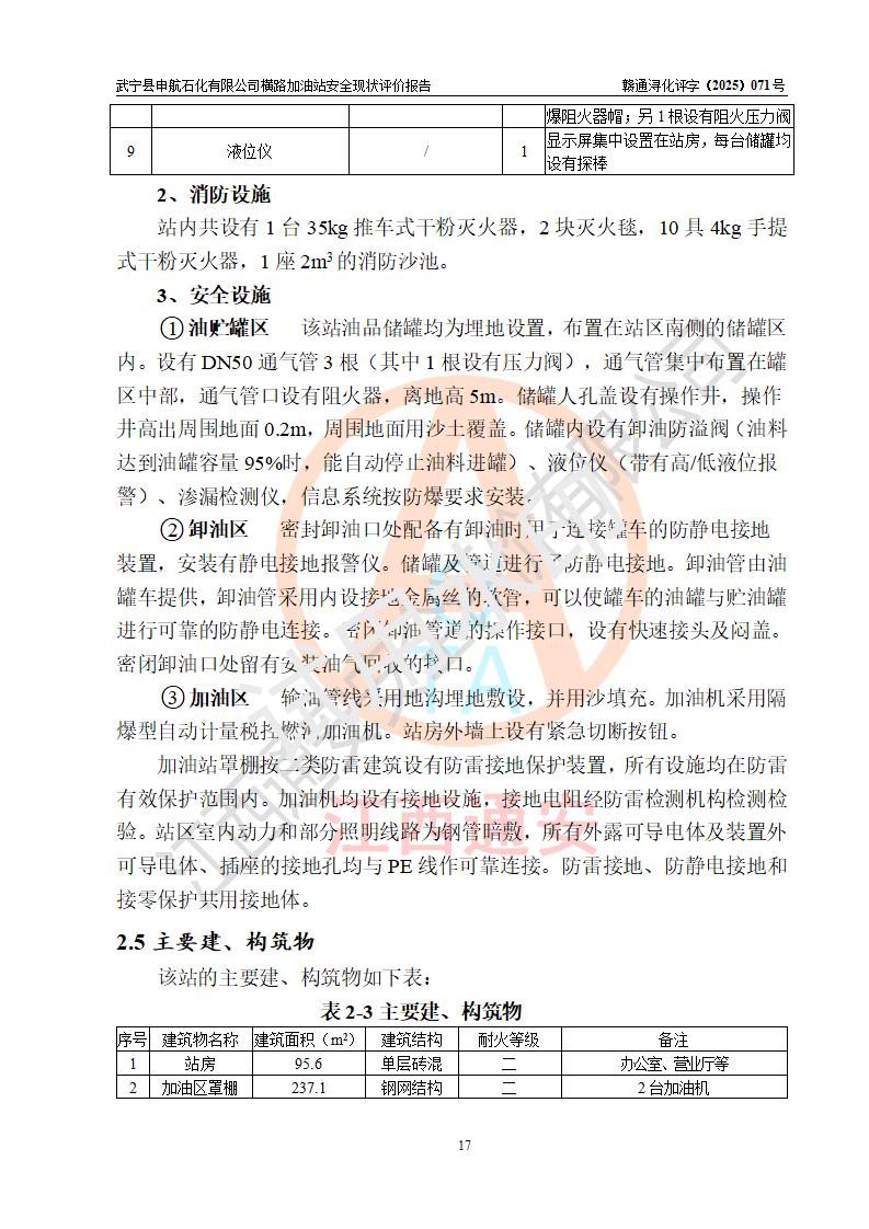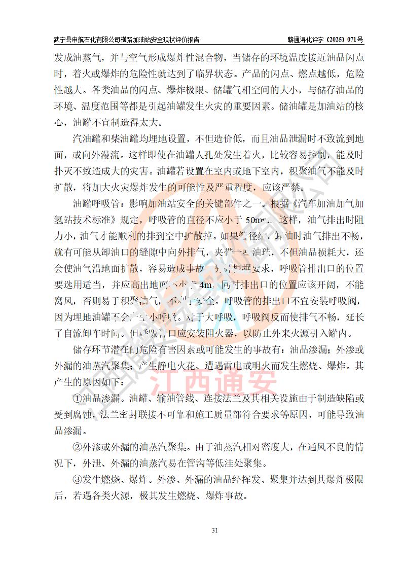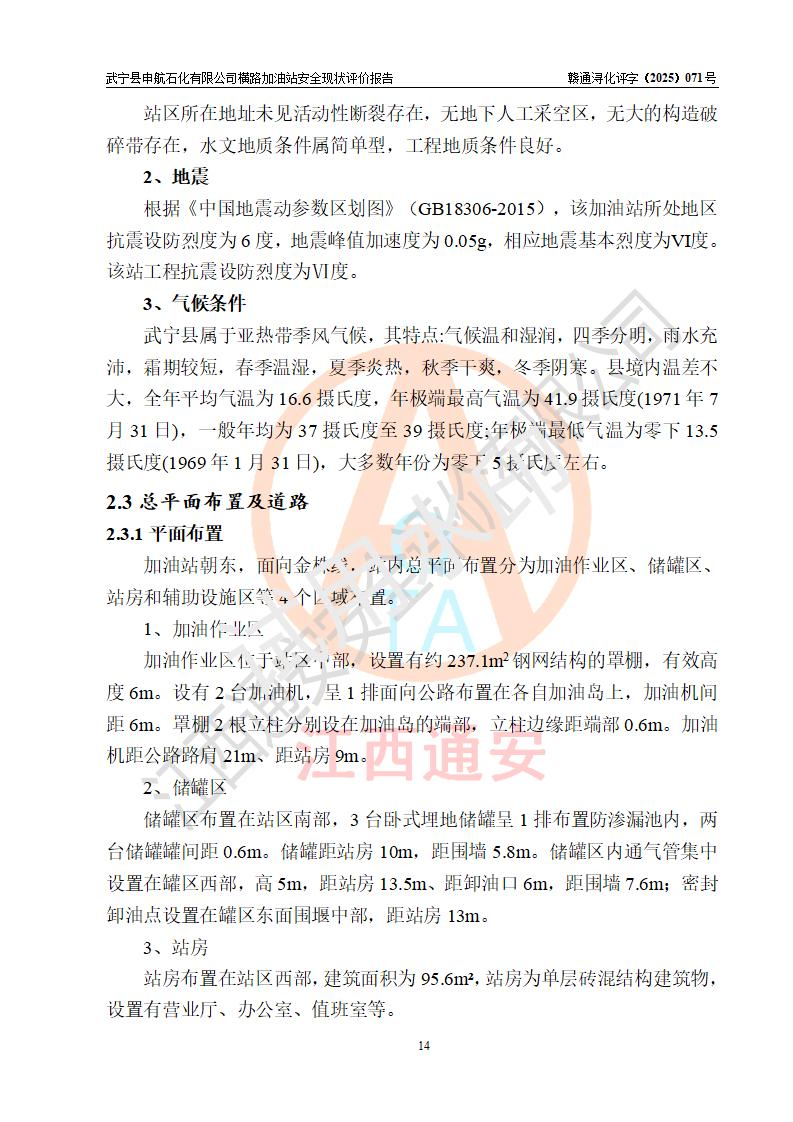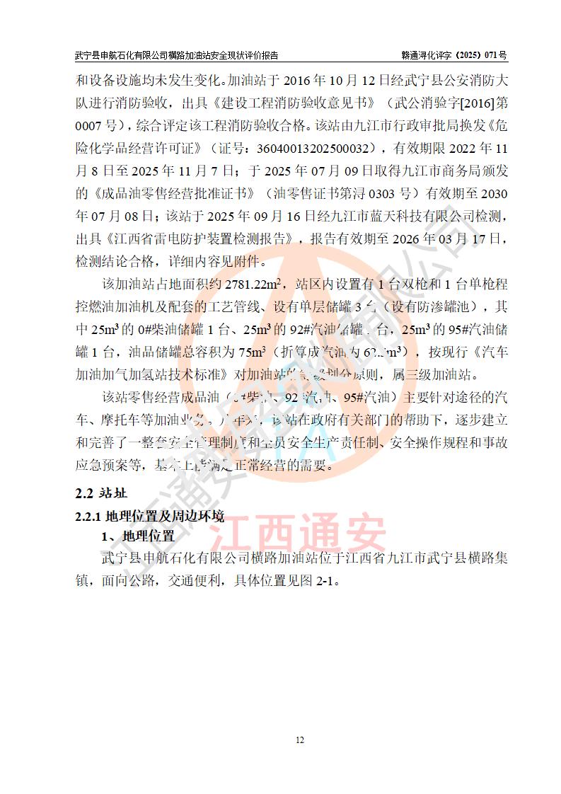 項(xiàng)目簡(jiǎn)介 | 武寧縣申航石化有限公司橫路加油站是一家專(zhuān)門(mén)從事成品油零售經(jīng)營(yíng)的有限責(zé)任公司分公司,經(jīng)營(yíng)場(chǎng)所位于江西省九江市武寧縣橫路集鎮(zhèn)?,F(xiàn)有從業(yè)人員4名,其中安全管理人員1人,加油站負(fù)責(zé)人黎暉。 該加油站占地面積約2781.22m2,站區(qū)內(nèi)設(shè)置有1臺(tái)雙槍和1臺(tái)單槍程控燃油加油機(jī)及配套的工藝管線(xiàn)、設(shè)有單層儲(chǔ)罐3臺(tái)(設(shè)有防滲罐池),其中25m3的0#柴油儲(chǔ)罐1臺(tái)、25m3的92#汽油儲(chǔ)罐1臺(tái),25m3的95#汽油儲(chǔ)罐1臺(tái),油品儲(chǔ)罐總?cè)莘e為75m3(折算成汽油為62.5m3),按現(xiàn)行《汽車(chē)加油加氣加氫站技術(shù)標(biāo)準(zhǔn)》對(duì)加油站的等級(jí)劃分原則,屬三級(jí)加油站。 該站由九江市行政審批局換發(fā)《危險(xiǎn)化學(xué)品經(jīng)營(yíng)許可證》(證號(hào):36040013202500032),**期限2022年11月8日至2025年11月7日。 | |||