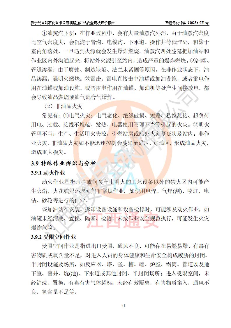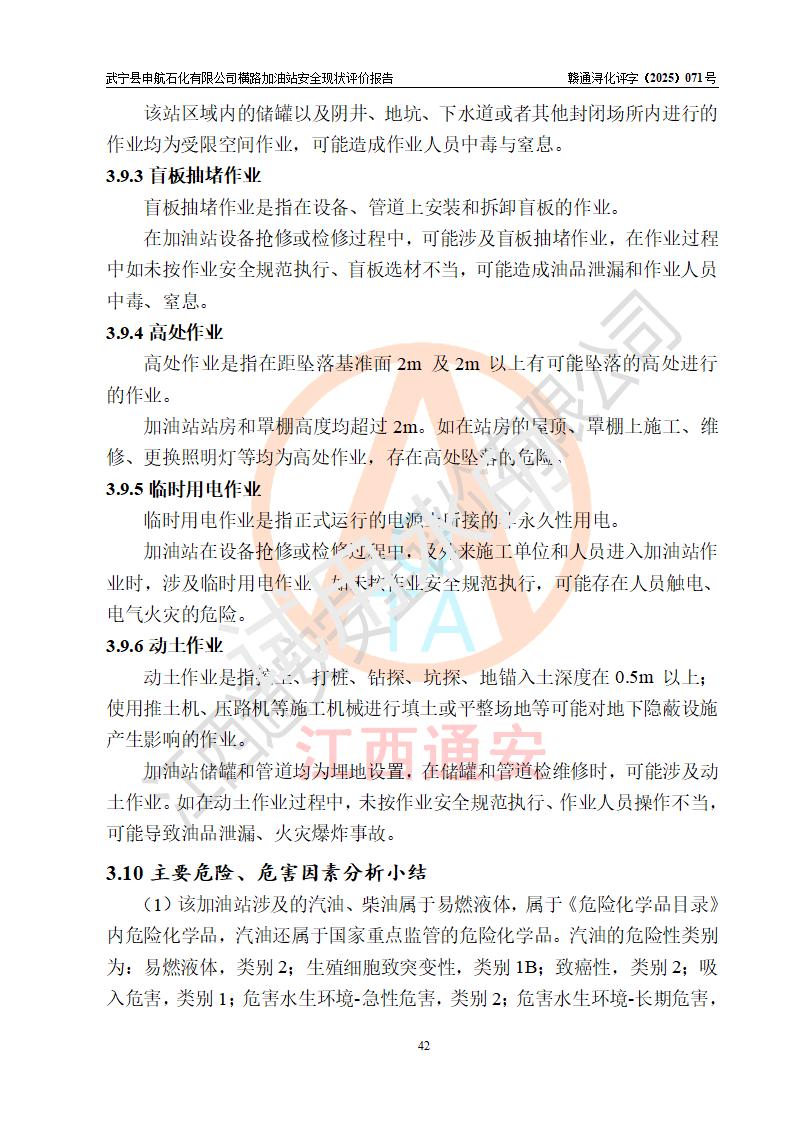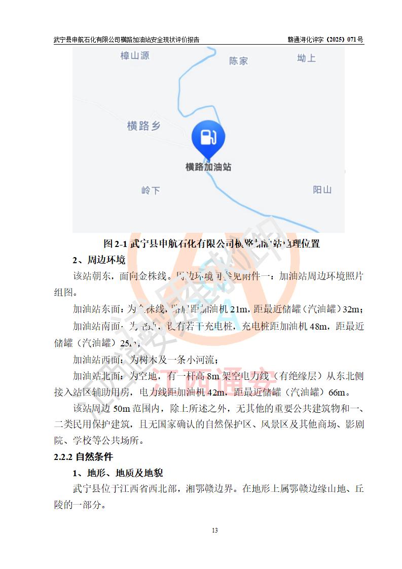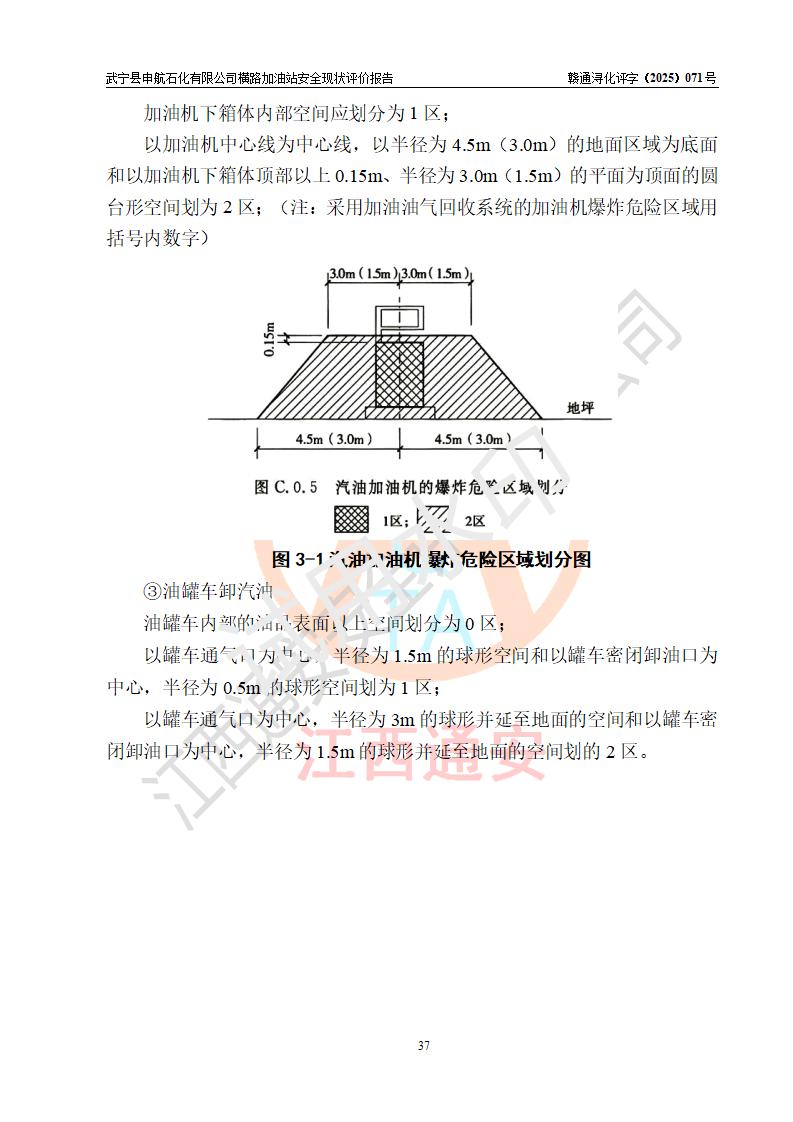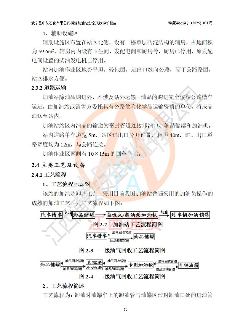 項(xiàng)目簡(jiǎn)介 | 武寧縣申航石化有限公司橫路加油站是一家專(zhuān)門(mén)從事成品油零售經(jīng)營(yíng)的有限責(zé)任公司分公司,經(jīng)營(yíng)場(chǎng)所位于江西省九江市武寧縣橫路集鎮(zhèn)?,F(xiàn)有從業(yè)人員4名,其中安全管理人員1人,加油站負(fù)責(zé)人黎暉。 該加油站占地面積約2781.22m2,站區(qū)內(nèi)設(shè)置有1臺(tái)雙槍和1臺(tái)單槍程控燃油加油機(jī)及配套的工藝管線(xiàn)、設(shè)有單層儲(chǔ)罐3臺(tái)(設(shè)有防滲罐池),其中25m3的0#柴油儲(chǔ)罐1臺(tái)、25m3的92#汽油儲(chǔ)罐1臺(tái),25m3的95#汽油儲(chǔ)罐1臺(tái),油品儲(chǔ)罐總?cè)莘e為75m3(折算成汽油為62.5m3),按現(xiàn)行《汽車(chē)加油加氣加氫站技術(shù)標(biāo)準(zhǔn)》對(duì)加油站的等級(jí)劃分原則,屬三級(jí)加油站。 該站由九江市行政審批局換發(fā)《危險(xiǎn)化學(xué)品經(jīng)營(yíng)許可證》(證號(hào):36040013202500032),**期限2022年11月8日至2025年11月7日。 | |||