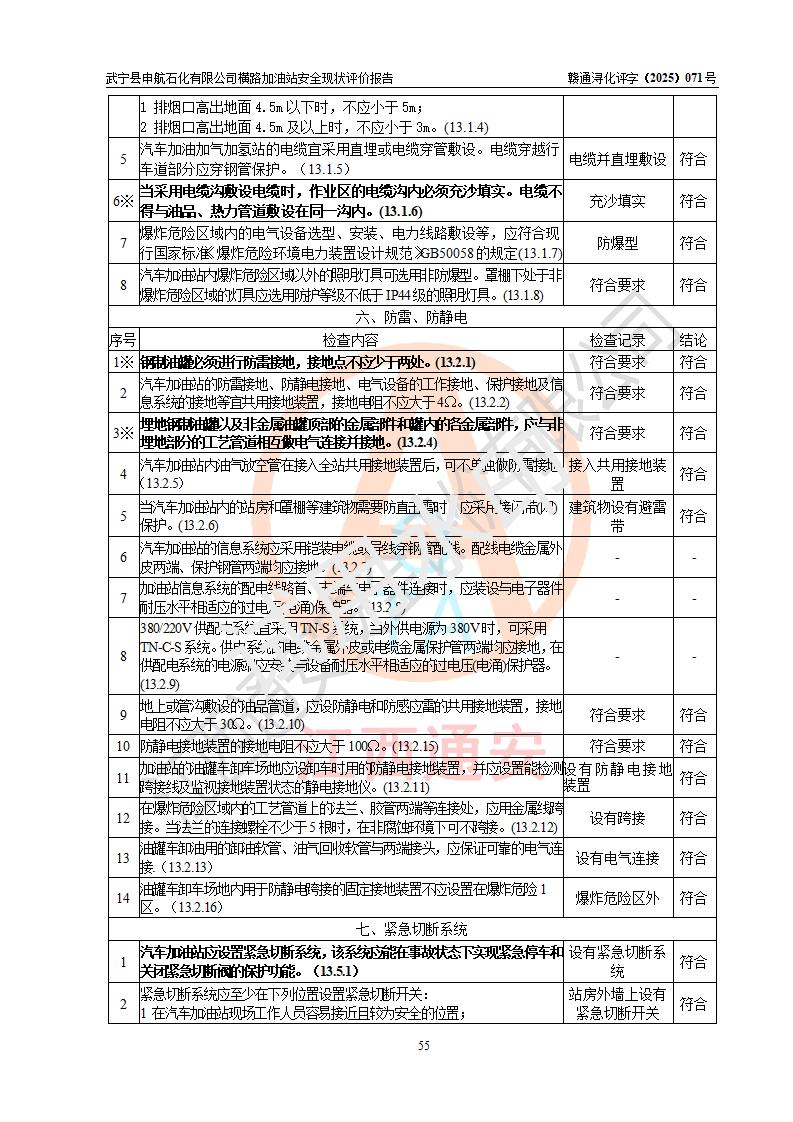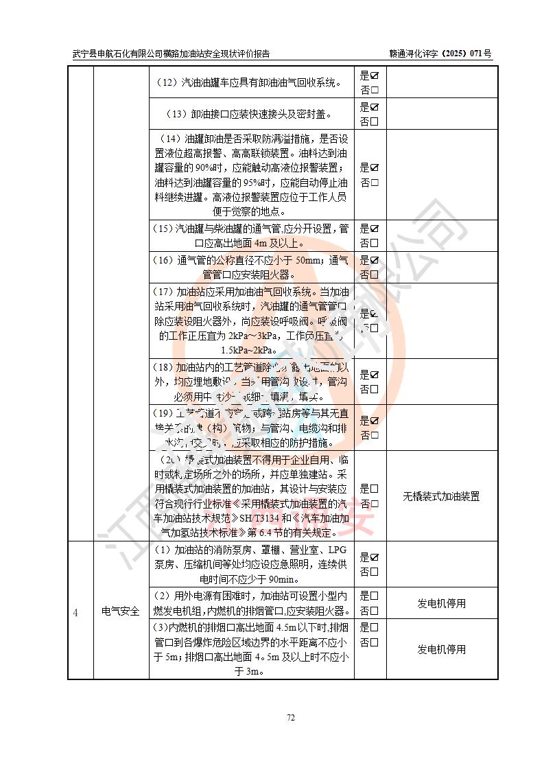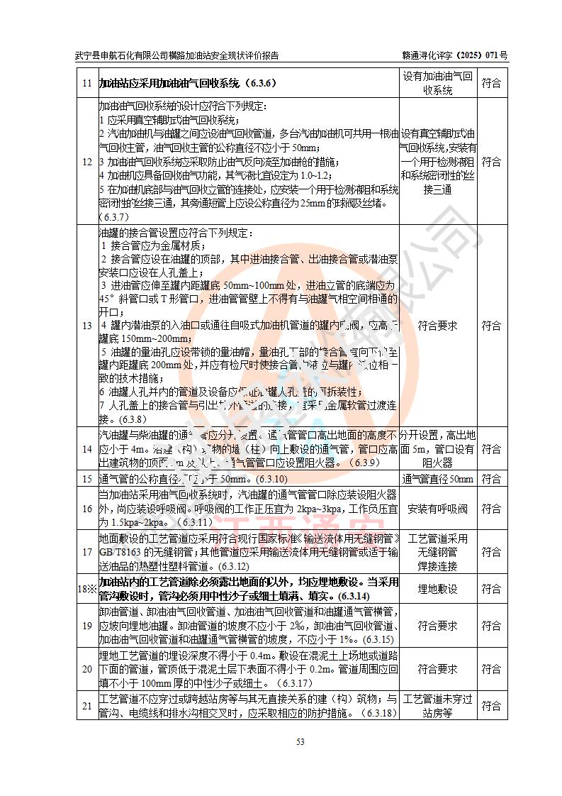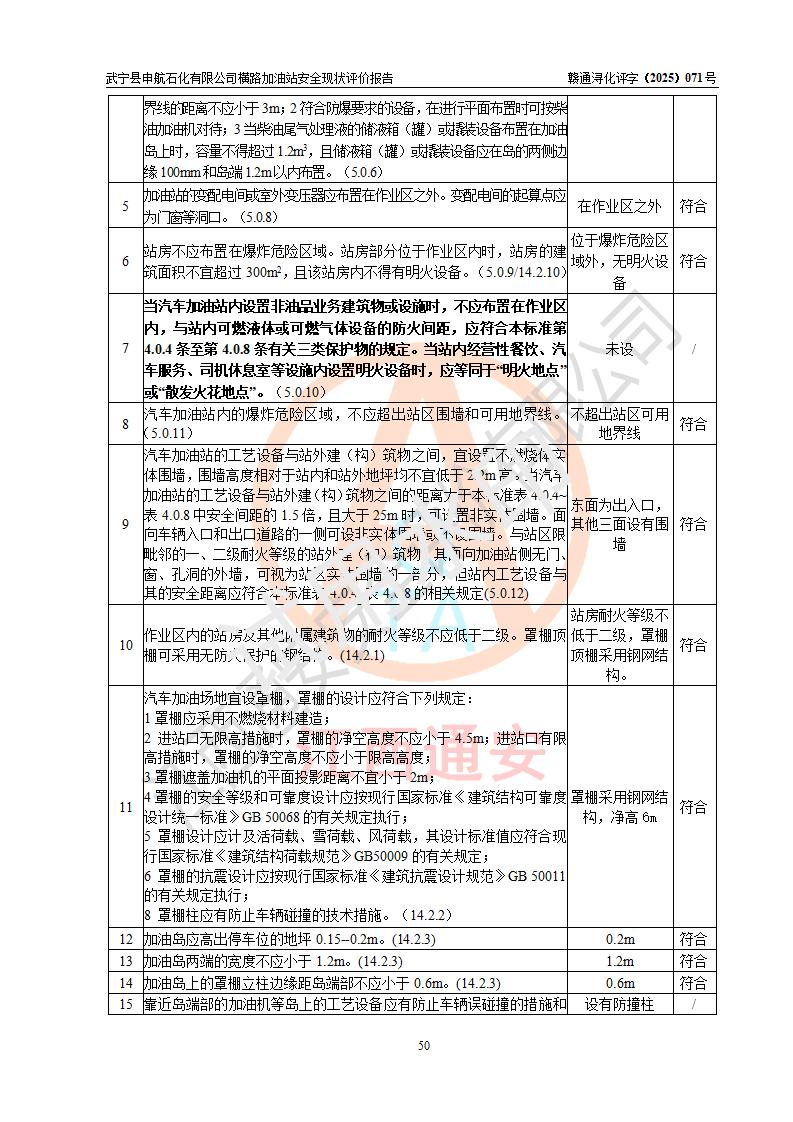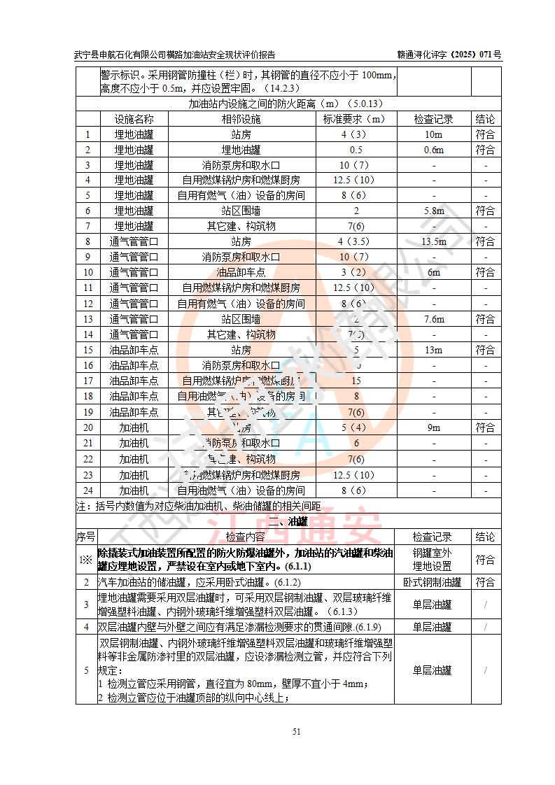 評(píng)價(jià)結(jié)論 | 武寧縣申航石化有限公司橫路加油站涉及的安全條件、安全經(jīng)營(yíng)條件、安全生產(chǎn)管理符合《危險(xiǎn)化學(xué)品經(jīng)營(yíng)許可證管理辦法》、《汽車(chē)加油加氣加氫站技術(shù)標(biāo)準(zhǔn)》等**有關(guān)法規(guī)、標(biāo)準(zhǔn)、規(guī)范要求,能滿(mǎn)足危險(xiǎn)化學(xué)品經(jīng)營(yíng)安全條件。 | |||