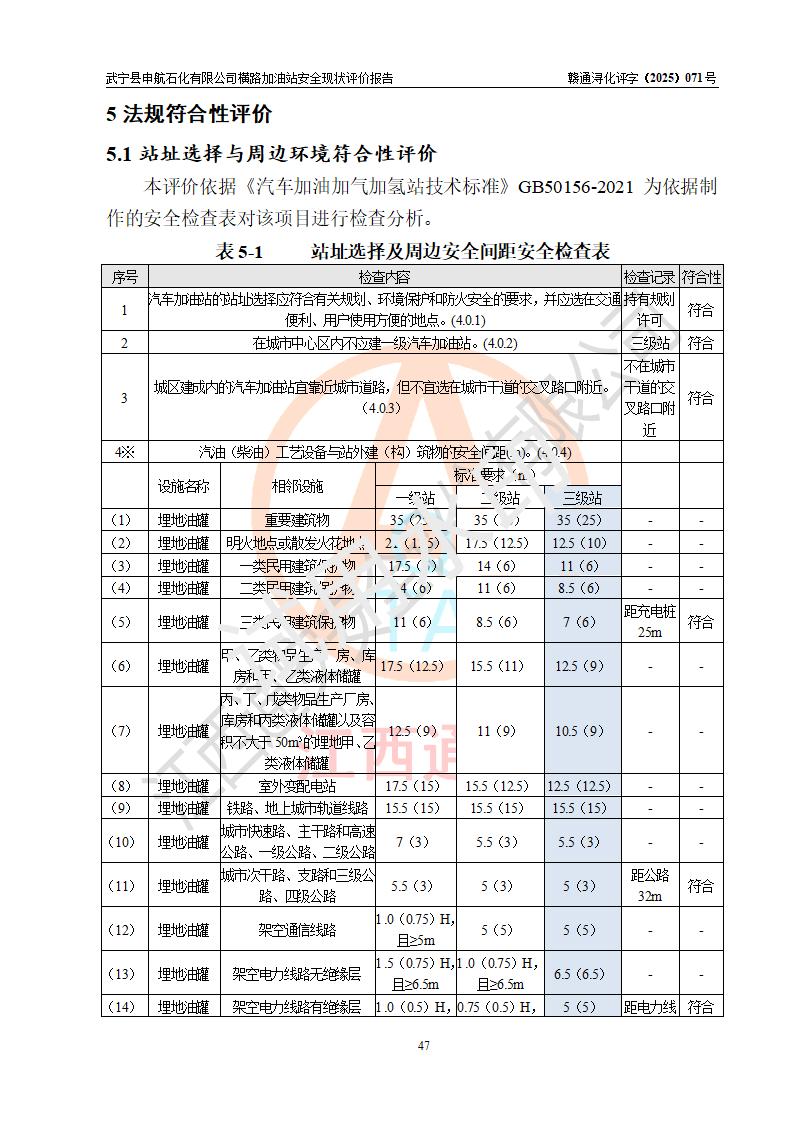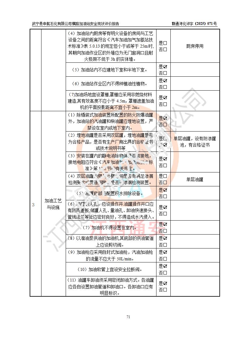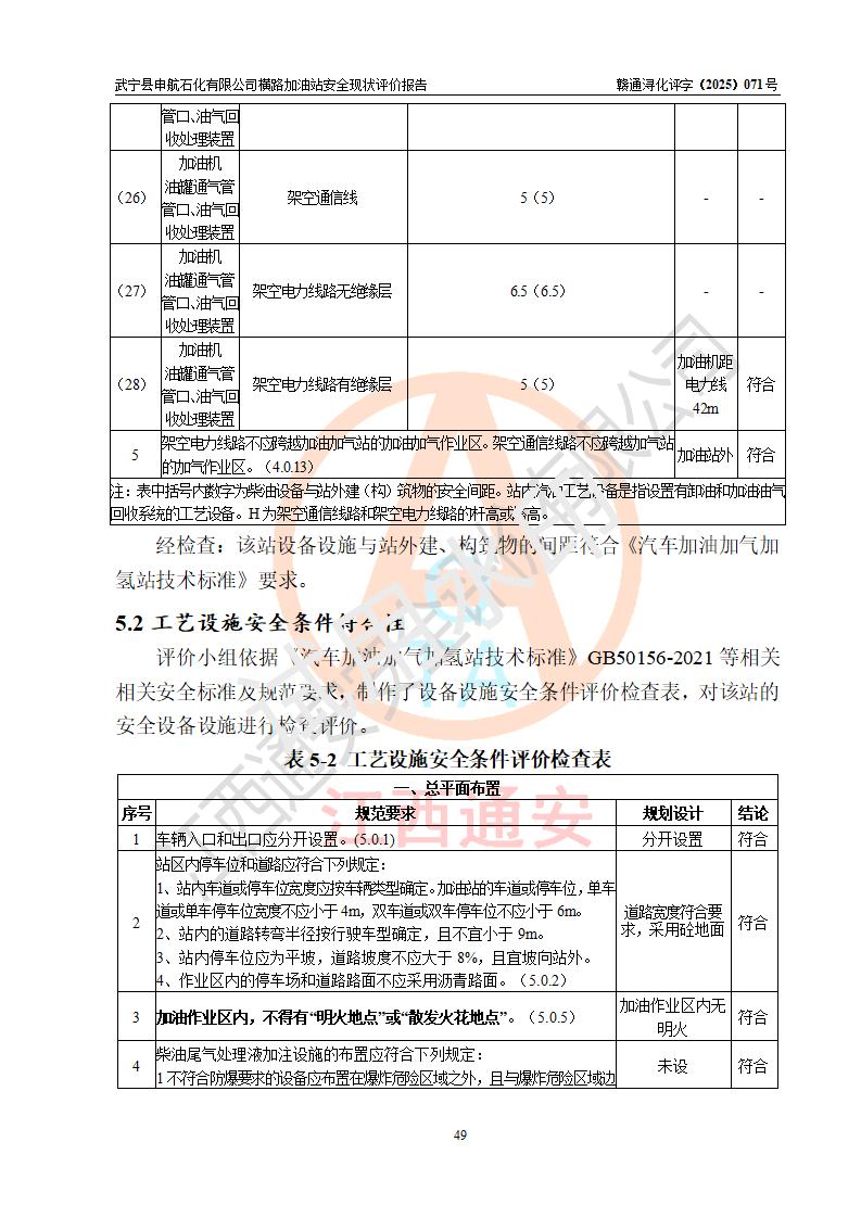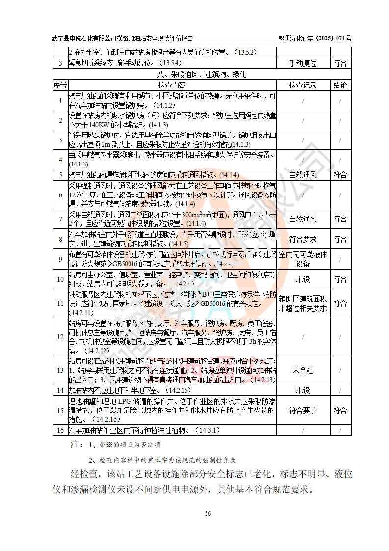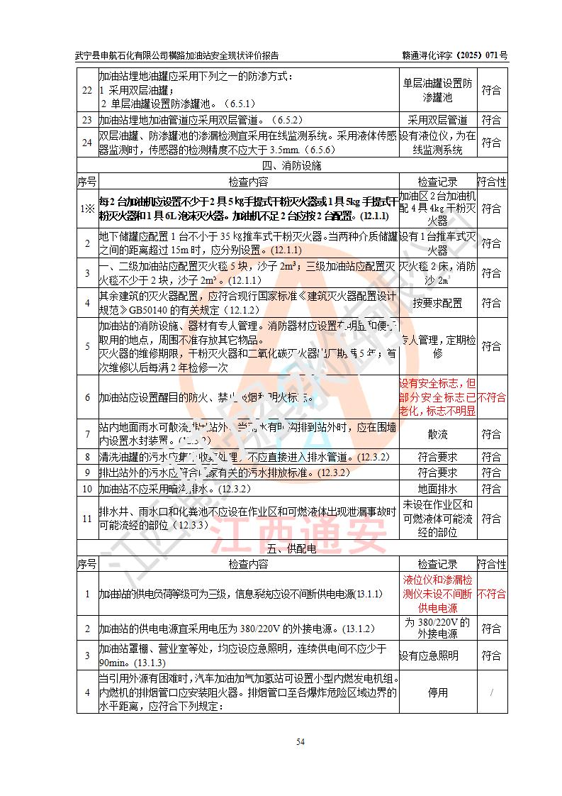評(píng)價(jià)結(jié)論 | 武寧縣申航石化有限公司橫路加油站涉及的安全條件、安全經(jīng)營(yíng)條件、安全生產(chǎn)管理符合《危險(xiǎn)化學(xué)品經(jīng)營(yíng)許可證管理辦法》、《汽車(chē)加油加氣加氫站技術(shù)標(biāo)準(zhǔn)》等**有關(guān)法規(guī)、標(biāo)準(zhǔn)、規(guī)范要求,能滿(mǎn)足危險(xiǎn)化學(xué)品經(jīng)營(yíng)安全條件。 | |||