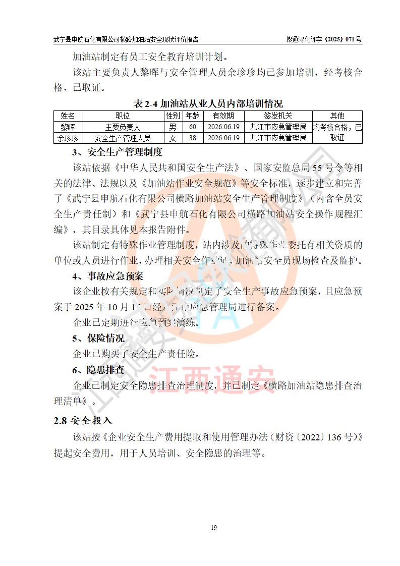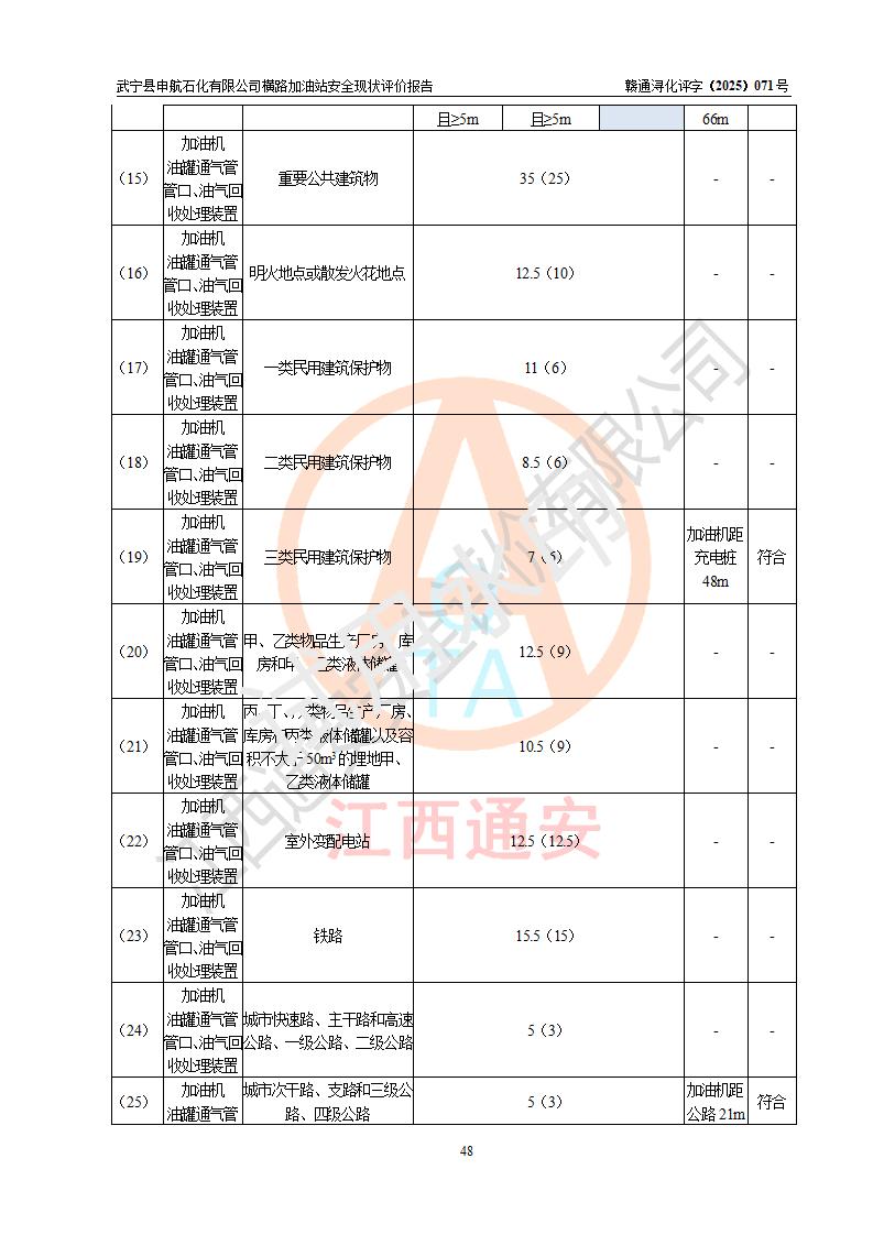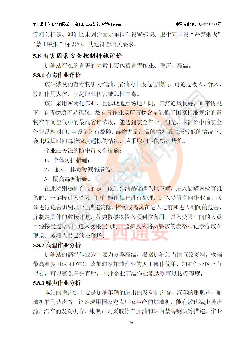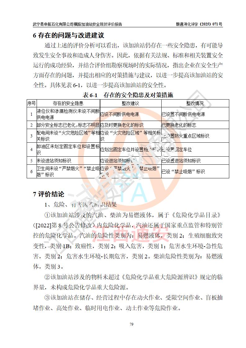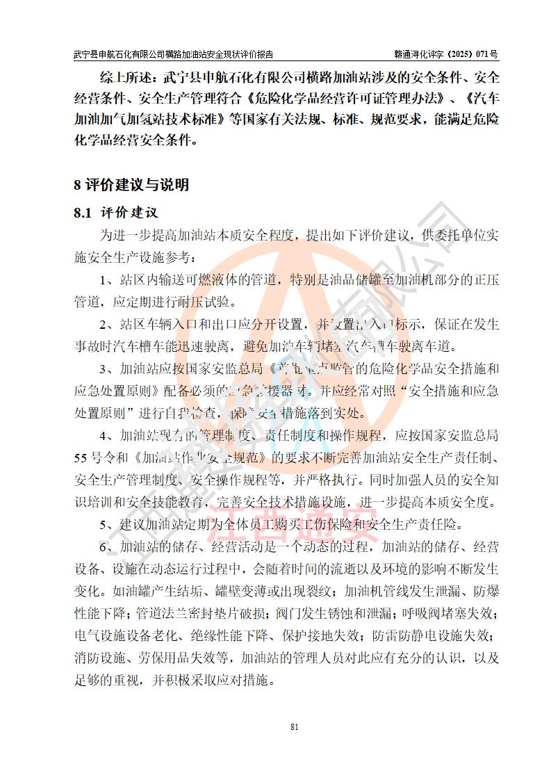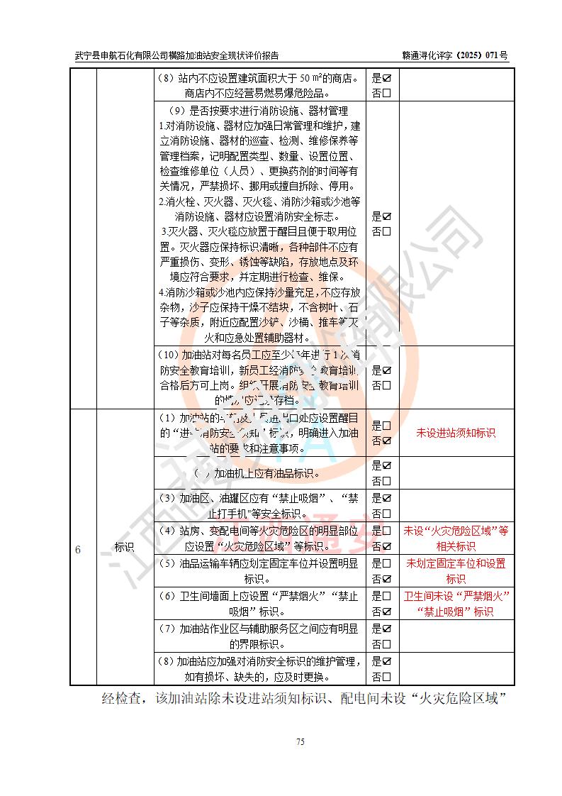 評(píng)價(jià)結(jié)論 | 武寧縣申航石化有限公司橫路加油站涉及的安全條件、安全經(jīng)營(yíng)條件、安全生產(chǎn)管理符合《危險(xiǎn)化學(xué)品經(jīng)營(yíng)許可證管理辦法》、《汽車(chē)加油加氣加氫站技術(shù)標(biāo)準(zhǔn)》等**有關(guān)法規(guī)、標(biāo)準(zhǔn)、規(guī)范要求,能滿(mǎn)足危險(xiǎn)化學(xué)品經(jīng)營(yíng)安全條件。 | |||