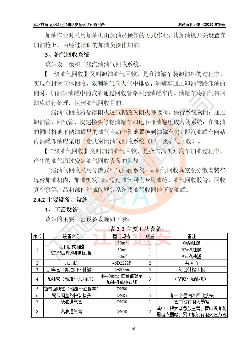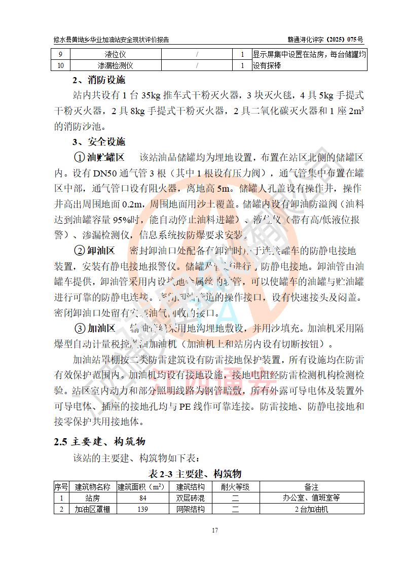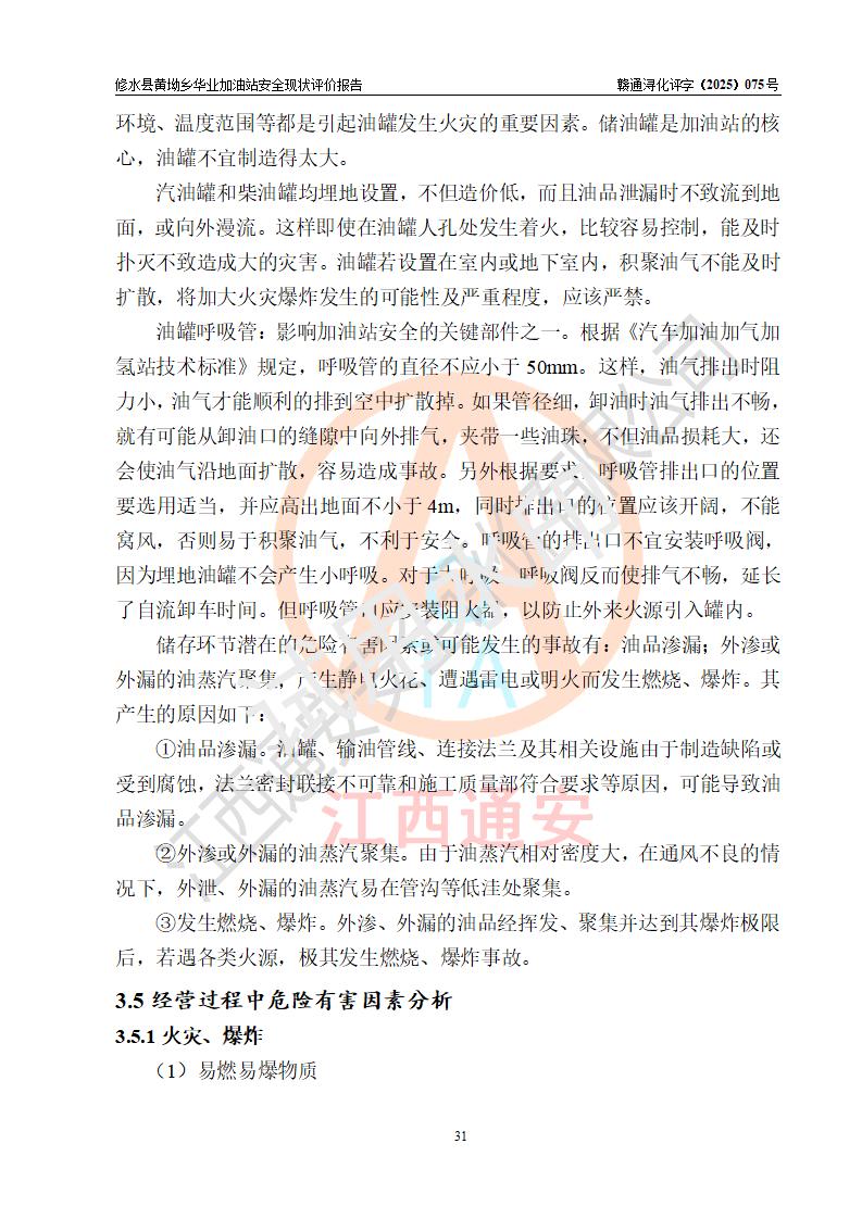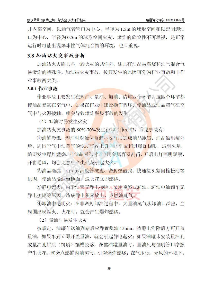項(xiàng)目簡介 | 修水縣黃坳鄉(xiāng)華業(yè)加油站是一家專門從事成品油零售經(jīng)營的個(gè)體工商戶,經(jīng)營場所位于江西省九江市修水縣黃坳鄉(xiāng)塘排鎮(zhèn)?,F(xiàn)有從業(yè)人員4名,其中安全管理人員1人,加油站負(fù)責(zé)人彭峰。 該加油站占地面積約760m2,站區(qū)內(nèi)設(shè)置有2臺雙槍程控燃油加油機(jī)及配套的工藝管線、設(shè)有SF雙層儲罐3臺,其中30m3的0#柴油儲罐1臺、30m3的92#汽油儲罐1臺,30m3的95#汽油儲罐1臺,油品儲罐總?cè)莘e為90m3(折算成汽油為75m3),按現(xiàn)行《汽車加油加氣加氫站技術(shù)標(biāo)準(zhǔn)》對加油站的等級劃分原則,屬三級加油站。 該站由九江市行政審批局換發(fā)《危險(xiǎn)化學(xué)品經(jīng)營許可證》(證號:贛九行審經(jīng)(甲)字[2022]0000182號),**期限2022年12月26日至2025年12月25日。 | |||