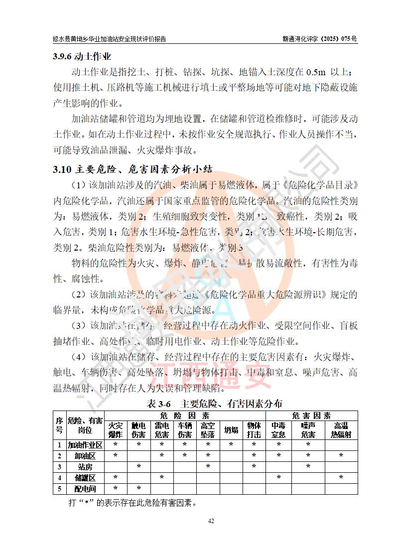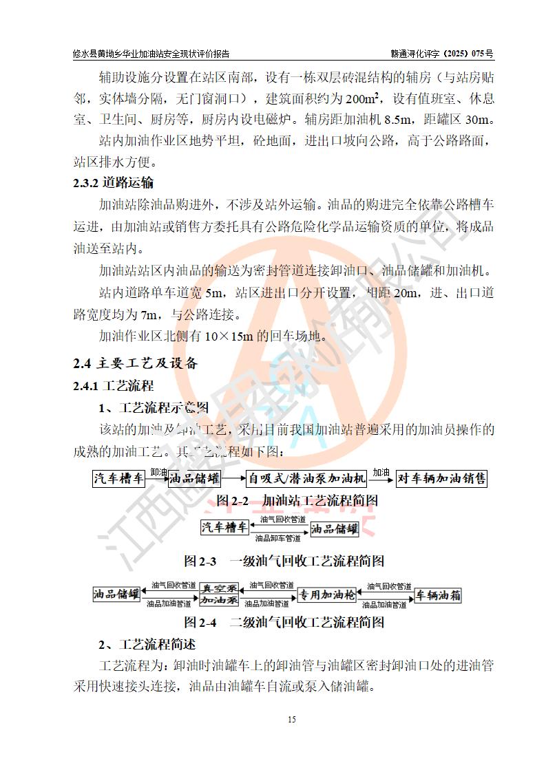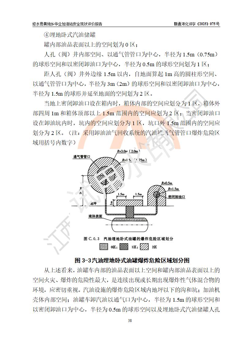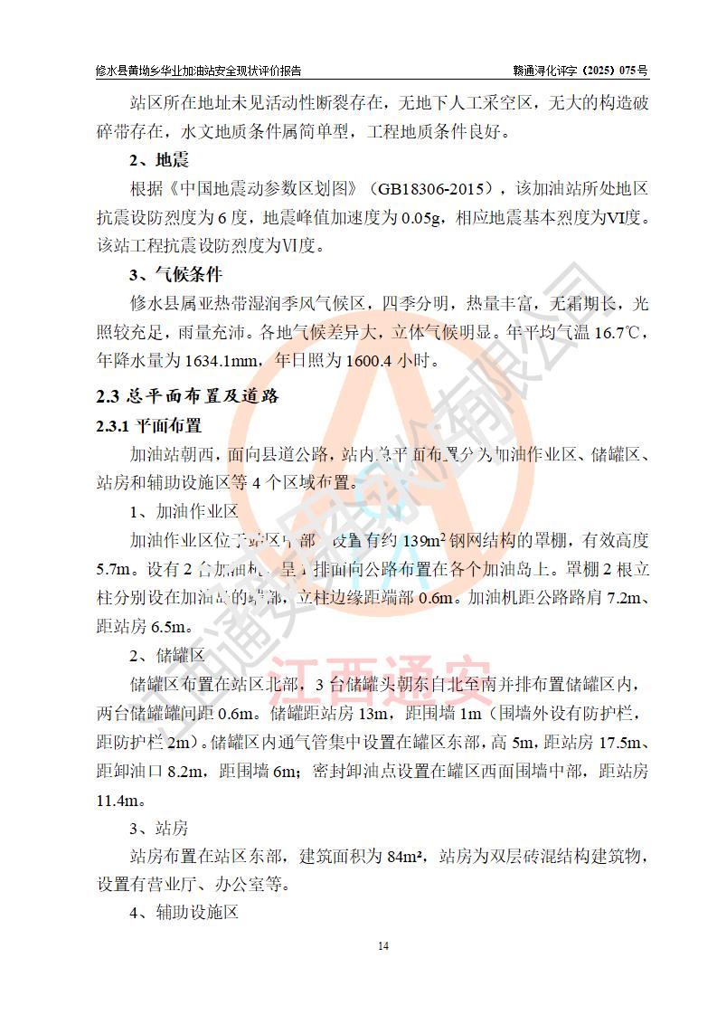 項(xiàng)目簡介 | 修水縣黃坳鄉(xiāng)華業(yè)加油站是一家專門從事成品油零售經(jīng)營的個(gè)體工商戶,經(jīng)營場所位于江西省九江市修水縣黃坳鄉(xiāng)塘排鎮(zhèn)?,F(xiàn)有從業(yè)人員4名,其中安全管理人員1人,加油站負(fù)責(zé)人彭峰。 該加油站占地面積約760m2,站區(qū)內(nèi)設(shè)置有2臺雙槍程控燃油加油機(jī)及配套的工藝管線、設(shè)有SF雙層儲罐3臺,其中30m3的0#柴油儲罐1臺、30m3的92#汽油儲罐1臺,30m3的95#汽油儲罐1臺,油品儲罐總?cè)莘e為90m3(折算成汽油為75m3),按現(xiàn)行《汽車加油加氣加氫站技術(shù)標(biāo)準(zhǔn)》對加油站的等級劃分原則,屬三級加油站。 該站由九江市行政審批局換發(fā)《危險(xiǎn)化學(xué)品經(jīng)營許可證》(證號:贛九行審經(jīng)(甲)字[2022]0000182號),**期限2022年12月26日至2025年12月25日。 | |||