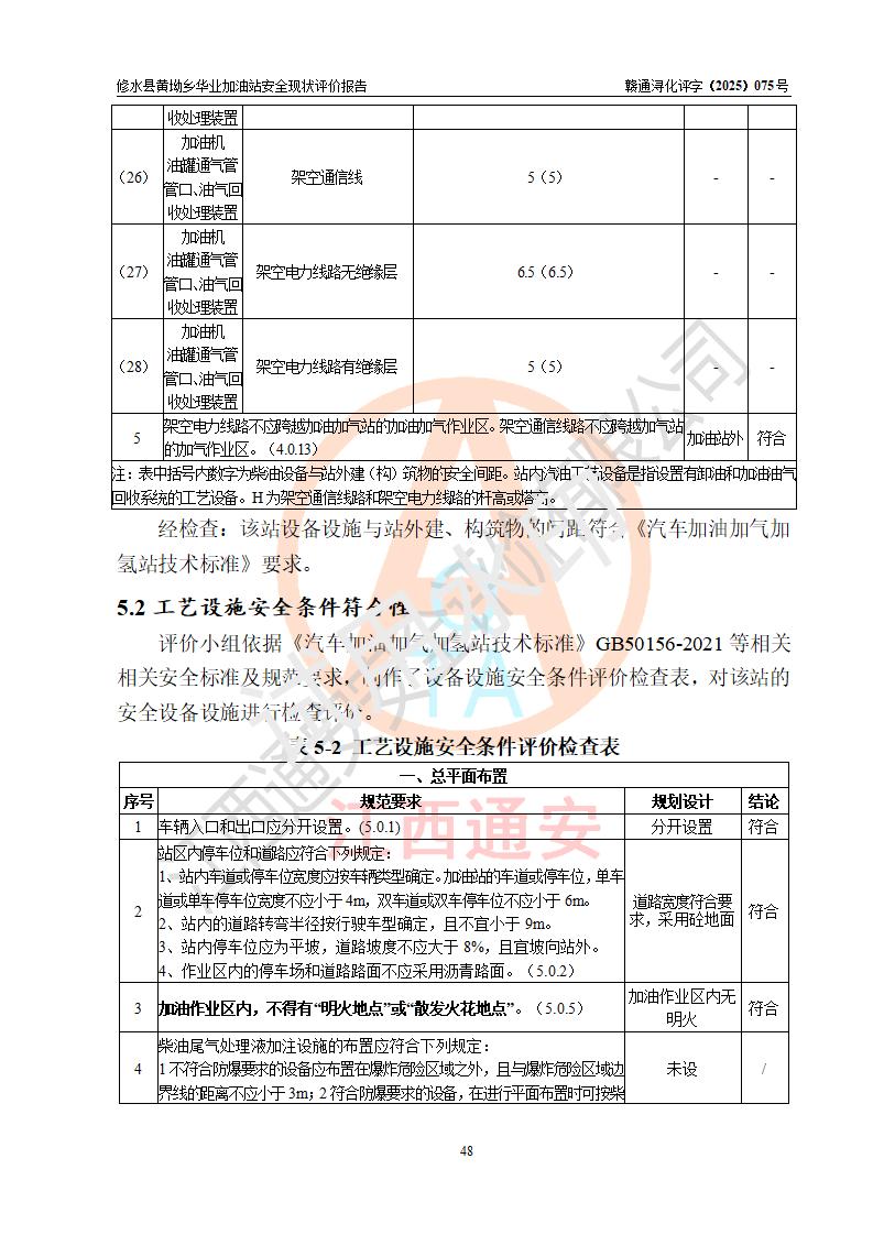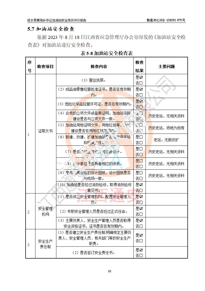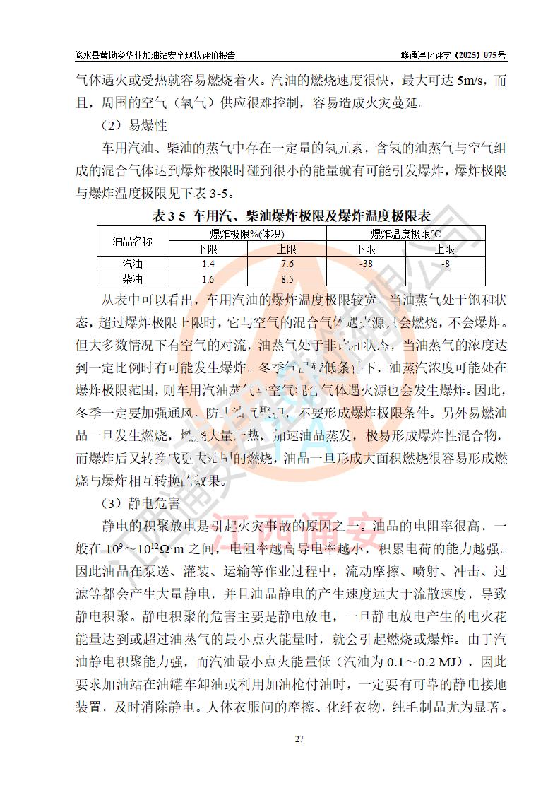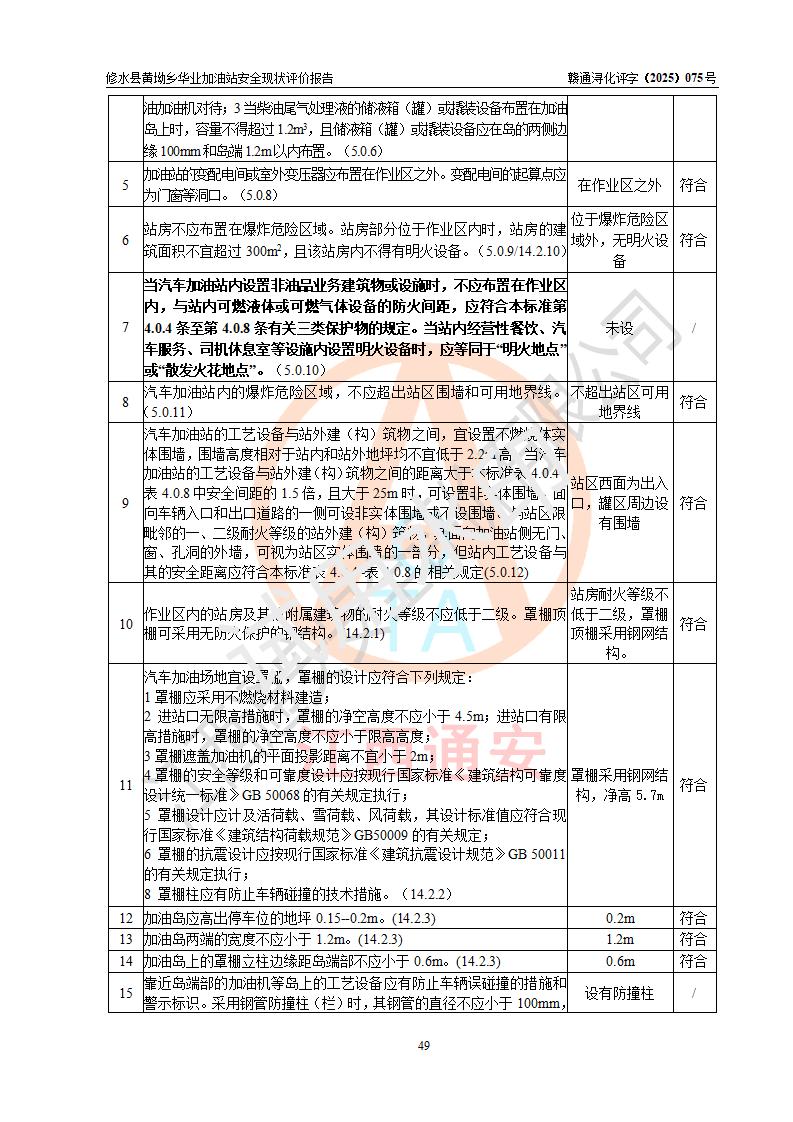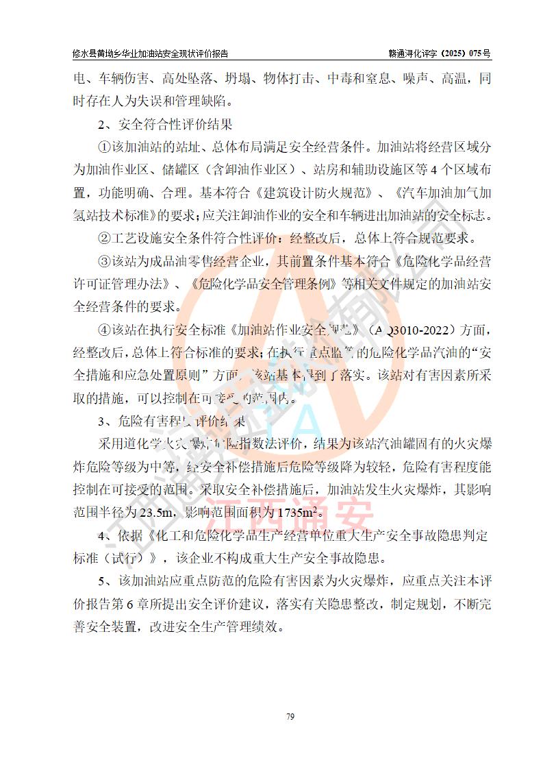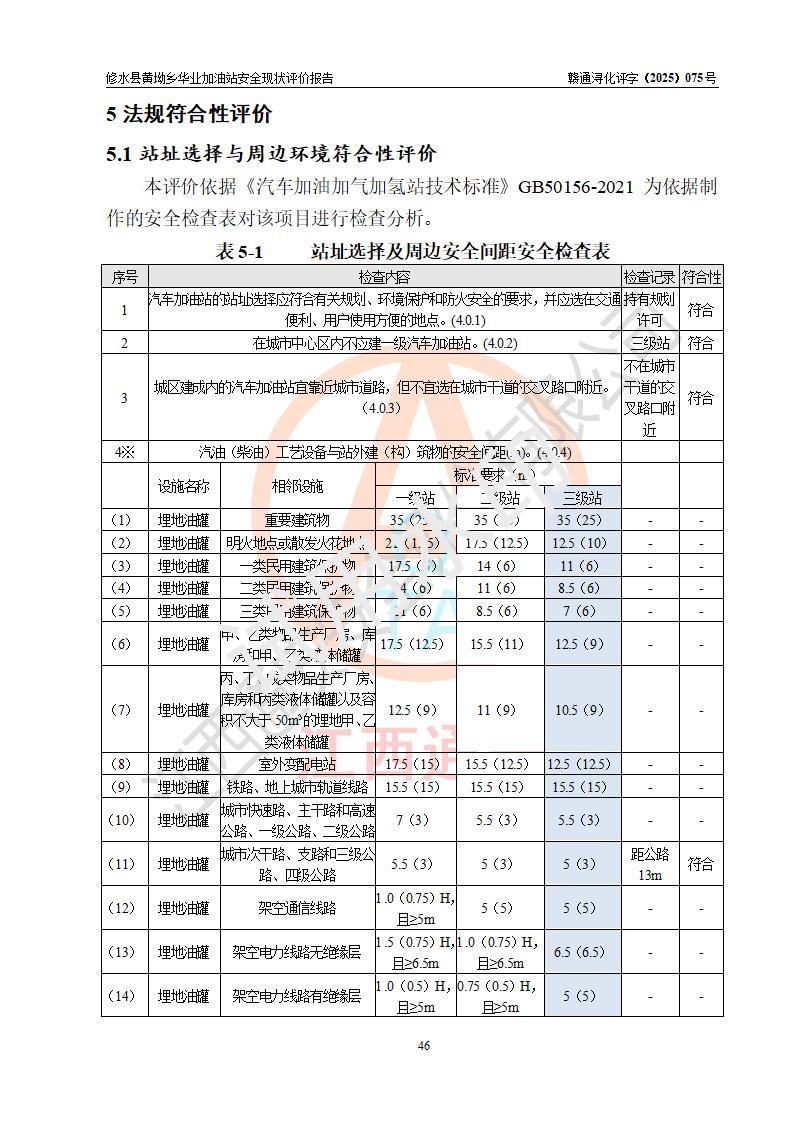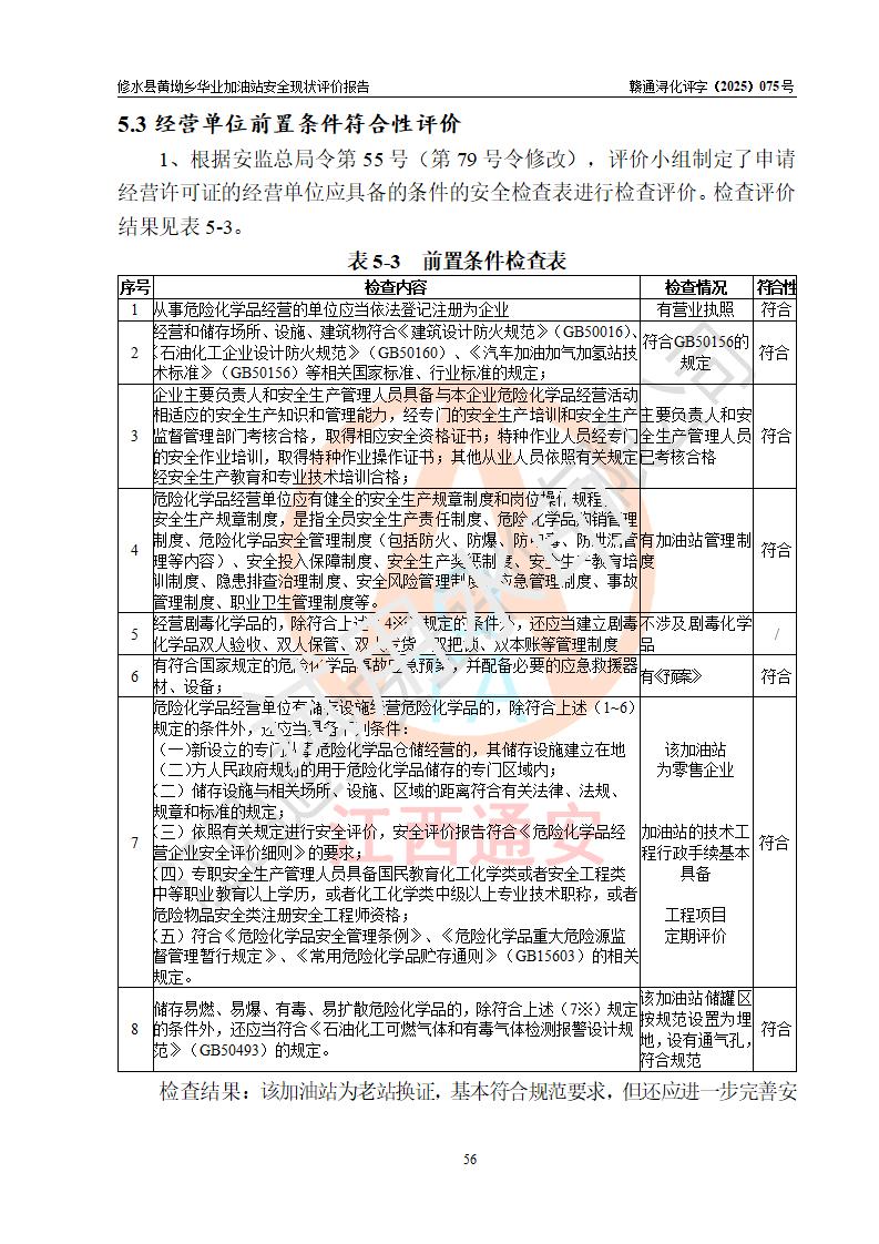 評價(jià)結(jié)論 | 修水縣黃坳鄉(xiāng)華業(yè)加油站涉及的安全條件、安全經(jīng)營條件、安全生產(chǎn)管理符合《危險(xiǎn)化學(xué)品經(jīng)營許可證管理辦法》、《汽車加油加氣加氫站技術(shù)標(biāo)準(zhǔn)》等**有關(guān)法規(guī)、標(biāo)準(zhǔn)、規(guī)范要求,能滿足危險(xiǎn)化學(xué)品經(jīng)營安全條件。 | |||