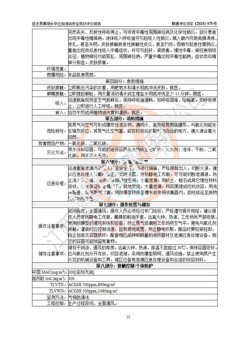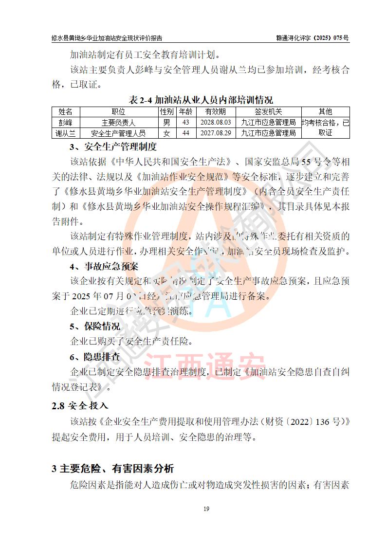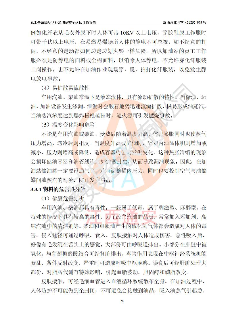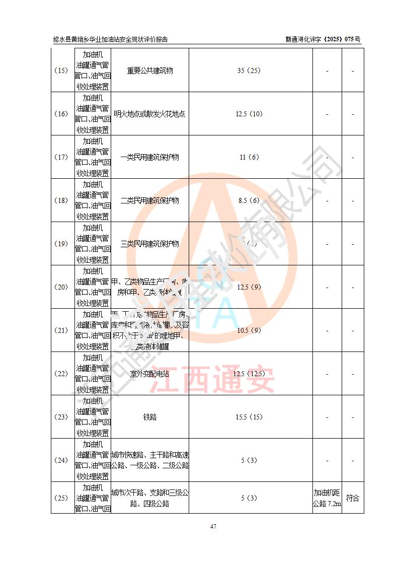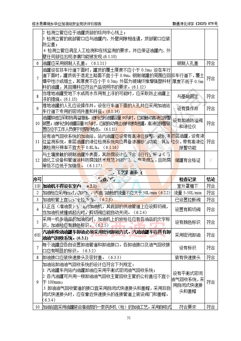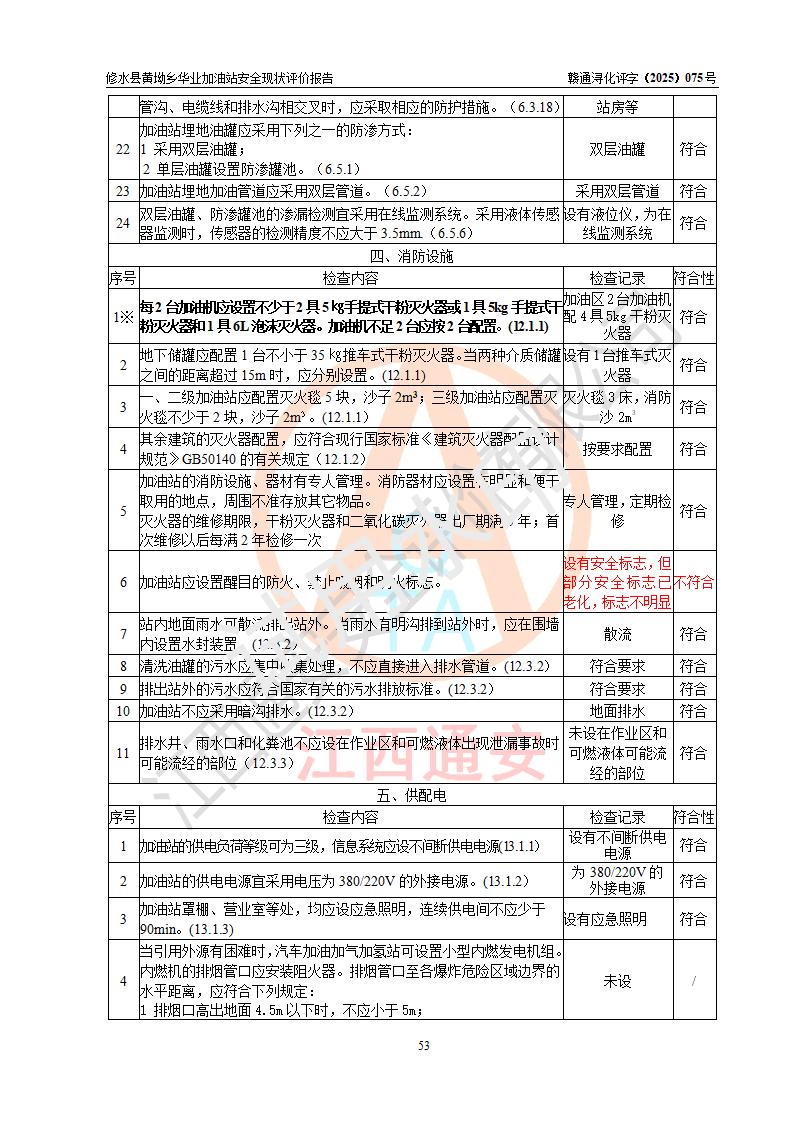 評價(jià)結(jié)論 | 修水縣黃坳鄉(xiāng)華業(yè)加油站涉及的安全條件、安全經(jīng)營條件、安全生產(chǎn)管理符合《危險(xiǎn)化學(xué)品經(jīng)營許可證管理辦法》、《汽車加油加氣加氫站技術(shù)標(biāo)準(zhǔn)》等**有關(guān)法規(guī)、標(biāo)準(zhǔn)、規(guī)范要求,能滿足危險(xiǎn)化學(xué)品經(jīng)營安全條件。 | |||