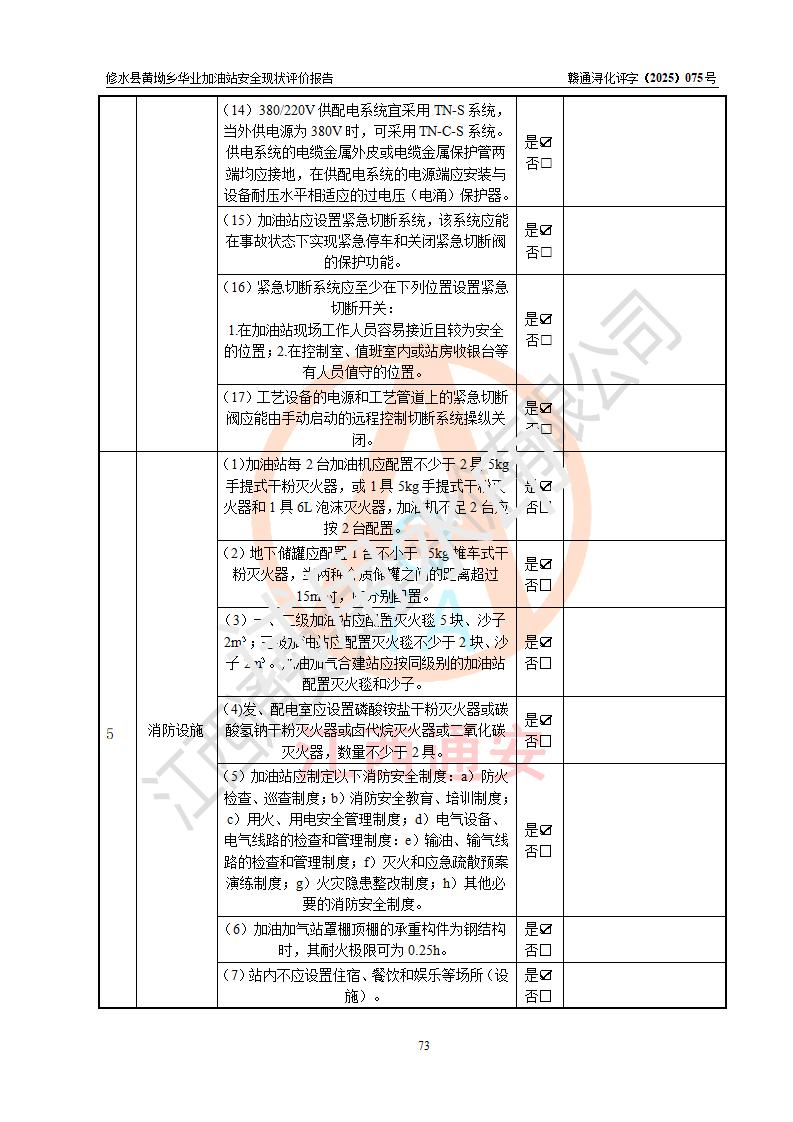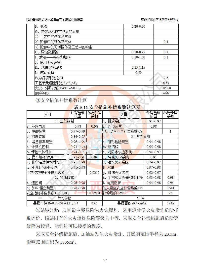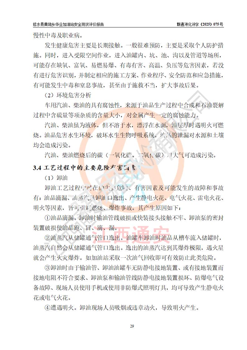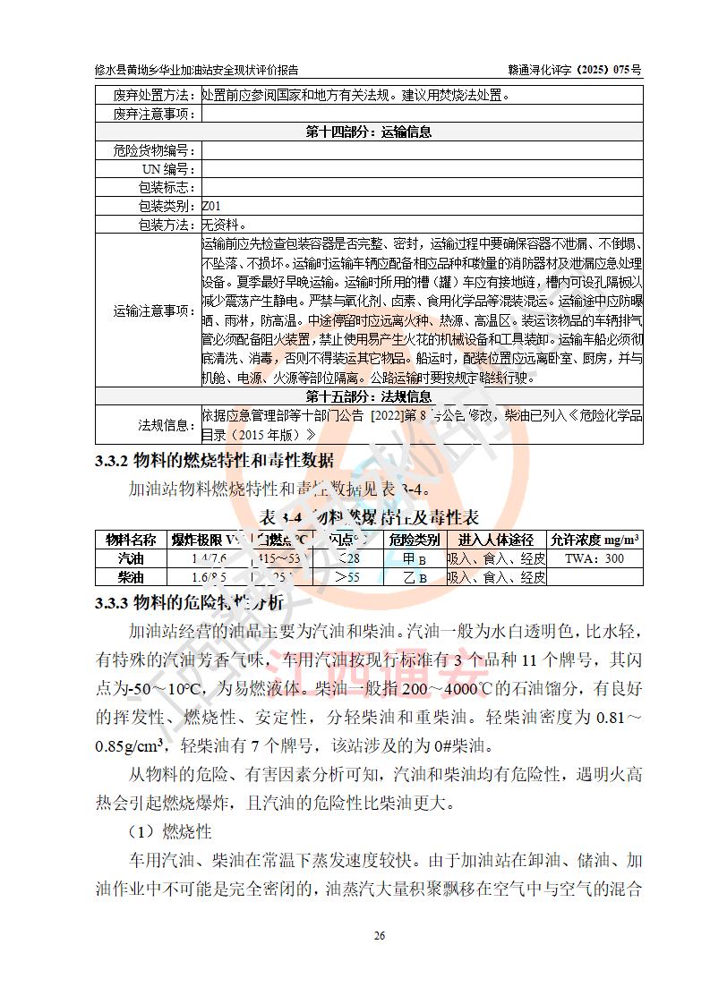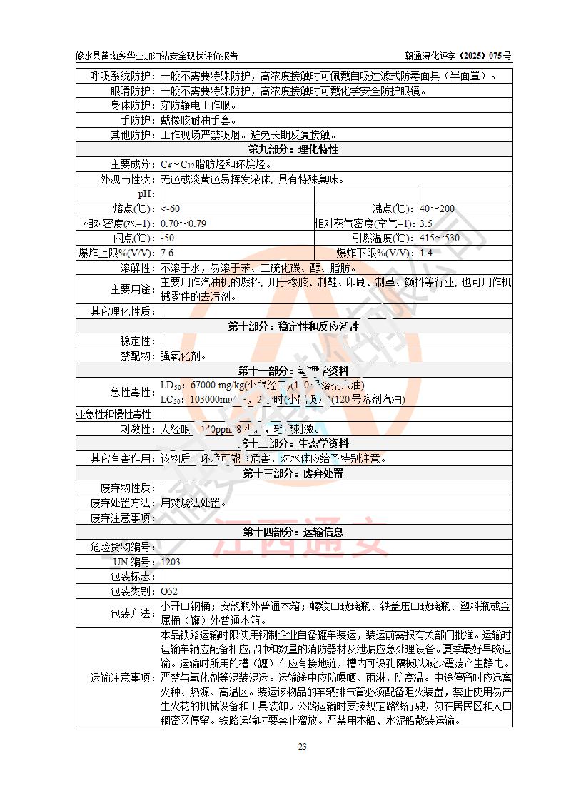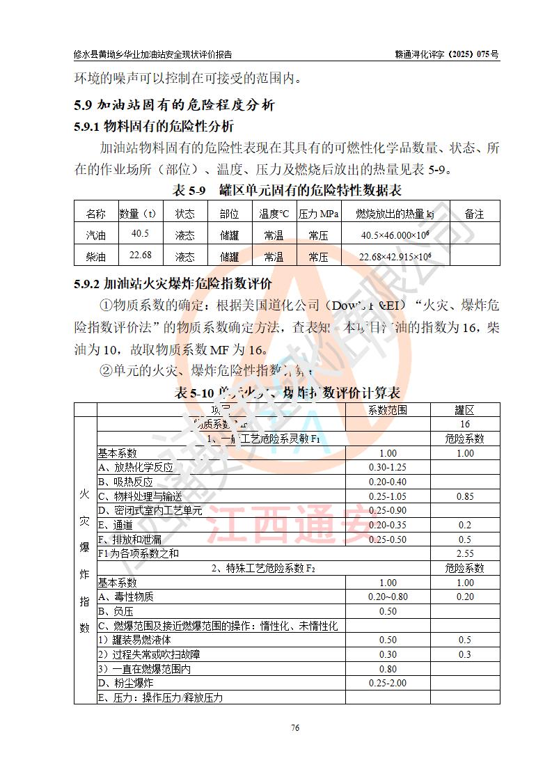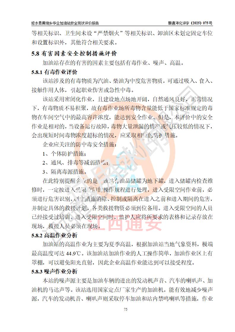 評價(jià)結(jié)論 | 修水縣黃坳鄉(xiāng)華業(yè)加油站涉及的安全條件、安全經(jīng)營條件、安全生產(chǎn)管理符合《危險(xiǎn)化學(xué)品經(jīng)營許可證管理辦法》、《汽車加油加氣加氫站技術(shù)標(biāo)準(zhǔn)》等**有關(guān)法規(guī)、標(biāo)準(zhǔn)、規(guī)范要求,能滿足危險(xiǎn)化學(xué)品經(jīng)營安全條件。 | |||