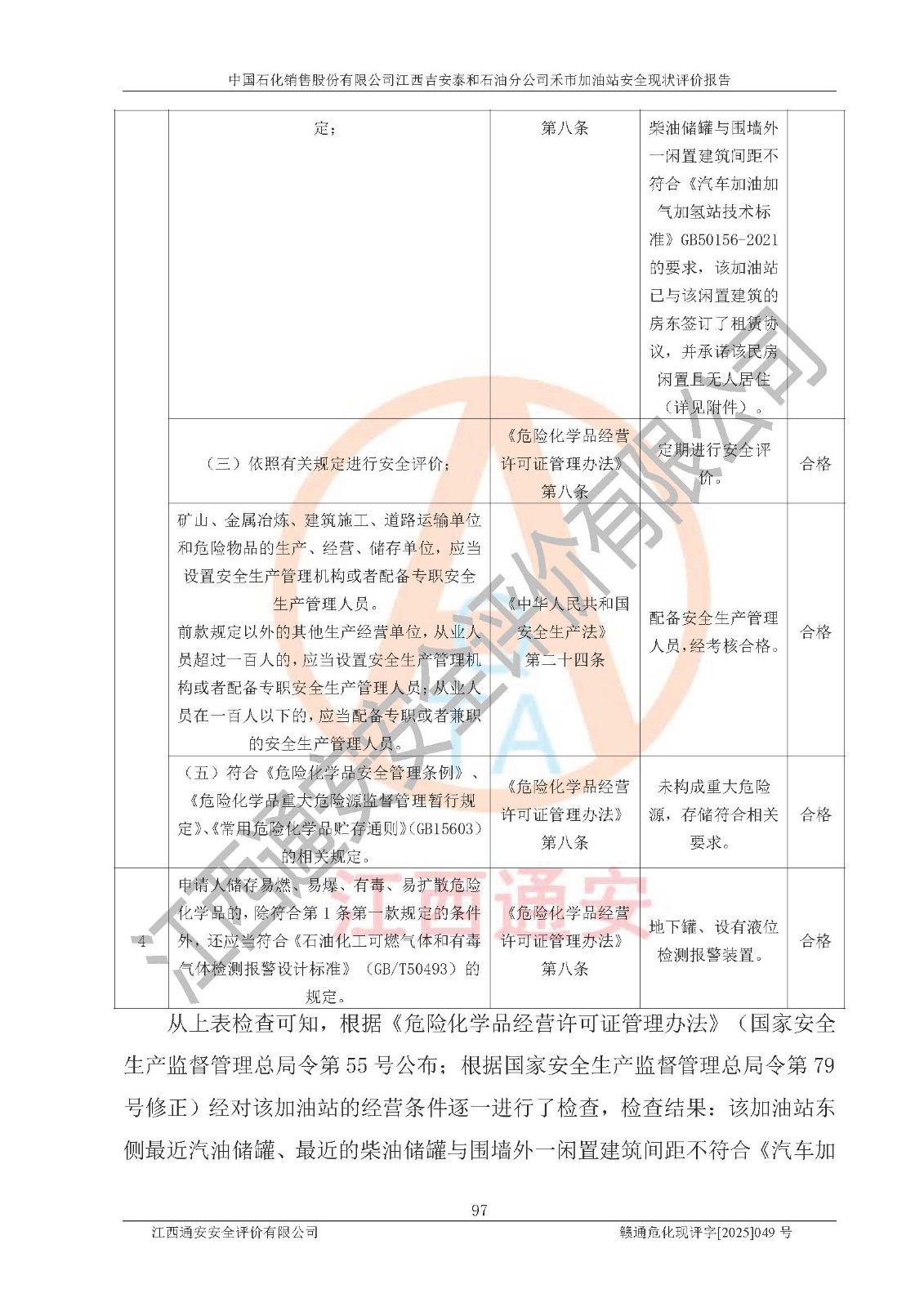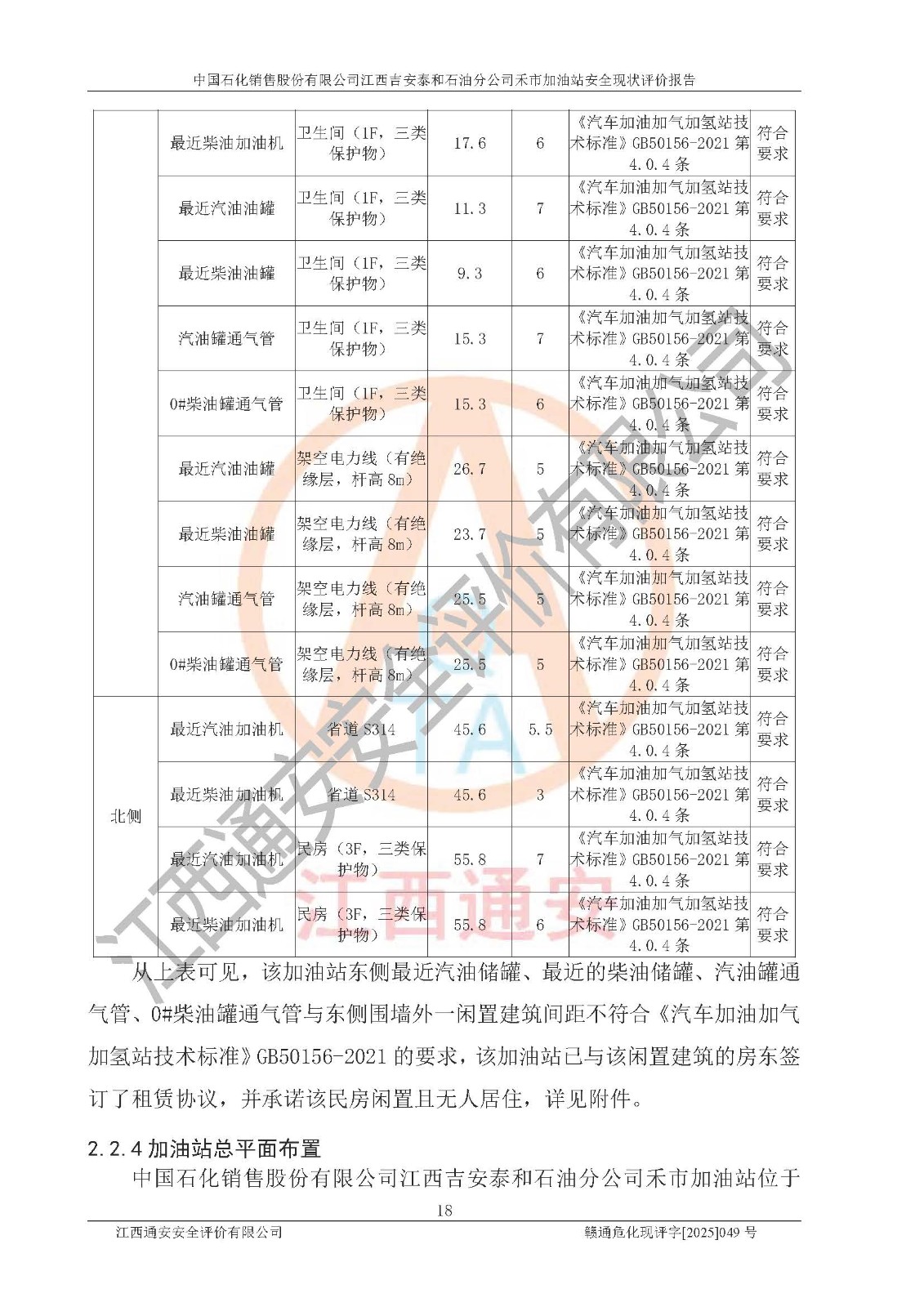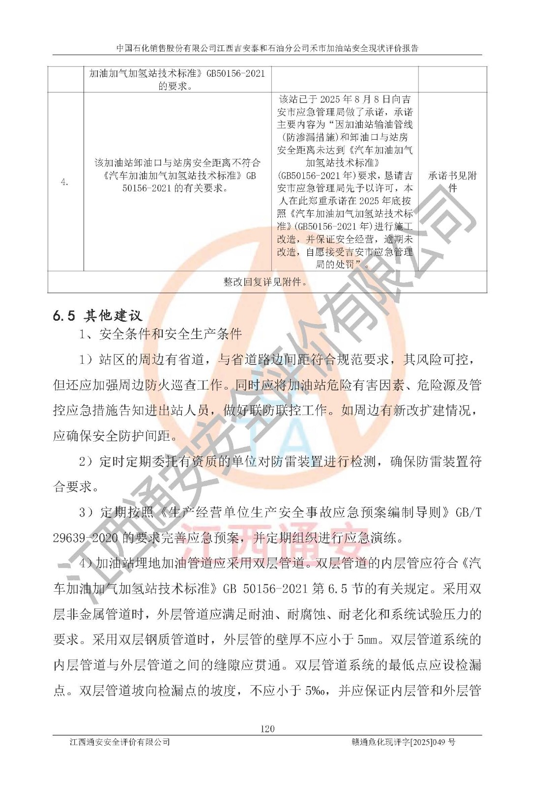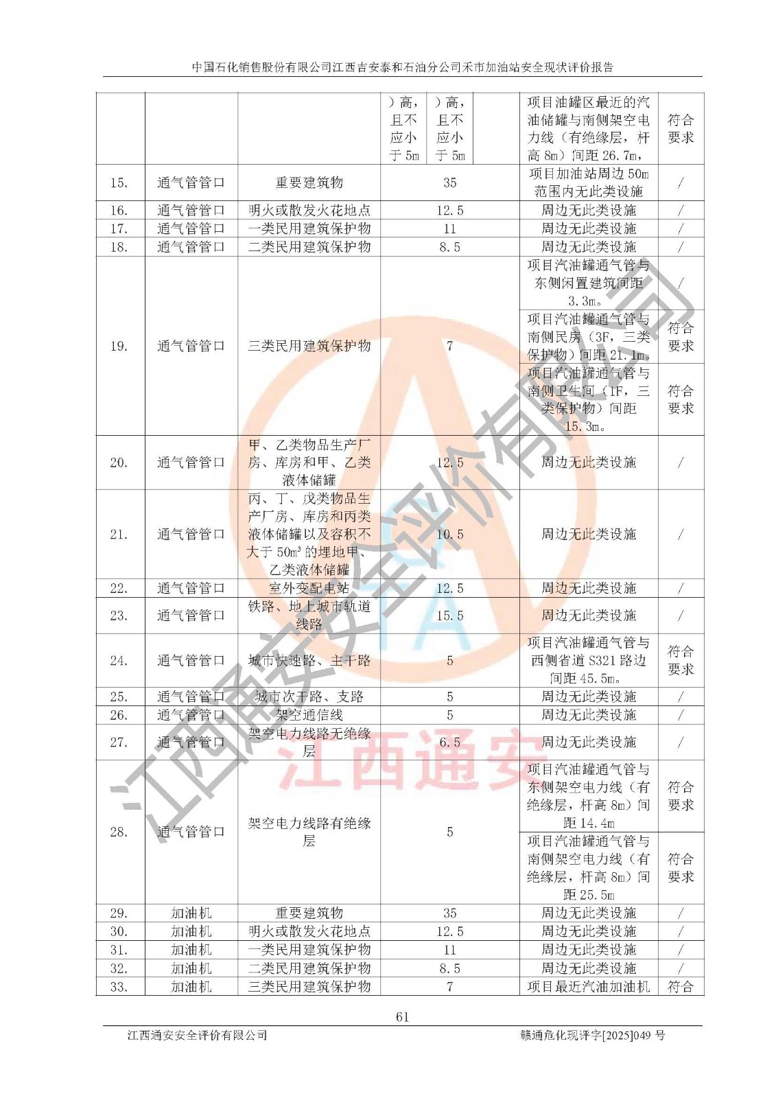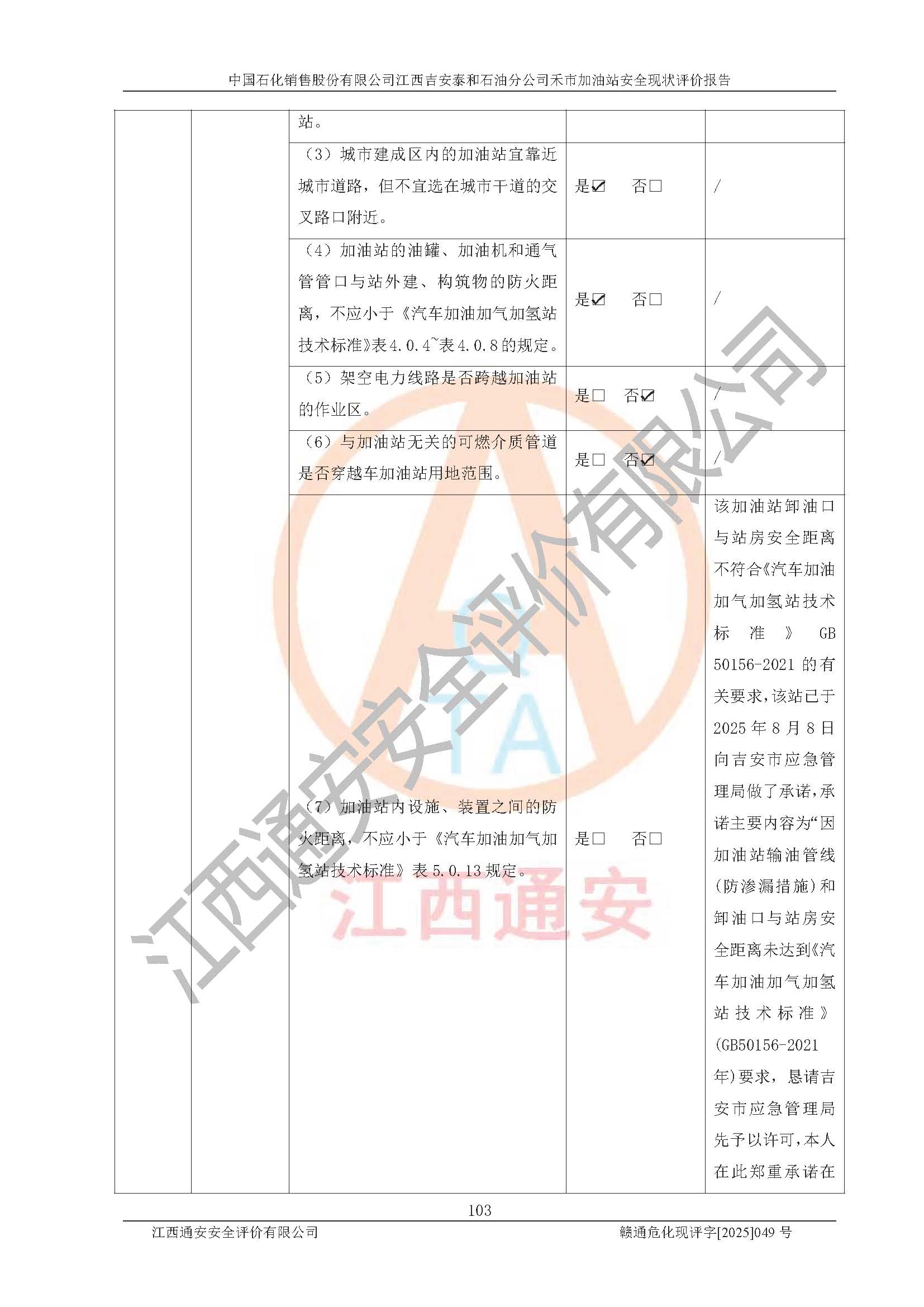 評(píng)價(jià)結(jié)論 | 中國(guó)石化銷售股份有限公司江西吉安泰和石油分公司禾市加油站該加油站卸油口與站房安全距離不符合《汽車加油加氣加氫站技術(shù)標(biāo)準(zhǔn)》GB 50156-2021 的有關(guān)要求,該站**在 2025年底進(jìn)行施工改造時(shí)一并整改到位,該站對(duì)存在的不符合項(xiàng)整改到位后滿足危險(xiǎn)化學(xué)品經(jīng)營(yíng)條件。 | |||