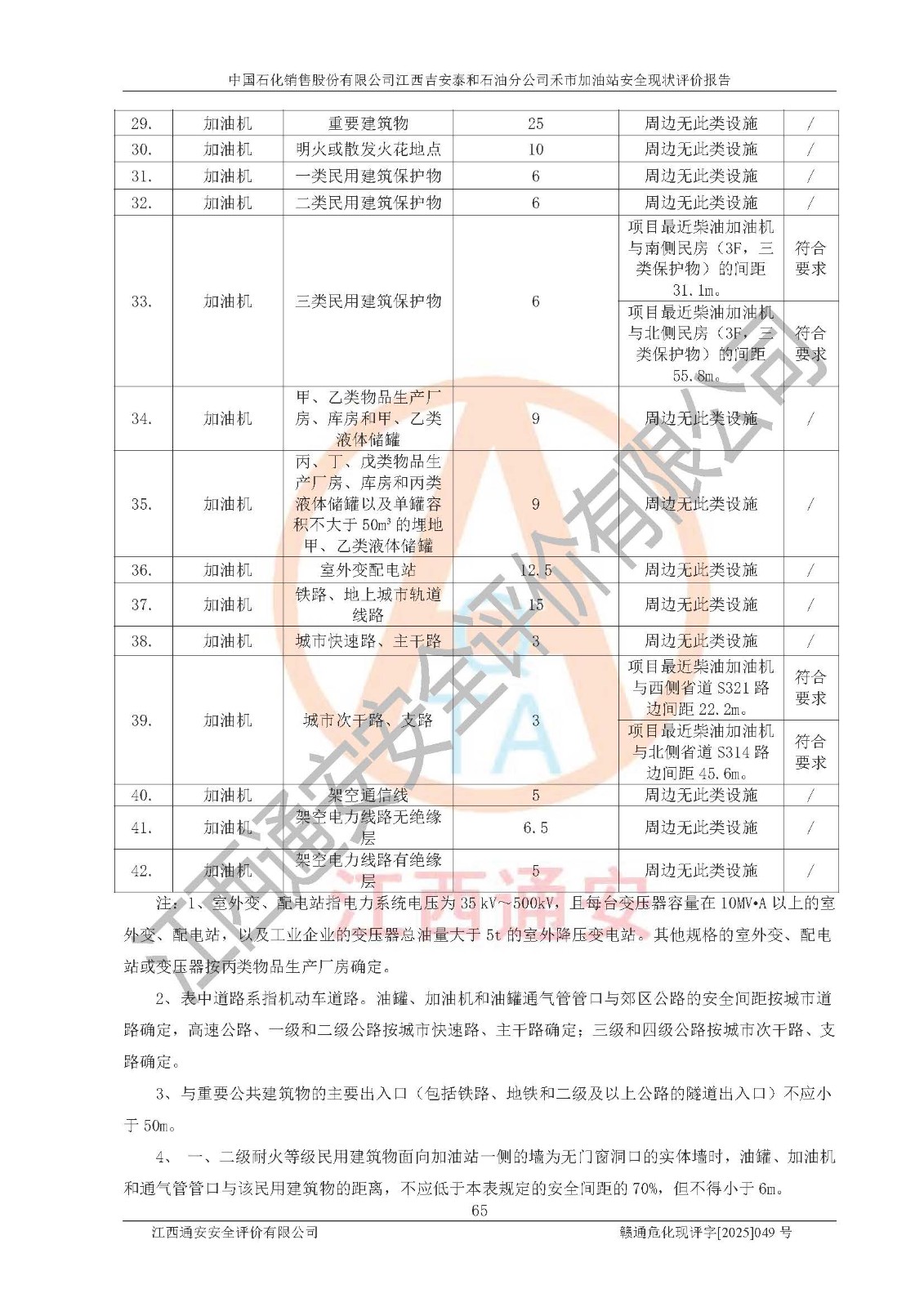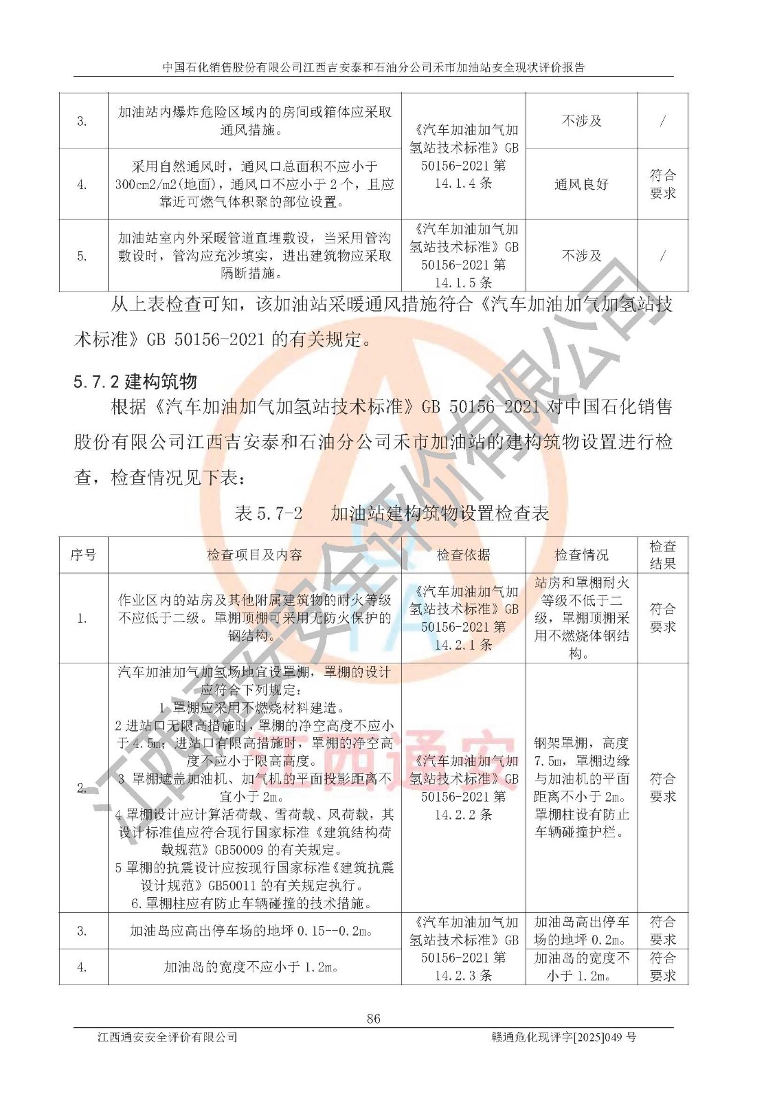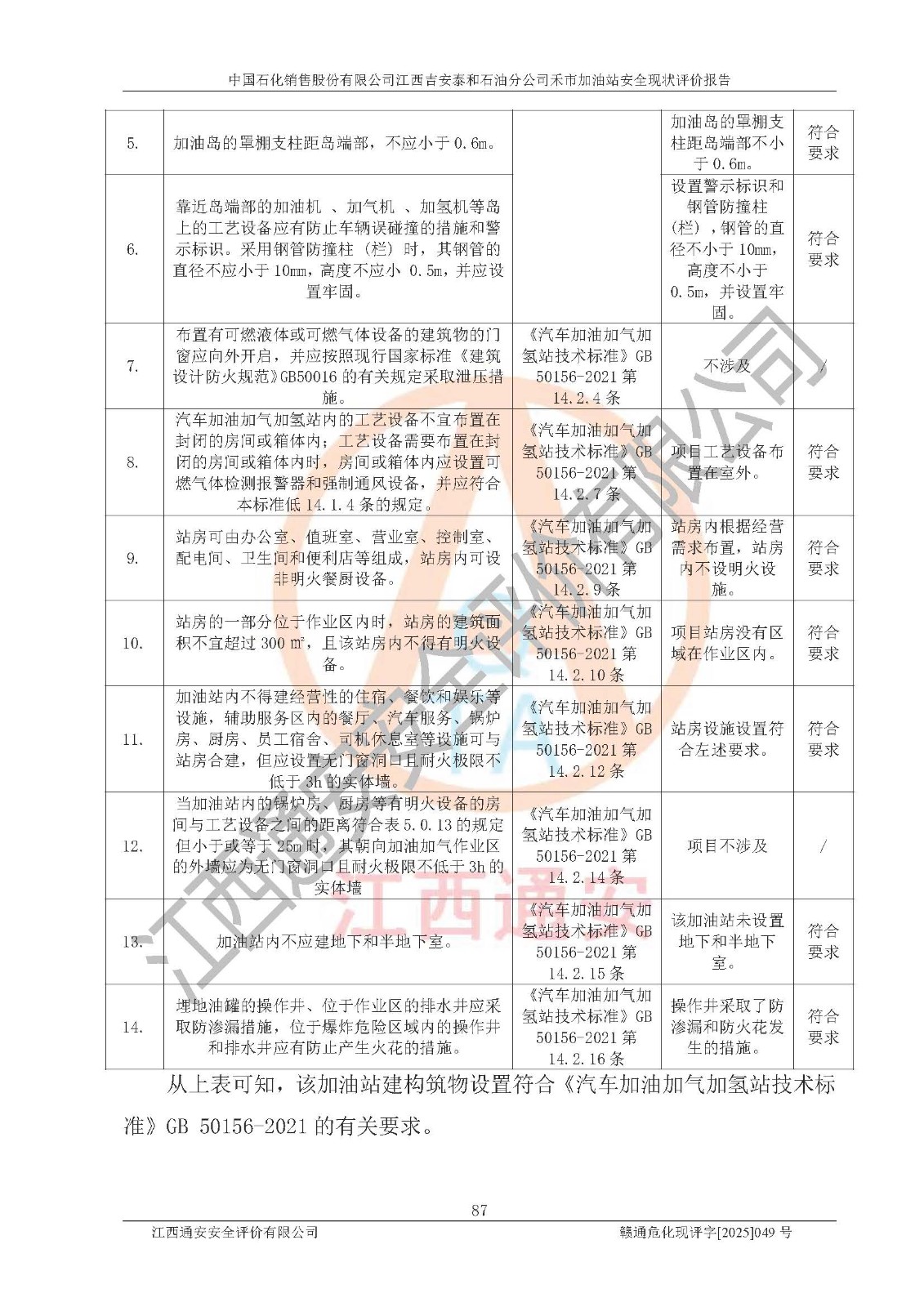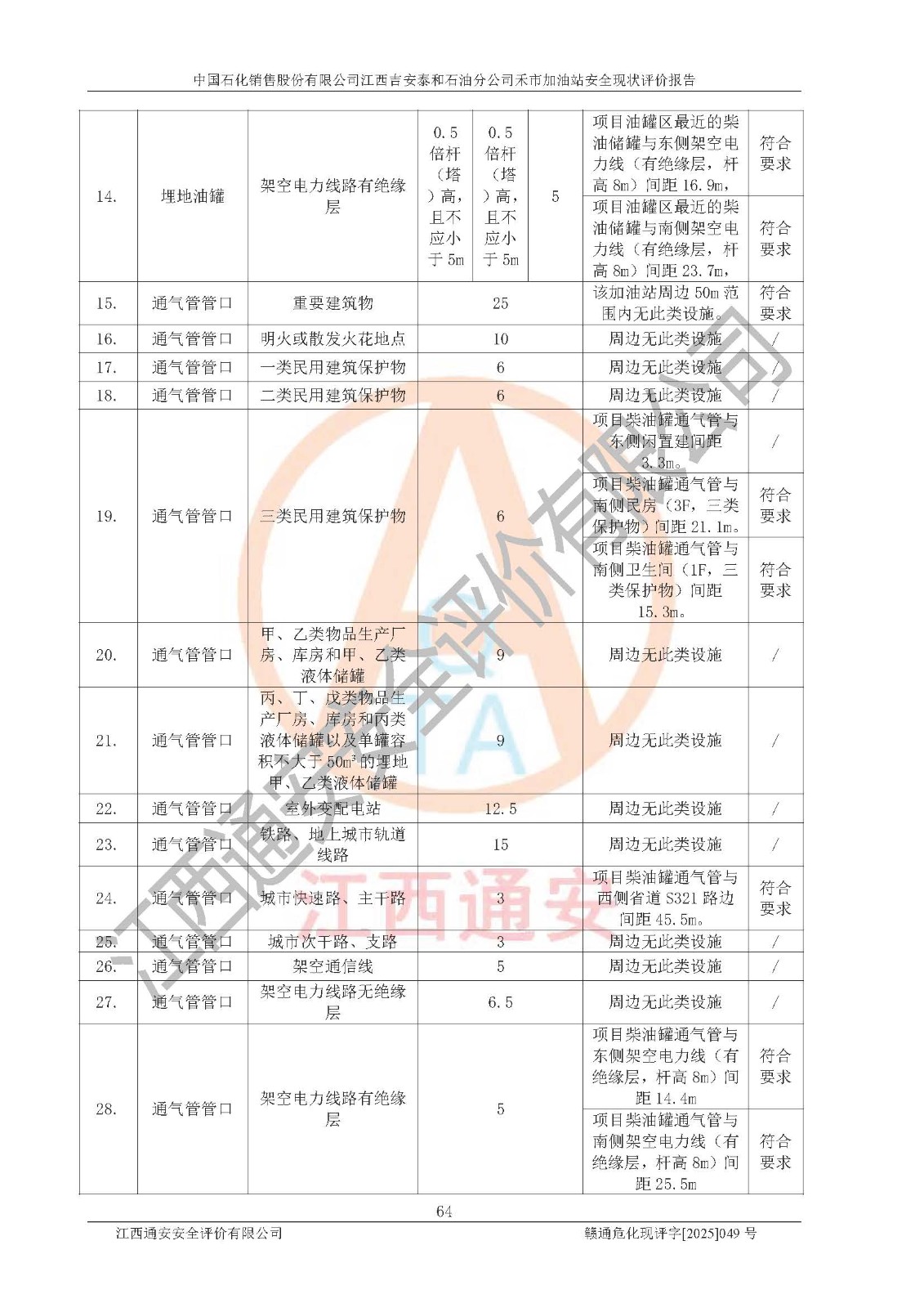 評(píng)價(jià)結(jié)論 | 中國(guó)石化銷售股份有限公司江西吉安泰和石油分公司禾市加油站該加油站卸油口與站房安全距離不符合《汽車加油加氣加氫站技術(shù)標(biāo)準(zhǔn)》GB 50156-2021 的有關(guān)要求,該站**在 2025年底進(jìn)行施工改造時(shí)一并整改到位,該站對(duì)存在的不符合項(xiàng)整改到位后滿足危險(xiǎn)化學(xué)品經(jīng)營(yíng)條件。 | |||