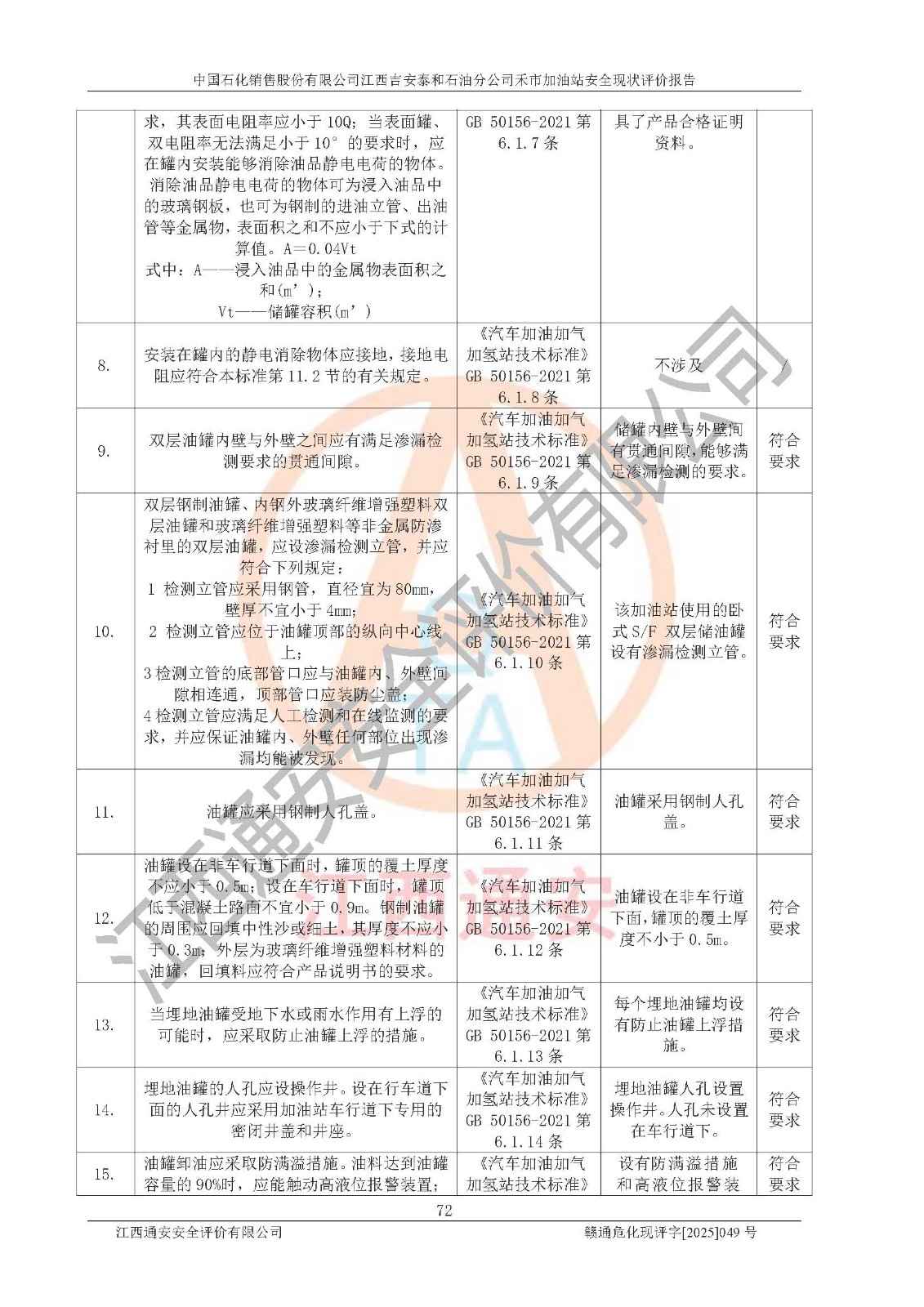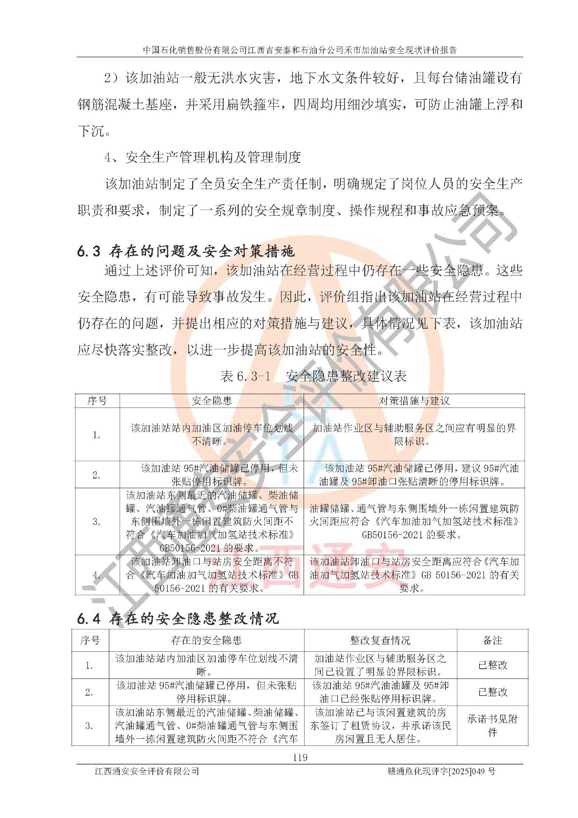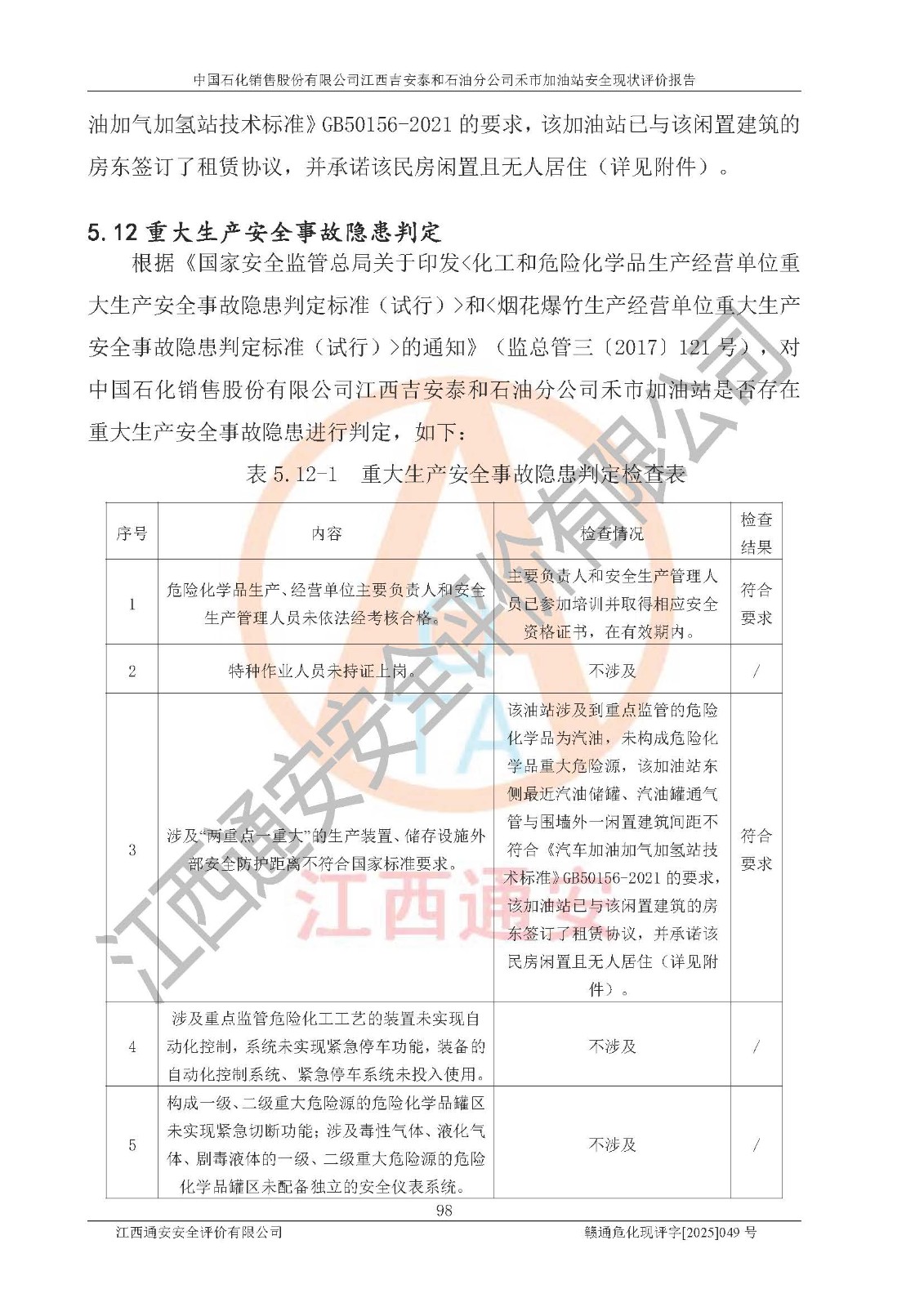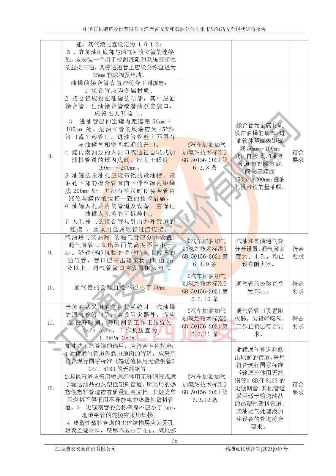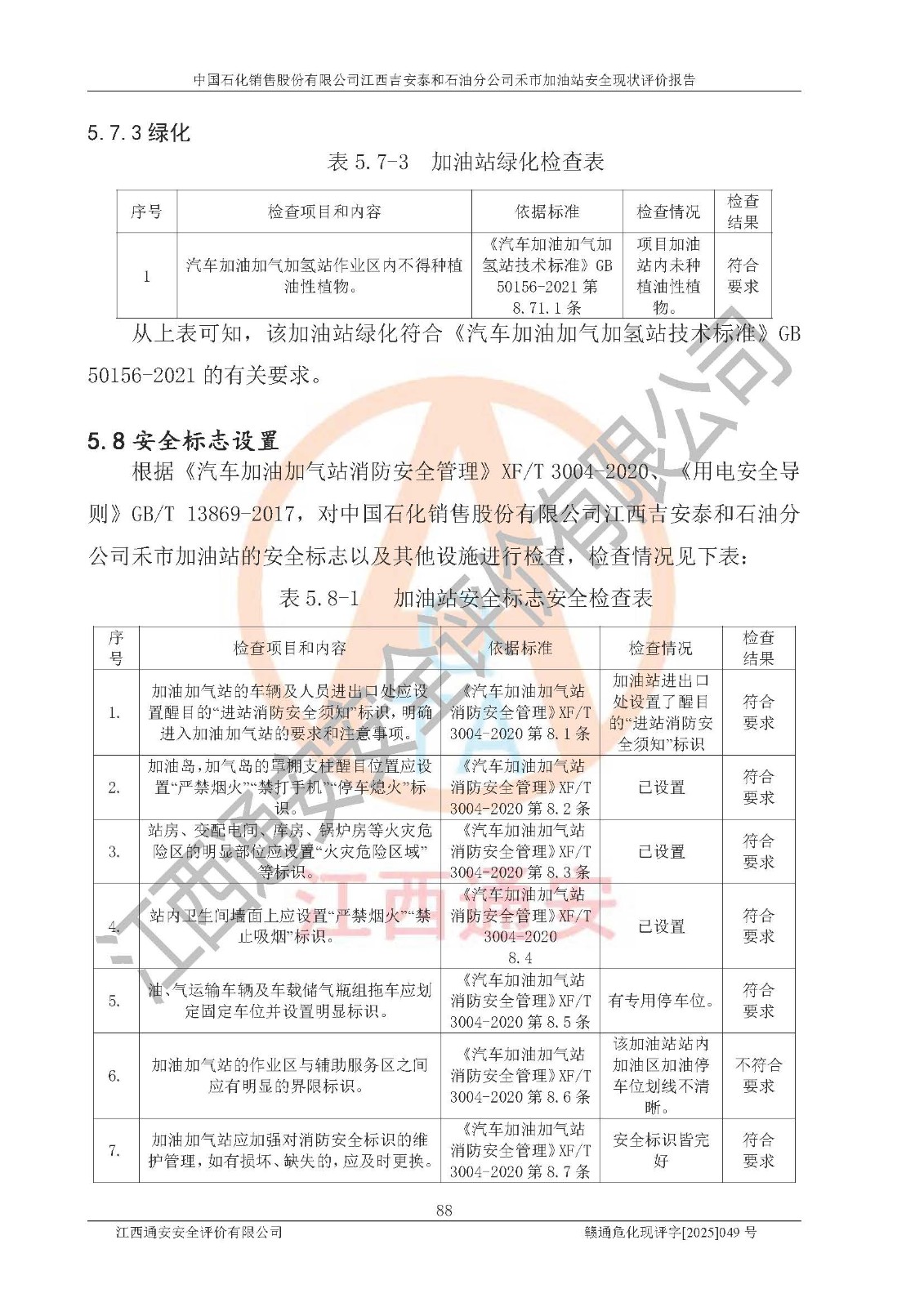 評(píng)價(jià)結(jié)論 | 中國(guó)石化銷售股份有限公司江西吉安泰和石油分公司禾市加油站該加油站卸油口與站房安全距離不符合《汽車加油加氣加氫站技術(shù)標(biāo)準(zhǔn)》GB 50156-2021 的有關(guān)要求,該站**在 2025年底進(jìn)行施工改造時(shí)一并整改到位,該站對(duì)存在的不符合項(xiàng)整改到位后滿足危險(xiǎn)化學(xué)品經(jīng)營(yíng)條件。 | |||