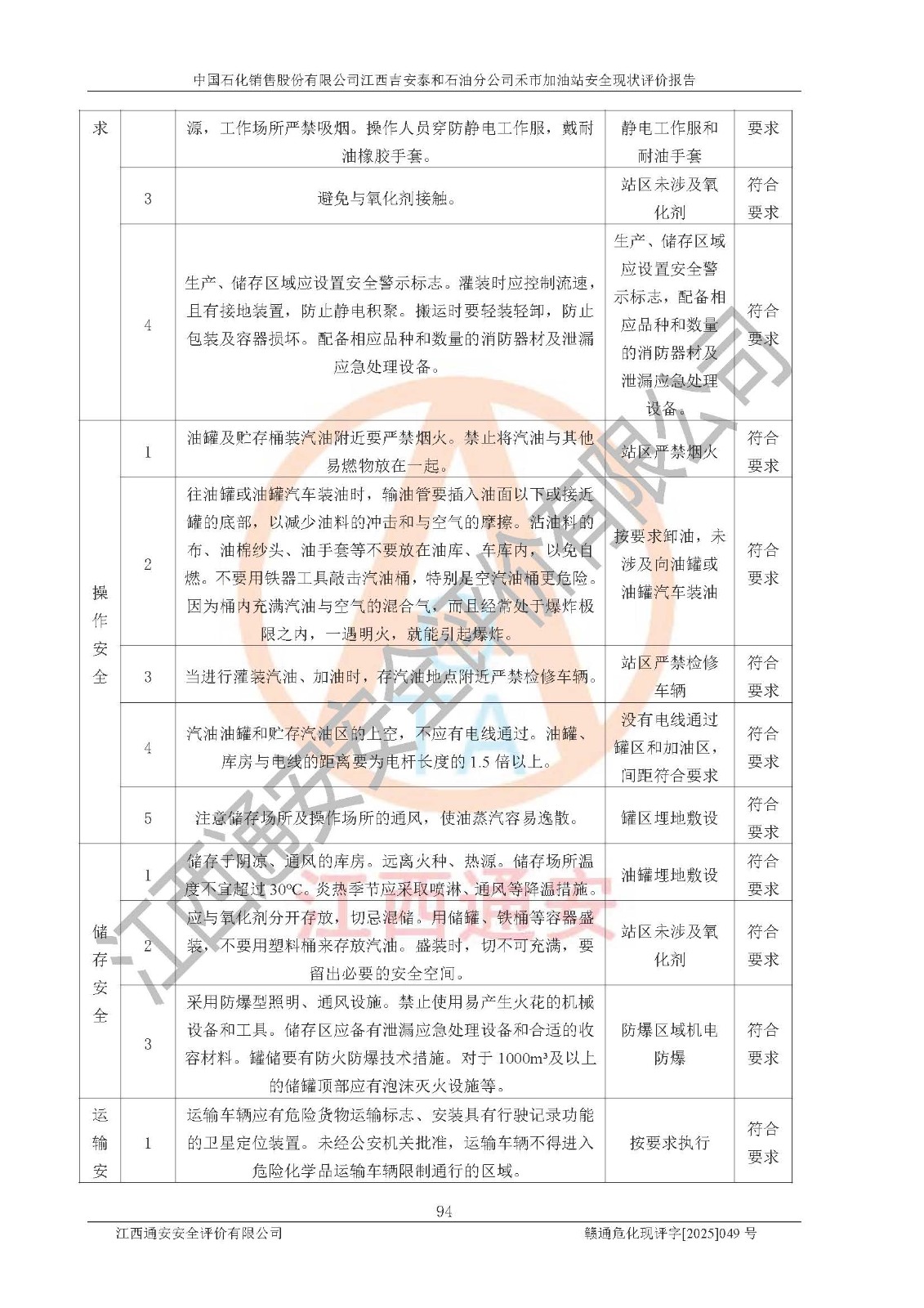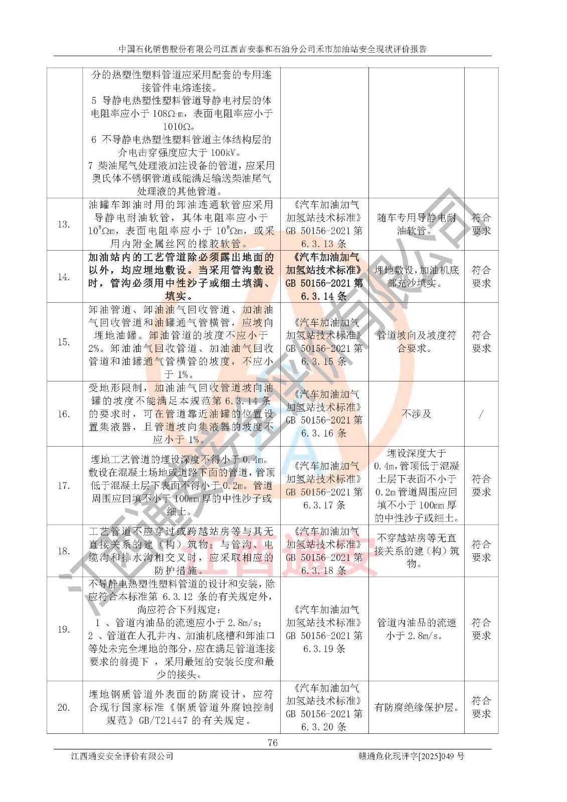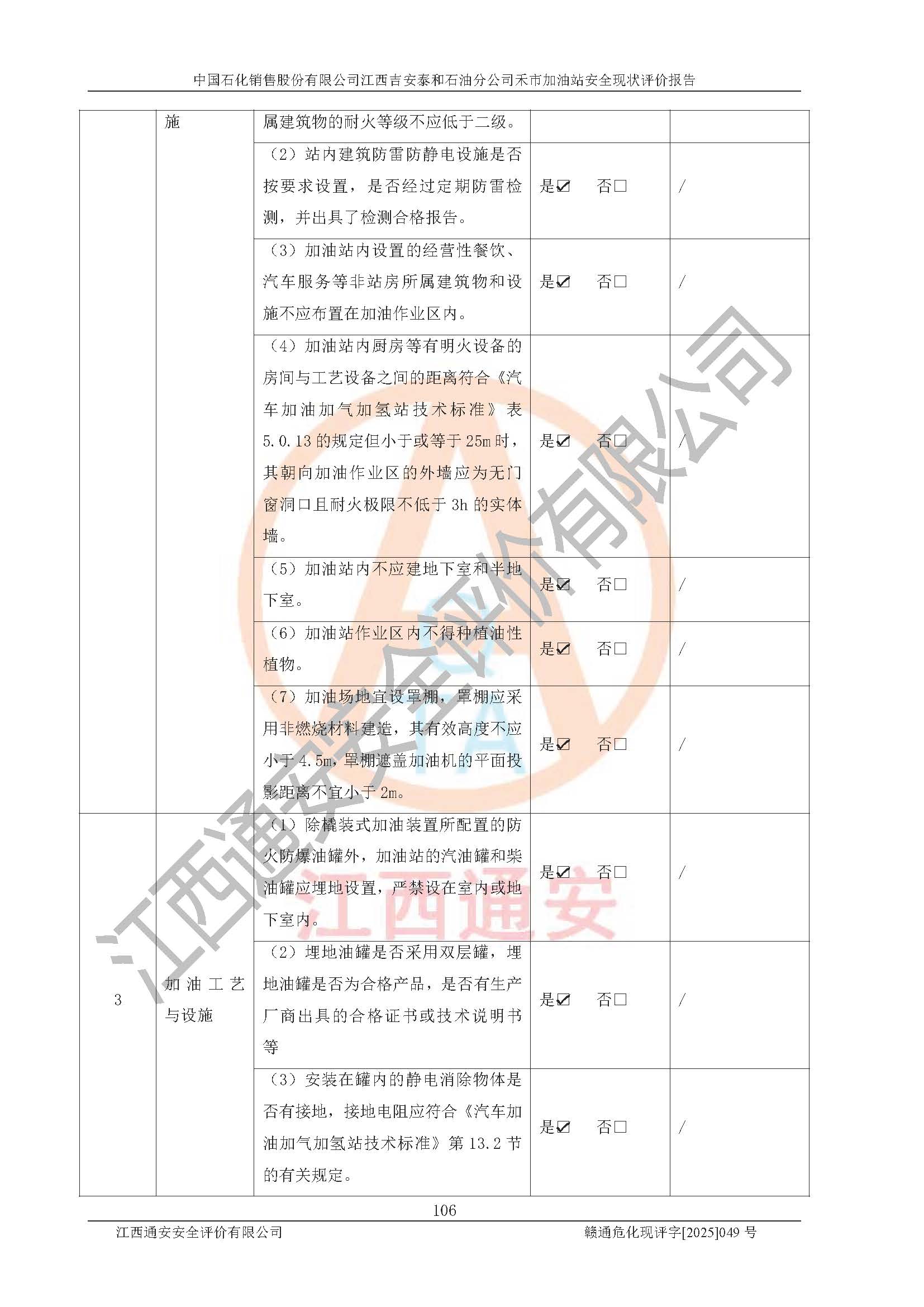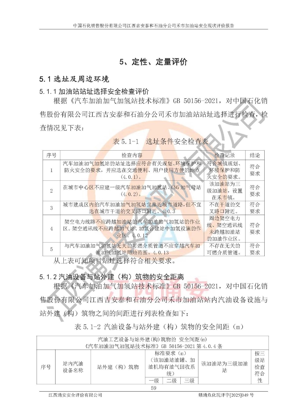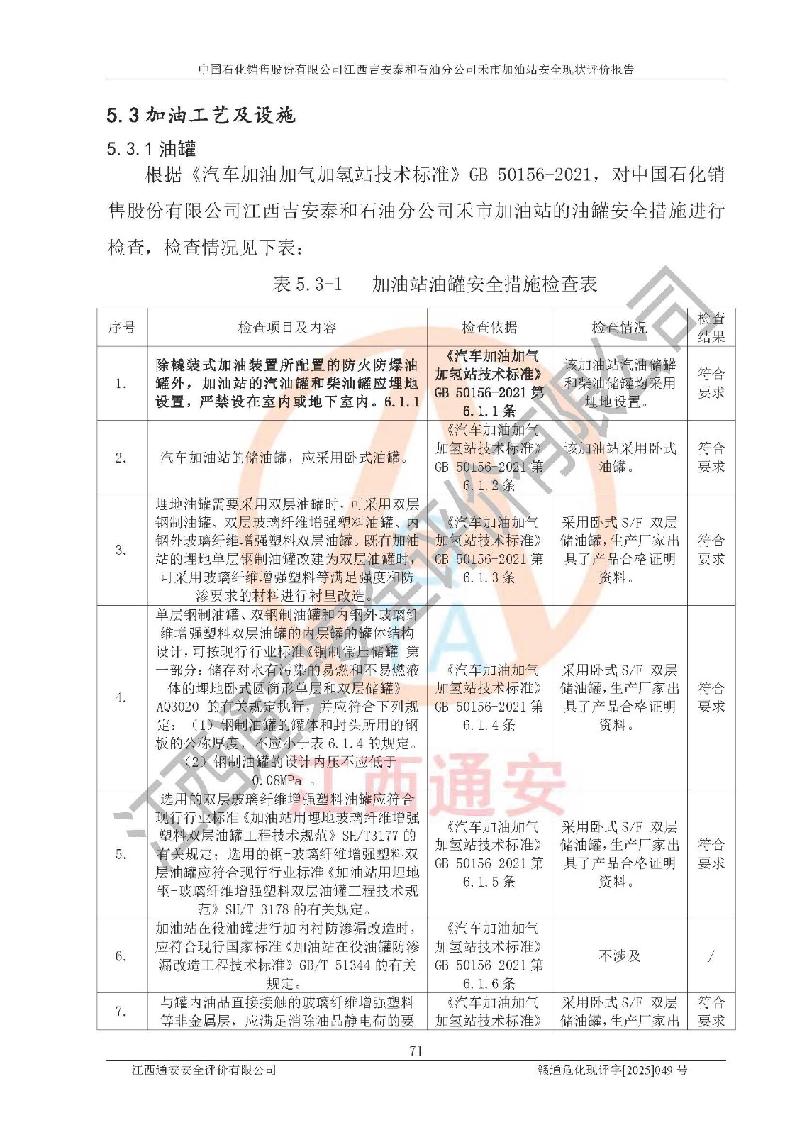 評(píng)價(jià)結(jié)論 | 中國(guó)石化銷售股份有限公司江西吉安泰和石油分公司禾市加油站該加油站卸油口與站房安全距離不符合《汽車加油加氣加氫站技術(shù)標(biāo)準(zhǔn)》GB 50156-2021 的有關(guān)要求,該站**在 2025年底進(jìn)行施工改造時(shí)一并整改到位,該站對(duì)存在的不符合項(xiàng)整改到位后滿足危險(xiǎn)化學(xué)品經(jīng)營(yíng)條件。 | |||