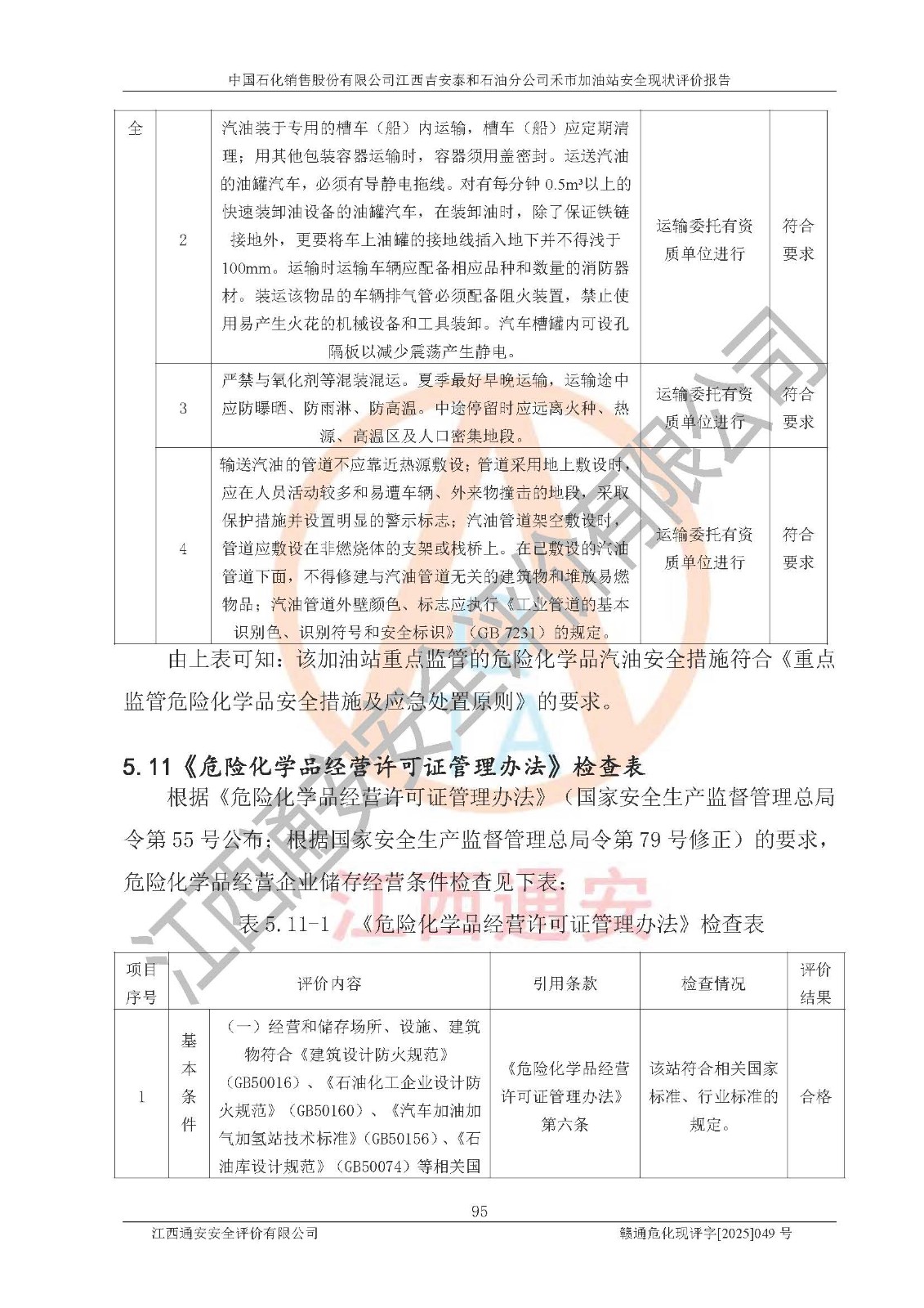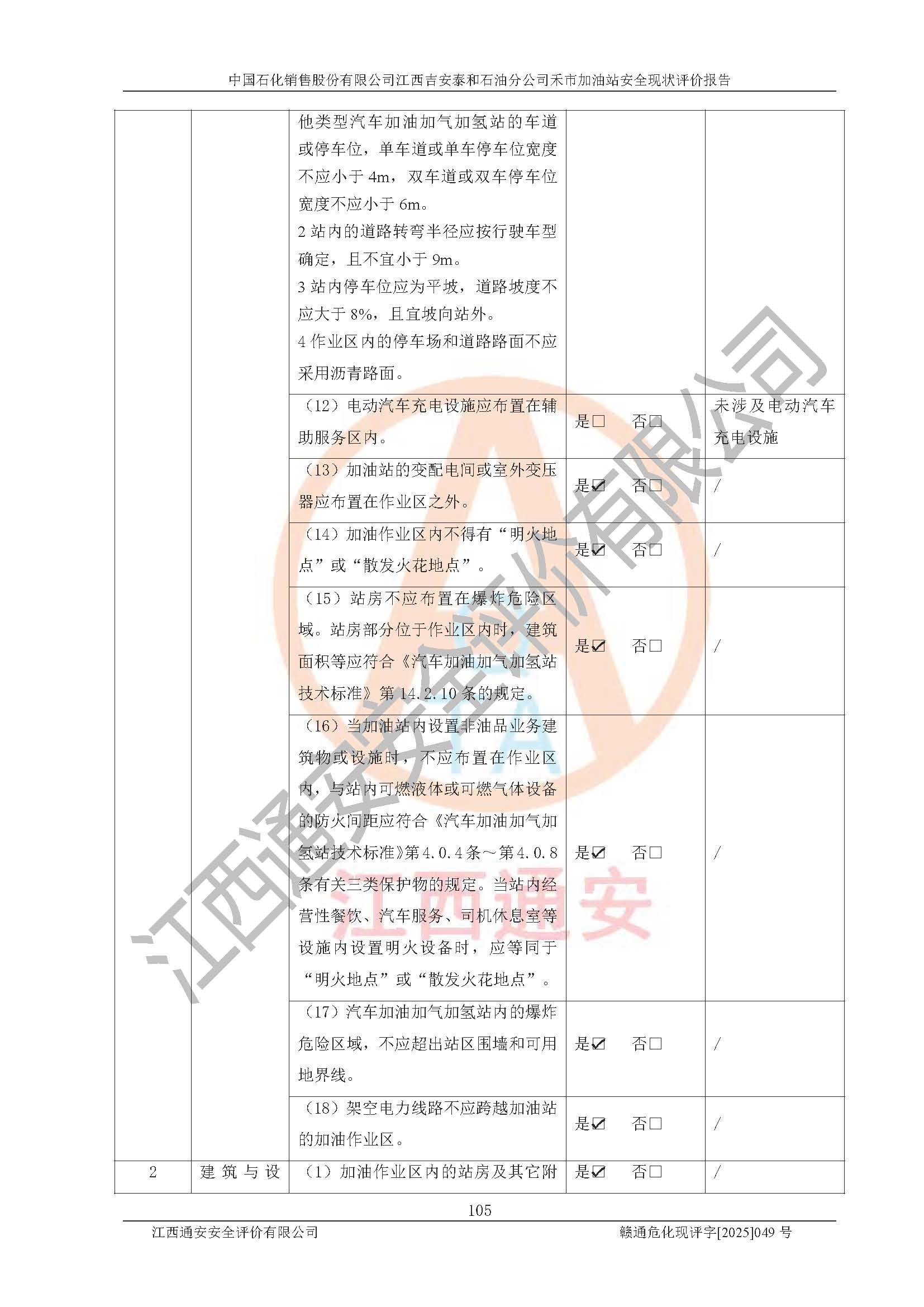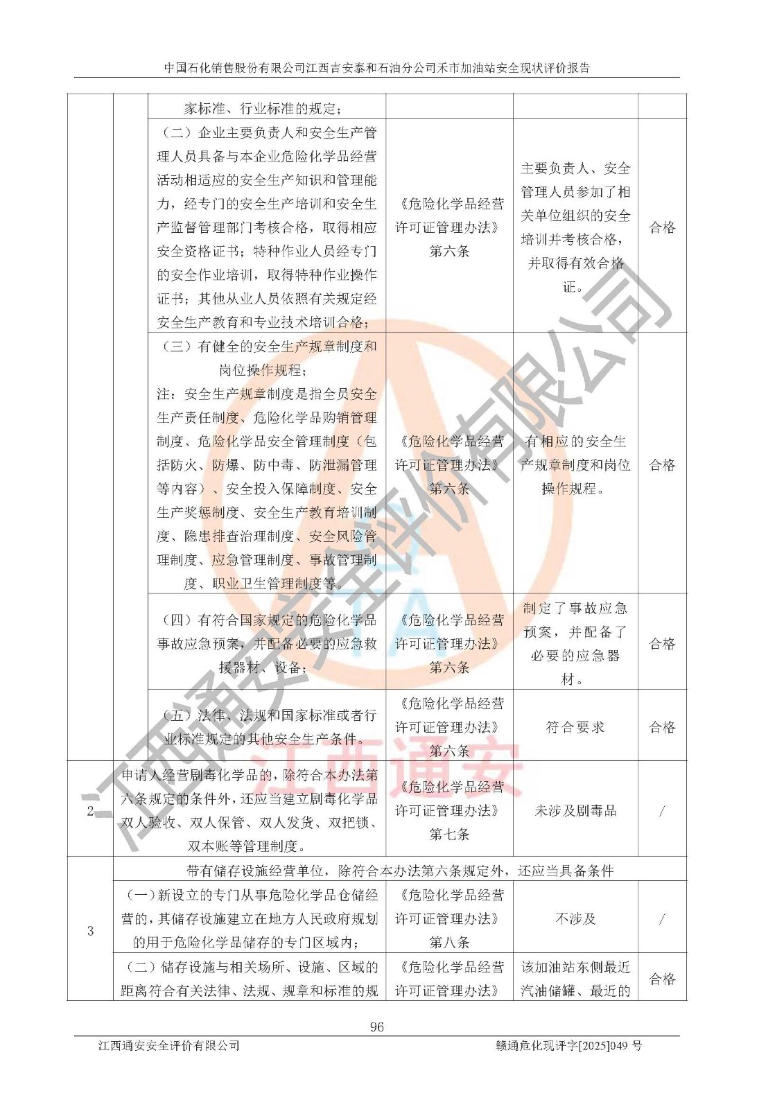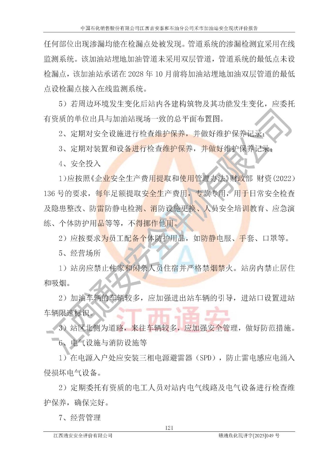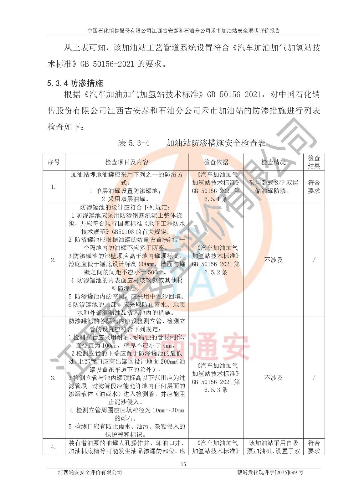 評(píng)價(jià)結(jié)論 | 中國(guó)石化銷售股份有限公司江西吉安泰和石油分公司禾市加油站該加油站卸油口與站房安全距離不符合《汽車加油加氣加氫站技術(shù)標(biāo)準(zhǔn)》GB 50156-2021 的有關(guān)要求,該站**在 2025年底進(jìn)行施工改造時(shí)一并整改到位,該站對(duì)存在的不符合項(xiàng)整改到位后滿足危險(xiǎn)化學(xué)品經(jīng)營(yíng)條件。 | |||