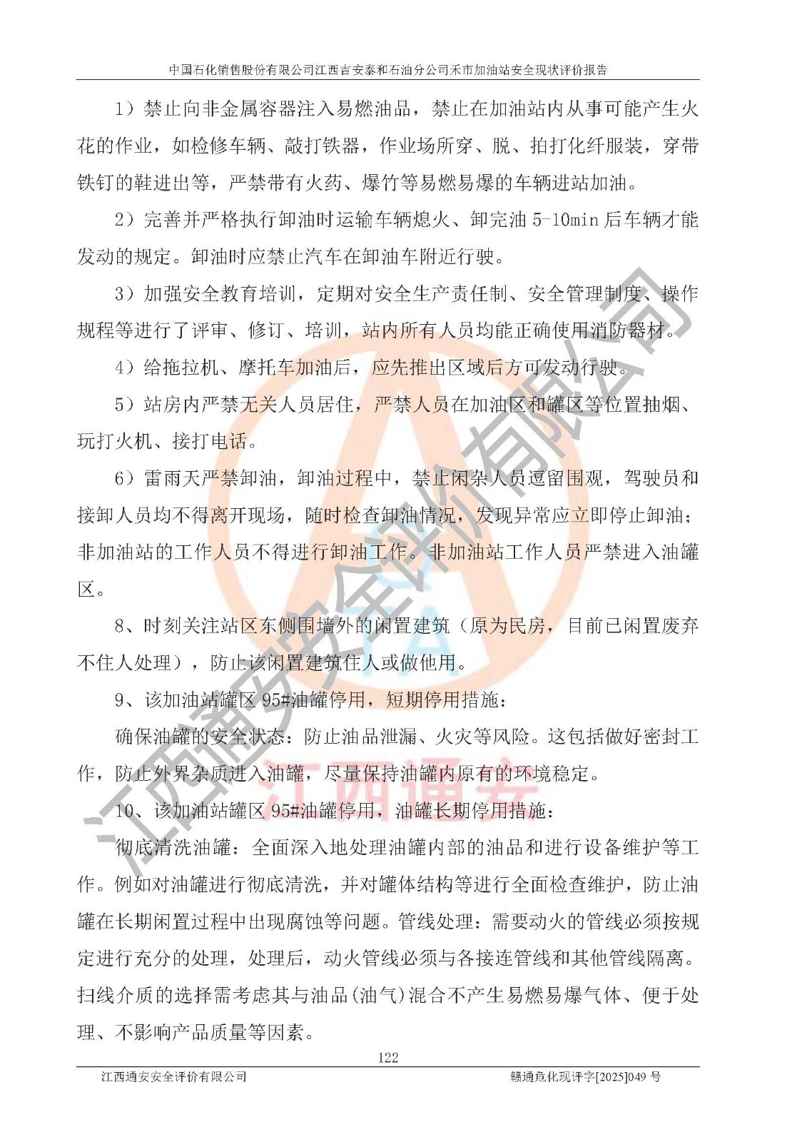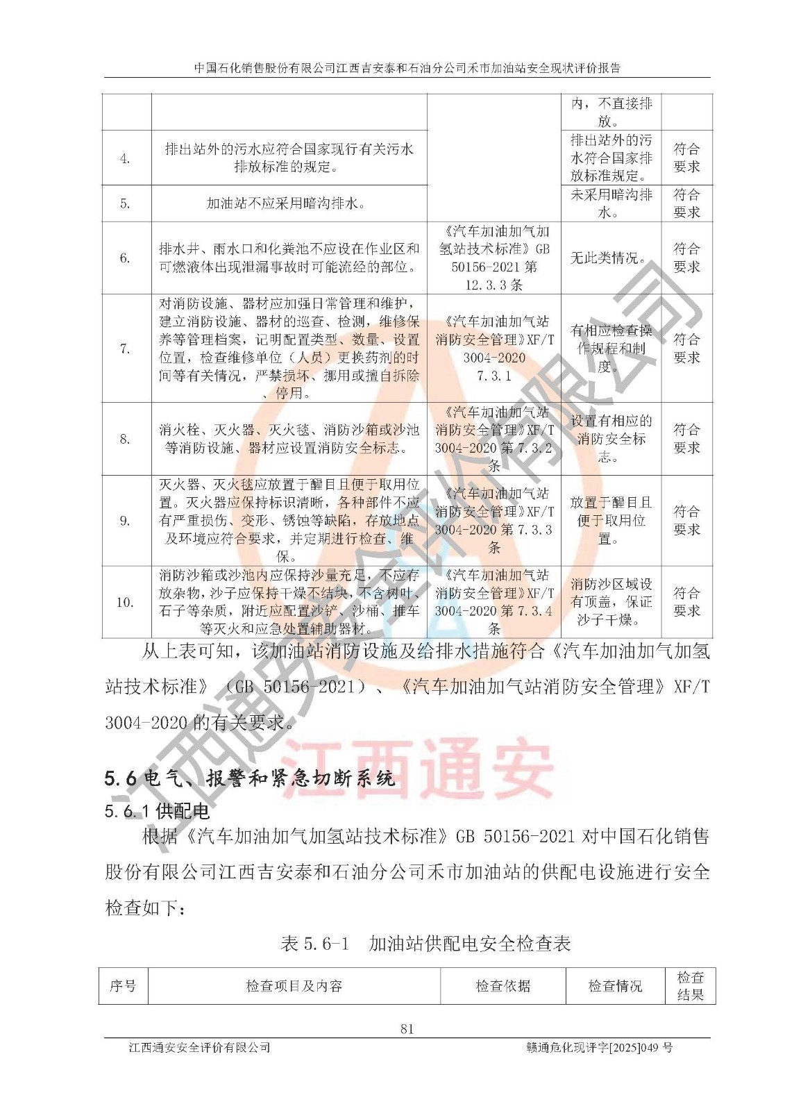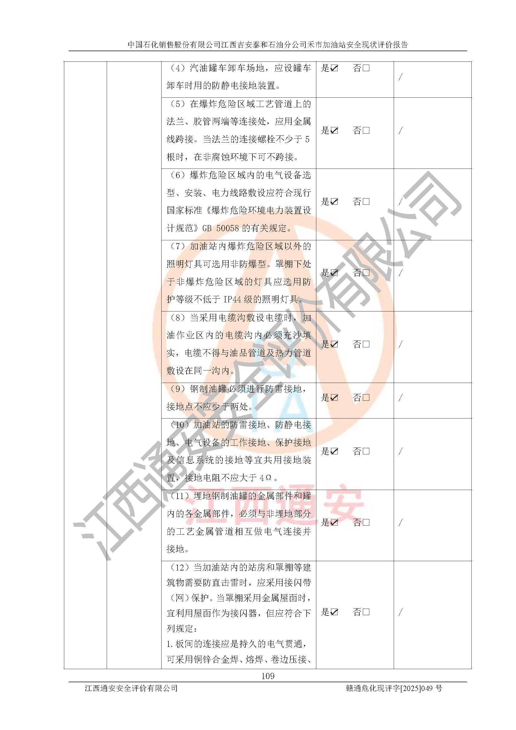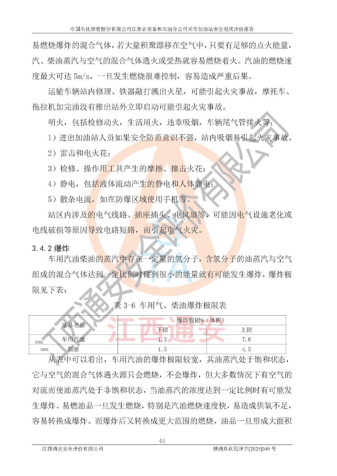 評(píng)價(jià)結(jié)論 | 中國(guó)石化銷售股份有限公司江西吉安泰和石油分公司禾市加油站該加油站卸油口與站房安全距離不符合《汽車加油加氣加氫站技術(shù)標(biāo)準(zhǔn)》GB 50156-2021 的有關(guān)要求,該站**在 2025年底進(jìn)行施工改造時(shí)一并整改到位,該站對(duì)存在的不符合項(xiàng)整改到位后滿足危險(xiǎn)化學(xué)品經(jīng)營(yíng)條件。 | |||