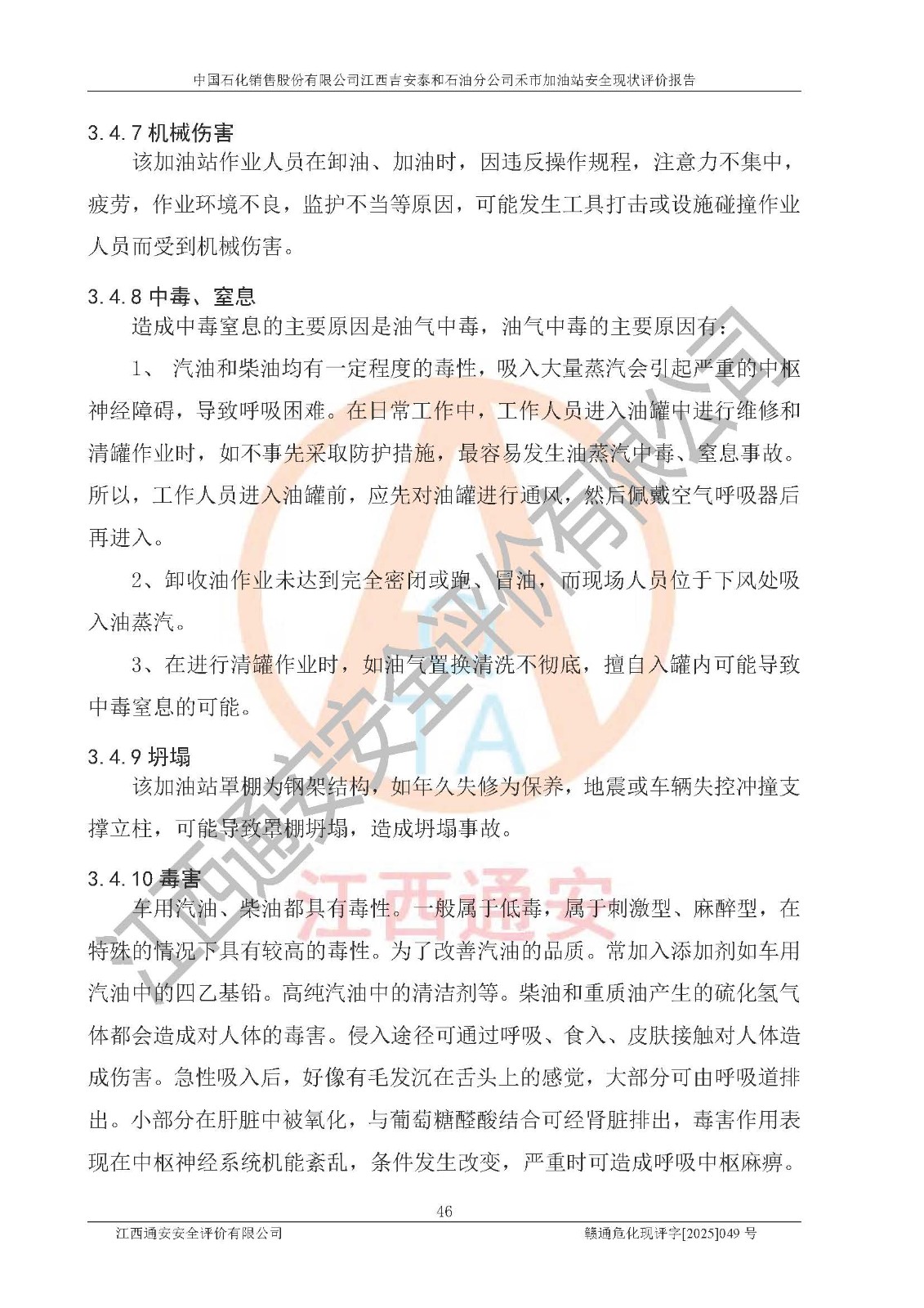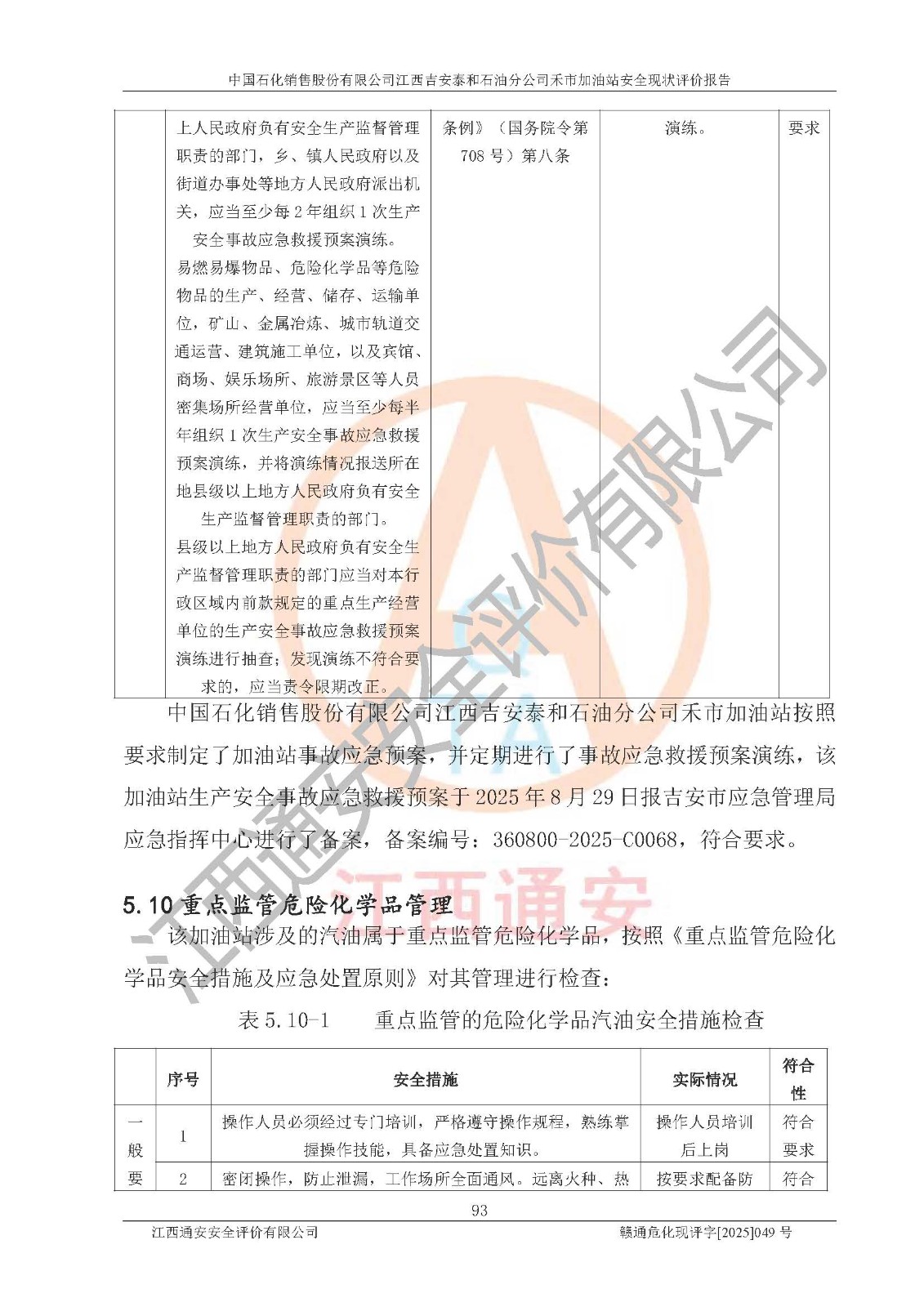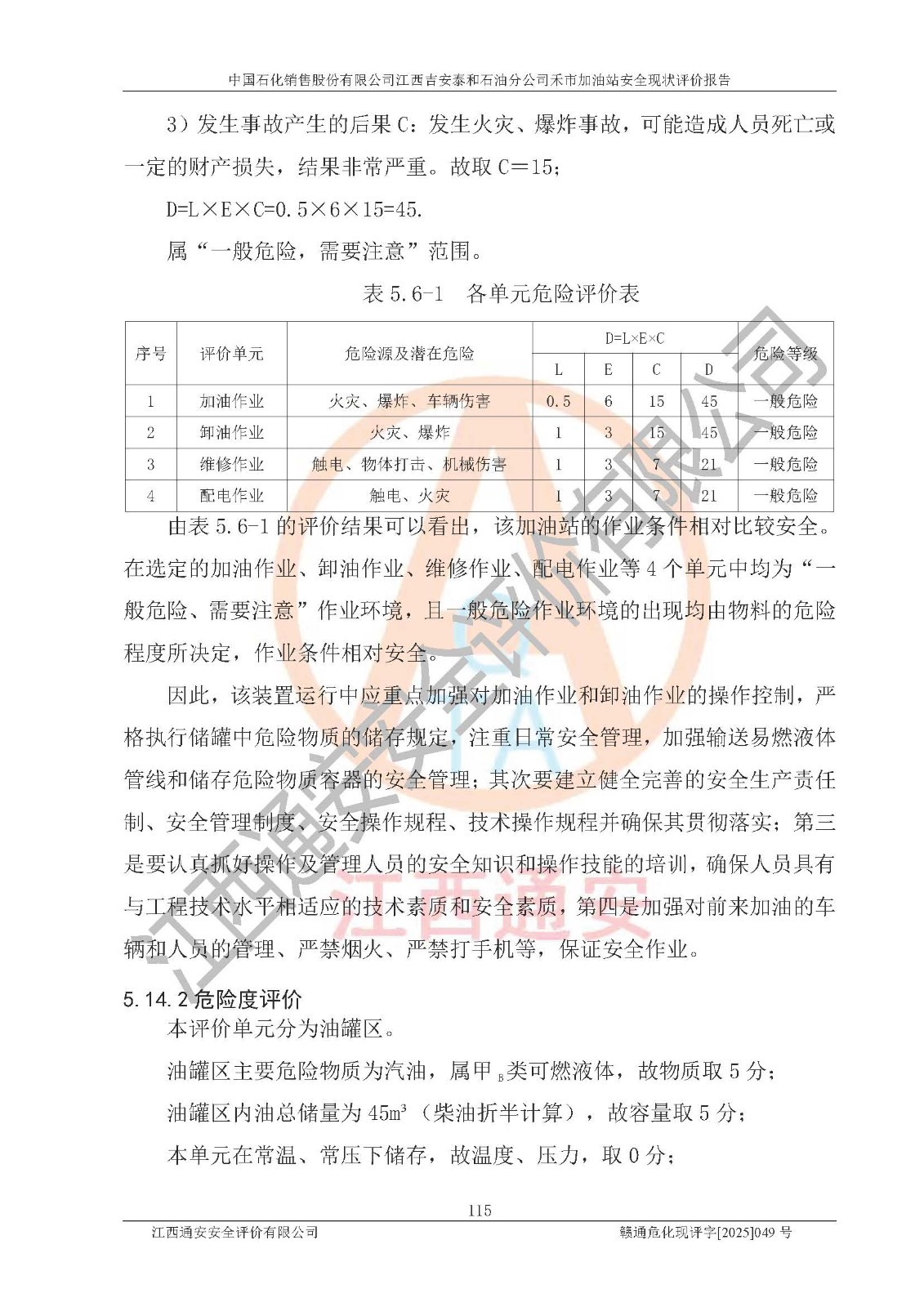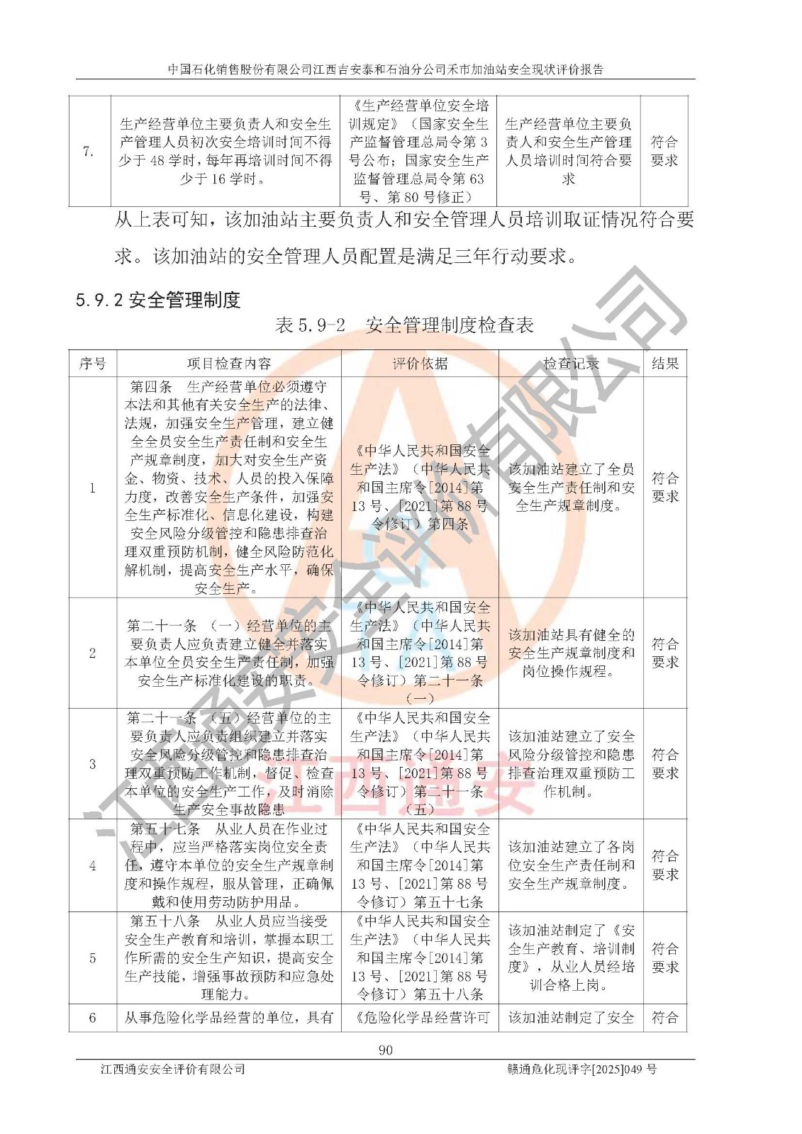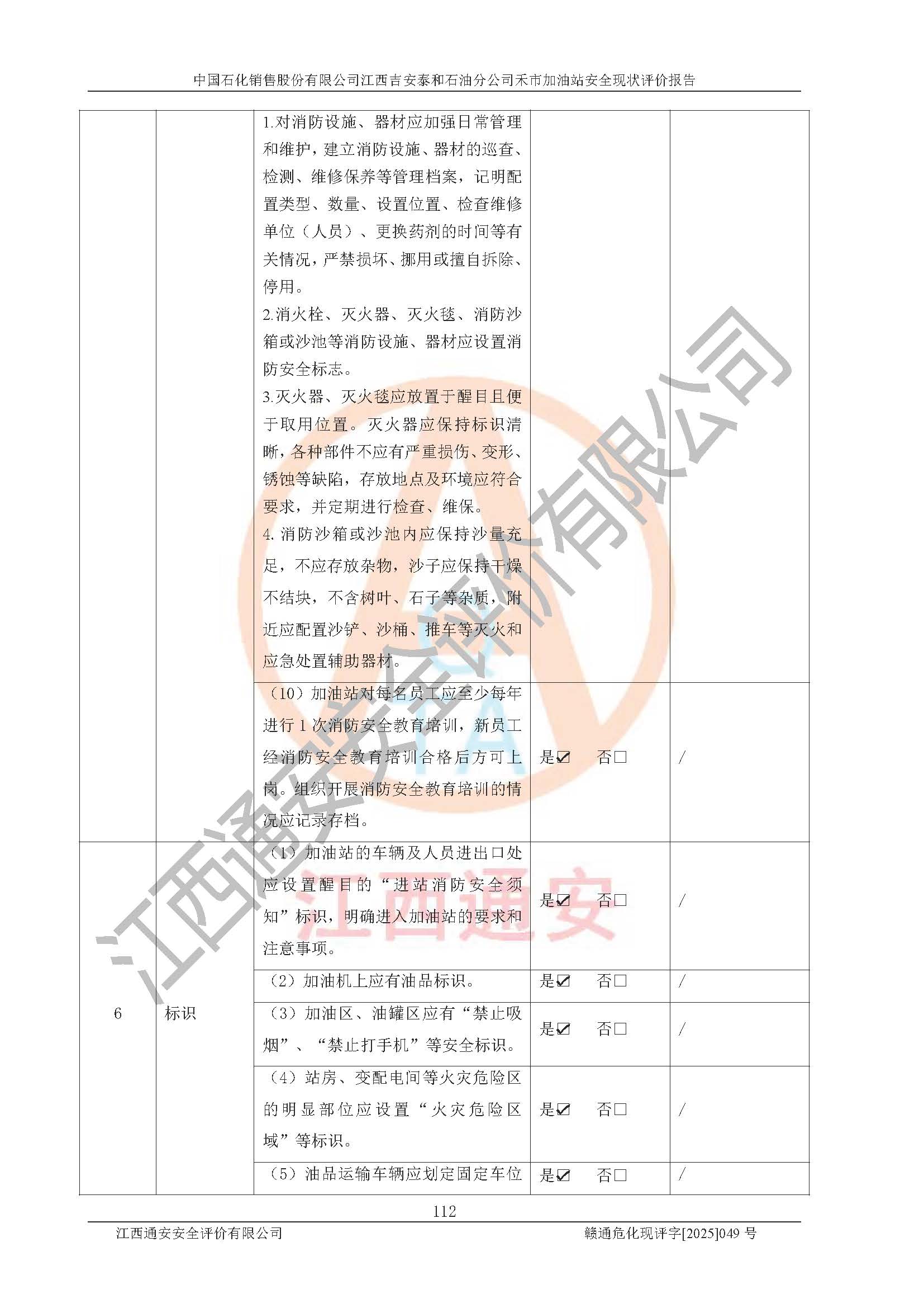 評(píng)價(jià)結(jié)論 | 中國(guó)石化銷售股份有限公司江西吉安泰和石油分公司禾市加油站該加油站卸油口與站房安全距離不符合《汽車加油加氣加氫站技術(shù)標(biāo)準(zhǔn)》GB 50156-2021 的有關(guān)要求,該站**在 2025年底進(jìn)行施工改造時(shí)一并整改到位,該站對(duì)存在的不符合項(xiàng)整改到位后滿足危險(xiǎn)化學(xué)品經(jīng)營(yíng)條件。 | |||