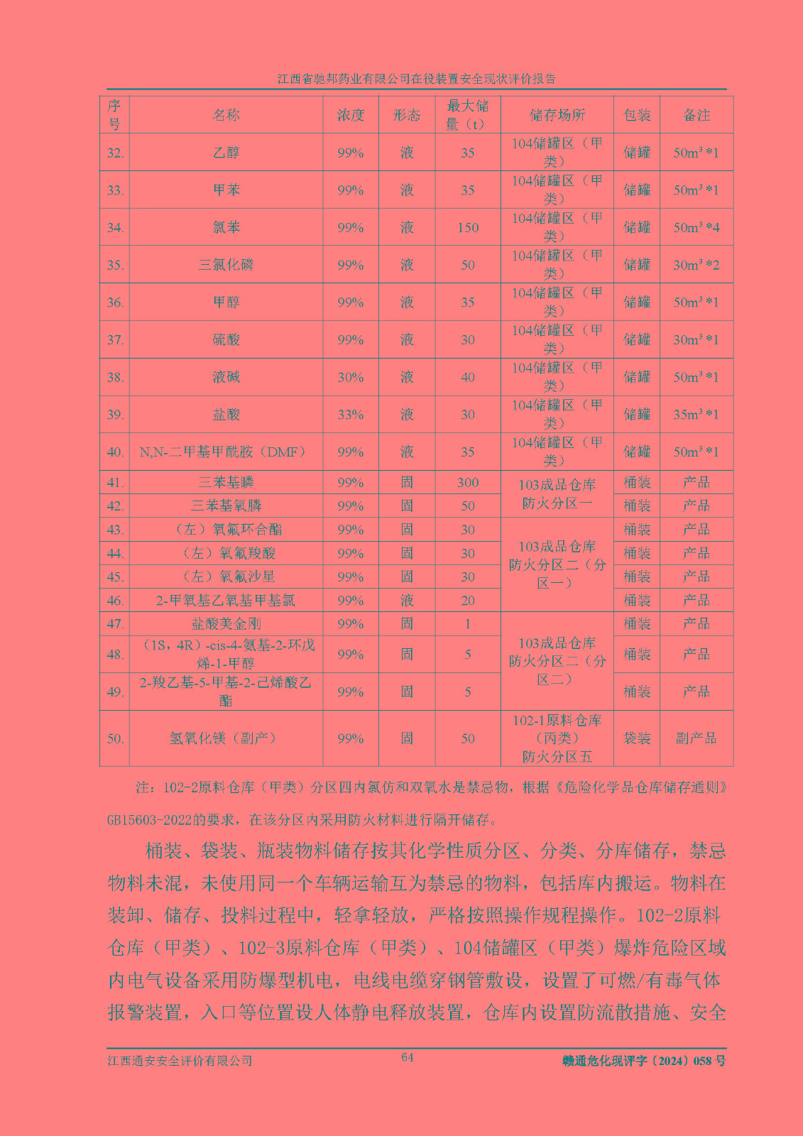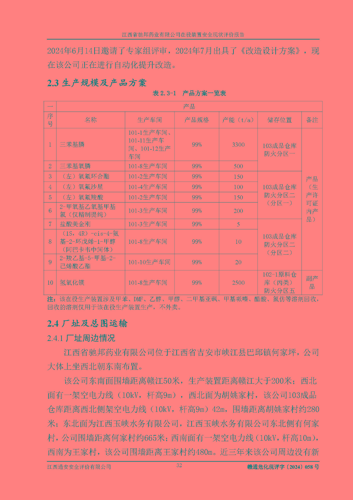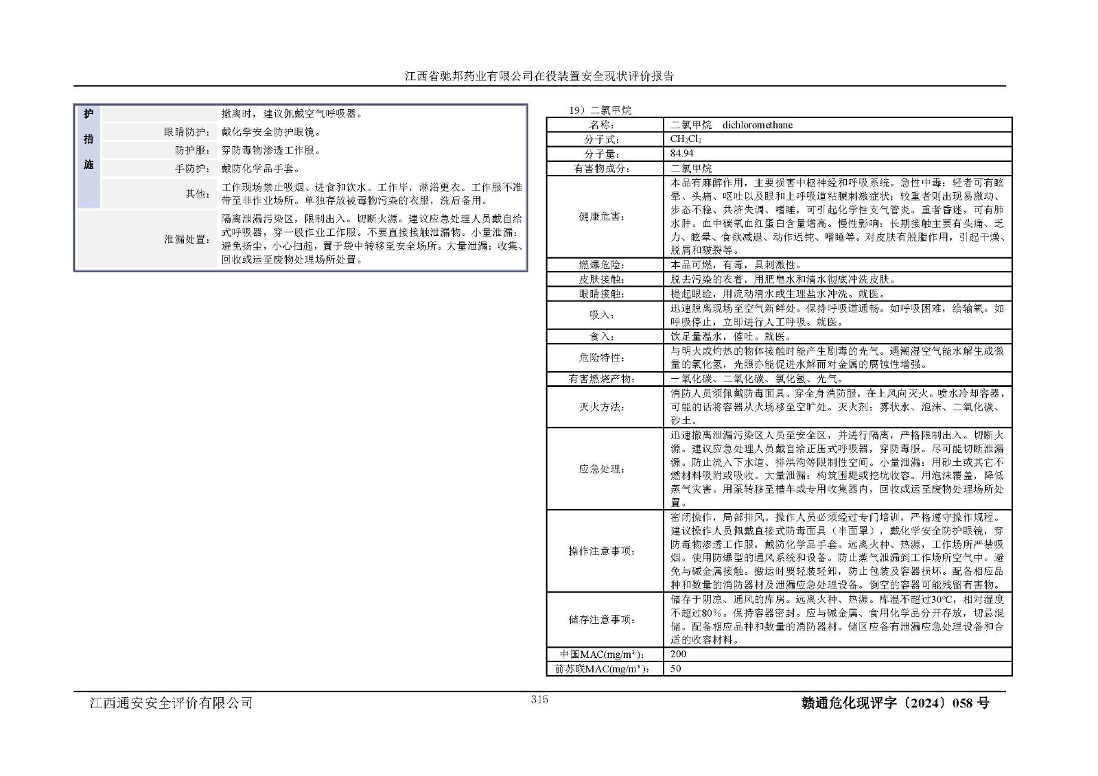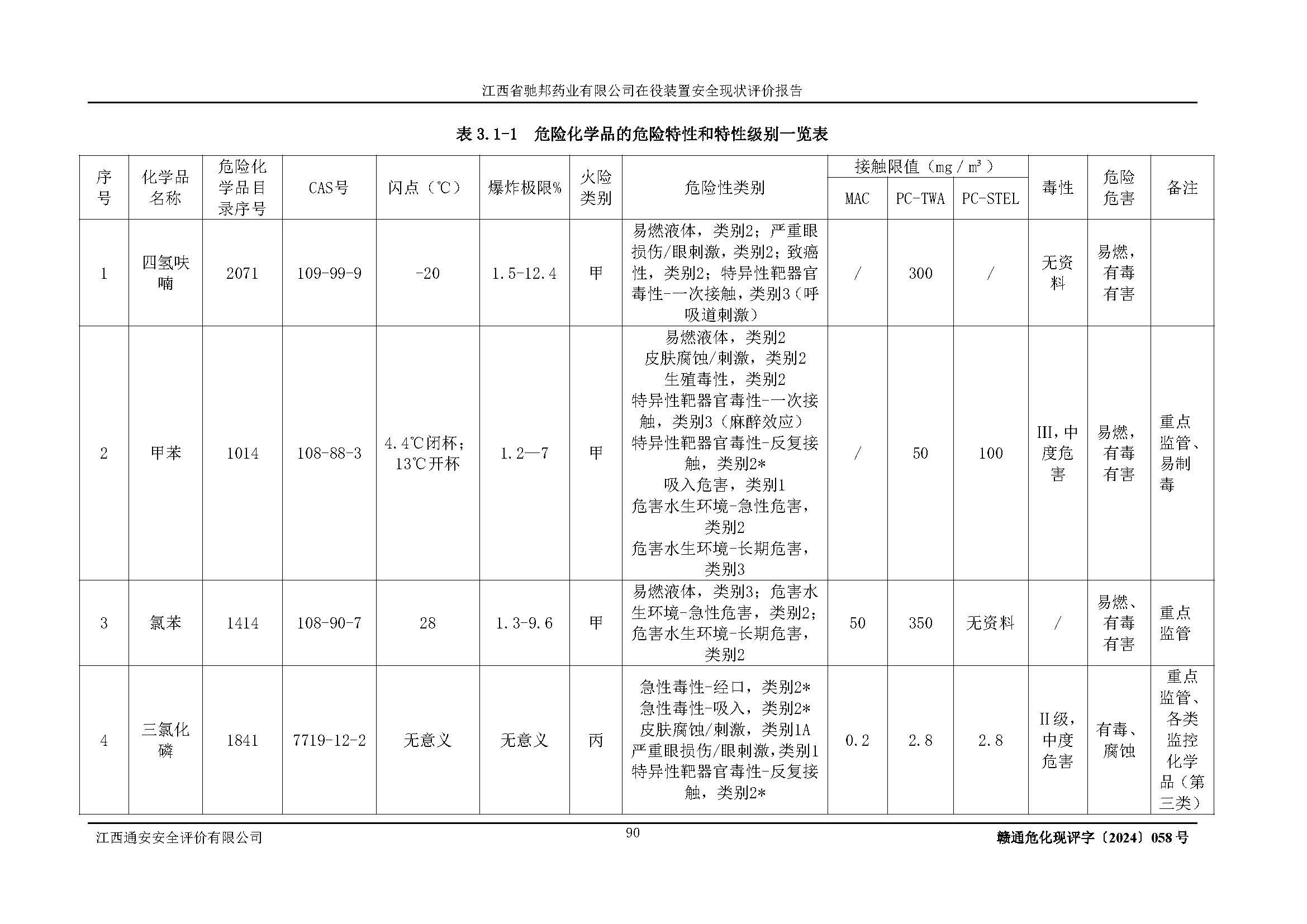 項(xiàng)目簡介 | 江西省馳邦藥業(yè)有限公司(以下簡稱“該公司”)成立于2007年9月21日,位于江西省吉安市峽江縣巴邱鎮(zhèn)何家坪,屬有限責(zé)任公司(自然人投資或控股),法定**人:徐小海,注冊資金:貳仟萬元整,經(jīng)營范圍:醫(yī)藥中間體生產(chǎn)銷售及進(jìn)出口業(yè)務(wù)(涉及前置許可的憑許可證經(jīng)營)。占地面積約149322.9㎡,現(xiàn)有人員194人。 2022年3月24日該公司進(jìn)行了延期換證,取得了新的《安全生產(chǎn)許可證》,許可證編號:(贛)WH安許證字〔2010〕573號,許可范圍:三苯基膦(3.3kt/a)、(左)氧氟環(huán)合酯(150t/a)、(左)氧氟沙星(100t/a)、(左)氧氟羧酸(150t/a)、鹽酸美金剛(5t/a)、(1S,4R)-cis-4-氨基-2-環(huán)戊烯-1-甲醇(10t/a,阿巴卡韋中間體)、2-甲氧基乙氧基甲基氯(200t/a,僅精制提純)、三苯基氧膦(500t/a)、2-羧乙基-5-甲基-2-己烯酸乙酯(20t/a),**期:2022年3月24日至2025年3月23日。 根據(jù)《危險(xiǎn)化學(xué)品目錄》(2015版)和應(yīng)急管理部 工業(yè)和信息化部 公安部 生態(tài)環(huán)境部 交通運(yùn)輸部 農(nóng)業(yè)農(nóng)村部 衛(wèi)生健康委 市場監(jiān)管總局 鐵路局 民航局公告2022年第8號《決定調(diào)整《危險(xiǎn)化學(xué)品目錄(2015版)》,將“1674柴油〔閉杯閃點(diǎn)≤60℃〕”調(diào)整為“1674柴油”》等文件規(guī)定,該在役生產(chǎn)裝置生產(chǎn)過程中涉及的四氫呋喃、甲苯、氯苯、三氯化磷、鎂屑、甲醇、硫酸、氫氧化鈉(片堿和液堿)、鹽酸、乙酸乙酯、乙醇、異戊醛、三正丙胺、正己烷、無水氟化鉀、三乙胺、冰醋酸、N,N-二甲基甲酰胺(DMF)、乙腈、氯仿、醋酸酐、雙氧水、二氯甲烷、氯化亞砜、三苯基膦(產(chǎn)品)、氮?dú)猓▔嚎s)、柴油(發(fā)電機(jī)、叉車用)等屬于危險(xiǎn)化學(xué)品。其中三氯甲烷、醋酸酐為第二類易制毒化學(xué)品,甲苯、硫酸、鹽酸為第三類易制毒化學(xué)品;甲醇、甲苯、三氯化磷、氯苯、乙酸乙酯、三氯甲烷屬于重點(diǎn)監(jiān)管的危險(xiǎn)化學(xué)品;甲醇、乙醇屬于特別管控危險(xiǎn)化學(xué)品;三氯化磷、氯化亞砜為第三類監(jiān)控化學(xué)品;1-溴-3,5-二甲基金剛烷、四氫呋喃、甲基哌嗪、氯仿、醋酸酐、異戊醛、丙二酸二乙酯、四氟苯甲酰氯(四氟)、三乙胺、二甲基亞砜、乙二醇、乙酸乙酯、乙醇、甲苯、甲醇為第四類監(jiān)控化學(xué)品;鎂屑、雙氧水屬于易制爆化學(xué)品;氟化鉀屬于高毒物品。 | |||