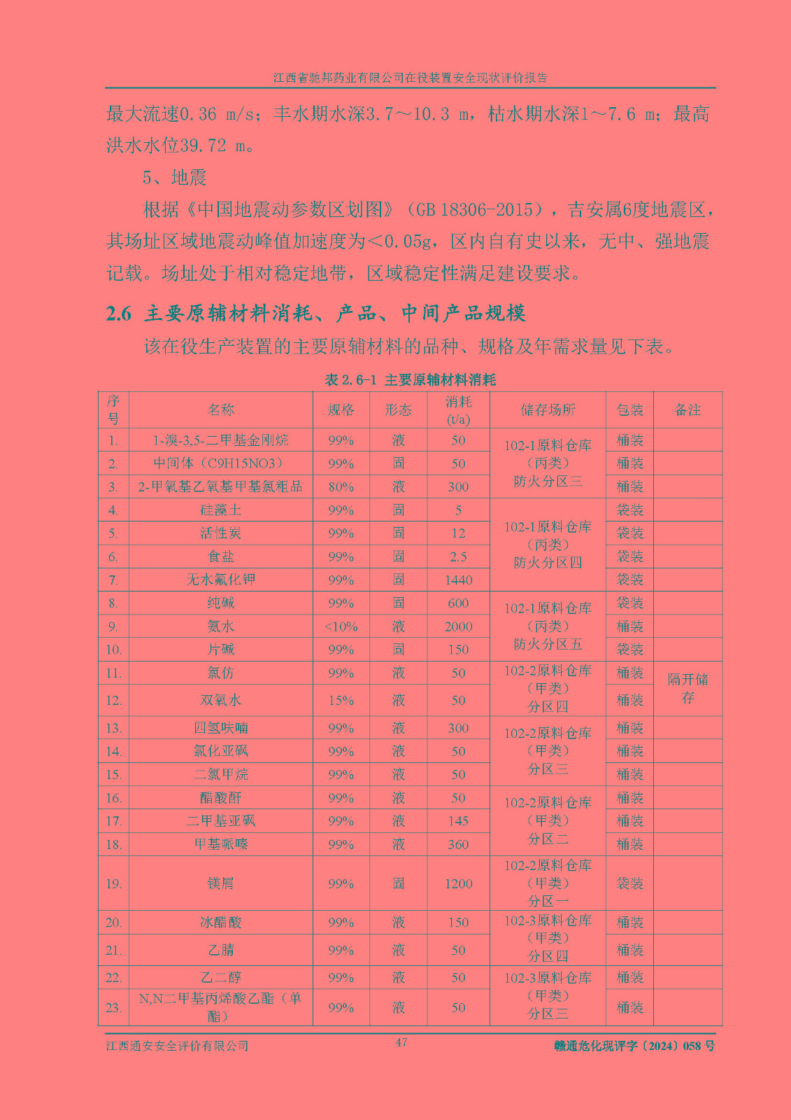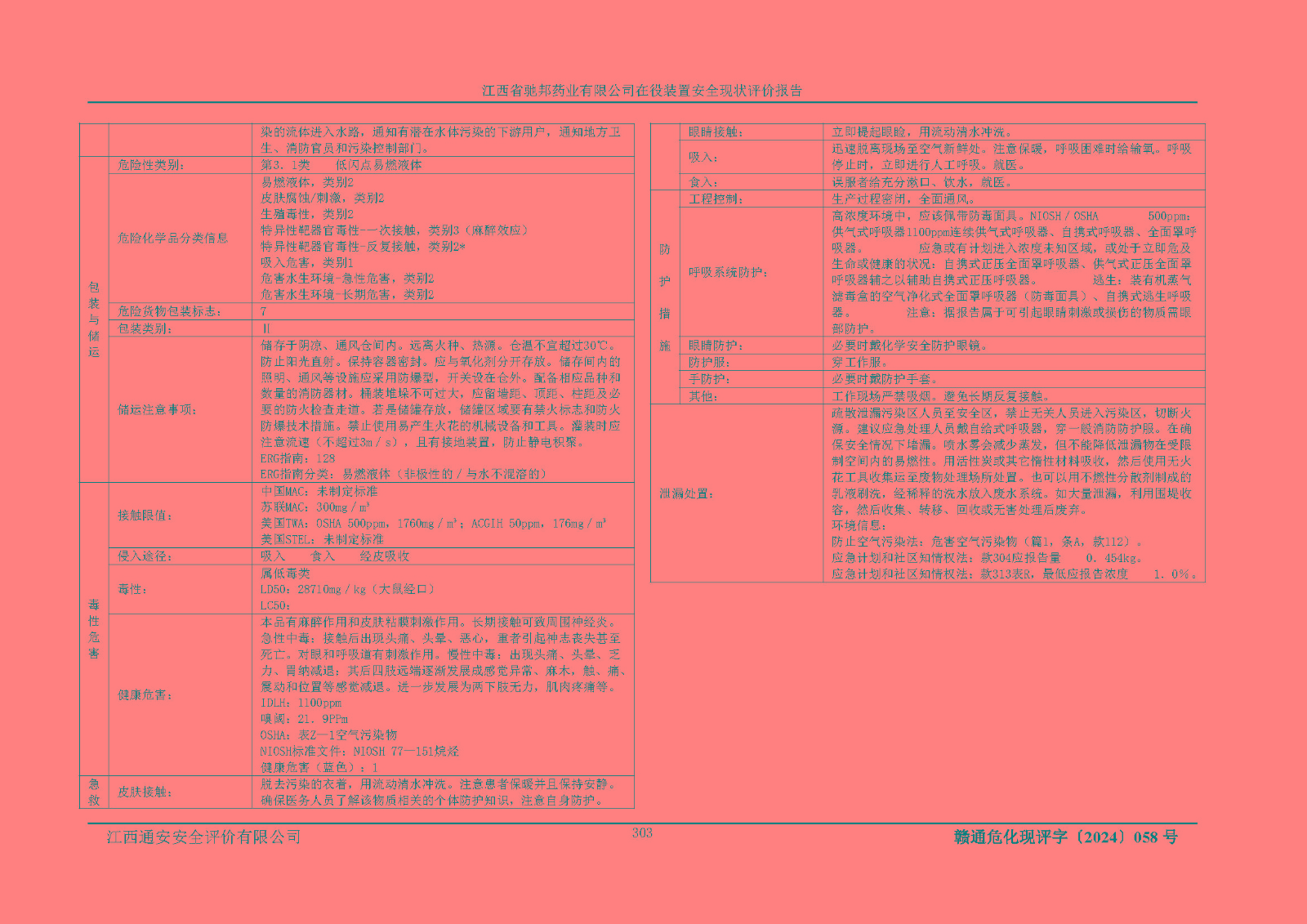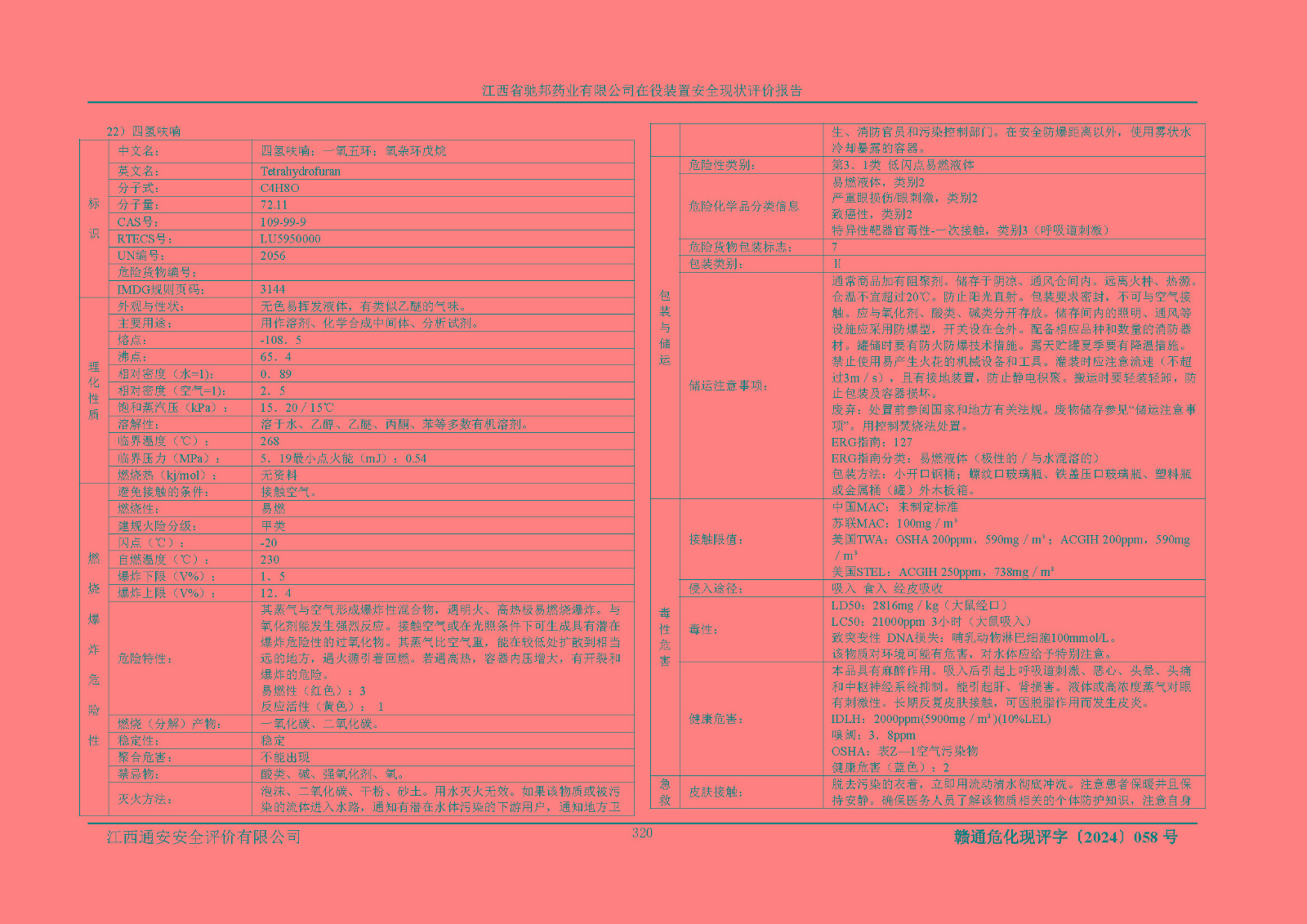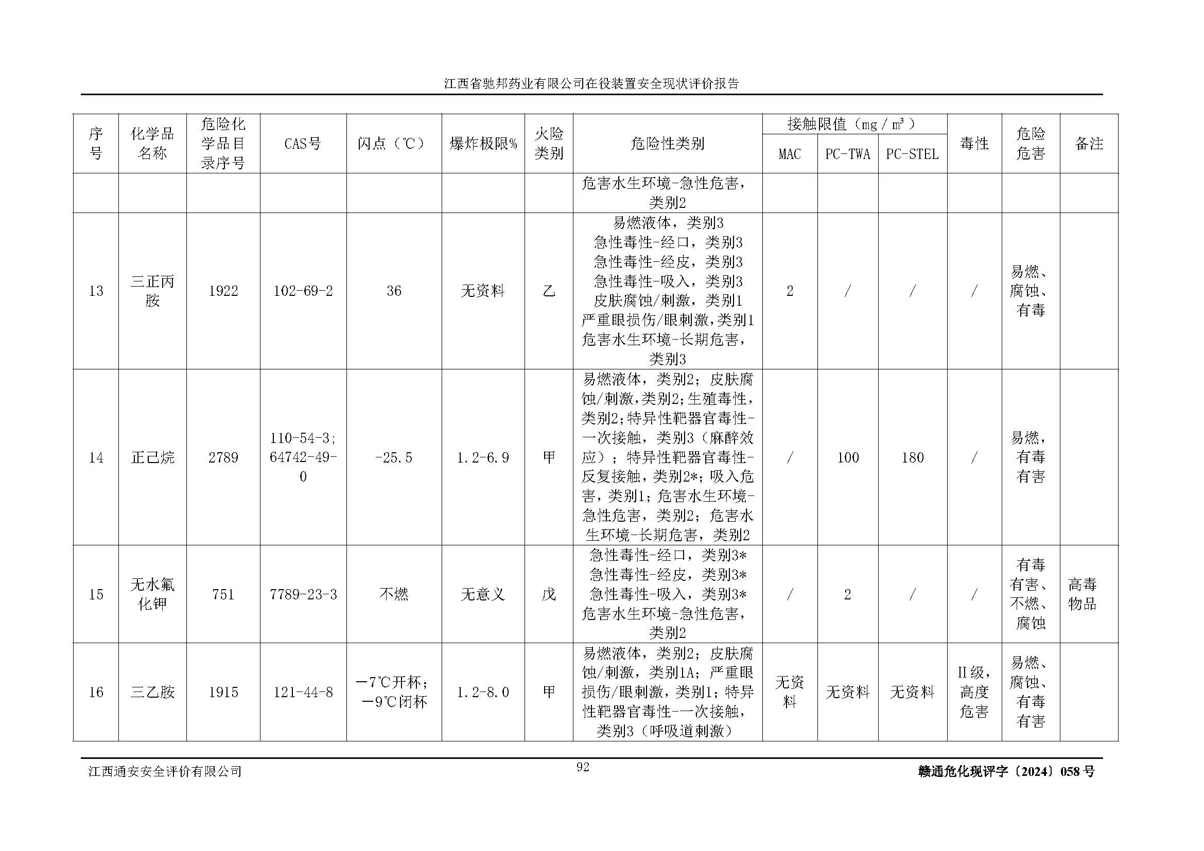 項(xiàng)目簡介 | 江西省馳邦藥業(yè)有限公司(以下簡稱“該公司”)成立于2007年9月21日,位于江西省吉安市峽江縣巴邱鎮(zhèn)何家坪,屬有限責(zé)任公司(自然人投資或控股),法定**人:徐小海,注冊資金:貳仟萬元整,經(jīng)營范圍:醫(yī)藥中間體生產(chǎn)銷售及進(jìn)出口業(yè)務(wù)(涉及前置許可的憑許可證經(jīng)營)。占地面積約149322.9㎡,現(xiàn)有人員194人。 2022年3月24日該公司進(jìn)行了延期換證,取得了新的《安全生產(chǎn)許可證》,許可證編號:(贛)WH安許證字〔2010〕573號,許可范圍:三苯基膦(3.3kt/a)、(左)氧氟環(huán)合酯(150t/a)、(左)氧氟沙星(100t/a)、(左)氧氟羧酸(150t/a)、鹽酸美金剛(5t/a)、(1S,4R)-cis-4-氨基-2-環(huán)戊烯-1-甲醇(10t/a,阿巴卡韋中間體)、2-甲氧基乙氧基甲基氯(200t/a,僅精制提純)、三苯基氧膦(500t/a)、2-羧乙基-5-甲基-2-己烯酸乙酯(20t/a),**期:2022年3月24日至2025年3月23日。 根據(jù)《危險(xiǎn)化學(xué)品目錄》(2015版)和應(yīng)急管理部 工業(yè)和信息化部 公安部 生態(tài)環(huán)境部 交通運(yùn)輸部 農(nóng)業(yè)農(nóng)村部 衛(wèi)生健康委 市場監(jiān)管總局 鐵路局 民航局公告2022年第8號《決定調(diào)整《危險(xiǎn)化學(xué)品目錄(2015版)》,將“1674柴油〔閉杯閃點(diǎn)≤60℃〕”調(diào)整為“1674柴油”》等文件規(guī)定,該在役生產(chǎn)裝置生產(chǎn)過程中涉及的四氫呋喃、甲苯、氯苯、三氯化磷、鎂屑、甲醇、硫酸、氫氧化鈉(片堿和液堿)、鹽酸、乙酸乙酯、乙醇、異戊醛、三正丙胺、正己烷、無水氟化鉀、三乙胺、冰醋酸、N,N-二甲基甲酰胺(DMF)、乙腈、氯仿、醋酸酐、雙氧水、二氯甲烷、氯化亞砜、三苯基膦(產(chǎn)品)、氮?dú)猓▔嚎s)、柴油(發(fā)電機(jī)、叉車用)等屬于危險(xiǎn)化學(xué)品。其中三氯甲烷、醋酸酐為第二類易制毒化學(xué)品,甲苯、硫酸、鹽酸為第三類易制毒化學(xué)品;甲醇、甲苯、三氯化磷、氯苯、乙酸乙酯、三氯甲烷屬于重點(diǎn)監(jiān)管的危險(xiǎn)化學(xué)品;甲醇、乙醇屬于特別管控危險(xiǎn)化學(xué)品;三氯化磷、氯化亞砜為第三類監(jiān)控化學(xué)品;1-溴-3,5-二甲基金剛烷、四氫呋喃、甲基哌嗪、氯仿、醋酸酐、異戊醛、丙二酸二乙酯、四氟苯甲酰氯(四氟)、三乙胺、二甲基亞砜、乙二醇、乙酸乙酯、乙醇、甲苯、甲醇為第四類監(jiān)控化學(xué)品;鎂屑、雙氧水屬于易制爆化學(xué)品;氟化鉀屬于高毒物品。 | |||