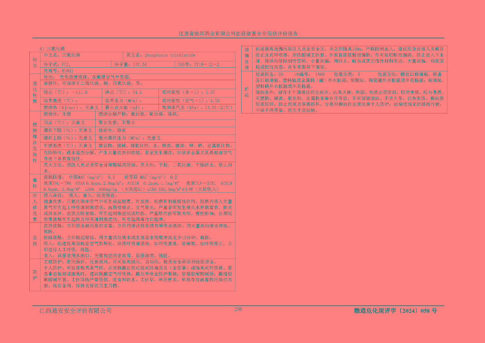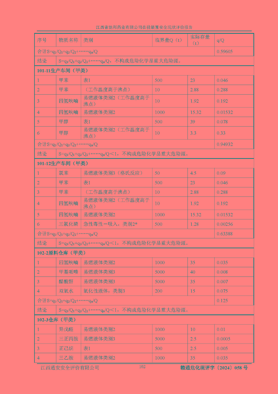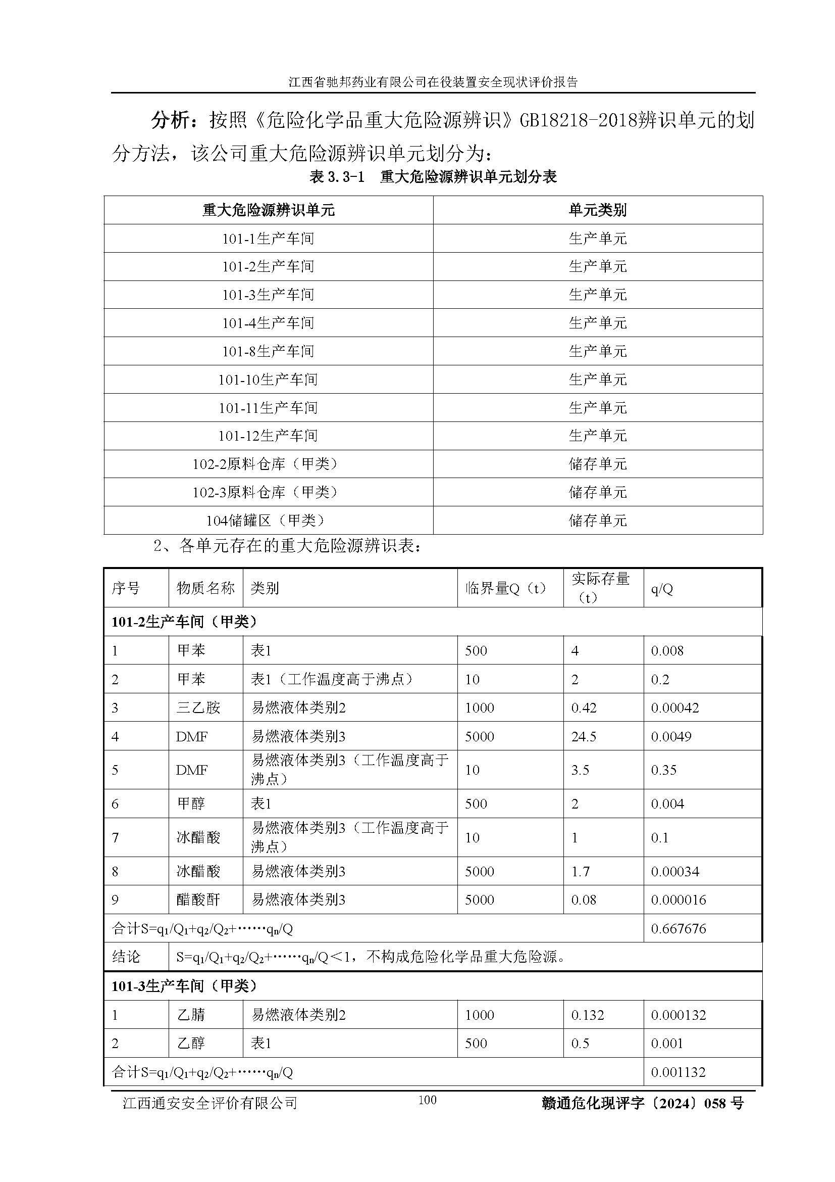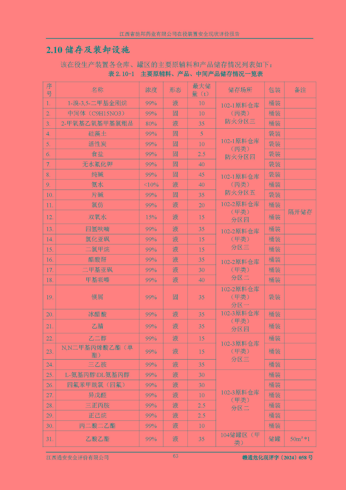 項(xiàng)目簡介 | 江西省馳邦藥業(yè)有限公司(以下簡稱“該公司”)成立于2007年9月21日,位于江西省吉安市峽江縣巴邱鎮(zhèn)何家坪,屬有限責(zé)任公司(自然人投資或控股),法定**人:徐小海,注冊資金:貳仟萬元整,經(jīng)營范圍:醫(yī)藥中間體生產(chǎn)銷售及進(jìn)出口業(yè)務(wù)(涉及前置許可的憑許可證經(jīng)營)。占地面積約149322.9㎡,現(xiàn)有人員194人。 2022年3月24日該公司進(jìn)行了延期換證,取得了新的《安全生產(chǎn)許可證》,許可證編號:(贛)WH安許證字〔2010〕573號,許可范圍:三苯基膦(3.3kt/a)、(左)氧氟環(huán)合酯(150t/a)、(左)氧氟沙星(100t/a)、(左)氧氟羧酸(150t/a)、鹽酸美金剛(5t/a)、(1S,4R)-cis-4-氨基-2-環(huán)戊烯-1-甲醇(10t/a,阿巴卡韋中間體)、2-甲氧基乙氧基甲基氯(200t/a,僅精制提純)、三苯基氧膦(500t/a)、2-羧乙基-5-甲基-2-己烯酸乙酯(20t/a),**期:2022年3月24日至2025年3月23日。 根據(jù)《危險(xiǎn)化學(xué)品目錄》(2015版)和應(yīng)急管理部 工業(yè)和信息化部 公安部 生態(tài)環(huán)境部 交通運(yùn)輸部 農(nóng)業(yè)農(nóng)村部 衛(wèi)生健康委 市場監(jiān)管總局 鐵路局 民航局公告2022年第8號《決定調(diào)整《危險(xiǎn)化學(xué)品目錄(2015版)》,將“1674柴油〔閉杯閃點(diǎn)≤60℃〕”調(diào)整為“1674柴油”》等文件規(guī)定,該在役生產(chǎn)裝置生產(chǎn)過程中涉及的四氫呋喃、甲苯、氯苯、三氯化磷、鎂屑、甲醇、硫酸、氫氧化鈉(片堿和液堿)、鹽酸、乙酸乙酯、乙醇、異戊醛、三正丙胺、正己烷、無水氟化鉀、三乙胺、冰醋酸、N,N-二甲基甲酰胺(DMF)、乙腈、氯仿、醋酸酐、雙氧水、二氯甲烷、氯化亞砜、三苯基膦(產(chǎn)品)、氮?dú)猓▔嚎s)、柴油(發(fā)電機(jī)、叉車用)等屬于危險(xiǎn)化學(xué)品。其中三氯甲烷、醋酸酐為第二類易制毒化學(xué)品,甲苯、硫酸、鹽酸為第三類易制毒化學(xué)品;甲醇、甲苯、三氯化磷、氯苯、乙酸乙酯、三氯甲烷屬于重點(diǎn)監(jiān)管的危險(xiǎn)化學(xué)品;甲醇、乙醇屬于特別管控危險(xiǎn)化學(xué)品;三氯化磷、氯化亞砜為第三類監(jiān)控化學(xué)品;1-溴-3,5-二甲基金剛烷、四氫呋喃、甲基哌嗪、氯仿、醋酸酐、異戊醛、丙二酸二乙酯、四氟苯甲酰氯(四氟)、三乙胺、二甲基亞砜、乙二醇、乙酸乙酯、乙醇、甲苯、甲醇為第四類監(jiān)控化學(xué)品;鎂屑、雙氧水屬于易制爆化學(xué)品;氟化鉀屬于高毒物品。 | |||