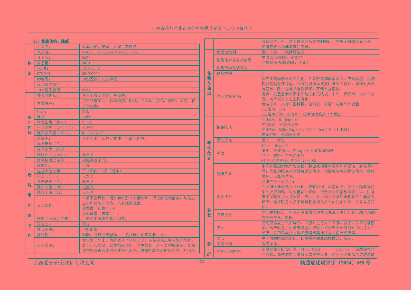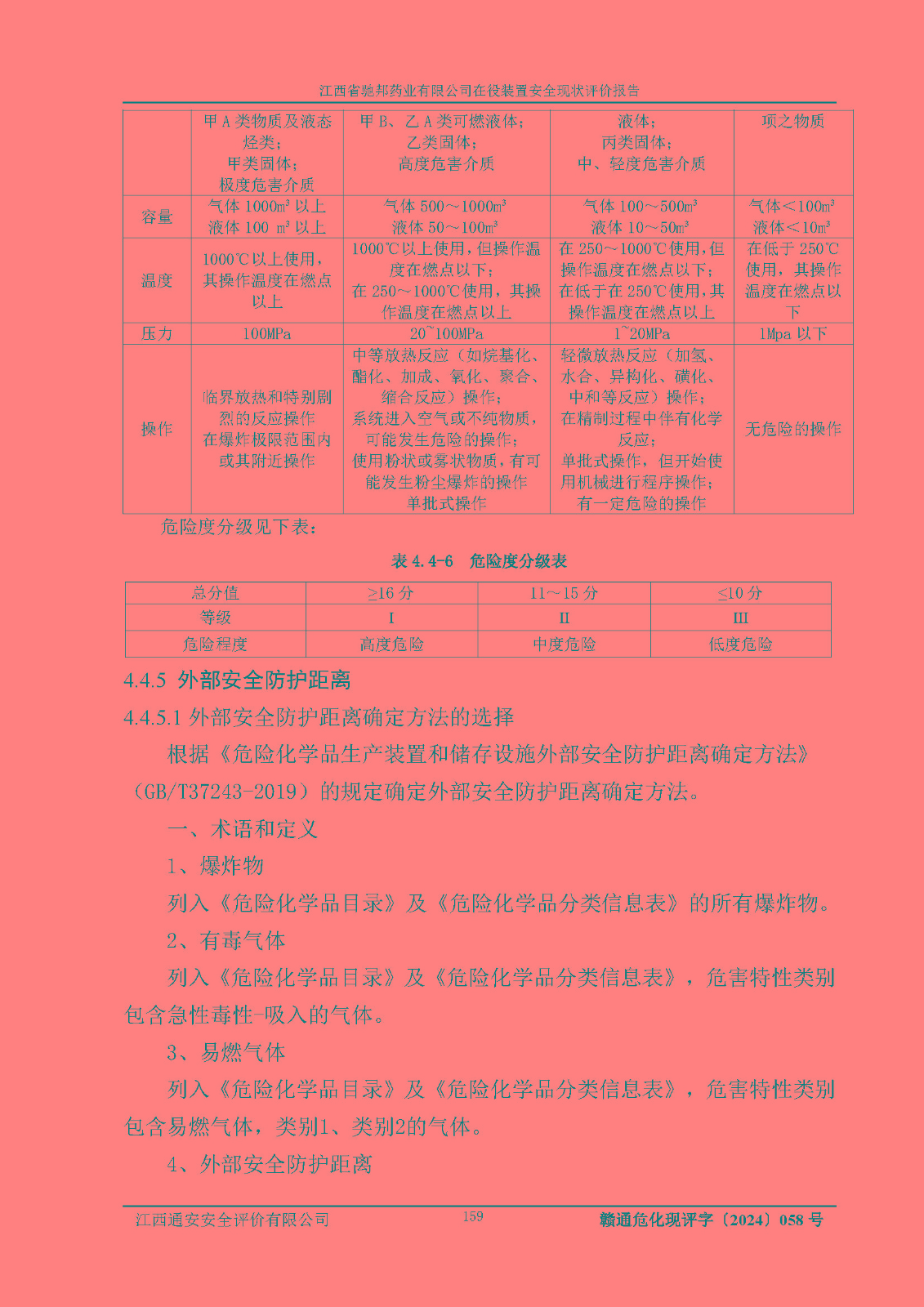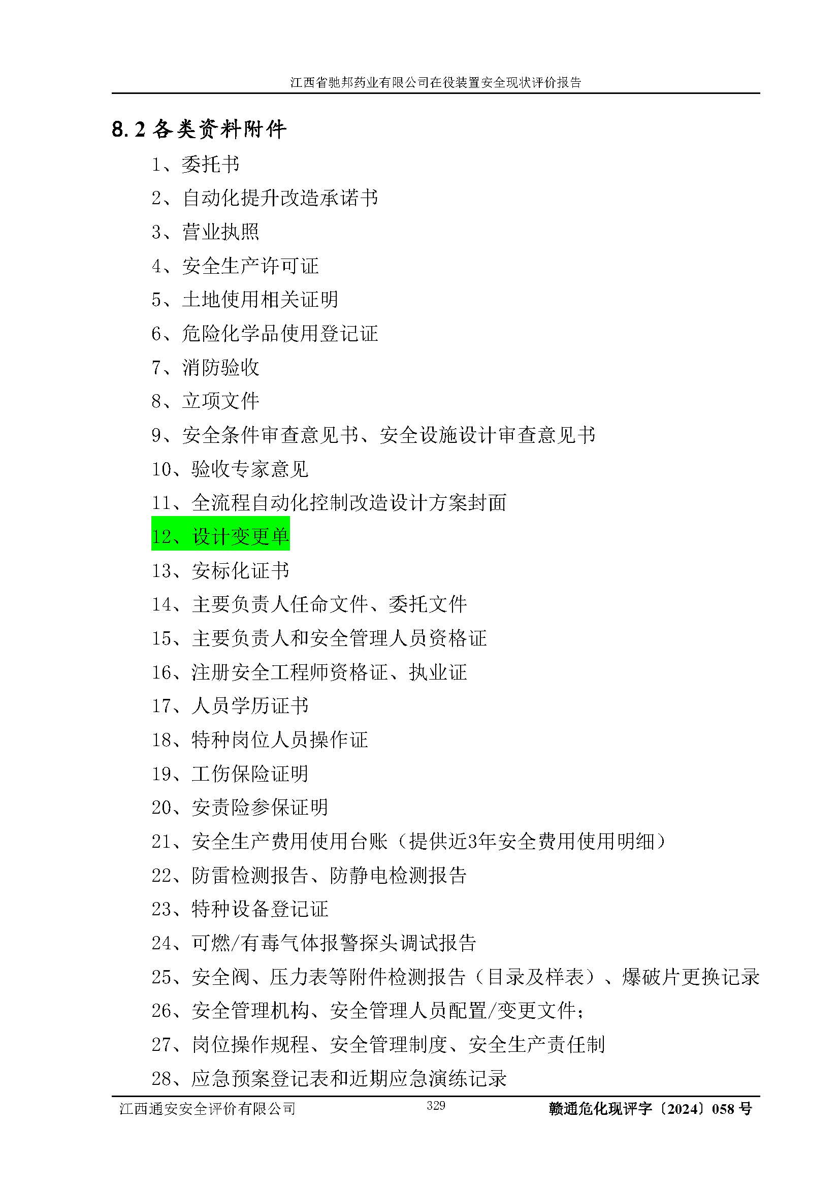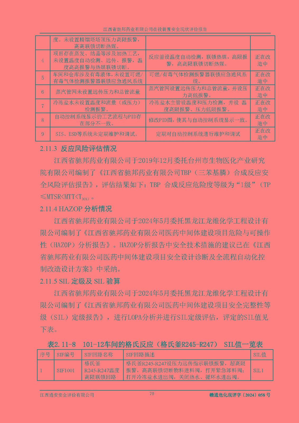 評價(jià)結(jié)論 | 評價(jià)結(jié)論:本報(bào)告認(rèn)為,江西省馳邦藥業(yè)有限公司在役裝置現(xiàn)場情況與原有安全設(shè)施設(shè)計(jì)圖紙一致,PLC系統(tǒng)、SIS系統(tǒng)滿足原有安全設(shè)施設(shè)計(jì)要求且運(yùn)行正常,有關(guān)從業(yè)人員資質(zhì)、安全設(shè)施及安全管理符合法律、法規(guī)、標(biāo)準(zhǔn)的要求,安全風(fēng)險(xiǎn)是可以控制的,其風(fēng)險(xiǎn)程度是可以接受的,安全設(shè)施符合安全生產(chǎn)條件,能夠滿足安全生產(chǎn)的要求。 | |||