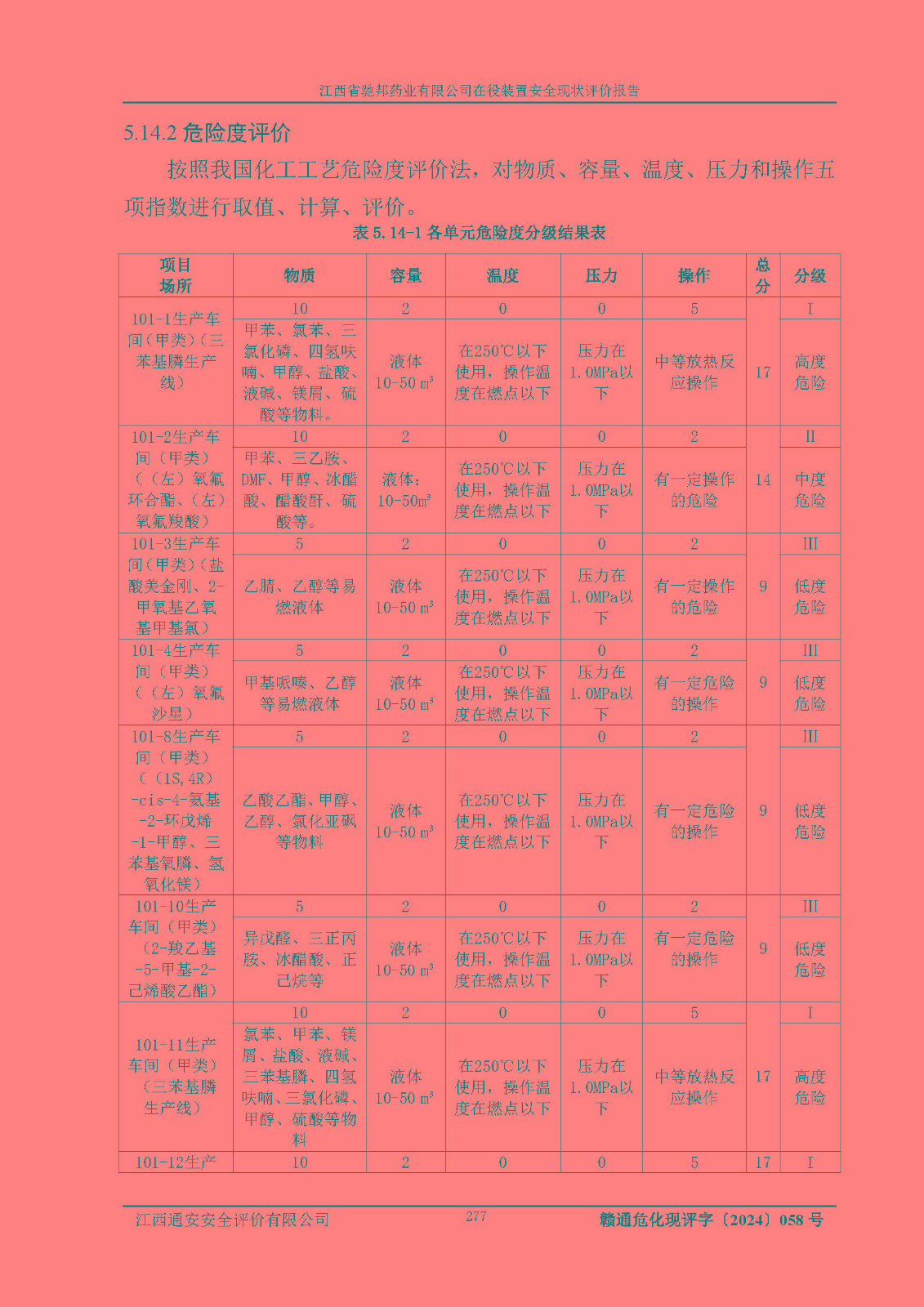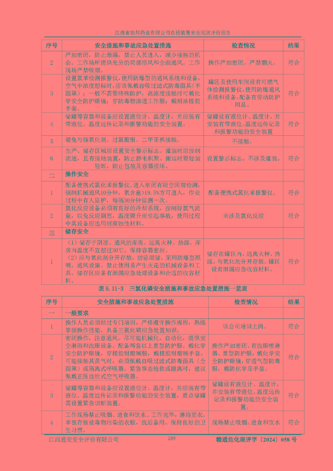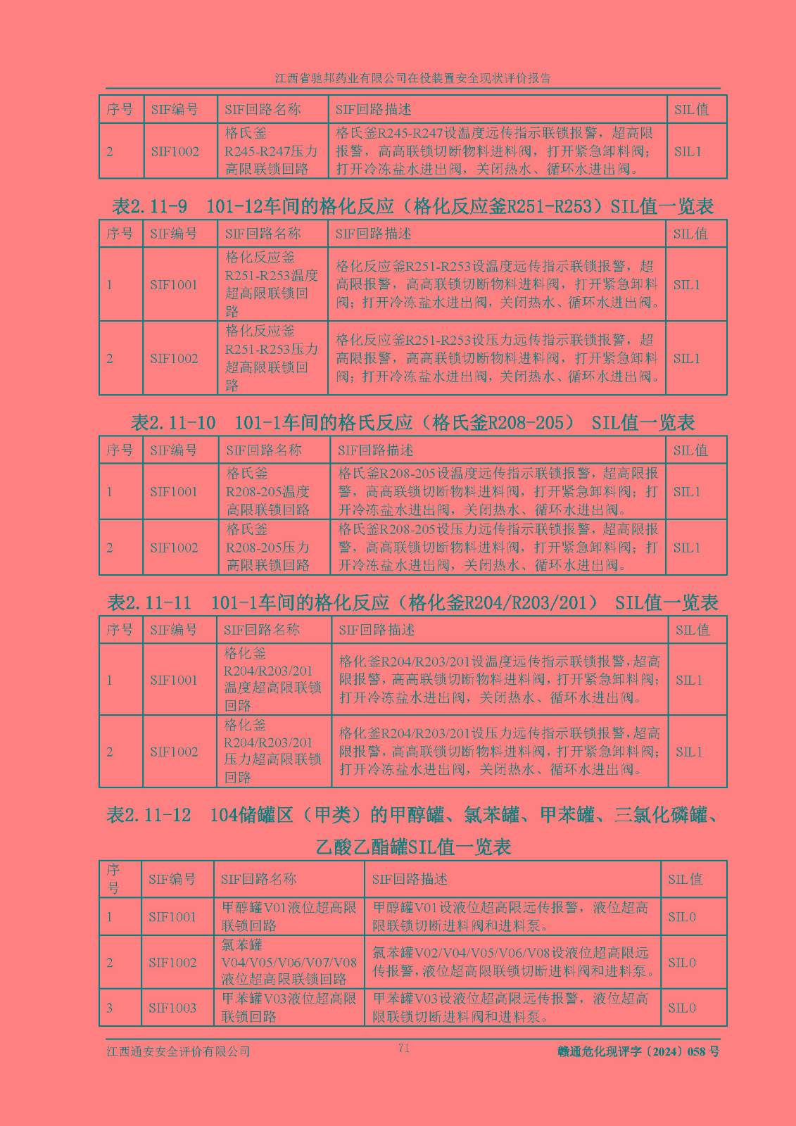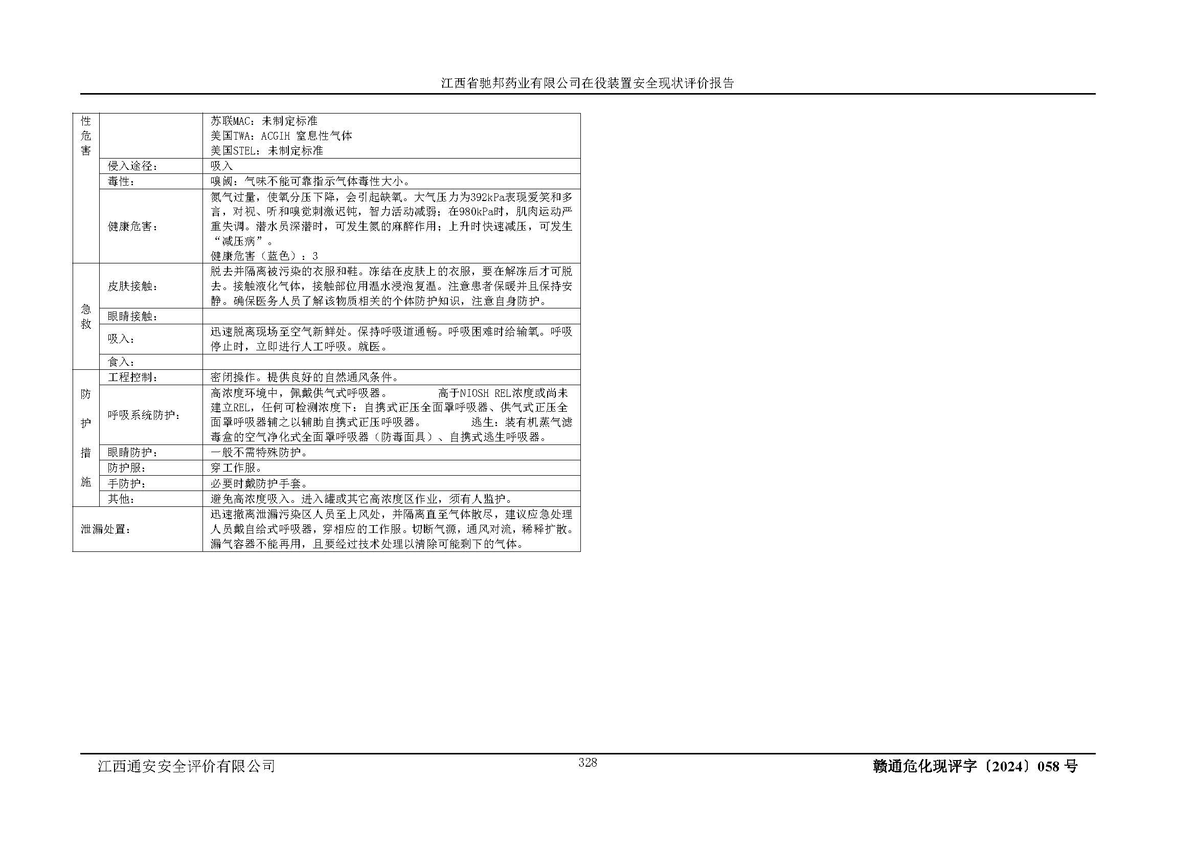 評價(jià)結(jié)論 | 評價(jià)結(jié)論:本報(bào)告認(rèn)為,江西省馳邦藥業(yè)有限公司在役裝置現(xiàn)場情況與原有安全設(shè)施設(shè)計(jì)圖紙一致,PLC系統(tǒng)、SIS系統(tǒng)滿足原有安全設(shè)施設(shè)計(jì)要求且運(yùn)行正常,有關(guān)從業(yè)人員資質(zhì)、安全設(shè)施及安全管理符合法律、法規(guī)、標(biāo)準(zhǔn)的要求,安全風(fēng)險(xiǎn)是可以控制的,其風(fēng)險(xiǎn)程度是可以接受的,安全設(shè)施符合安全生產(chǎn)條件,能夠滿足安全生產(chǎn)的要求。 | |||