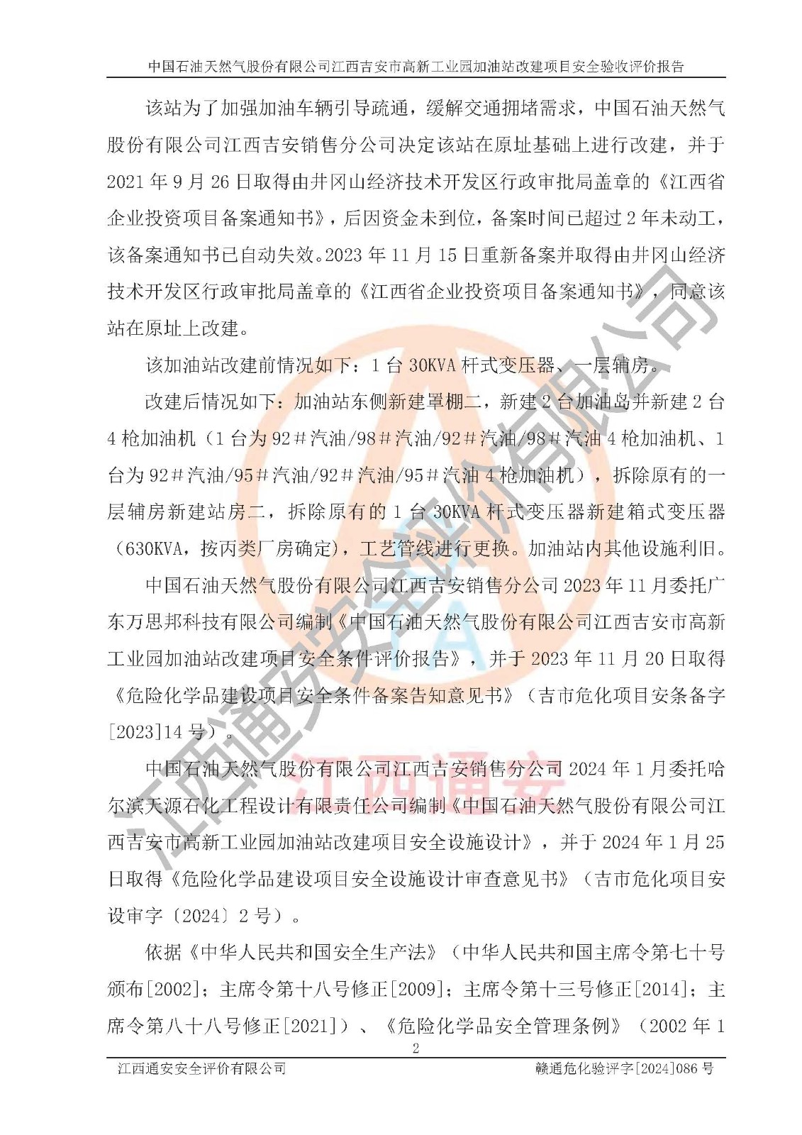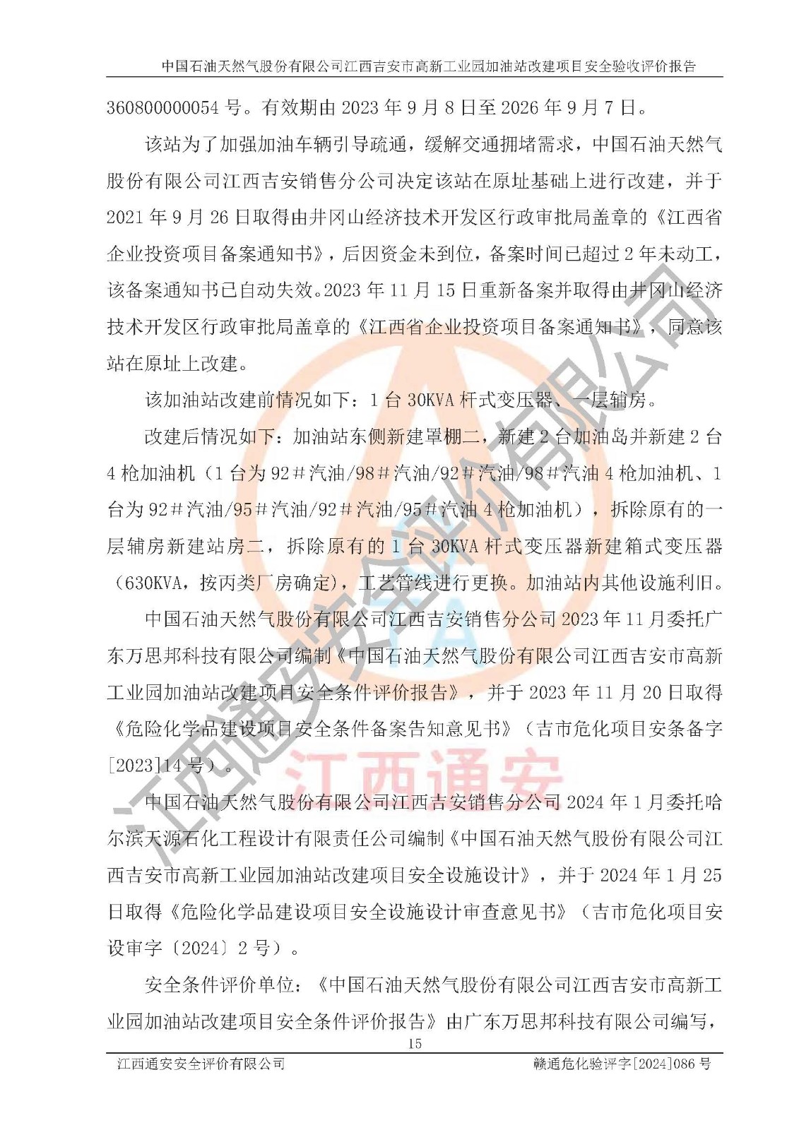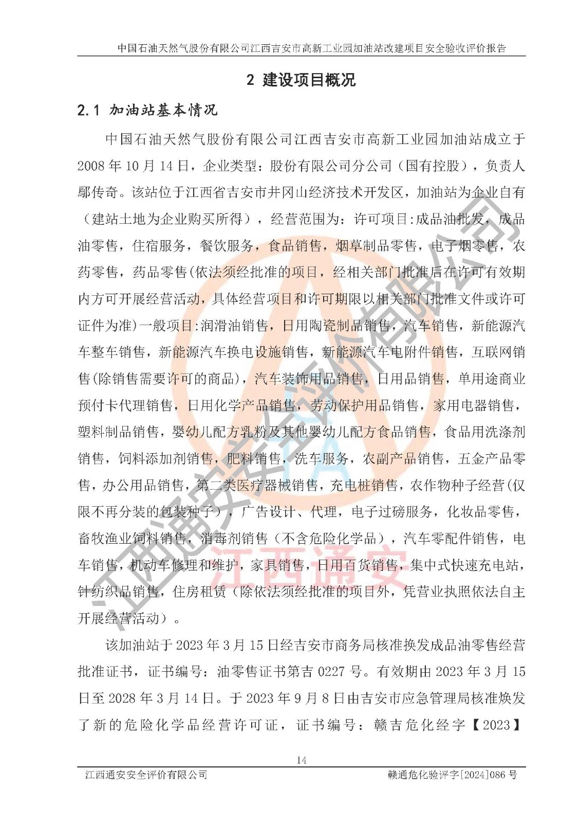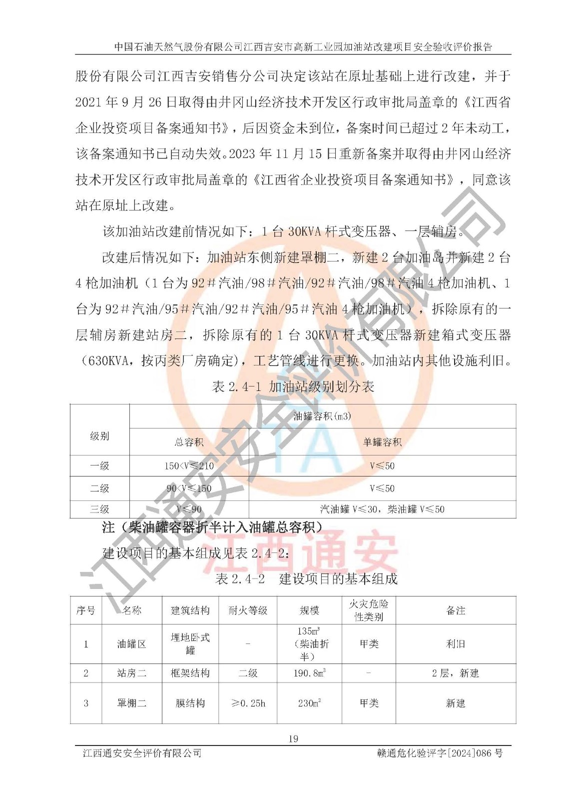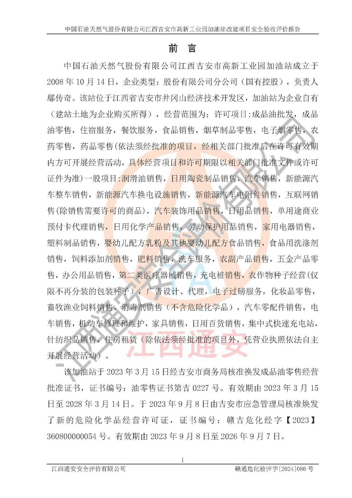 項目名稱 | 中國石油天然氣股份有限公司江西吉安市高新工業(yè)園加油站改建項目 安全驗收評價報告 | ||||