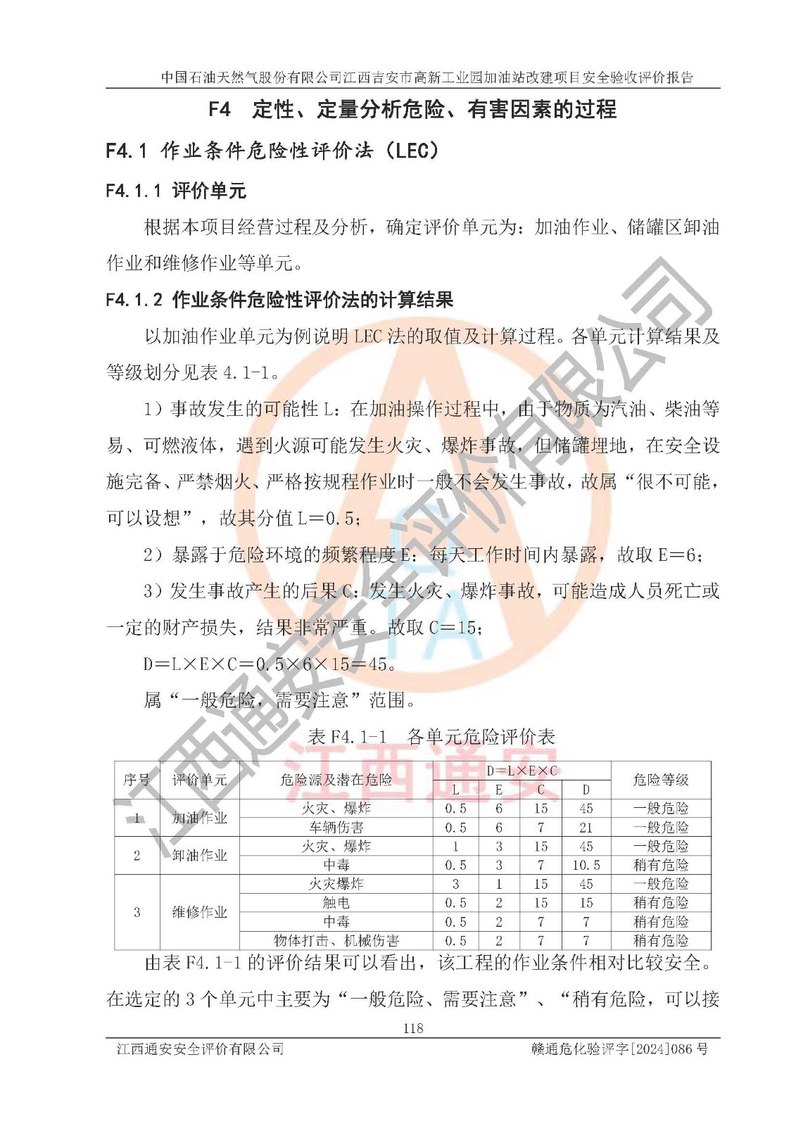 其它 | 在對該項目危險、有害因素辨識分析的基礎上,運用安全檢查表、預作業(yè)條件危險性分析法、危險度評價、重大事故后果分析結果等評價方法對該項目進行了分析評價,評價結果如下: 1、該項目位于江西省吉安市井岡山經(jīng)濟技術開發(fā)區(qū),符合當?shù)匾?guī)劃,與周邊環(huán)境的距離符合有關標準、規(guī)范的要求。 2、總圖布置分區(qū)明確,布局合理,各建構筑物的防火間距滿足規(guī)范要求。 3、該項目無**明令淘汰的工藝,設備、設施與工藝條件、內(nèi)部介質(zhì)相適應,特種設備及設施較齊全,按規(guī)定設置防雷、防靜電接地,爆炸危險環(huán)境加油機按要求采用防爆型,符合相關標準規(guī)范要求。 5、企業(yè)設置了安全生產(chǎn)管理機構,配備了專職安全生產(chǎn)管理人員,建立了安全生產(chǎn)責任制和安全生產(chǎn)管理制度,編制了崗位操作規(guī)程,編制了生產(chǎn)安全事故應急預案,人員經(jīng)過相應的培訓,企業(yè)的安全生產(chǎn)管理正常。 6、作業(yè)條件危險性評價結果:在選定的評價單元中,作業(yè)危險程度均為“一般危險,需要注意”,作業(yè)條件相對安全。 7、危險度評價結果:汽油儲罐的危險程度為**危險。其設置了當油料達到油罐容量90%時,觸動高液位報警裝置,油料達到油罐容量95%時,自動停止油料繼續(xù)進罐。同時,也采取了防止油品滲漏的保護措施,如采用雙層油罐,滲漏檢測在線檢測系統(tǒng),埋地加油管道采用雙層管道及雙層管道滲漏檢測系統(tǒng)等可以滿足安全生產(chǎn)條件要求。 評價結論: 中國石油天然氣股份有限公司江西吉安市高新工業(yè)園加油站工藝設備和安全設施運行正常,安全管理機制運行正常,安全設施、措施達到設計要求和預期結果,可以滿足建設項目安全生產(chǎn)的要求,安全生產(chǎn)管理**,項目具備危險化學品經(jīng)營單位安全經(jīng)營條件的要求。 | ||||