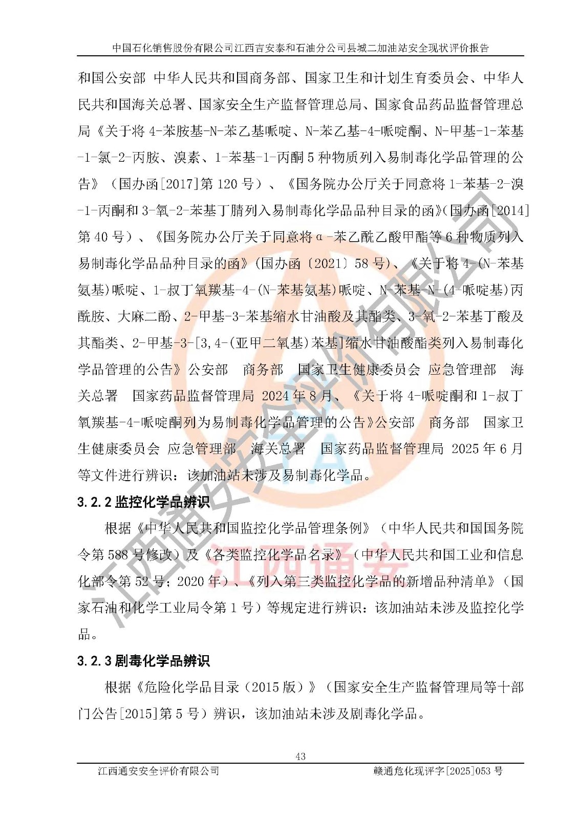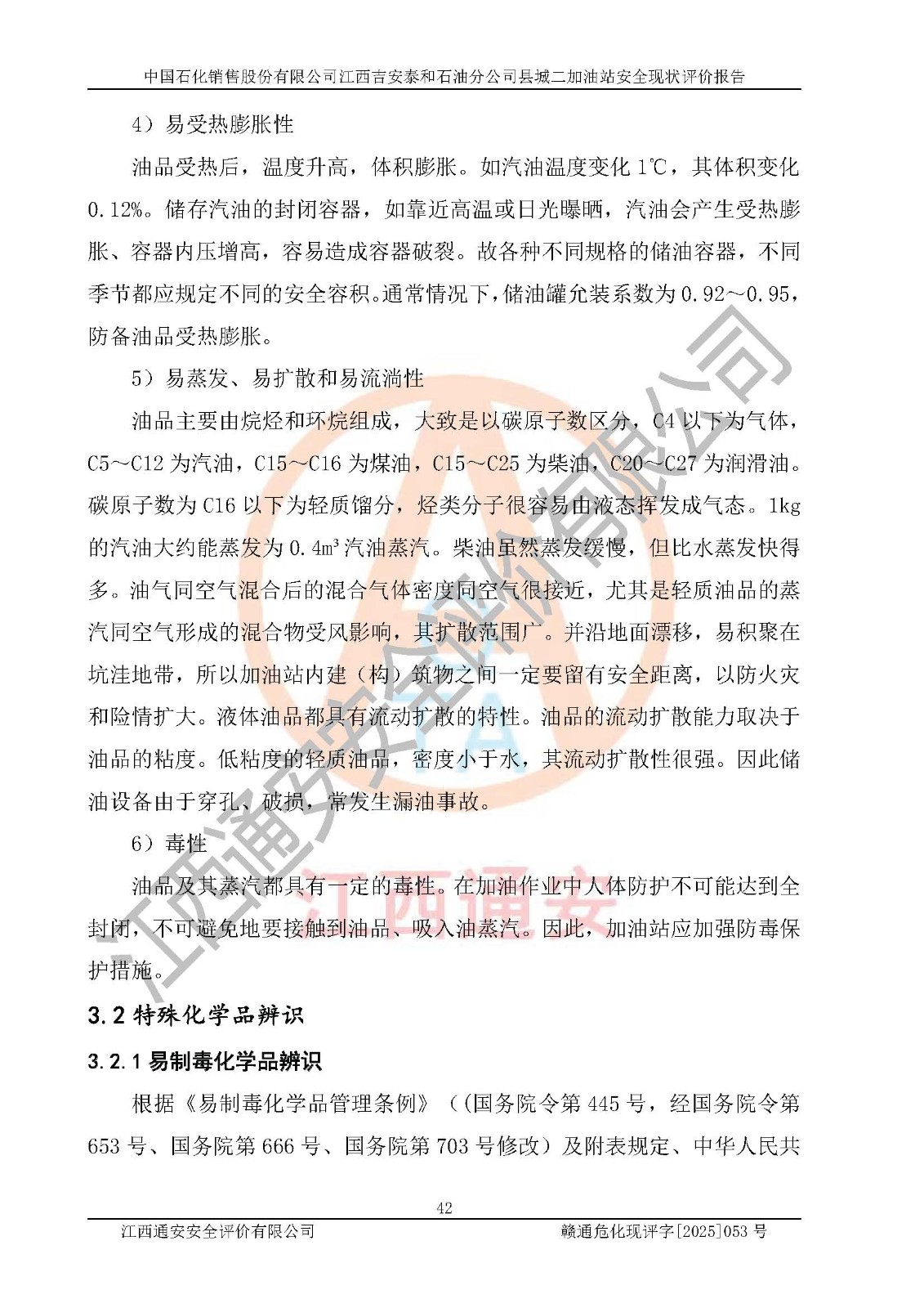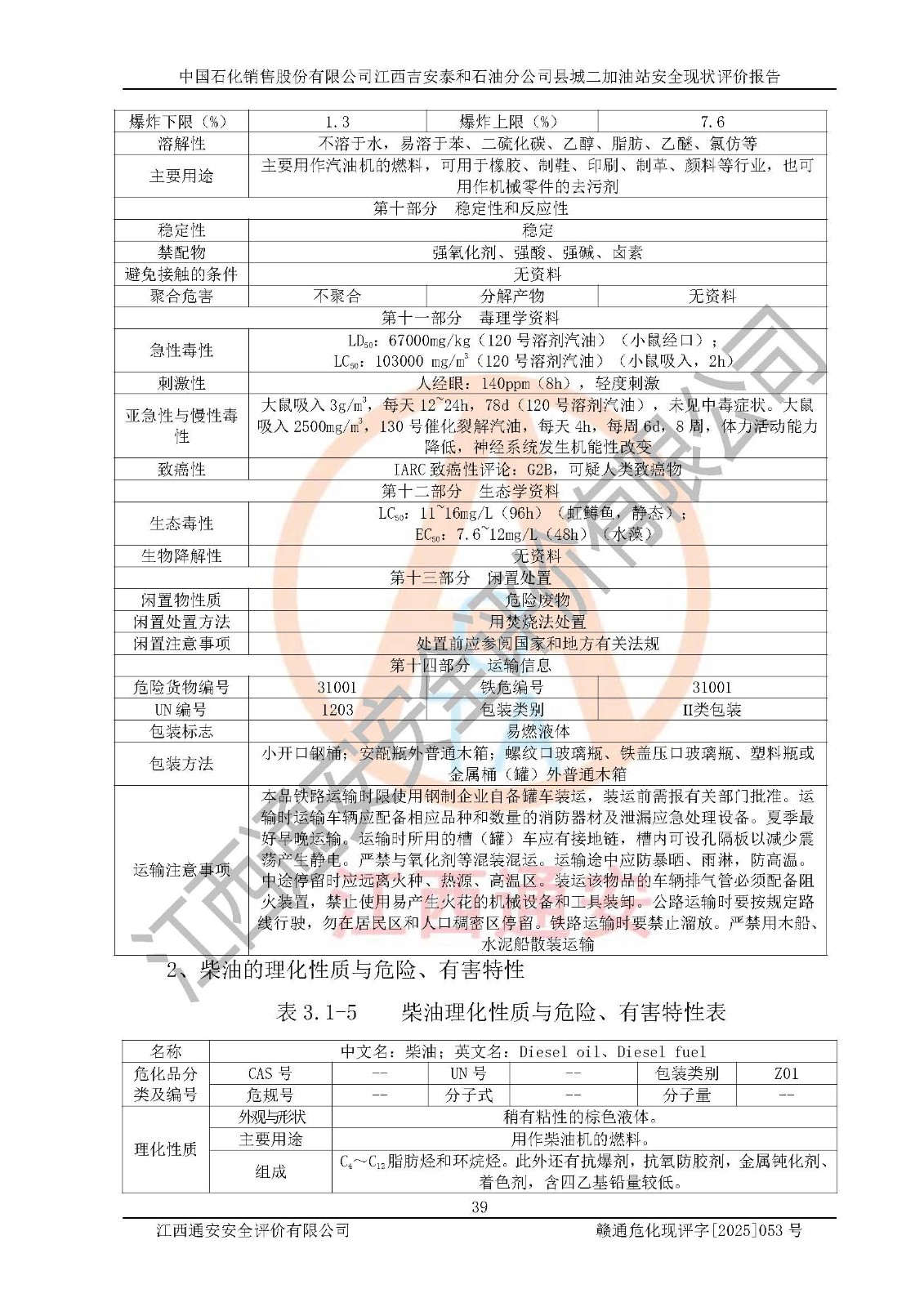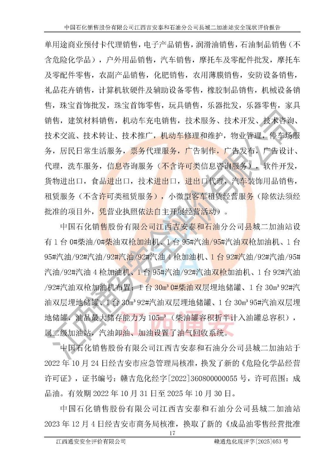 項(xiàng)目簡(jiǎn)介 | 中國(guó)石化銷售股份有限公司江西吉安泰和石油分公司縣城二加油站于2003年6月5日經(jīng)吉安市市場(chǎng)監(jiān)督管理局核準(zhǔn)注冊(cè)成立,營(yíng)業(yè)場(chǎng)所位于江西省吉安市泰和縣城白鳳大道。類型:外商投資企業(yè)分公司,投資人:周利平,營(yíng)業(yè)執(zhí)照統(tǒng)一社會(huì)信用代碼為:913608267670190730。營(yíng)業(yè)執(zhí)照核準(zhǔn)經(jīng)營(yíng)范圍:許可項(xiàng)目:危險(xiǎn)化學(xué)品經(jīng)營(yíng),成品油倉(cāng)儲(chǔ),成品油零售,成品油零售(不含危險(xiǎn)化學(xué)品),**類增值電信業(yè)務(wù),第二類增值電信業(yè)務(wù),第三類醫(yī)療器械經(jīng)營(yíng),出版物零售,**代理業(yè)務(wù),***零售,發(fā)電業(yè)務(wù)、輸電業(yè)務(wù)、供(配)電業(yè)務(wù),互聯(lián)網(wǎng)直播技術(shù)服務(wù),酒類經(jīng)營(yíng),食品銷售,小食雜,網(wǎng)絡(luò)文化經(jīng)營(yíng),藥品零售,燃?xì)饨?jīng)營(yíng),煙草制品零售,出版物批發(fā),旅游業(yè)務(wù),住宿服務(wù),餐飲服務(wù),港口經(jīng)營(yíng),保稅倉(cāng)庫(kù)經(jīng)營(yíng),保稅物流中心經(jīng)營(yíng)(依法須經(jīng)批準(zhǔn)的項(xiàng)目,經(jīng)相關(guān)部門(mén)批準(zhǔn)后在許可**期內(nèi)方可開(kāi)展經(jīng)營(yíng)活動(dòng),具體經(jīng)營(yíng)項(xiàng)目和許可期限以相關(guān)部門(mén)批準(zhǔn)文件或許可證件為準(zhǔn))一般項(xiàng)目:成品油批發(fā)(不含危險(xiǎn)化學(xué)品),成品油倉(cāng)儲(chǔ)(不含危險(xiǎn)化學(xué)品),辦公設(shè)備銷售,電池銷售,輪胎銷售,**類醫(yī)療器械銷售,第二類醫(yī)療器械銷售,低溫倉(cāng)儲(chǔ)(不含危險(xiǎn)化學(xué)品等需許可審批的項(xiàng)目),電動(dòng)自行車銷售,寵物食品及用品批發(fā),電動(dòng)汽車充電基礎(chǔ)設(shè)施運(yùn)營(yíng),非電力家用器具銷售,化妝品批發(fā),化妝品零售,個(gè)人衛(wèi)生用品銷售,會(huì)議及展覽服務(wù),金銀制品銷售,集中式**充電站,普通貨物倉(cāng)儲(chǔ)服務(wù)(不含危險(xiǎn)化學(xué)品等需許可審批的項(xiàng)目),人力資源服務(wù)(不含職業(yè)中介活動(dòng)、勞務(wù)派遣服務(wù)),食品互聯(lián)網(wǎng)銷售(僅銷售預(yù)包裝食品),食用農(nóng)產(chǎn)品零售,外賣遞送服務(wù),消毒劑銷售(不含危險(xiǎn)化學(xué)品),新能源汽車換電設(shè)施銷售,站用加氫及儲(chǔ)氫設(shè)施銷售,鐘表銷售,**化學(xué)產(chǎn)品銷售(不含危險(xiǎn)化學(xué)品),保健食品(預(yù)包裝)銷售,針紡織品銷售,服裝服飾零售,日用品銷售,五金產(chǎn)品零售,家用電器銷售,單用途商業(yè)預(yù)付卡代理銷售,電子產(chǎn)品銷售,潤(rùn)滑油銷售,石油制品銷售(不含危險(xiǎn)化學(xué)品),戶外用品銷售,汽車銷售,摩托車及零配件批發(fā),摩托車及零配件零售,農(nóng)副產(chǎn)品銷售,化肥銷售,農(nóng)用薄膜銷售,安防設(shè)備銷售,禮品花卉銷售,計(jì)算機(jī)軟硬件及輔助設(shè)備零售,橡膠制品銷售,機(jī)械設(shè)備銷售,珠寶首飾批發(fā),珠寶首飾零售,玩具銷售,樂(lè)器批發(fā),樂(lè)器零售,家具銷售,建筑材料銷售,機(jī)動(dòng)車充電銷售,技術(shù)服務(wù)、技術(shù)開(kāi)發(fā)、技術(shù)咨詢、技術(shù)交流、技術(shù)**、技術(shù)推廣,機(jī)動(dòng)車修理和維護(hù),物業(yè)管理,停車場(chǎng)服務(wù),居民日常生活服務(wù),票務(wù)代理服務(wù),廣告制作,廣告發(fā)布,廣告設(shè)計(jì)、代理,洗車服務(wù),信息咨詢服務(wù)(不含許可類信息咨詢服務(wù)),軟件開(kāi)發(fā),貨物進(jìn)出口,食品進(jìn)出口,技術(shù)進(jìn)出口,進(jìn)出口代理,汽車裝飾用品銷售,租賃服務(wù)(不含許可類租賃服務(wù)),小微型客車租賃經(jīng)營(yíng)服務(wù)(除依法須經(jīng)批準(zhǔn)的項(xiàng)目外,憑營(yíng)業(yè)執(zhí)照依法自主開(kāi)展經(jīng)營(yíng)活動(dòng))。 中國(guó)石化銷售股份有限公司江西吉安泰和石油分公司縣城二加油站設(shè)有1臺(tái)0#柴油/0#柴油雙槍加油機(jī)、1臺(tái)95#汽油/95#汽油雙槍加油機(jī)、1臺(tái)95#汽油/92#汽油/92#汽油/92#汽油4槍加油機(jī)、1臺(tái)92#汽油/92#汽油/95#汽油/92#汽油4槍加油機(jī)、1臺(tái)95#汽油/92#汽油雙槍加油機(jī)、1臺(tái)92#汽油/92#汽油雙槍加油機(jī)布置;1臺(tái)30m30#柴油雙層埋地儲(chǔ)罐、1臺(tái)30m392#汽油雙層埋地儲(chǔ)罐、1臺(tái)30m392#汽油雙層埋地儲(chǔ)罐、1臺(tái)30m395#汽油雙層埋地儲(chǔ)罐,油品*大儲(chǔ)存能力為105m3(柴油罐容積折半計(jì)入油罐總?cè)莘e),屬二級(jí)加油站,汽油卸油、加油設(shè)置了油氣回收系統(tǒng)。 中國(guó)石化銷售股份有限公司江西吉安泰和石油分公司縣城二加油站于2022年10月24日經(jīng)吉安市應(yīng)急管理局核準(zhǔn),換發(fā)了新的《危險(xiǎn)化學(xué)品經(jīng)營(yíng)許可證》,證書(shū)編號(hào):贛吉?;?/span>經(jīng)字[2022]360800000055號(hào),許可范圍:成品油。**期2022年10月31日至2025年10月30日。 中國(guó)石化銷售股份有限公司江西吉安泰和石油分公司縣城二加油站2023年12月4日經(jīng)吉安市商務(wù)局核準(zhǔn),換取了新的《成品油零售經(jīng)營(yíng)批準(zhǔn)證書(shū)》,證書(shū)編號(hào):油零售證書(shū)第吉0305號(hào)