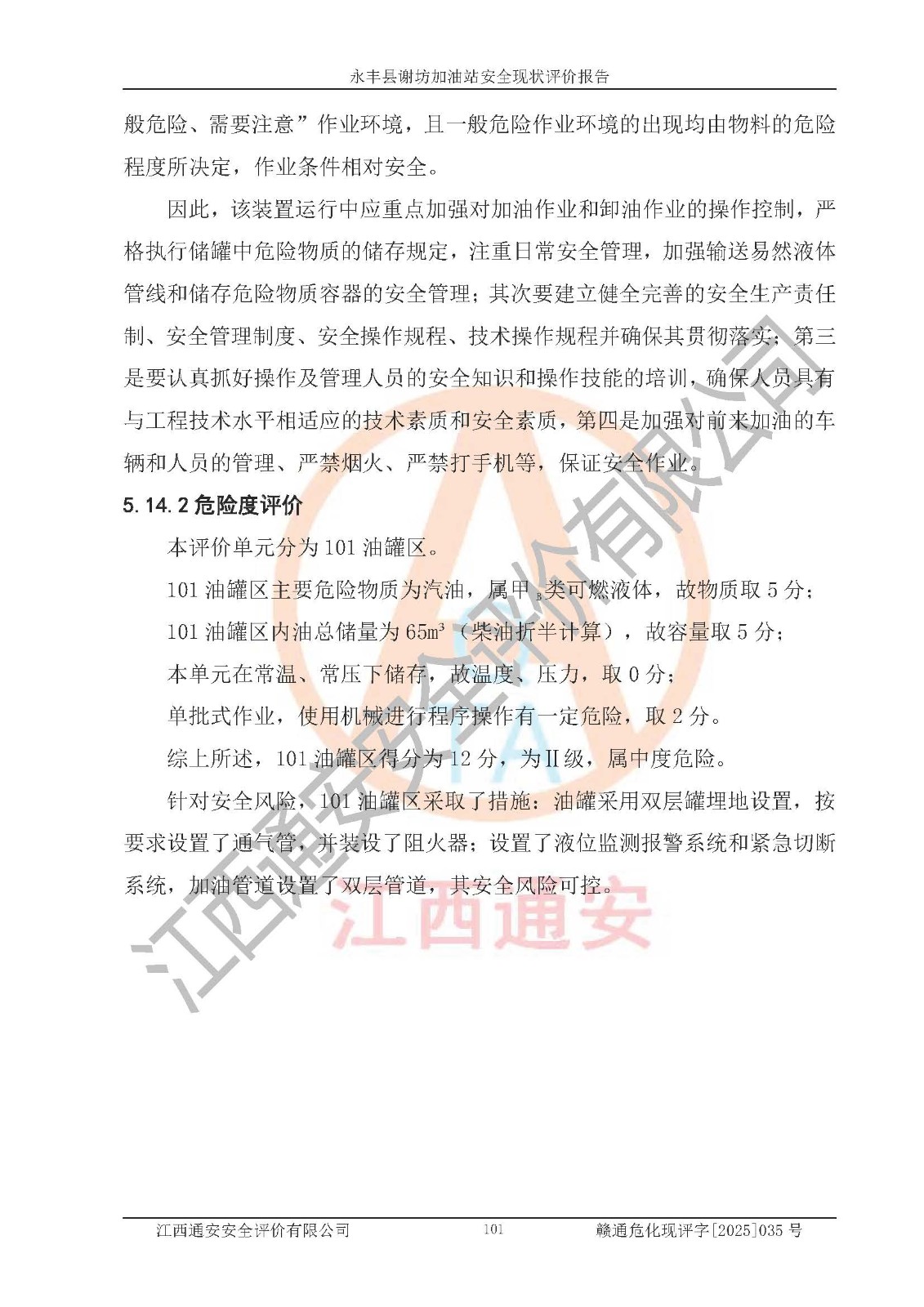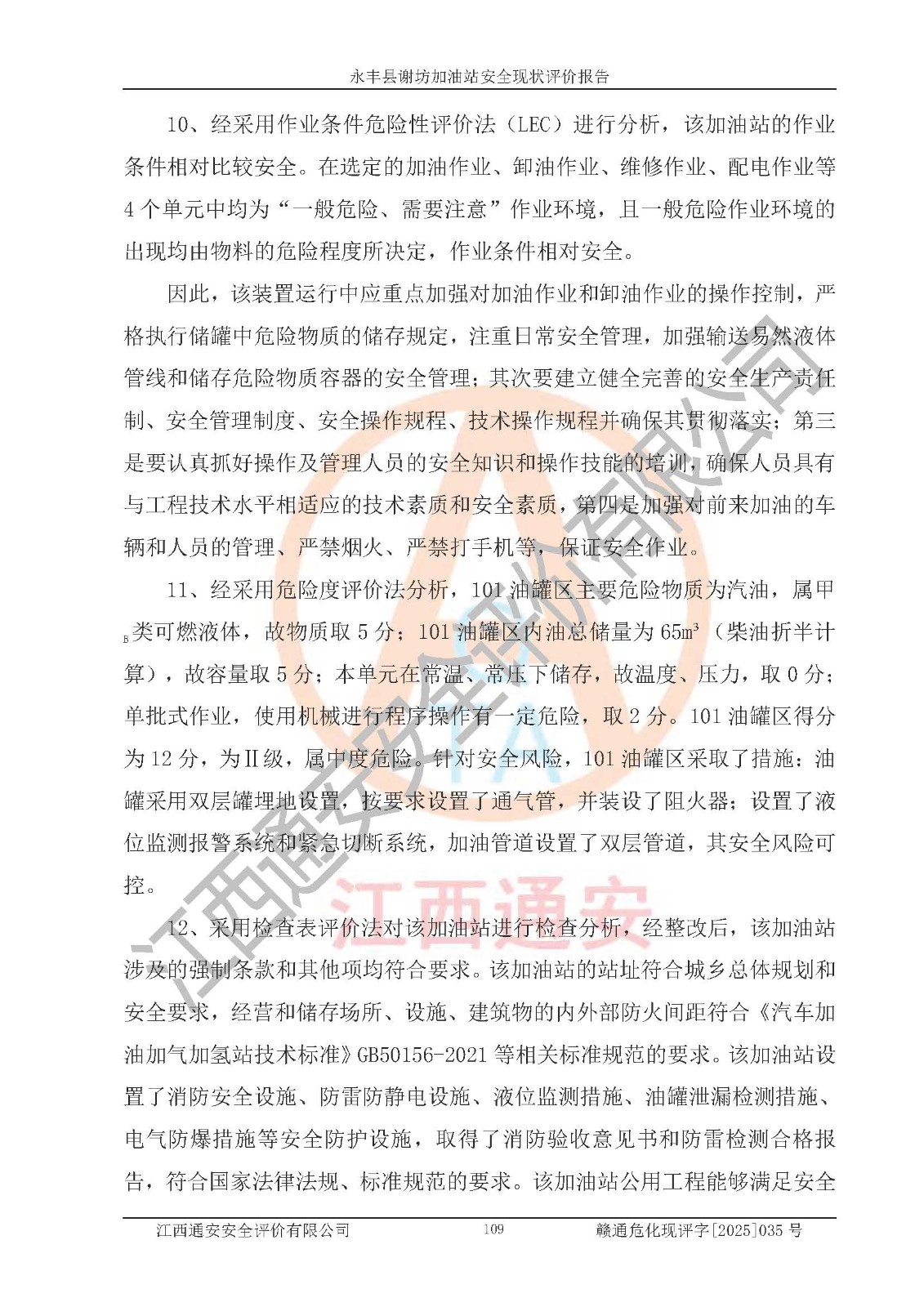 其它 | 在對該項(xiàng)目危險(xiǎn)、有害因素辨識分析的基礎(chǔ)上,運(yùn)用安全檢查表、預(yù)作業(yè)條件危險(xiǎn)性分析法、危險(xiǎn)度評價(jià)、重大事故后果分析結(jié)果等評價(jià)方法對該項(xiàng)目進(jìn)行了分析評價(jià),評價(jià)結(jié)果如下: 1、該項(xiàng)目位于江西省吉安市永豐縣陶唐鄉(xiāng)謝坊村,符合當(dāng)?shù)匾?guī)劃,與周邊環(huán)境的距離符合有關(guān)標(biāo)準(zhǔn)、規(guī)范的要求。 2、總圖布置分區(qū)明確,布局合理,各建構(gòu)筑物的防火間距滿足規(guī)范要求。 3、該項(xiàng)目無**明令淘汰的工藝,設(shè)備、設(shè)施與工藝條件、內(nèi)部介質(zhì)相適應(yīng),特種設(shè)備及設(shè)施較齊全,按規(guī)定設(shè)置防雷、防靜電接地,爆炸危險(xiǎn)環(huán)境加油機(jī)按要求采用防爆型,符合相關(guān)標(biāo)準(zhǔn)規(guī)范要求。 5、企業(yè)設(shè)置了安全生產(chǎn)管理機(jī)構(gòu),配備了專職安全生產(chǎn)管理人員,建立了安全生產(chǎn)責(zé)任制和安全生產(chǎn)管理制度,編制了崗位操作規(guī)程,編制了生產(chǎn)安全事故應(yīng)急預(yù)案,人員經(jīng)過相應(yīng)的培訓(xùn),企業(yè)的安全生產(chǎn)管理正常。 6、作業(yè)條件危險(xiǎn)性評價(jià)結(jié)果:在選定的評價(jià)單元中,作業(yè)危險(xiǎn)程度均為“一般危險(xiǎn),需要注意”,作業(yè)條件相對安全。 7、危險(xiǎn)度評價(jià)結(jié)果:汽油儲罐的危險(xiǎn)程度為中度危險(xiǎn)。油罐采用雙層罐埋地設(shè)置,按要求設(shè)置了通氣管,并裝設(shè)了阻火器;設(shè)置了液位監(jiān)測報(bào)警系統(tǒng)和緊急切斷系統(tǒng),加油管道設(shè)置了雙層管道,其安全風(fēng)險(xiǎn)可控。 評價(jià)結(jié)論: 永豐縣謝坊加油站工藝設(shè)備和安全設(shè)施運(yùn)行正常,安全管理機(jī)制運(yùn)行正常,安全設(shè)施、措施達(dá)到設(shè)計(jì)要求和預(yù)期結(jié)果,可以滿足建設(shè)項(xiàng)目安全生產(chǎn)的要求,安全生產(chǎn)管理**,項(xiàng)目具備危險(xiǎn)化學(xué)品經(jīng)營單位安全經(jīng)營條件的要求。 | ||||
