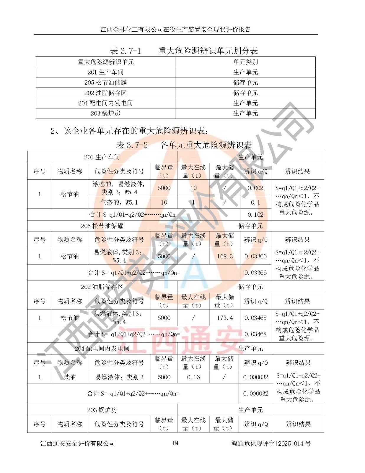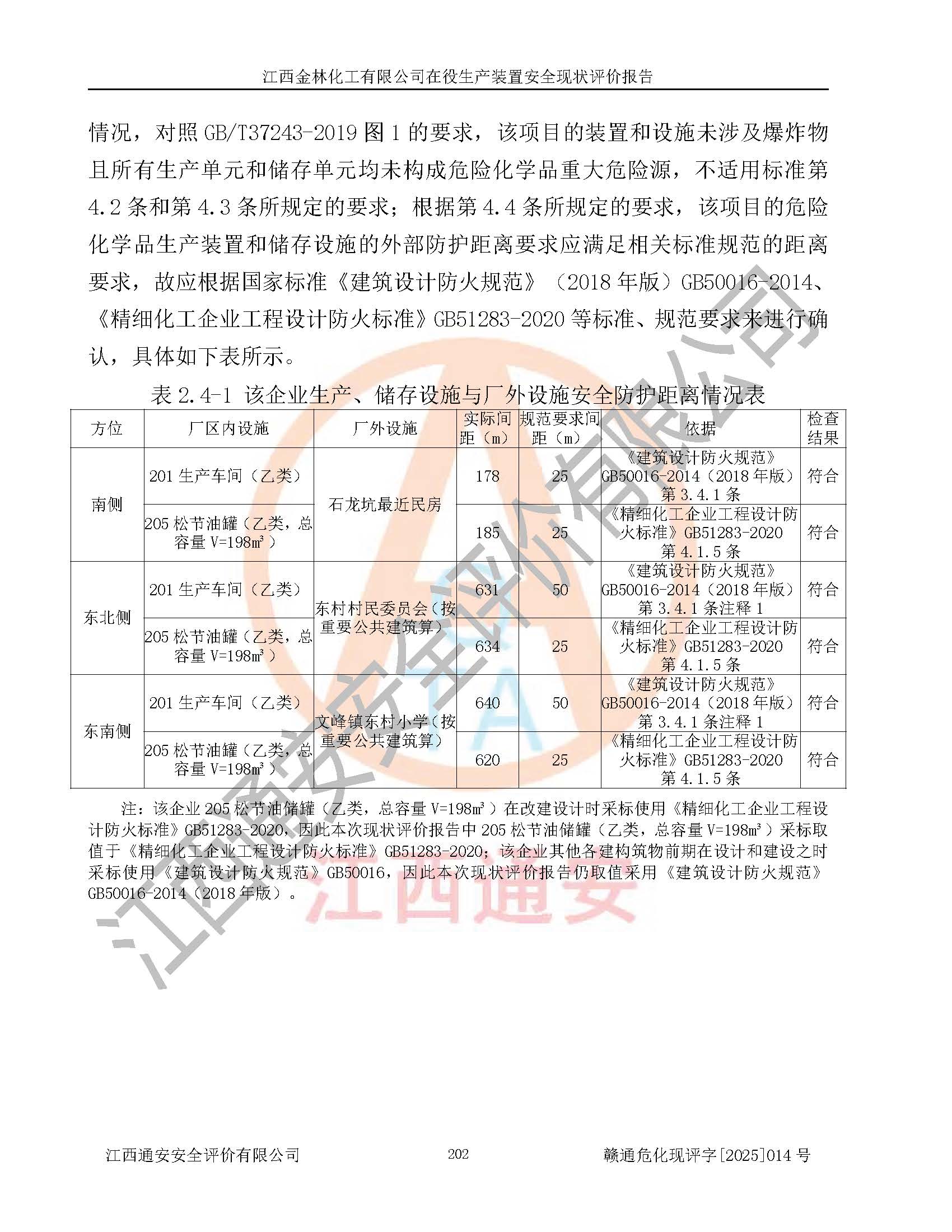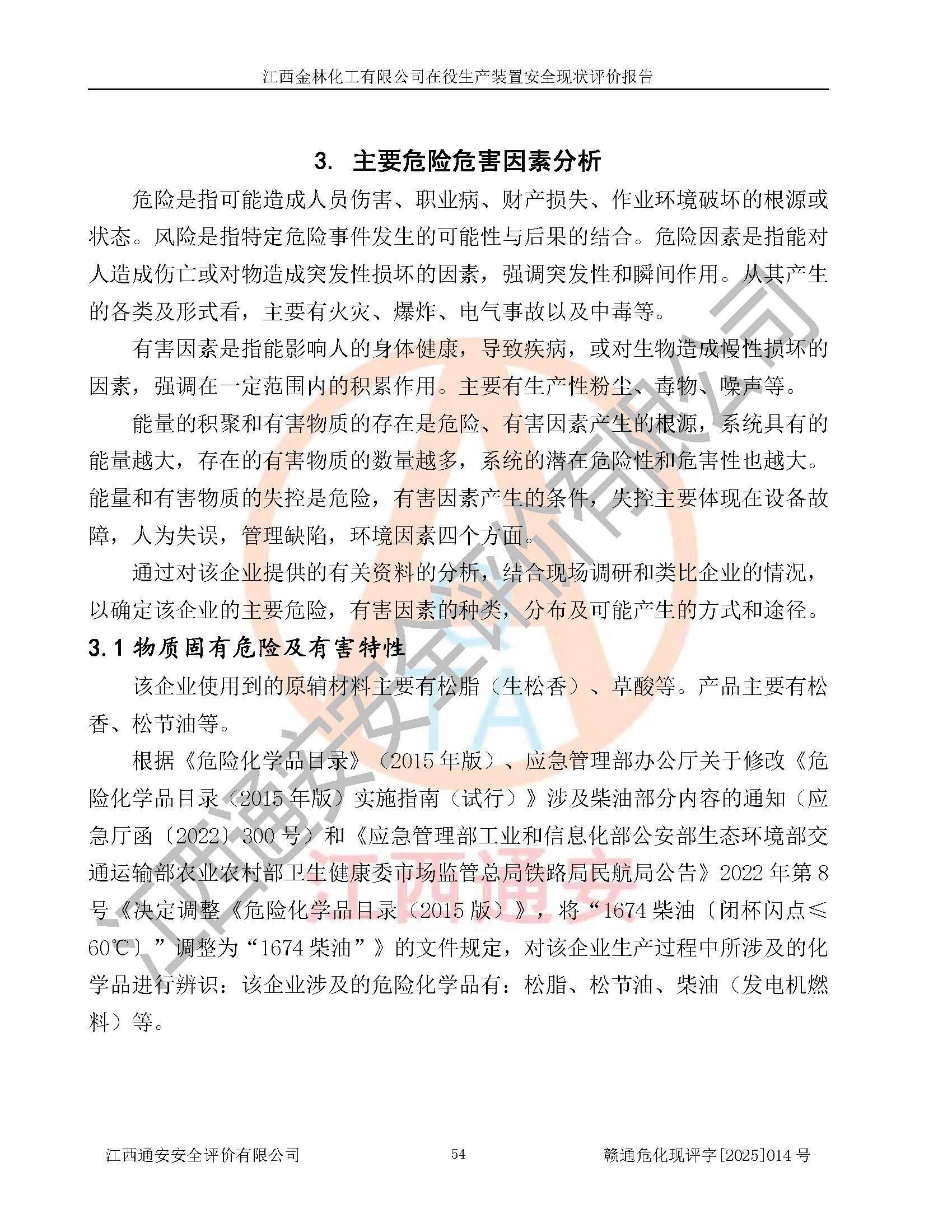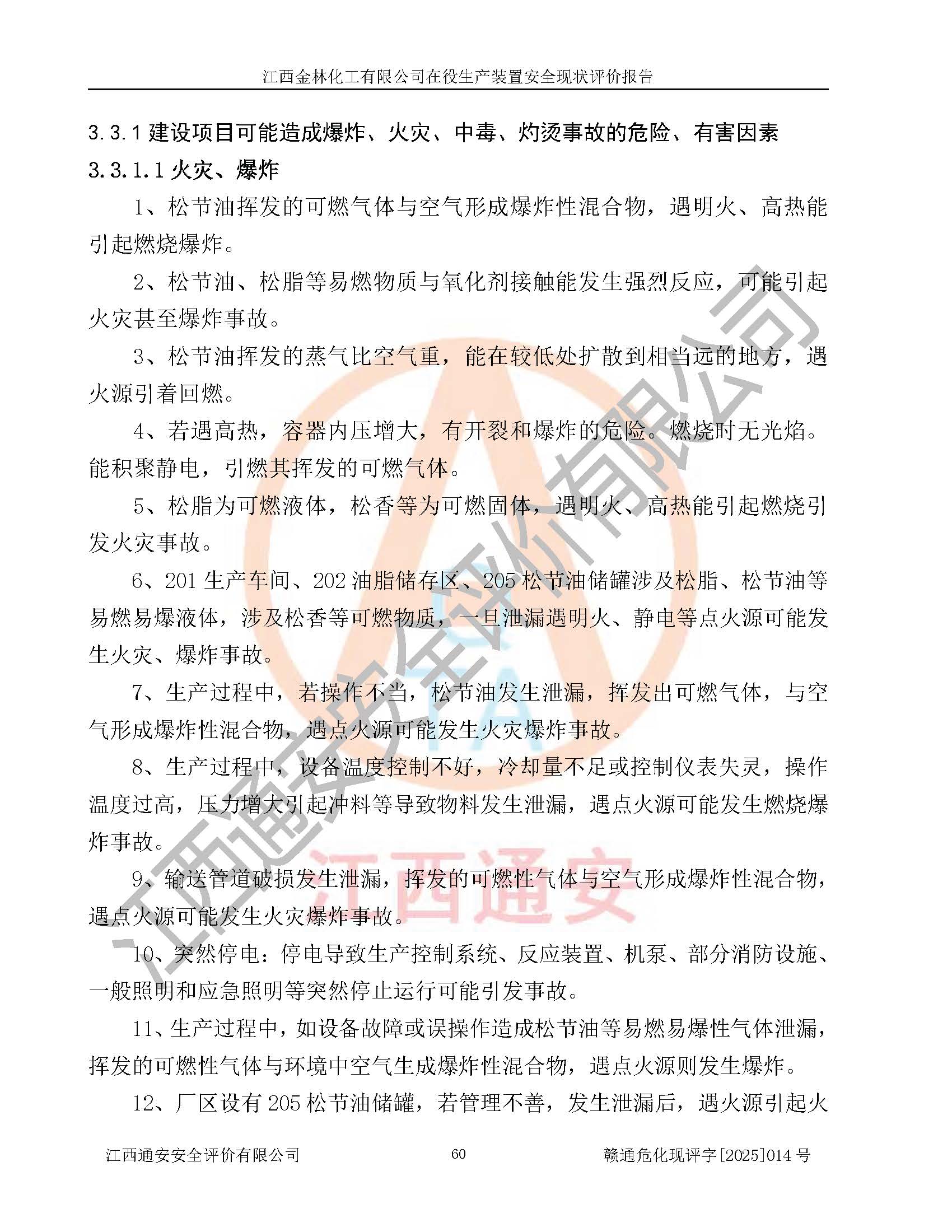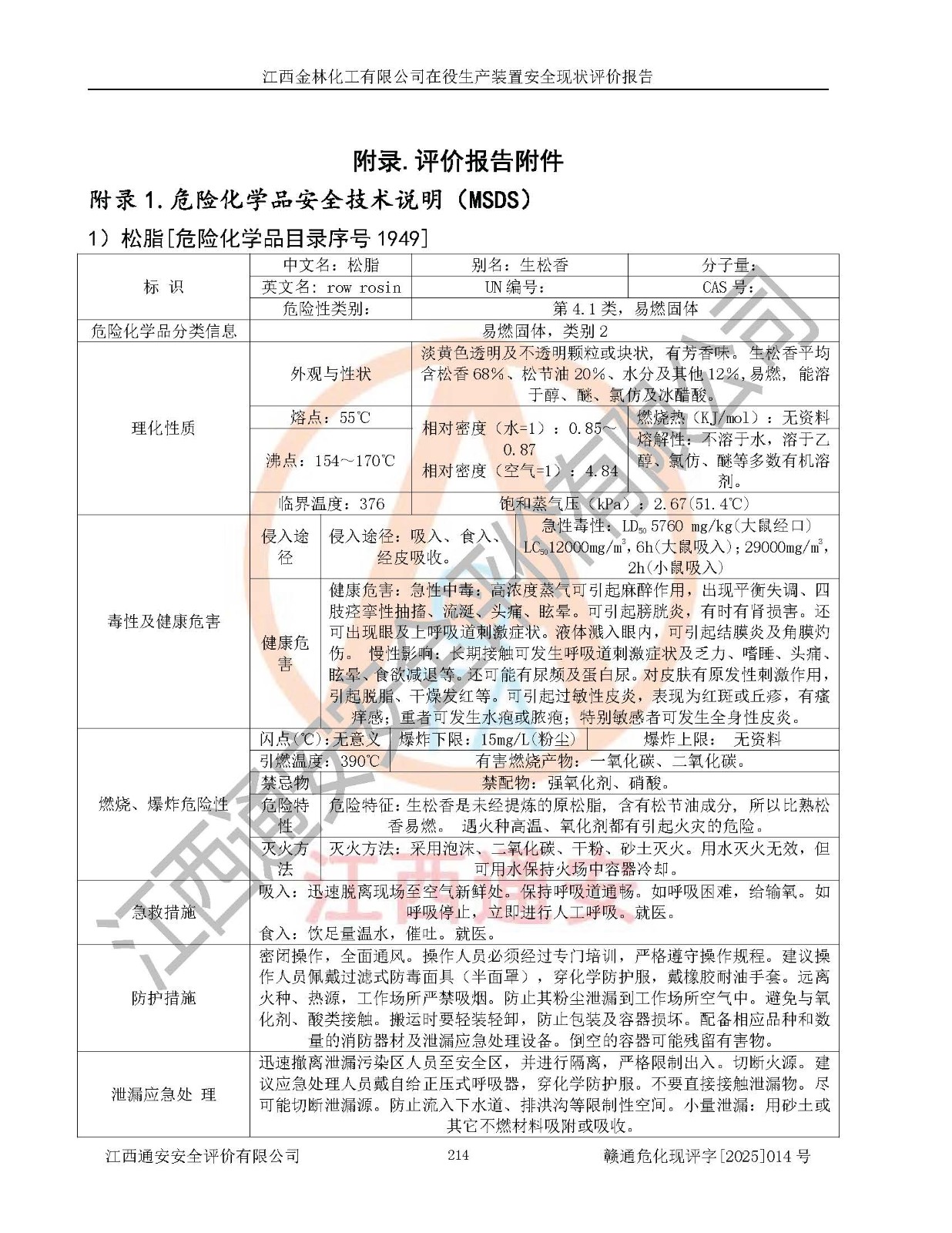 項目簡介 | 江西金林化工有限公司成立于2003年6月26日,并取得吉水縣市場監(jiān)督管理局頒發(fā)的《營業(yè)執(zhí)照》,營業(yè)執(zhí)照統(tǒng)一社會信用代碼:91360822748530538B。公司注冊住所:江西省吉安市吉水縣文峰工業(yè)城。法定**人:湯光耀,注冊資本:貳仟零壹拾玖萬元整。企業(yè)類型:有限責(zé)任公司(自然人投資或控股)。經(jīng)營范圍包括生產(chǎn)、銷售松節(jié)油、松香、林產(chǎn)化工產(chǎn)品、其它化工產(chǎn)品(含苯酚、甲醛)、橡膠產(chǎn)品、(憑化學(xué)危險品經(jīng)營許可證及消防安全檢查意見書經(jīng)營)、機械配件、紙張銷售。 江西金林化工有限公司于2022年8月23日進行了安全生產(chǎn)許可證換證,取得江西省應(yīng)急管理廳頒發(fā)的《安全生產(chǎn)許可證》,許可證編號為:(贛)WH安許證字[2005]0118號,許可范圍:松節(jié)油(2kt/a),**期2022年8月23日至2025年8月22日。 江西金林化工有限公司在役生產(chǎn)裝置為年產(chǎn)10000噸松香、2000噸松節(jié)油項目及其配套公用、輔助設(shè)施,主要產(chǎn)品有松香和松節(jié)油。 根據(jù)《危險化學(xué)品目錄》(2015年版)、應(yīng)急管理部辦公廳關(guān)于修改《危險化學(xué)品目錄(2015年版)實施指南(試行)》涉及柴油部分內(nèi)容的通知(應(yīng)急廳函〔2022〕300號)和《應(yīng)急管理部工業(yè)和信息化部公安部生態(tài)環(huán)境部交通運輸部農(nóng)業(yè)農(nóng)村部衛(wèi)生健康委市場監(jiān)管總局鐵路局民航局公告》2022年第8號《決定調(diào)整《危險化學(xué)品目錄(2015版)》,將“1674柴油〔閉杯閃點≤60℃〕”調(diào)整為“1674柴油”》的文件規(guī)定,對該企業(yè)生產(chǎn)過程中所涉及的化學(xué)品進行辨識:該企業(yè)涉及的危險化學(xué)品有:松脂、松節(jié)油、柴油(發(fā)電機燃料)等。 | |||