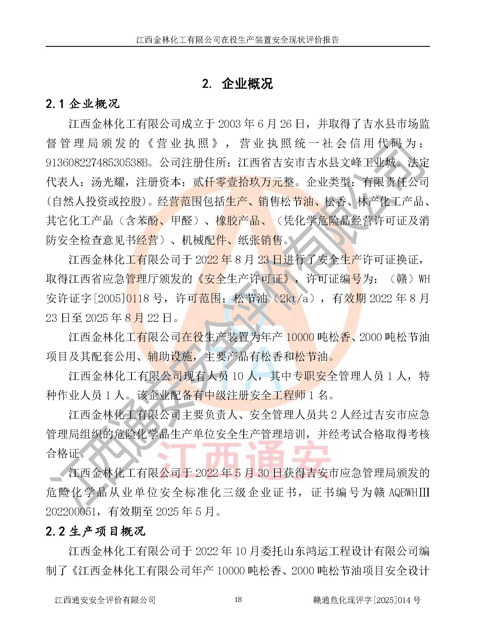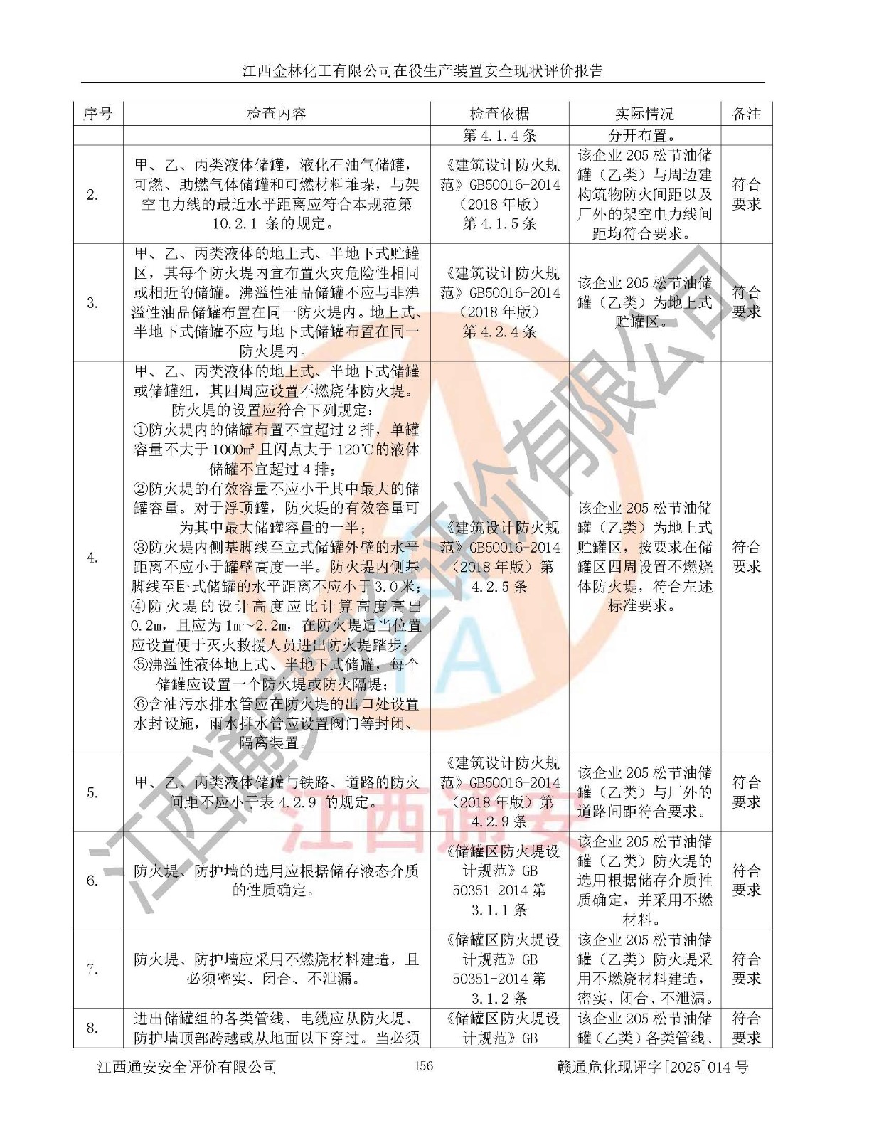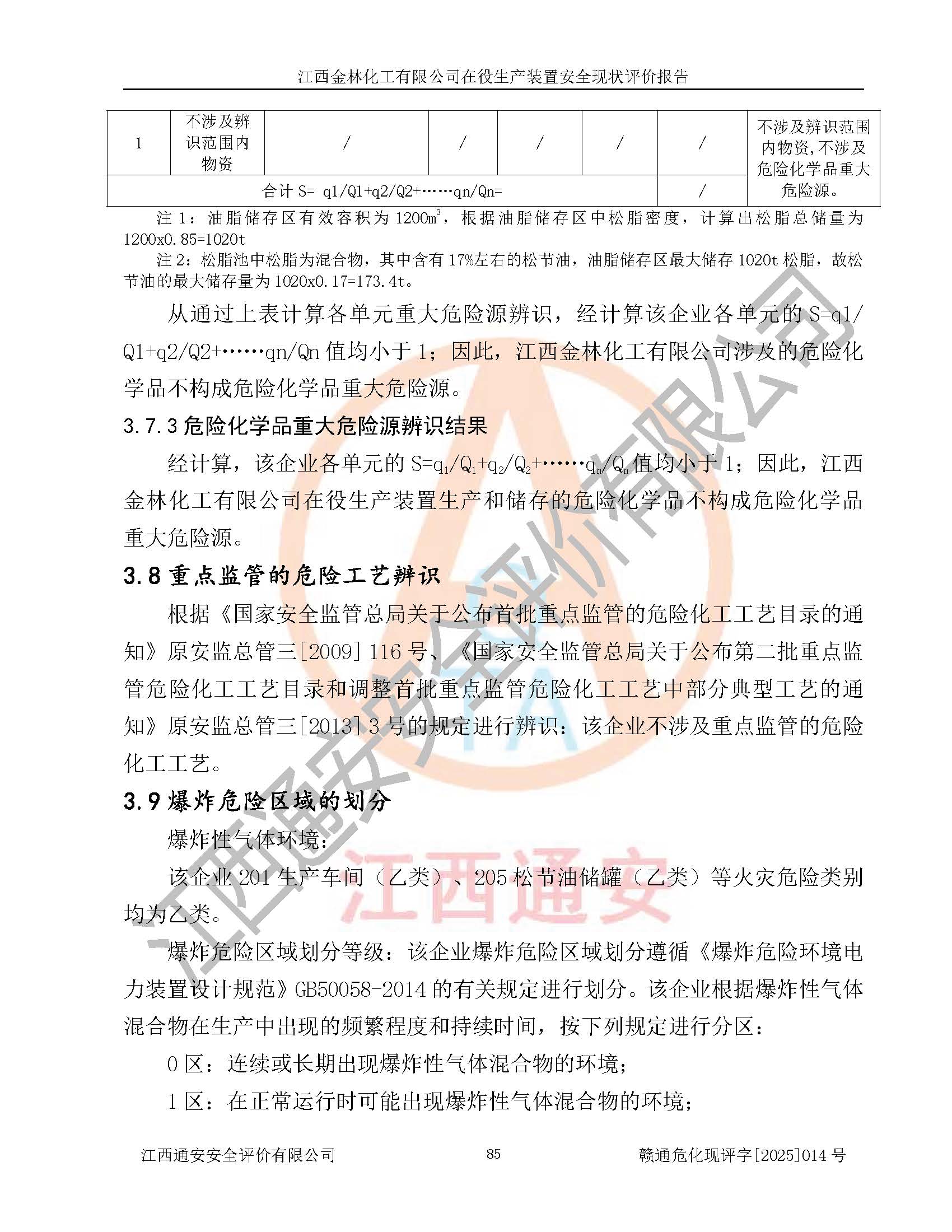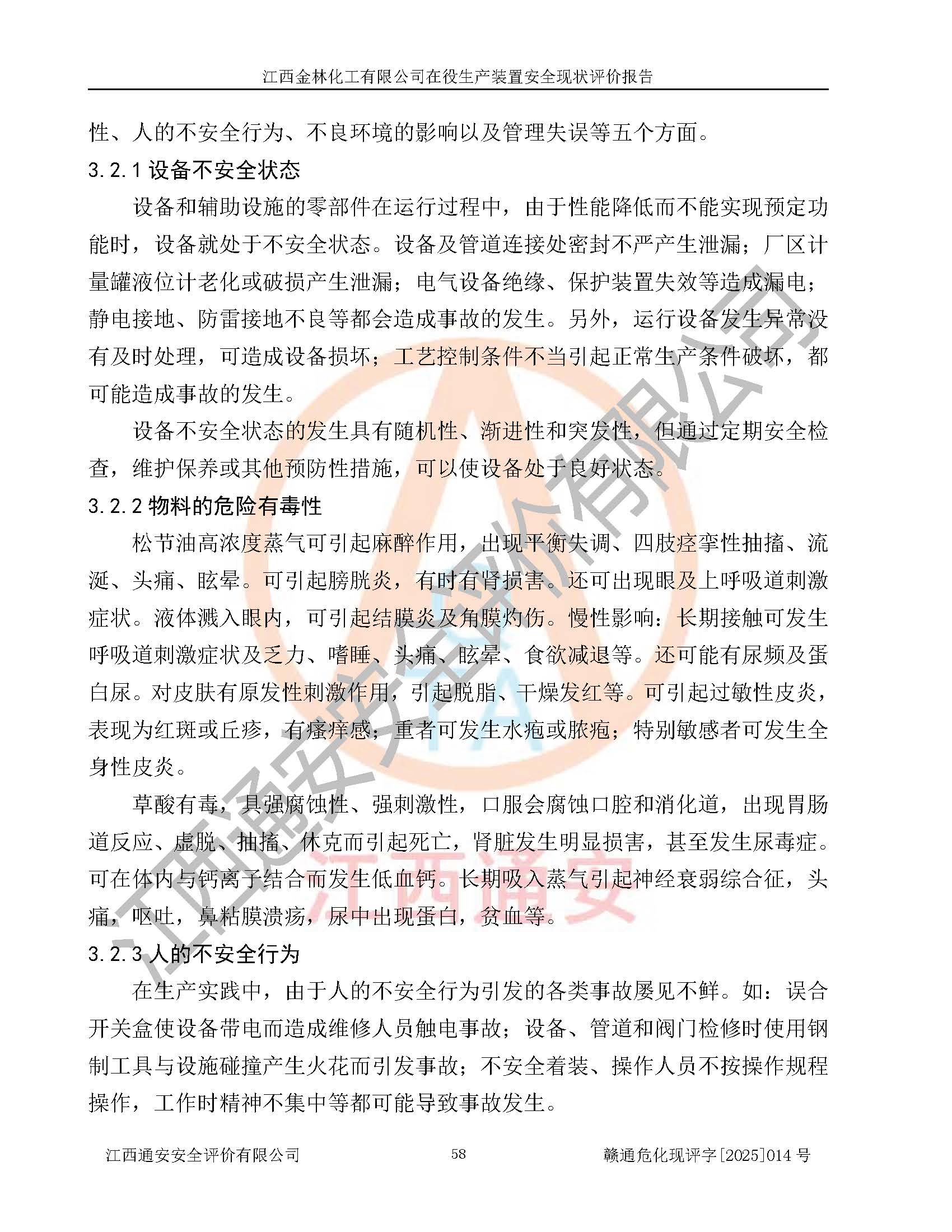 項目簡介 | 江西金林化工有限公司成立于2003年6月26日,并取得吉水縣市場監(jiān)督管理局頒發(fā)的《營業(yè)執(zhí)照》,營業(yè)執(zhí)照統(tǒng)一社會信用代碼:91360822748530538B。公司注冊住所:江西省吉安市吉水縣文峰工業(yè)城。法定**人:湯光耀,注冊資本:貳仟零壹拾玖萬元整。企業(yè)類型:有限責(zé)任公司(自然人投資或控股)。經(jīng)營范圍包括生產(chǎn)、銷售松節(jié)油、松香、林產(chǎn)化工產(chǎn)品、其它化工產(chǎn)品(含苯酚、甲醛)、橡膠產(chǎn)品、(憑化學(xué)危險品經(jīng)營許可證及消防安全檢查意見書經(jīng)營)、機械配件、紙張銷售。 江西金林化工有限公司于2022年8月23日進行了安全生產(chǎn)許可證換證,取得江西省應(yīng)急管理廳頒發(fā)的《安全生產(chǎn)許可證》,許可證編號為:(贛)WH安許證字[2005]0118號,許可范圍:松節(jié)油(2kt/a),**期2022年8月23日至2025年8月22日。 江西金林化工有限公司在役生產(chǎn)裝置為年產(chǎn)10000噸松香、2000噸松節(jié)油項目及其配套公用、輔助設(shè)施,主要產(chǎn)品有松香和松節(jié)油。 根據(jù)《危險化學(xué)品目錄》(2015年版)、應(yīng)急管理部辦公廳關(guān)于修改《危險化學(xué)品目錄(2015年版)實施指南(試行)》涉及柴油部分內(nèi)容的通知(應(yīng)急廳函〔2022〕300號)和《應(yīng)急管理部工業(yè)和信息化部公安部生態(tài)環(huán)境部交通運輸部農(nóng)業(yè)農(nóng)村部衛(wèi)生健康委市場監(jiān)管總局鐵路局民航局公告》2022年第8號《決定調(diào)整《危險化學(xué)品目錄(2015版)》,將“1674柴油〔閉杯閃點≤60℃〕”調(diào)整為“1674柴油”》的文件規(guī)定,對該企業(yè)生產(chǎn)過程中所涉及的化學(xué)品進行辨識:該企業(yè)涉及的危險化學(xué)品有:松脂、松節(jié)油、柴油(發(fā)電機燃料)等。 | |||