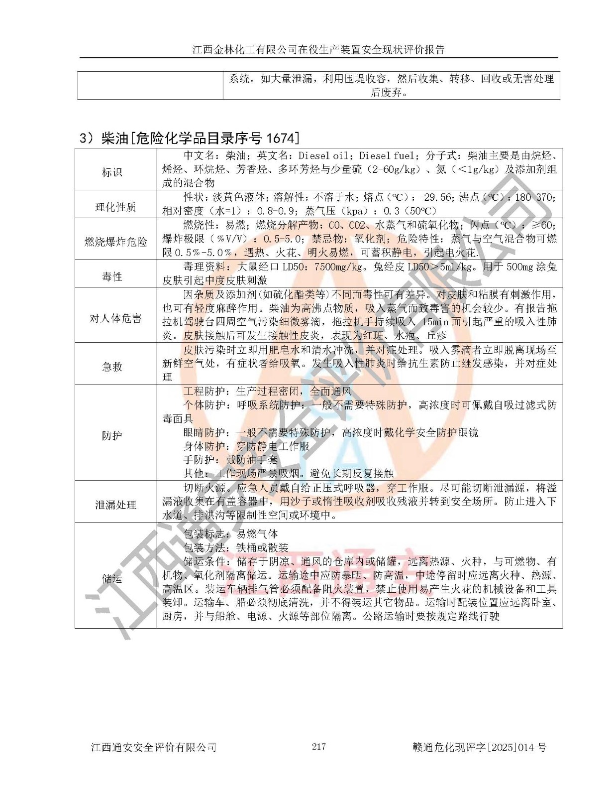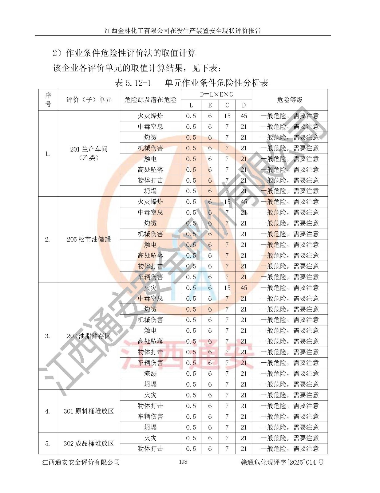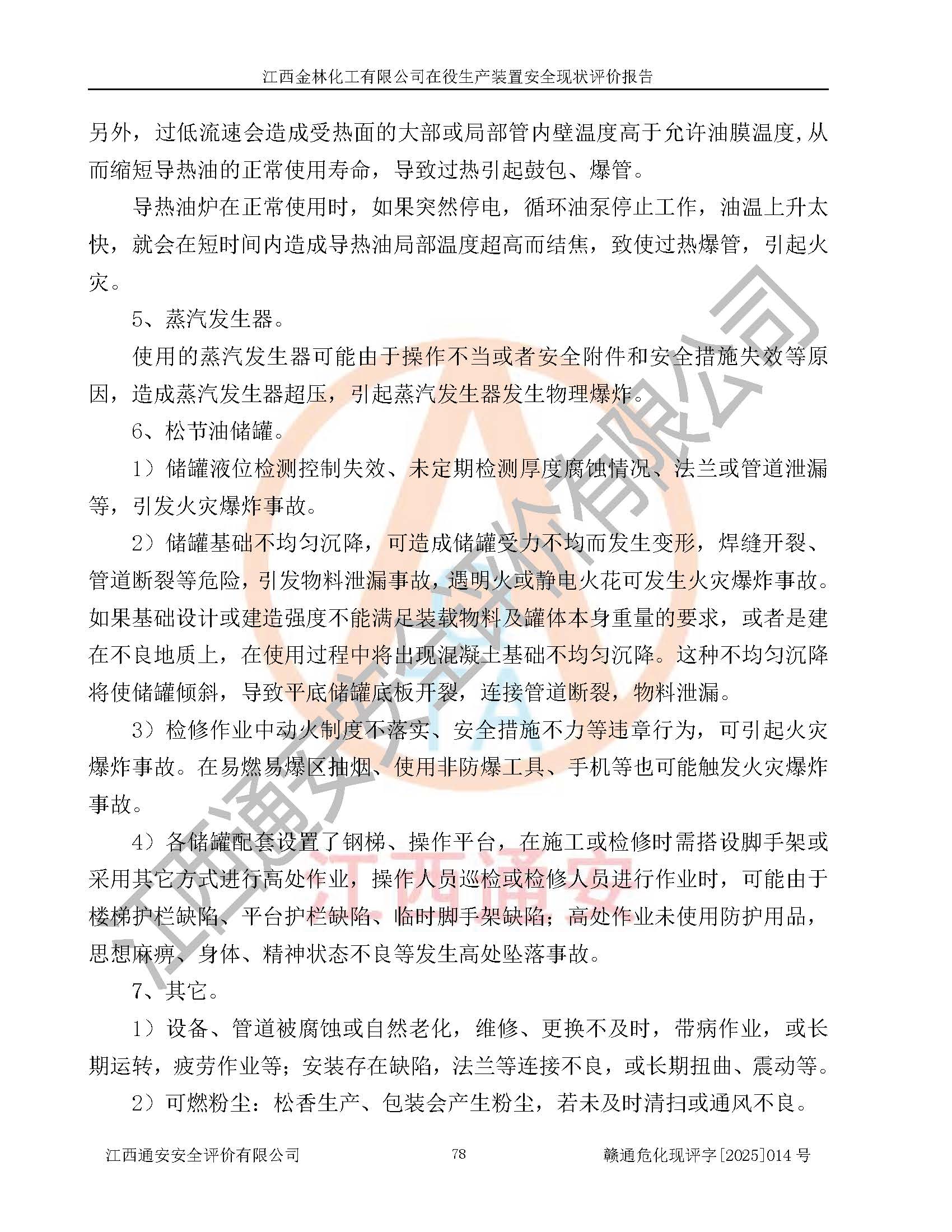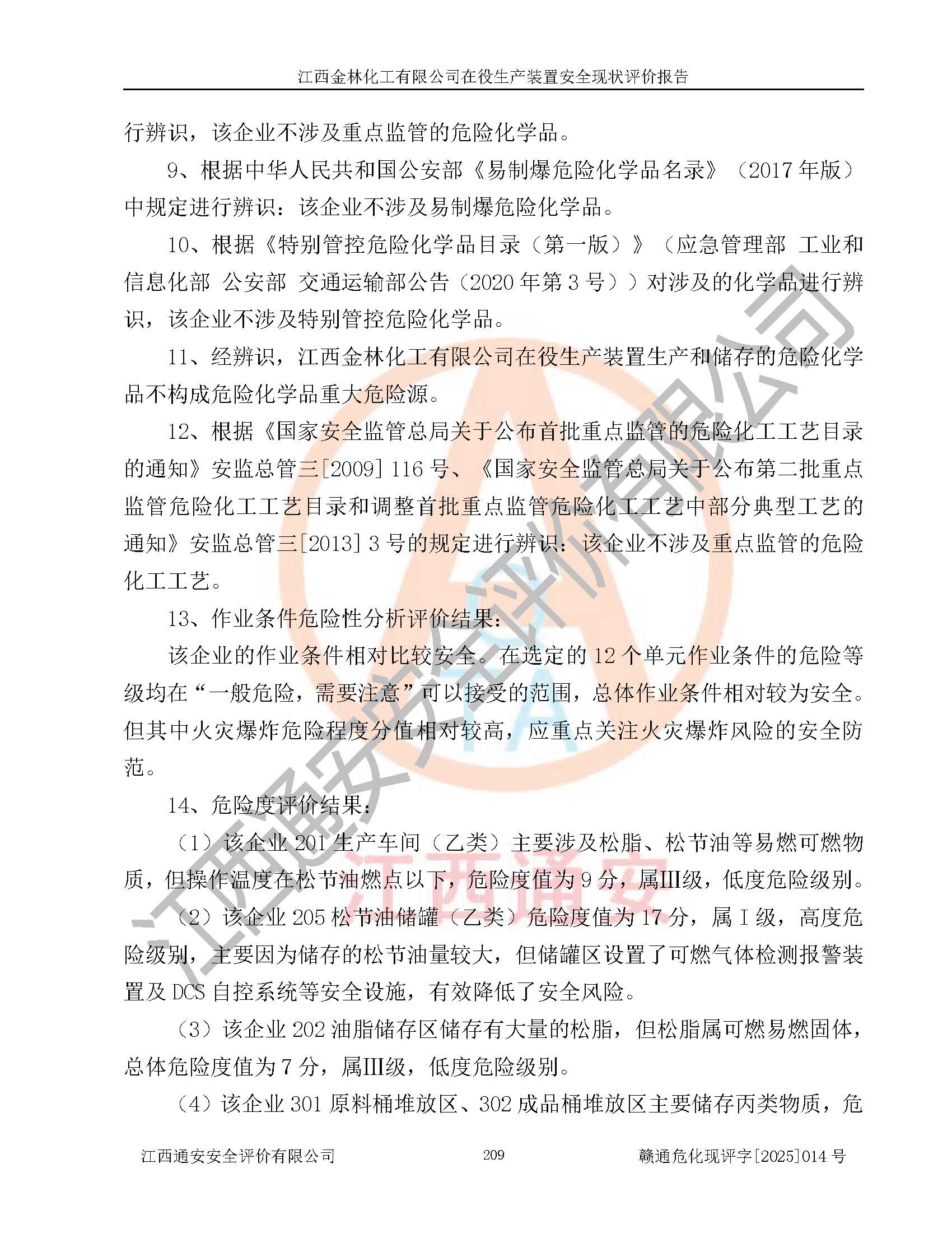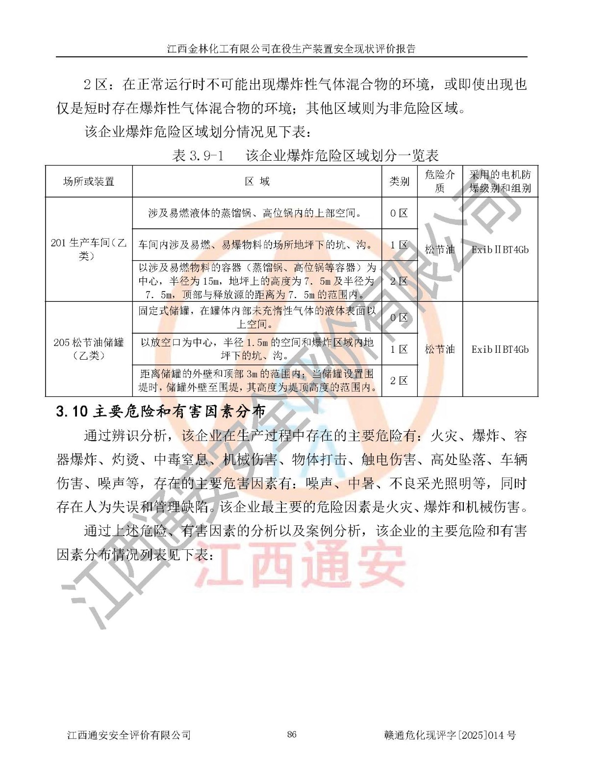 項目簡介 | 江西金林化工有限公司成立于2003年6月26日,并取得吉水縣市場監(jiān)督管理局頒發(fā)的《營業(yè)執(zhí)照》,營業(yè)執(zhí)照統(tǒng)一社會信用代碼:91360822748530538B。公司注冊住所:江西省吉安市吉水縣文峰工業(yè)城。法定**人:湯光耀,注冊資本:貳仟零壹拾玖萬元整。企業(yè)類型:有限責(zé)任公司(自然人投資或控股)。經(jīng)營范圍包括生產(chǎn)、銷售松節(jié)油、松香、林產(chǎn)化工產(chǎn)品、其它化工產(chǎn)品(含苯酚、甲醛)、橡膠產(chǎn)品、(憑化學(xué)危險品經(jīng)營許可證及消防安全檢查意見書經(jīng)營)、機械配件、紙張銷售。 江西金林化工有限公司于2022年8月23日進行了安全生產(chǎn)許可證換證,取得江西省應(yīng)急管理廳頒發(fā)的《安全生產(chǎn)許可證》,許可證編號為:(贛)WH安許證字[2005]0118號,許可范圍:松節(jié)油(2kt/a),**期2022年8月23日至2025年8月22日。 江西金林化工有限公司在役生產(chǎn)裝置為年產(chǎn)10000噸松香、2000噸松節(jié)油項目及其配套公用、輔助設(shè)施,主要產(chǎn)品有松香和松節(jié)油。 根據(jù)《危險化學(xué)品目錄》(2015年版)、應(yīng)急管理部辦公廳關(guān)于修改《危險化學(xué)品目錄(2015年版)實施指南(試行)》涉及柴油部分內(nèi)容的通知(應(yīng)急廳函〔2022〕300號)和《應(yīng)急管理部工業(yè)和信息化部公安部生態(tài)環(huán)境部交通運輸部農(nóng)業(yè)農(nóng)村部衛(wèi)生健康委市場監(jiān)管總局鐵路局民航局公告》2022年第8號《決定調(diào)整《危險化學(xué)品目錄(2015版)》,將“1674柴油〔閉杯閃點≤60℃〕”調(diào)整為“1674柴油”》的文件規(guī)定,對該企業(yè)生產(chǎn)過程中所涉及的化學(xué)品進行辨識:該企業(yè)涉及的危險化學(xué)品有:松脂、松節(jié)油、柴油(發(fā)電機燃料)等。 | |||