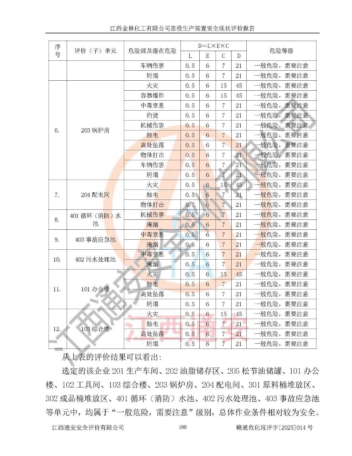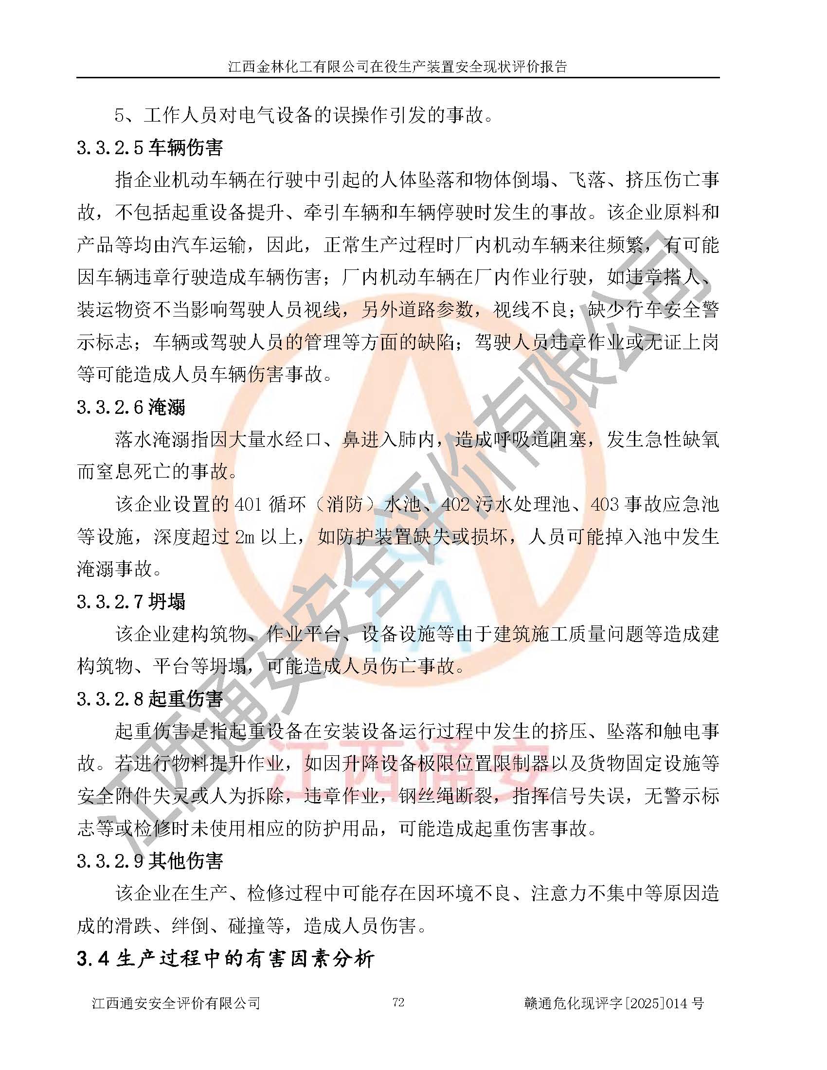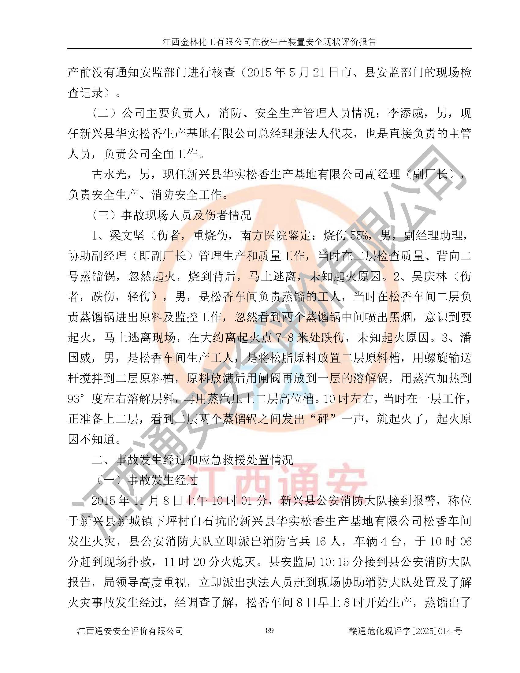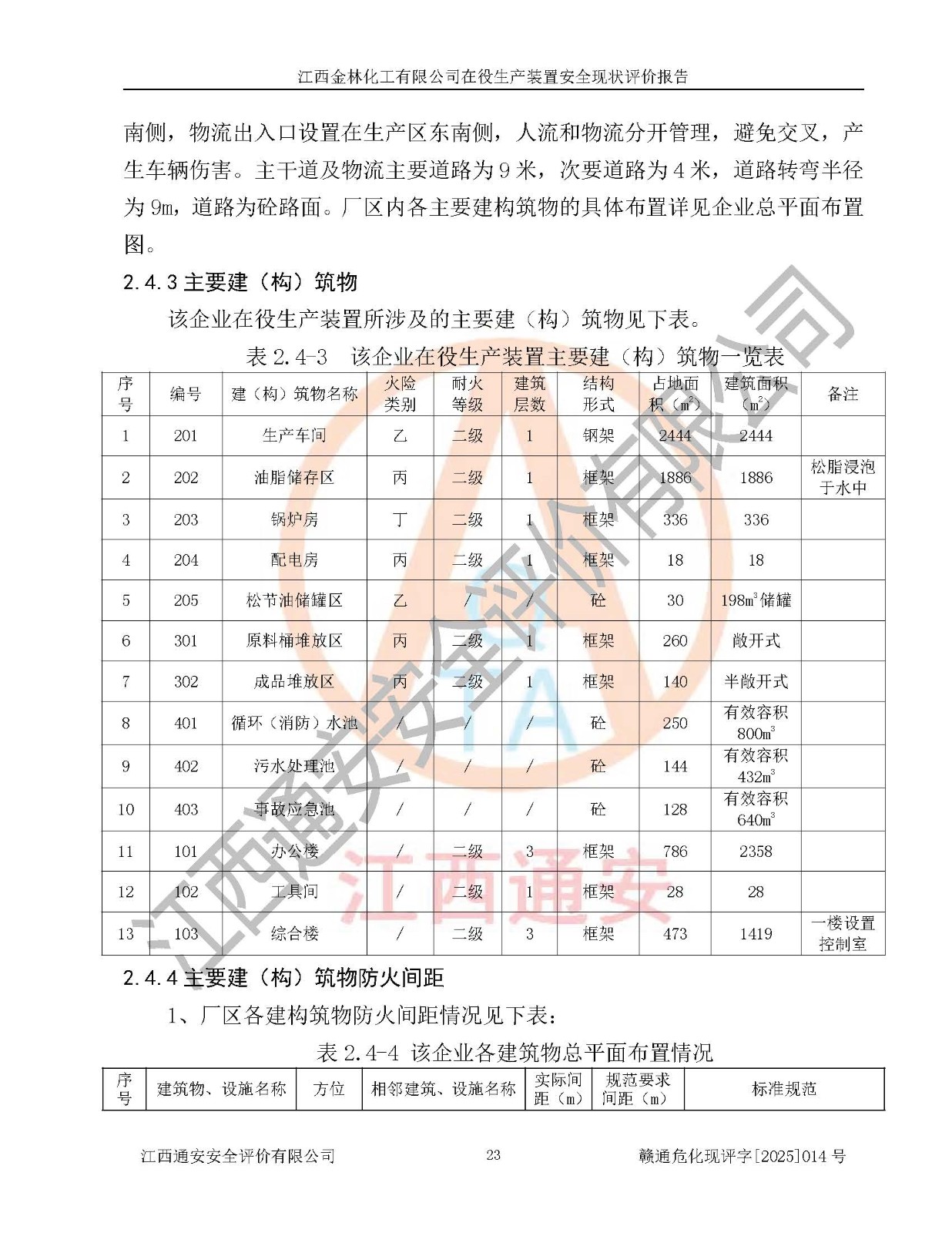 項目簡介 | 江西金林化工有限公司成立于2003年6月26日,并取得吉水縣市場監(jiān)督管理局頒發(fā)的《營業(yè)執(zhí)照》,營業(yè)執(zhí)照統(tǒng)一社會信用代碼:91360822748530538B。公司注冊住所:江西省吉安市吉水縣文峰工業(yè)城。法定**人:湯光耀,注冊資本:貳仟零壹拾玖萬元整。企業(yè)類型:有限責(zé)任公司(自然人投資或控股)。經(jīng)營范圍包括生產(chǎn)、銷售松節(jié)油、松香、林產(chǎn)化工產(chǎn)品、其它化工產(chǎn)品(含苯酚、甲醛)、橡膠產(chǎn)品、(憑化學(xué)危險品經(jīng)營許可證及消防安全檢查意見書經(jīng)營)、機械配件、紙張銷售。 江西金林化工有限公司于2022年8月23日進行了安全生產(chǎn)許可證換證,取得江西省應(yīng)急管理廳頒發(fā)的《安全生產(chǎn)許可證》,許可證編號為:(贛)WH安許證字[2005]0118號,許可范圍:松節(jié)油(2kt/a),**期2022年8月23日至2025年8月22日。 江西金林化工有限公司在役生產(chǎn)裝置為年產(chǎn)10000噸松香、2000噸松節(jié)油項目及其配套公用、輔助設(shè)施,主要產(chǎn)品有松香和松節(jié)油。 根據(jù)《危險化學(xué)品目錄》(2015年版)、應(yīng)急管理部辦公廳關(guān)于修改《危險化學(xué)品目錄(2015年版)實施指南(試行)》涉及柴油部分內(nèi)容的通知(應(yīng)急廳函〔2022〕300號)和《應(yīng)急管理部工業(yè)和信息化部公安部生態(tài)環(huán)境部交通運輸部農(nóng)業(yè)農(nóng)村部衛(wèi)生健康委市場監(jiān)管總局鐵路局民航局公告》2022年第8號《決定調(diào)整《危險化學(xué)品目錄(2015版)》,將“1674柴油〔閉杯閃點≤60℃〕”調(diào)整為“1674柴油”》的文件規(guī)定,對該企業(yè)生產(chǎn)過程中所涉及的化學(xué)品進行辨識:該企業(yè)涉及的危險化學(xué)品有:松脂、松節(jié)油、柴油(發(fā)電機燃料)等。 | |||
