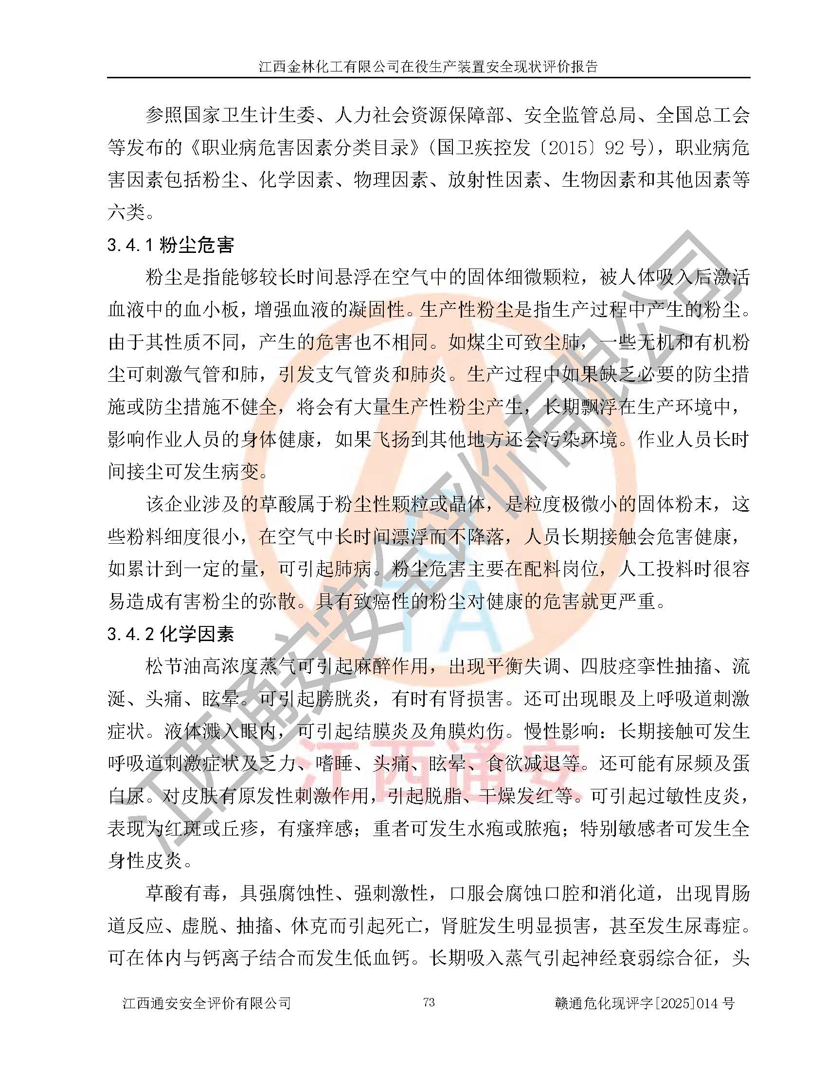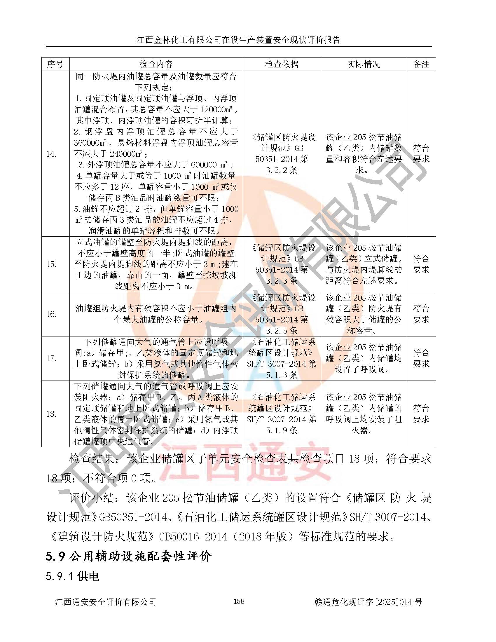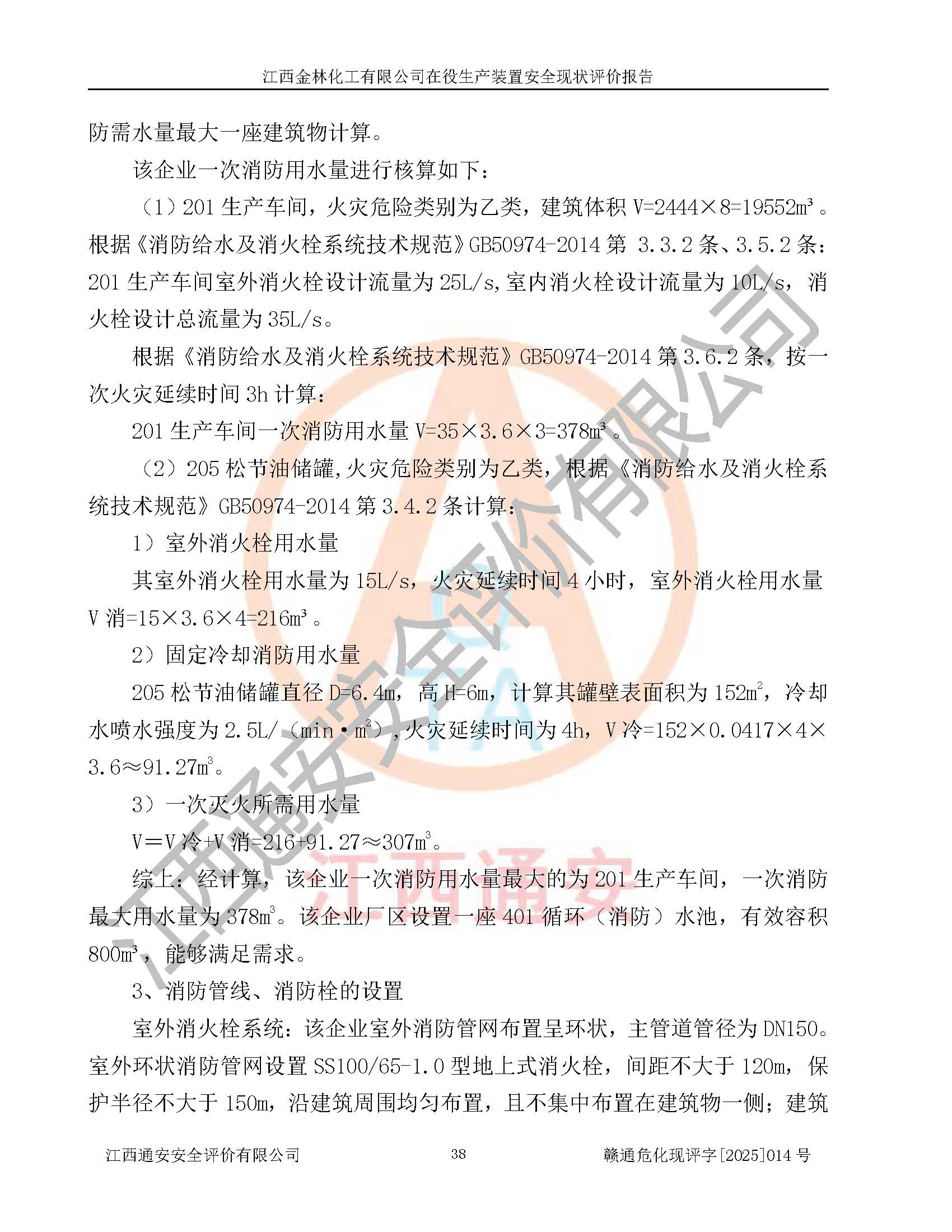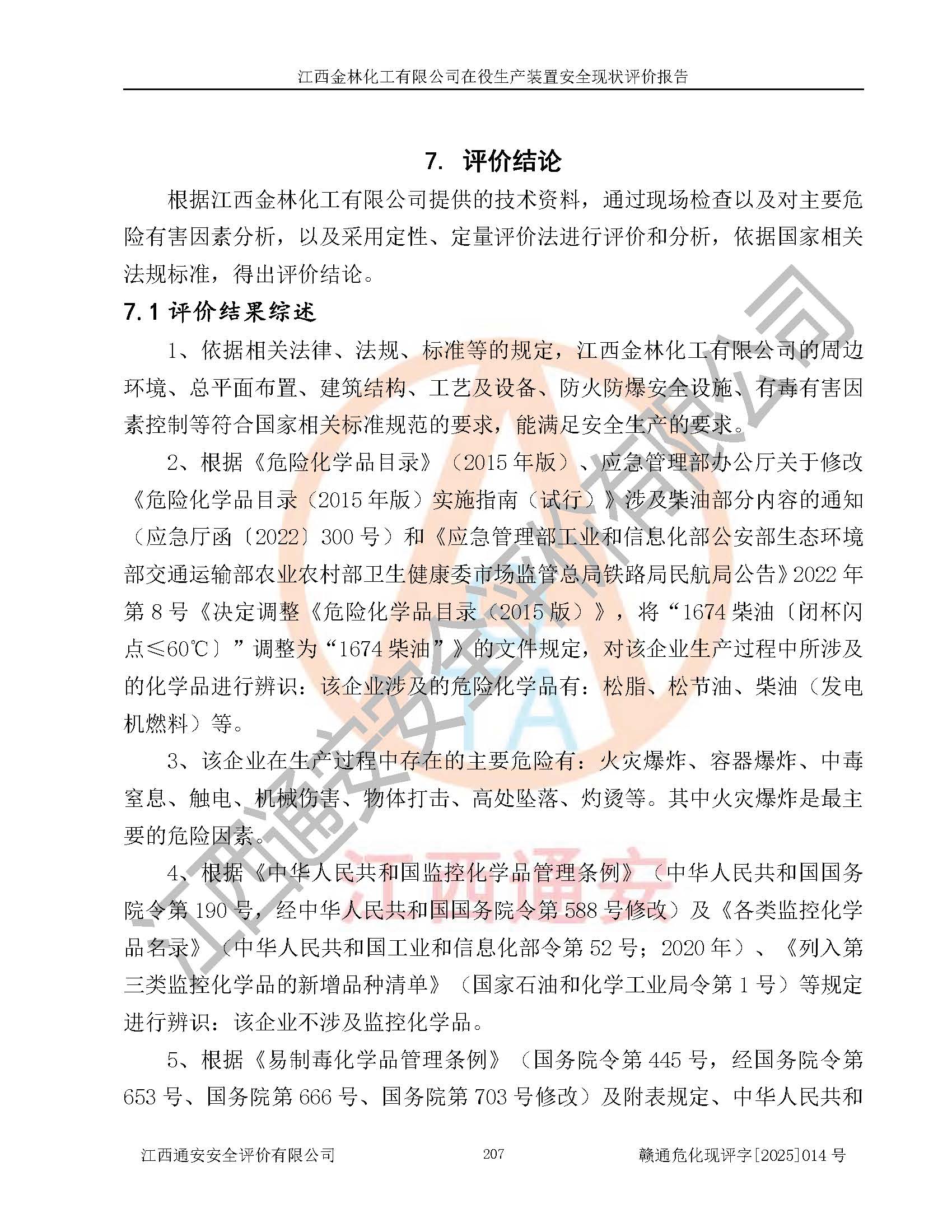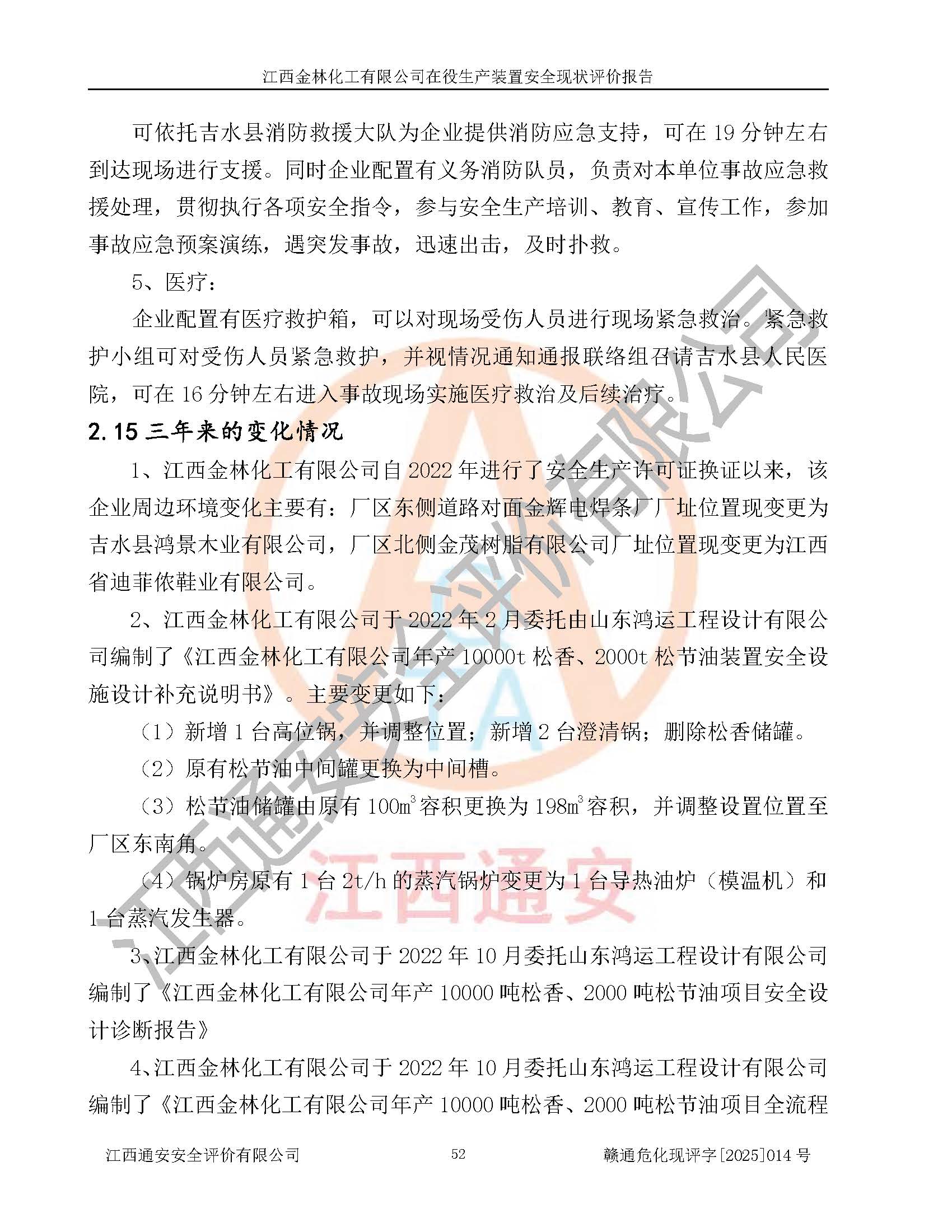 項目簡介 | 江西金林化工有限公司成立于2003年6月26日,并取得吉水縣市場監(jiān)督管理局頒發(fā)的《營業(yè)執(zhí)照》,營業(yè)執(zhí)照統(tǒng)一社會信用代碼:91360822748530538B。公司注冊住所:江西省吉安市吉水縣文峰工業(yè)城。法定**人:湯光耀,注冊資本:貳仟零壹拾玖萬元整。企業(yè)類型:有限責(zé)任公司(自然人投資或控股)。經(jīng)營范圍包括生產(chǎn)、銷售松節(jié)油、松香、林產(chǎn)化工產(chǎn)品、其它化工產(chǎn)品(含苯酚、甲醛)、橡膠產(chǎn)品、(憑化學(xué)危險品經(jīng)營許可證及消防安全檢查意見書經(jīng)營)、機械配件、紙張銷售。 江西金林化工有限公司于2022年8月23日進行了安全生產(chǎn)許可證換證,取得江西省應(yīng)急管理廳頒發(fā)的《安全生產(chǎn)許可證》,許可證編號為:(贛)WH安許證字[2005]0118號,許可范圍:松節(jié)油(2kt/a),**期2022年8月23日至2025年8月22日。 江西金林化工有限公司在役生產(chǎn)裝置為年產(chǎn)10000噸松香、2000噸松節(jié)油項目及其配套公用、輔助設(shè)施,主要產(chǎn)品有松香和松節(jié)油。 根據(jù)《危險化學(xué)品目錄》(2015年版)、應(yīng)急管理部辦公廳關(guān)于修改《危險化學(xué)品目錄(2015年版)實施指南(試行)》涉及柴油部分內(nèi)容的通知(應(yīng)急廳函〔2022〕300號)和《應(yīng)急管理部工業(yè)和信息化部公安部生態(tài)環(huán)境部交通運輸部農(nóng)業(yè)農(nóng)村部衛(wèi)生健康委市場監(jiān)管總局鐵路局民航局公告》2022年第8號《決定調(diào)整《危險化學(xué)品目錄(2015版)》,將“1674柴油〔閉杯閃點≤60℃〕”調(diào)整為“1674柴油”》的文件規(guī)定,對該企業(yè)生產(chǎn)過程中所涉及的化學(xué)品進行辨識:該企業(yè)涉及的危險化學(xué)品有:松脂、松節(jié)油、柴油(發(fā)電機燃料)等。 | |||