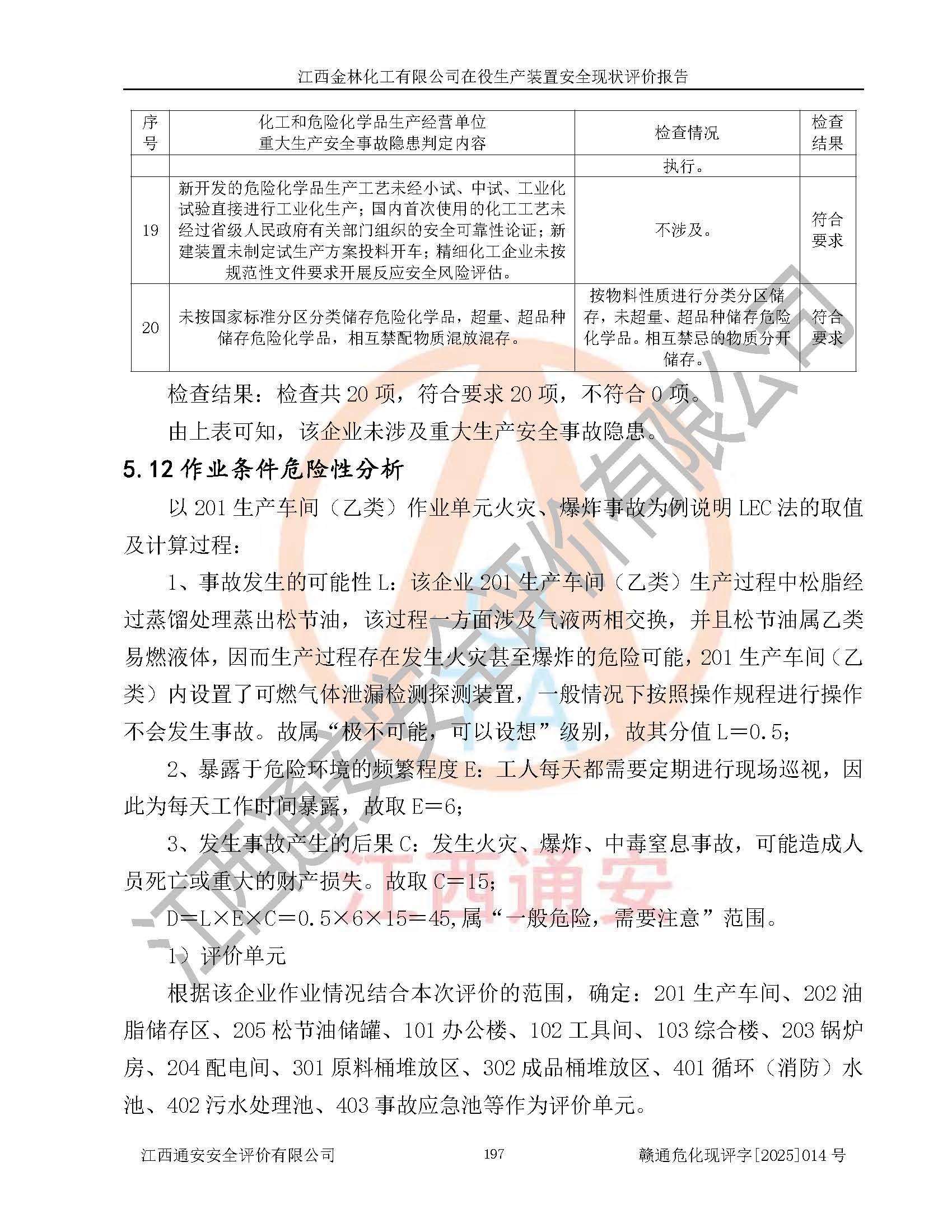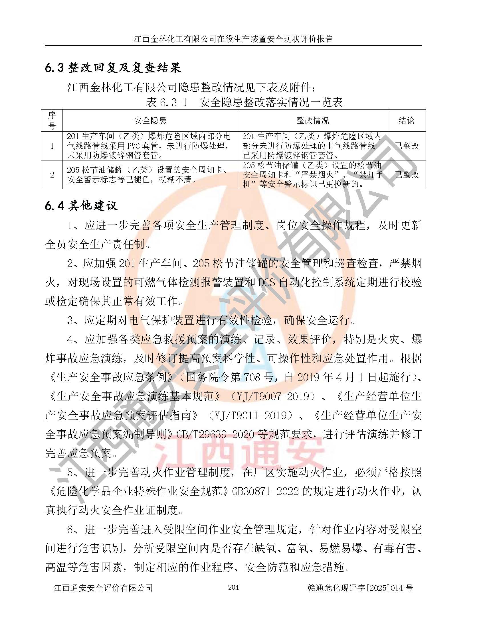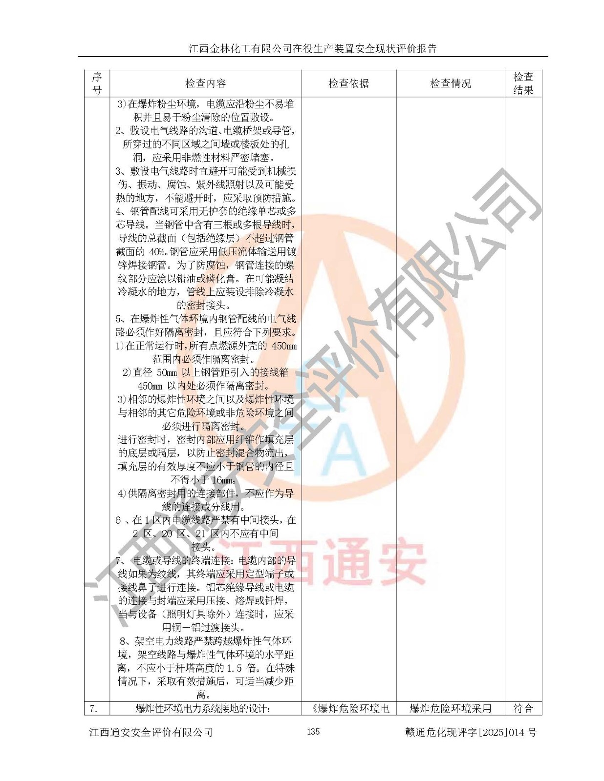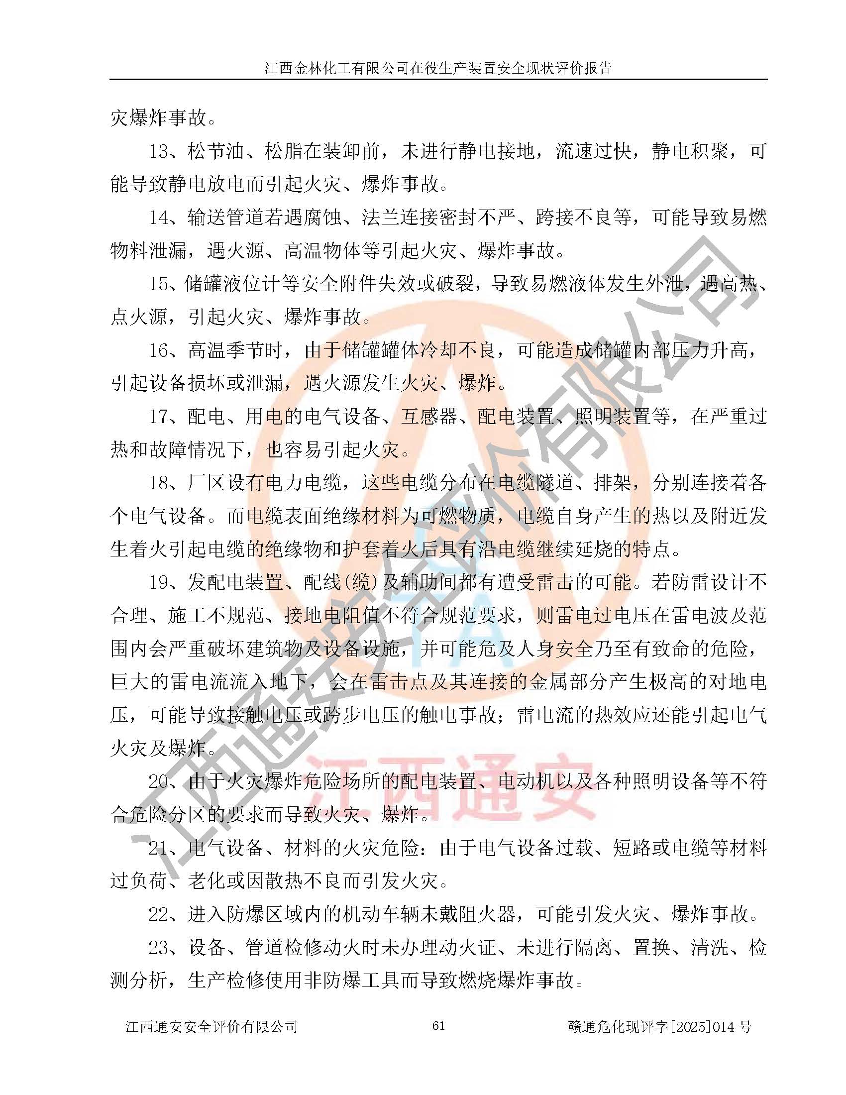 勘察現(xiàn)場發(fā)現(xiàn)的問題及安全對策措施 | 序號安全隱患對策措施與整改建議緊迫程度1. 201生產(chǎn)車間爆炸危險區(qū)域內(nèi)部分電氣線路管線采用PVC套管,未進行防爆處理,未采用防爆鍍鋅鋼管套管。對201生產(chǎn)車間爆炸危險區(qū)域內(nèi)部分未進行防爆處理的電氣線路管線采用防爆鍍鋅鋼管套管。高2. 205松節(jié)油儲罐(乙類)設(shè)置的安全周知卡、安全警示標志等已褪色,模糊不清。205松節(jié)油儲罐(乙類)更換新的安全周知卡、安全警示標志。中