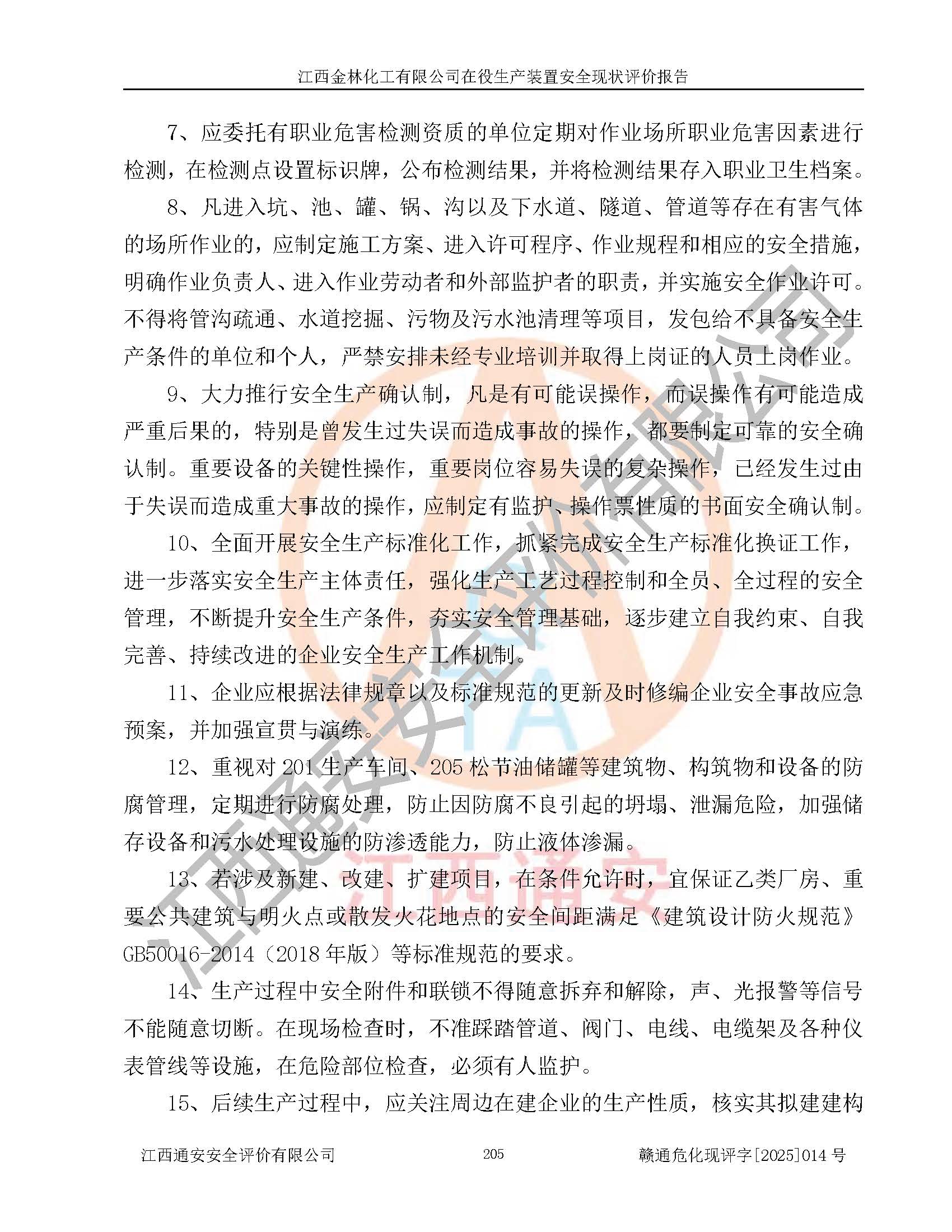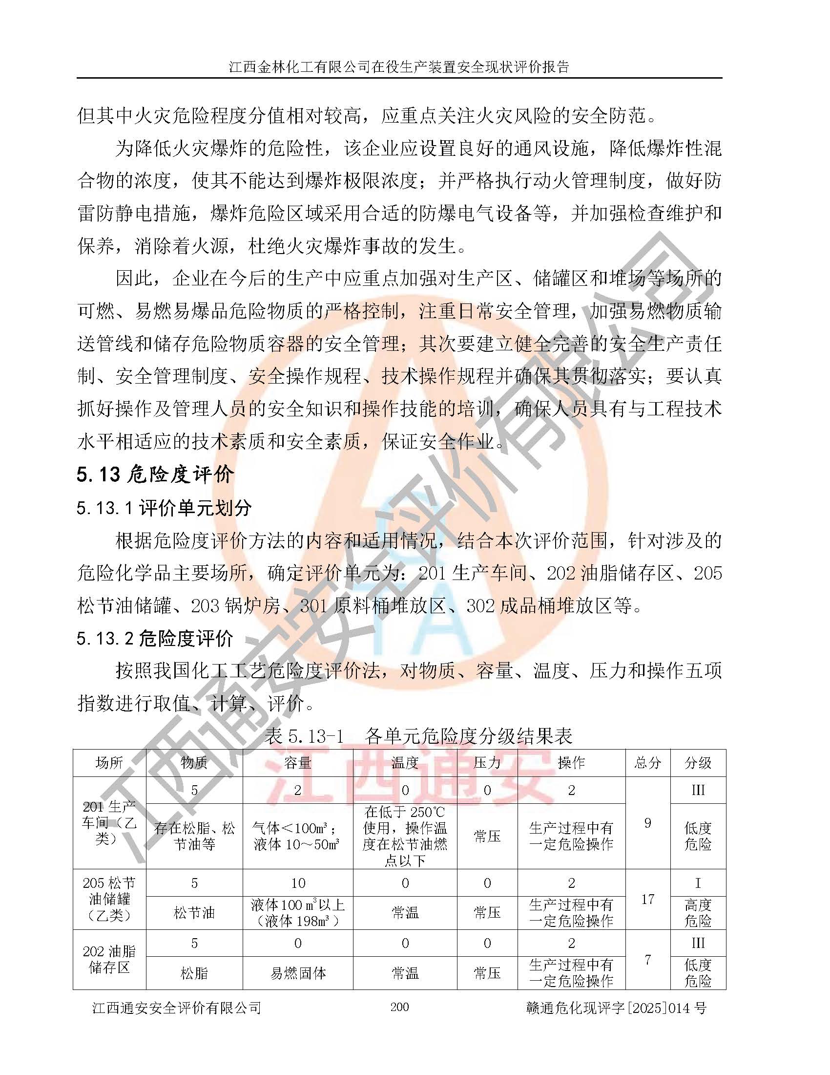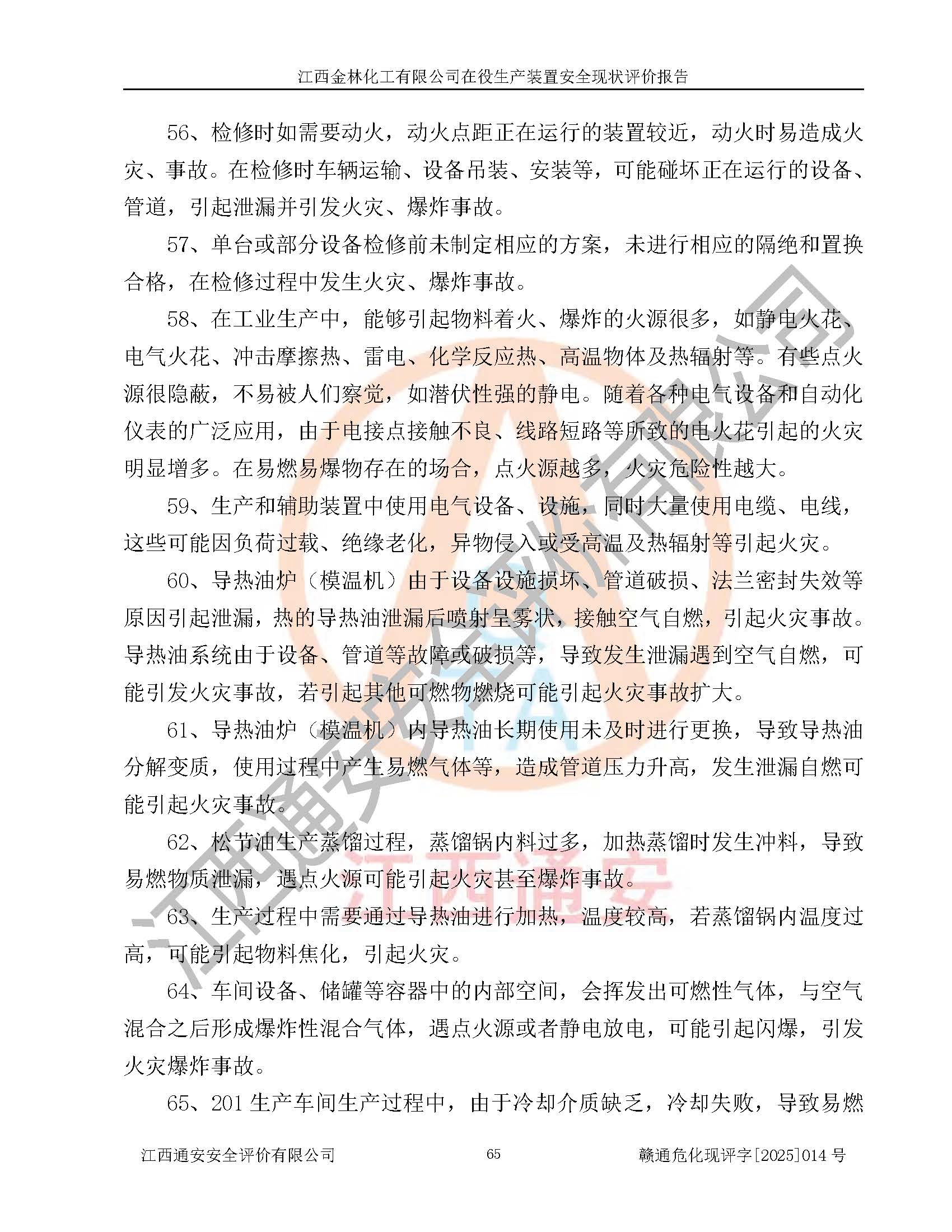 勘察現(xiàn)場發(fā)現(xiàn)的問題及安全對策措施 | 序號安全隱患對策措施與整改建議緊迫程度1. 201生產(chǎn)車間爆炸危險區(qū)域內(nèi)部分電氣線路管線采用PVC套管,未進行防爆處理,未采用防爆鍍鋅鋼管套管。對201生產(chǎn)車間爆炸危險區(qū)域內(nèi)部分未進行防爆處理的電氣線路管線采用防爆鍍鋅鋼管套管。高2. 205松節(jié)油儲罐(乙類)設(shè)置的安全周知卡、安全警示標志等已褪色,模糊不清。205松節(jié)油儲罐(乙類)更換新的安全周知卡、安全警示標志。中
