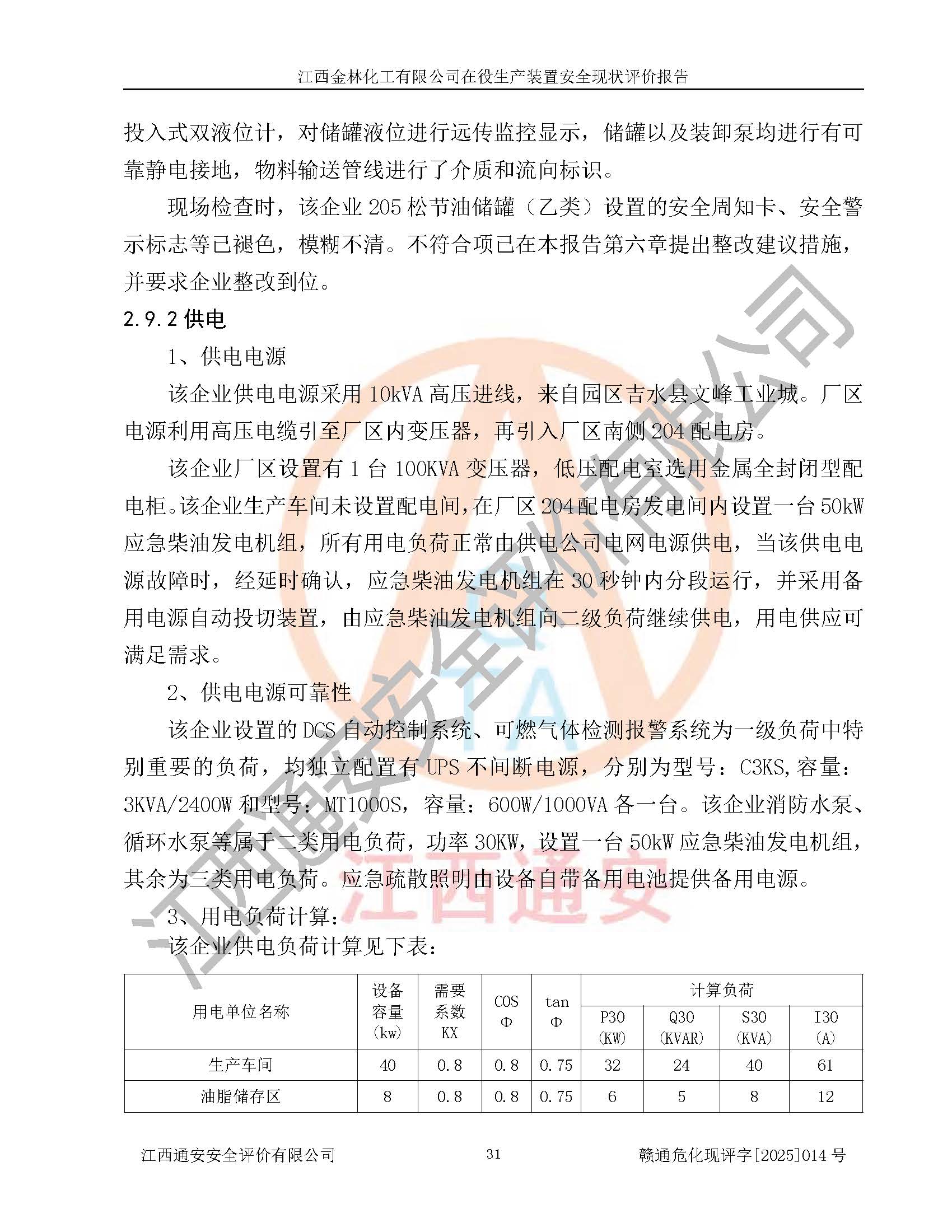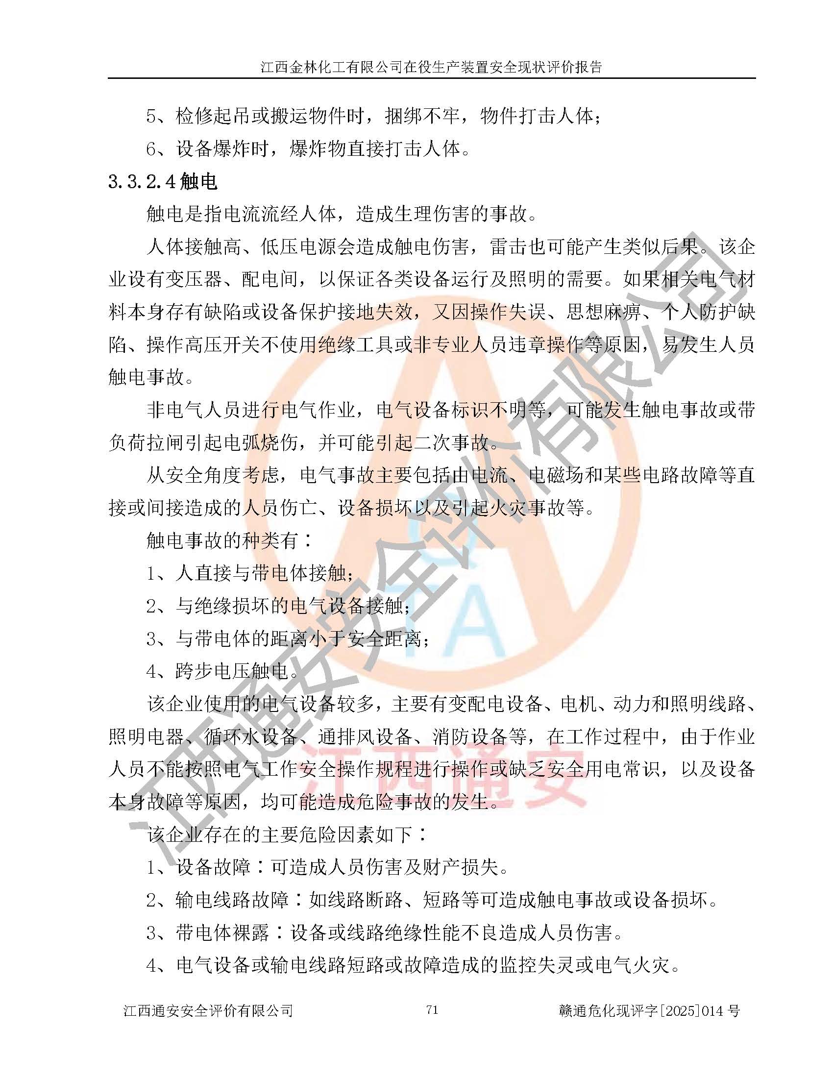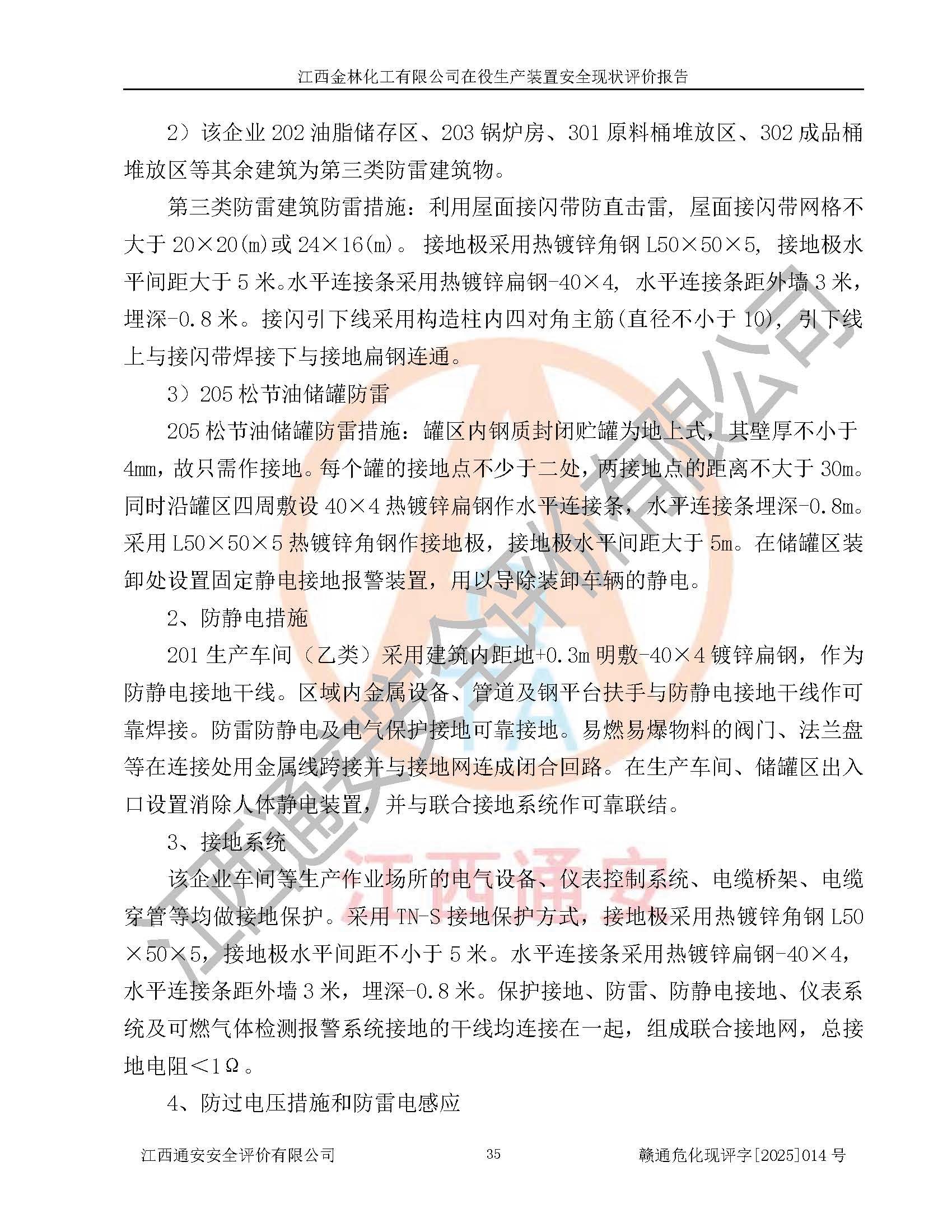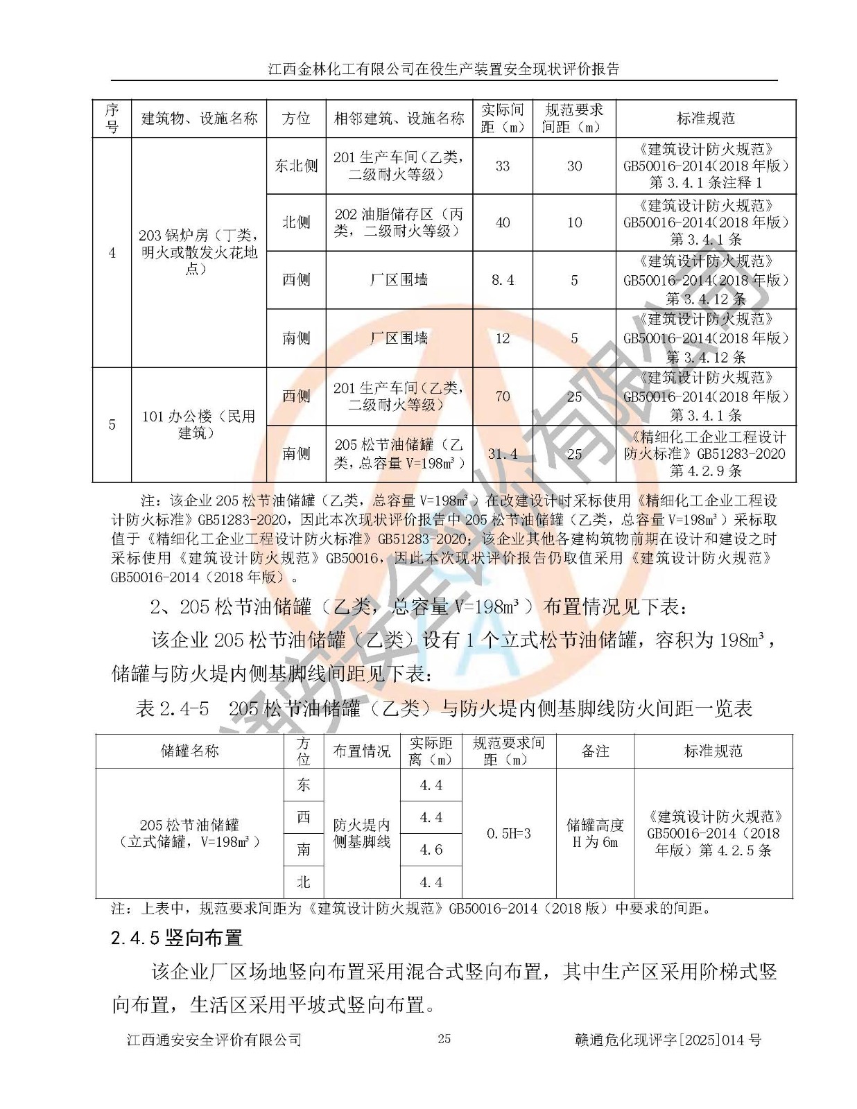 勘察現(xiàn)場發(fā)現(xiàn)的問題及安全對策措施 | 序號安全隱患對策措施與整改建議緊迫程度1. 201生產(chǎn)車間爆炸危險區(qū)域內(nèi)部分電氣線路管線采用PVC套管,未進行防爆處理,未采用防爆鍍鋅鋼管套管。對201生產(chǎn)車間爆炸危險區(qū)域內(nèi)部分未進行防爆處理的電氣線路管線采用防爆鍍鋅鋼管套管。高2. 205松節(jié)油儲罐(乙類)設(shè)置的安全周知卡、安全警示標志等已褪色,模糊不清。205松節(jié)油儲罐(乙類)更換新的安全周知卡、安全警示標志。中