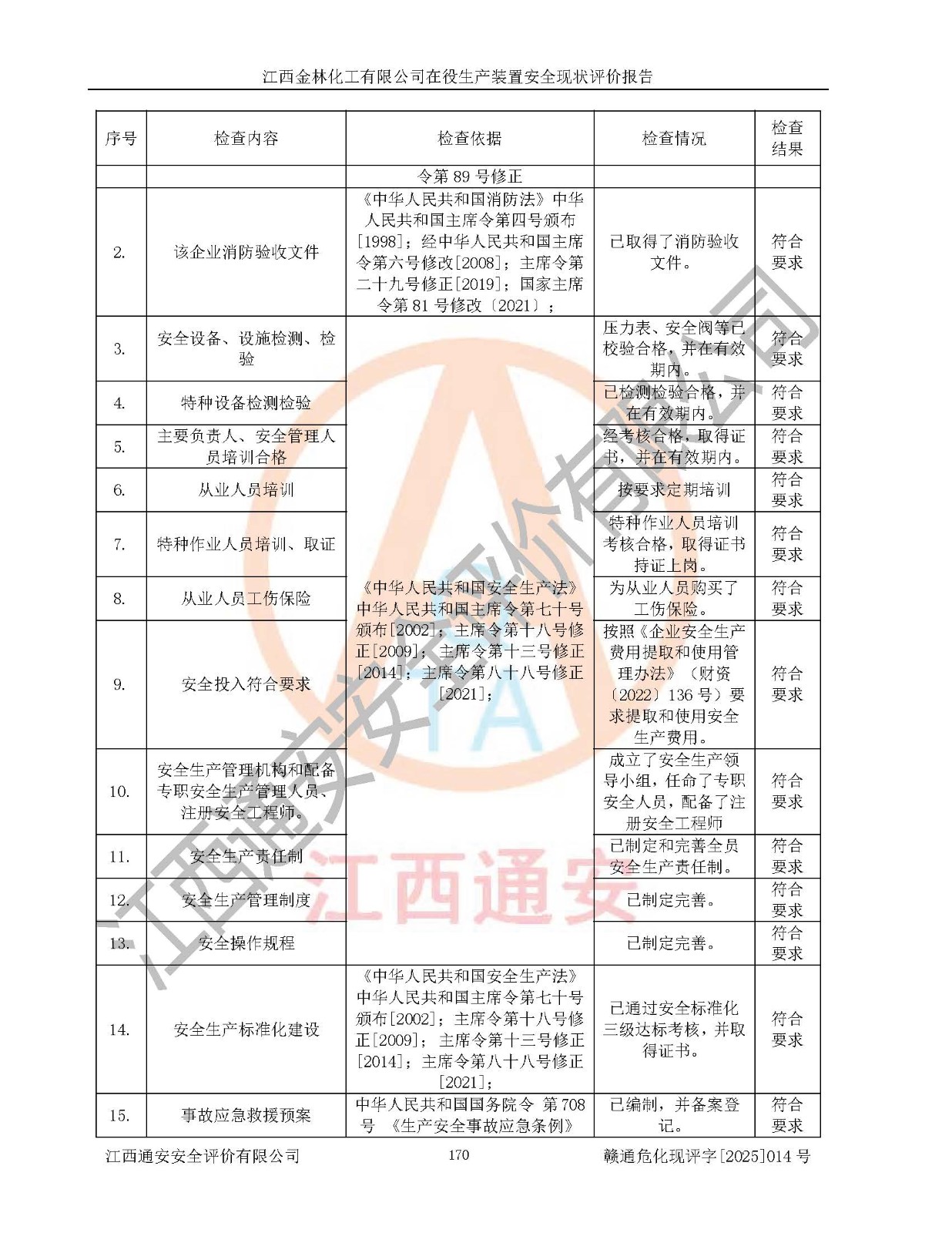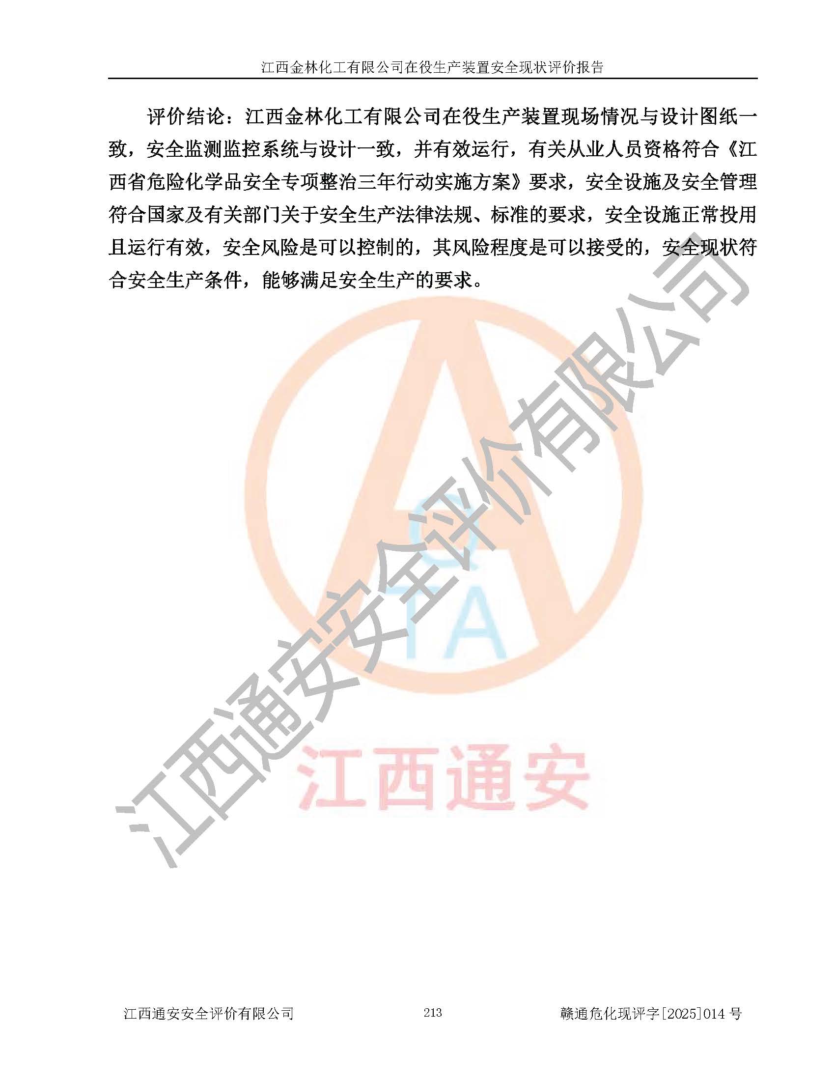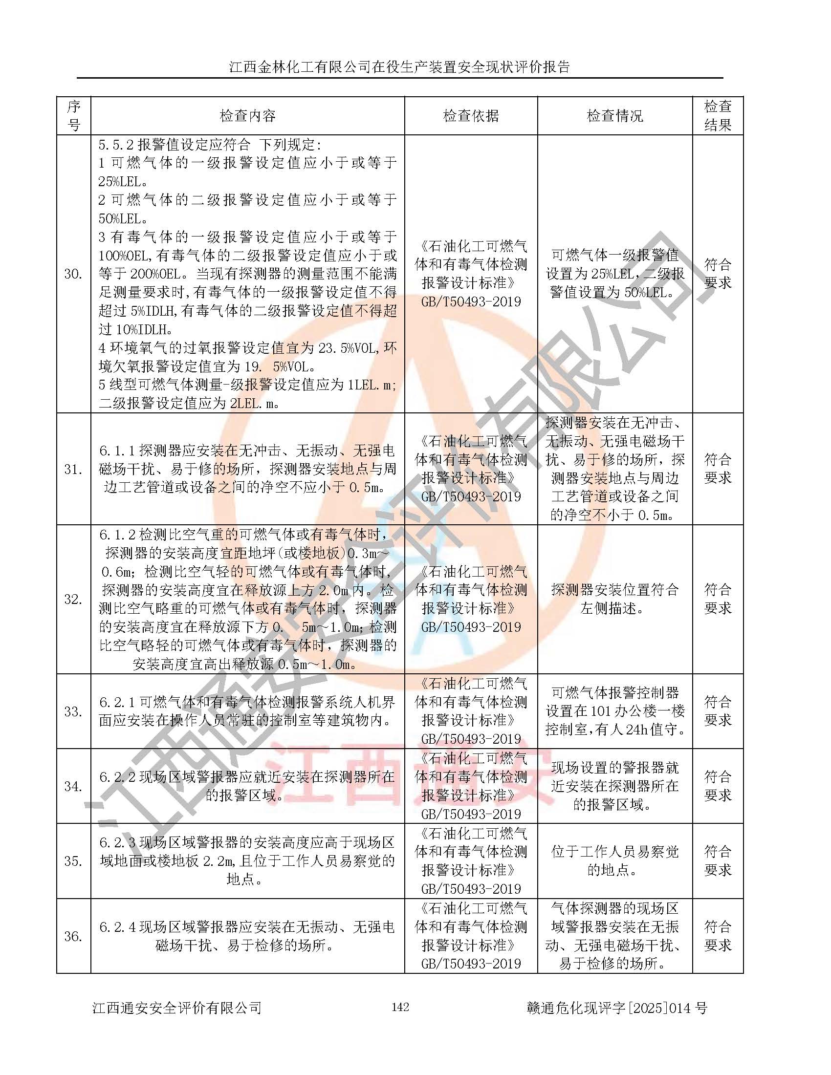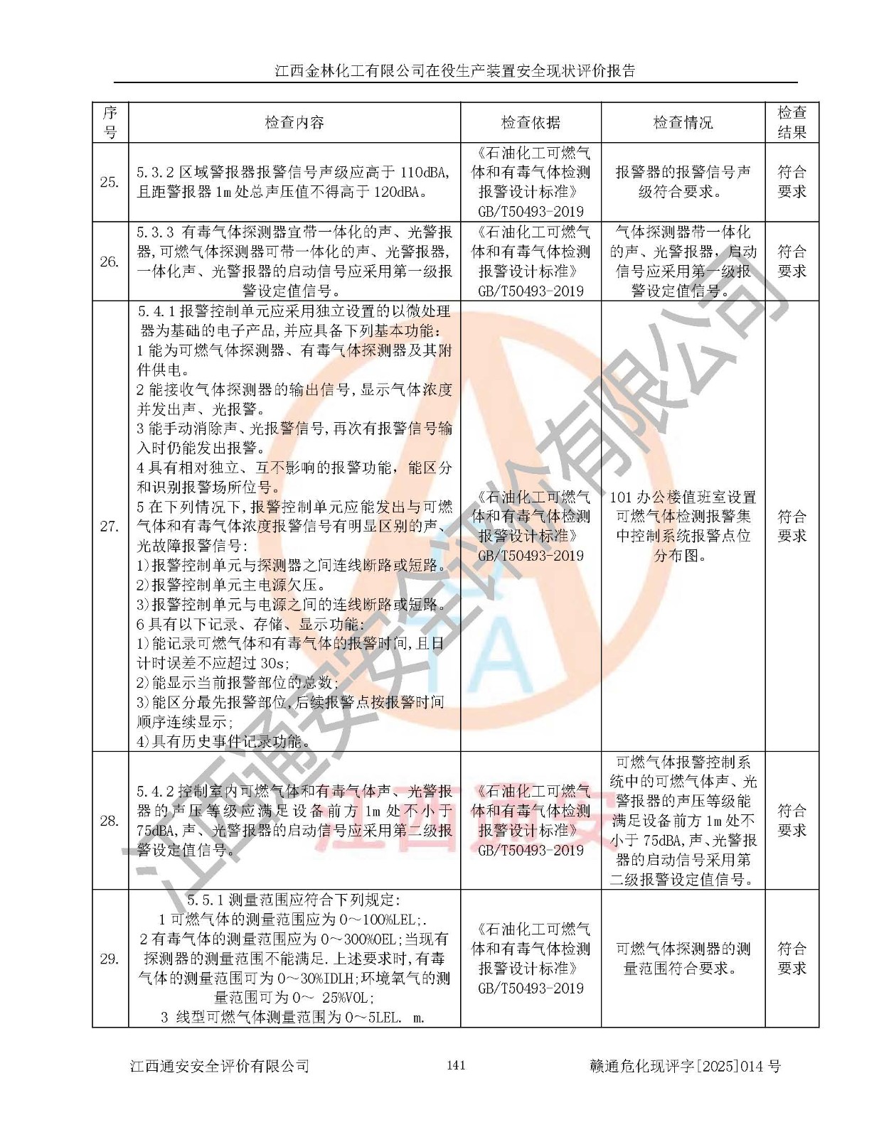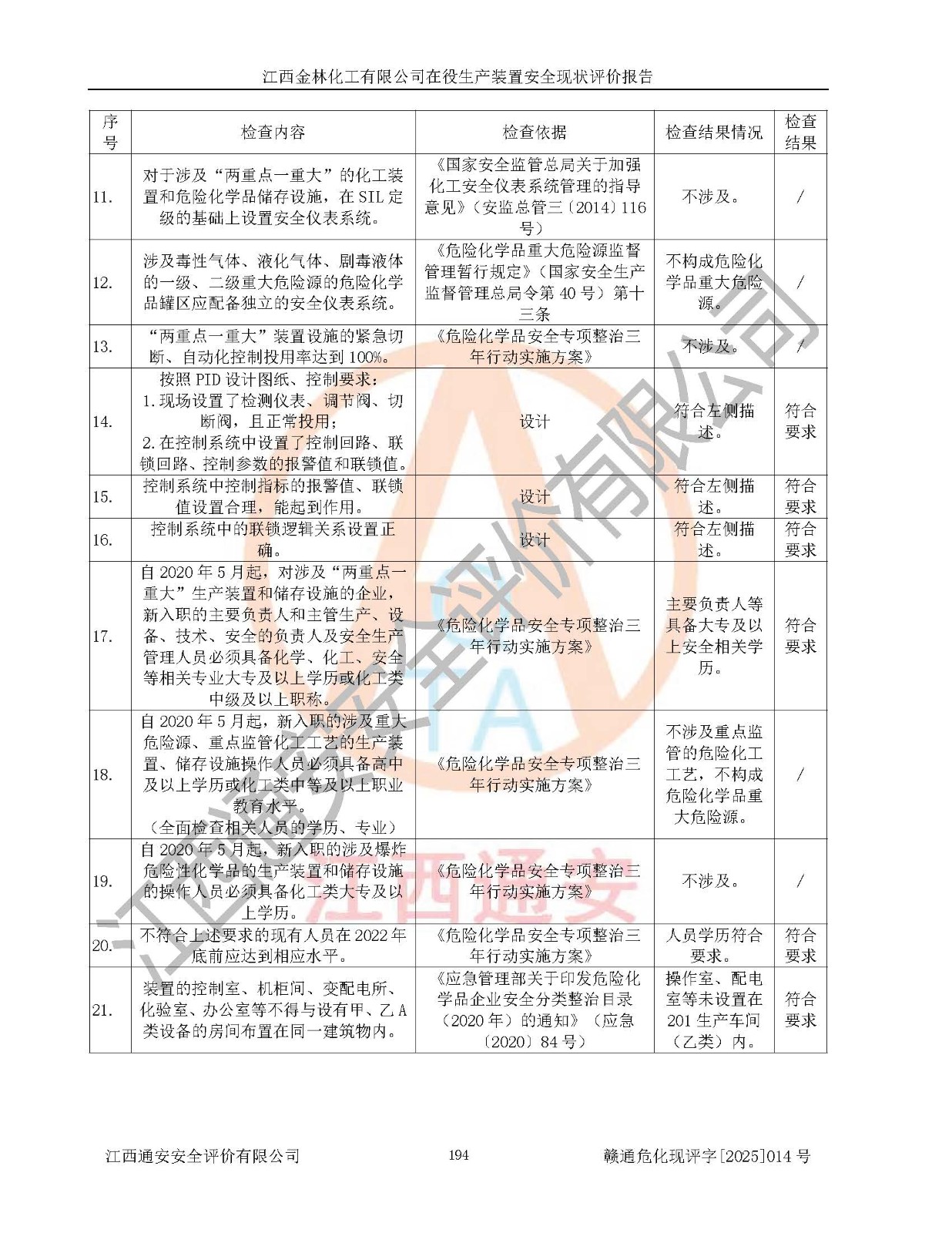 評價結(jié)論 | 江西金林化工有限公司在役生產(chǎn)裝置現(xiàn)場情況與設(shè)計圖紙一致,安全監(jiān)測監(jiān)控系統(tǒng)與設(shè)計一致,并**運行,有關(guān)從業(yè)人員資格符合《江西省危險化學(xué)品安全專項整治三年行動實施方案》要求,安全設(shè)施及安全管理符合**及有關(guān)部門關(guān)于安全生產(chǎn)法律法規(guī)、標準的要求,安全設(shè)施正常投用且運行**,安全風(fēng)險是可以控制的,其風(fēng)險程度是可以接受的,安全現(xiàn)狀符合安全生產(chǎn)條件,能夠滿足安全生產(chǎn)的要求。 | |||